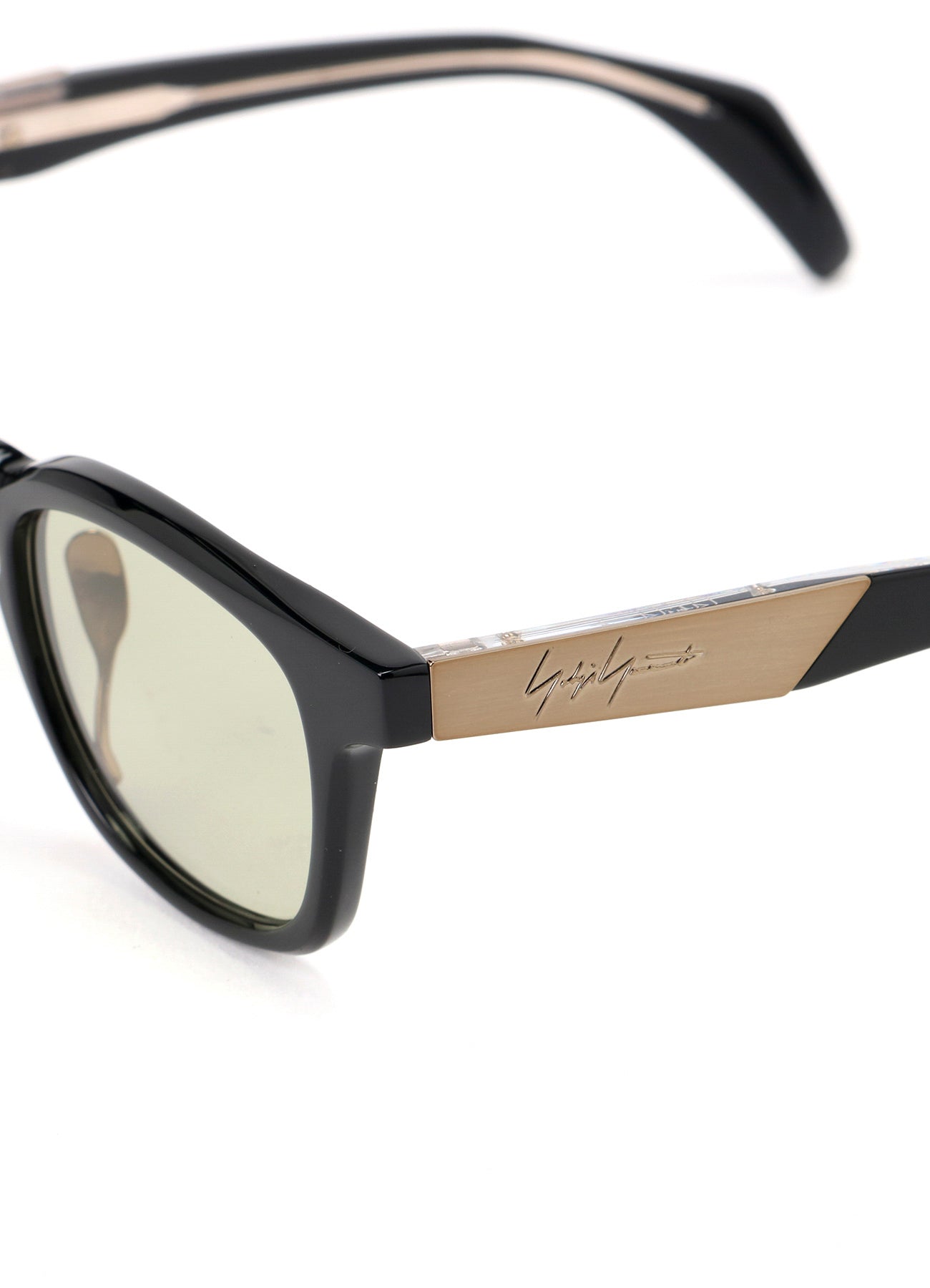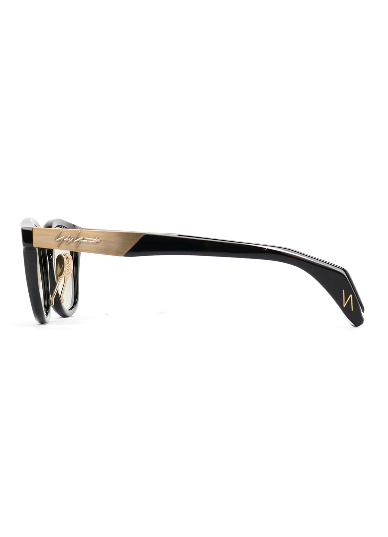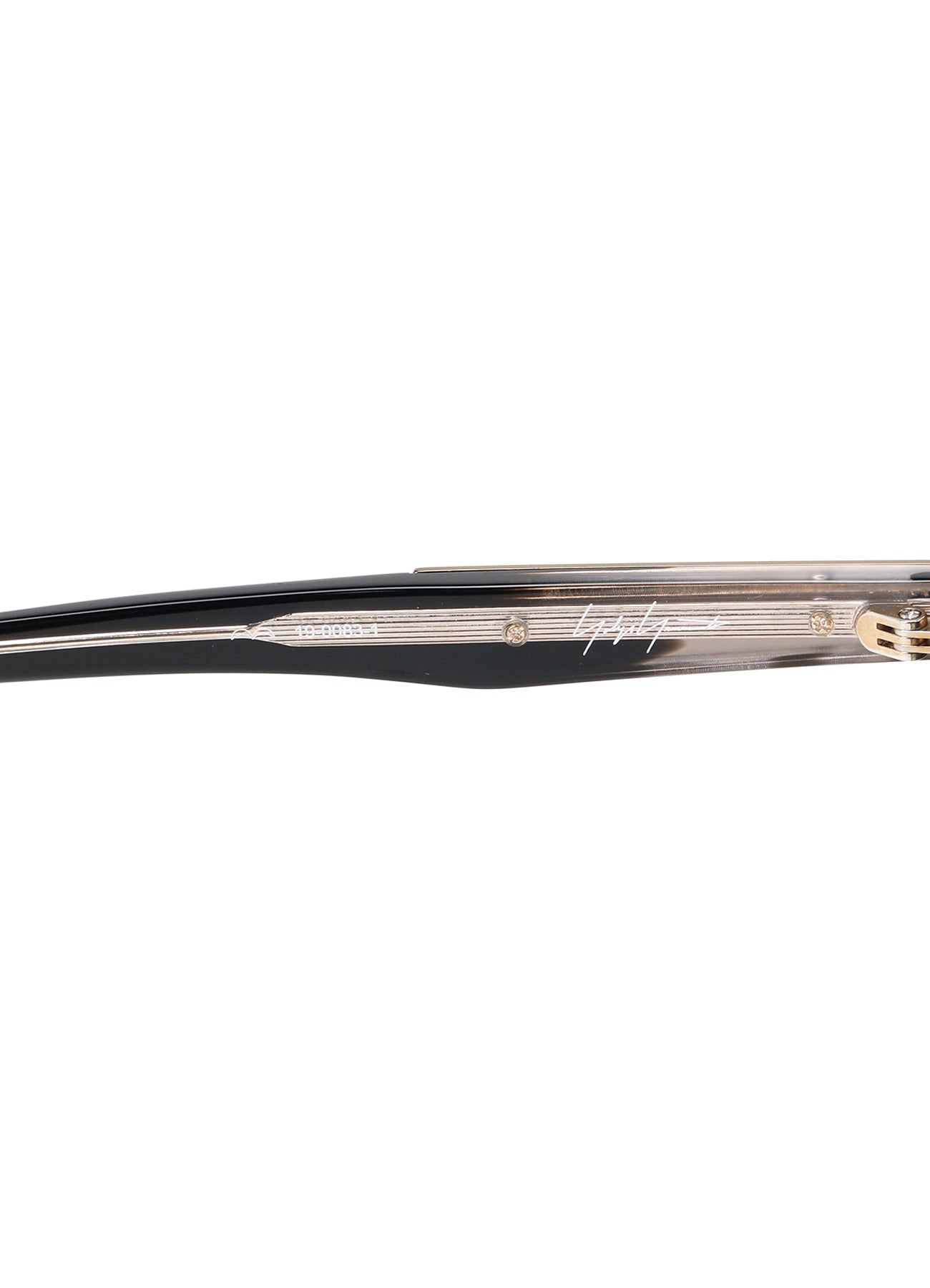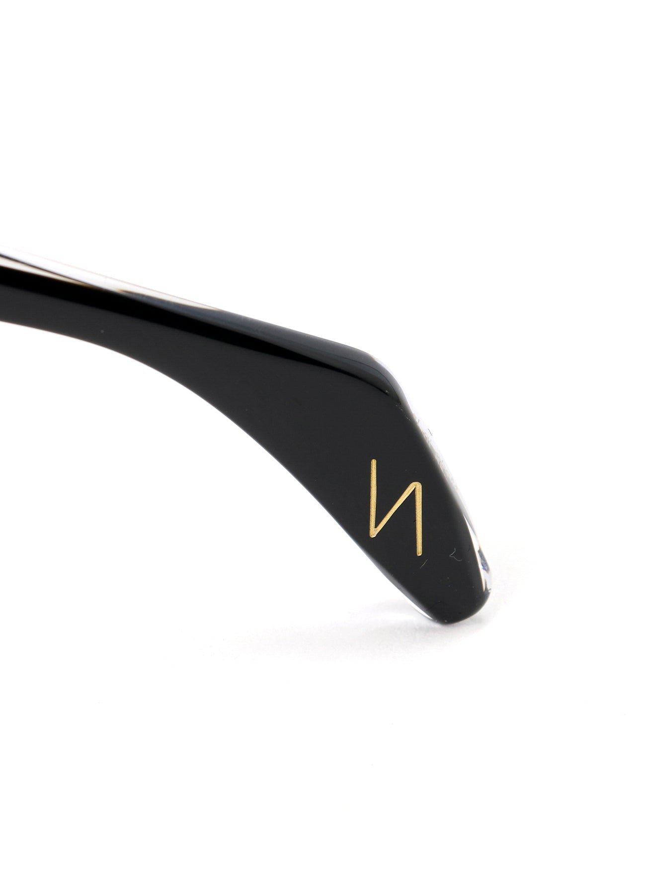 A design featuring authentic Wellington-style eyewear with a self-frame. Notably, it showcases different metal textures on each side, with a bold signature on the right side.