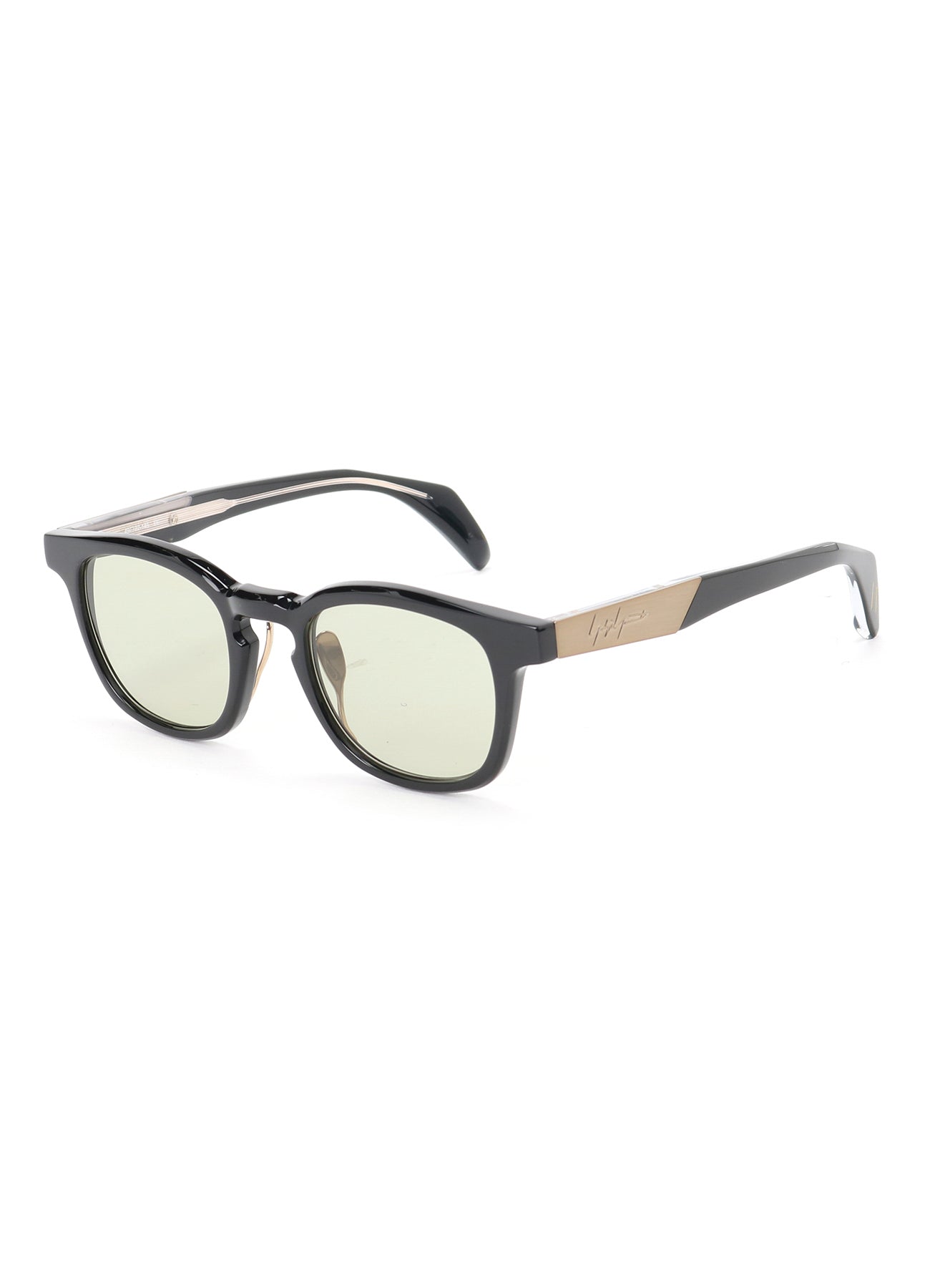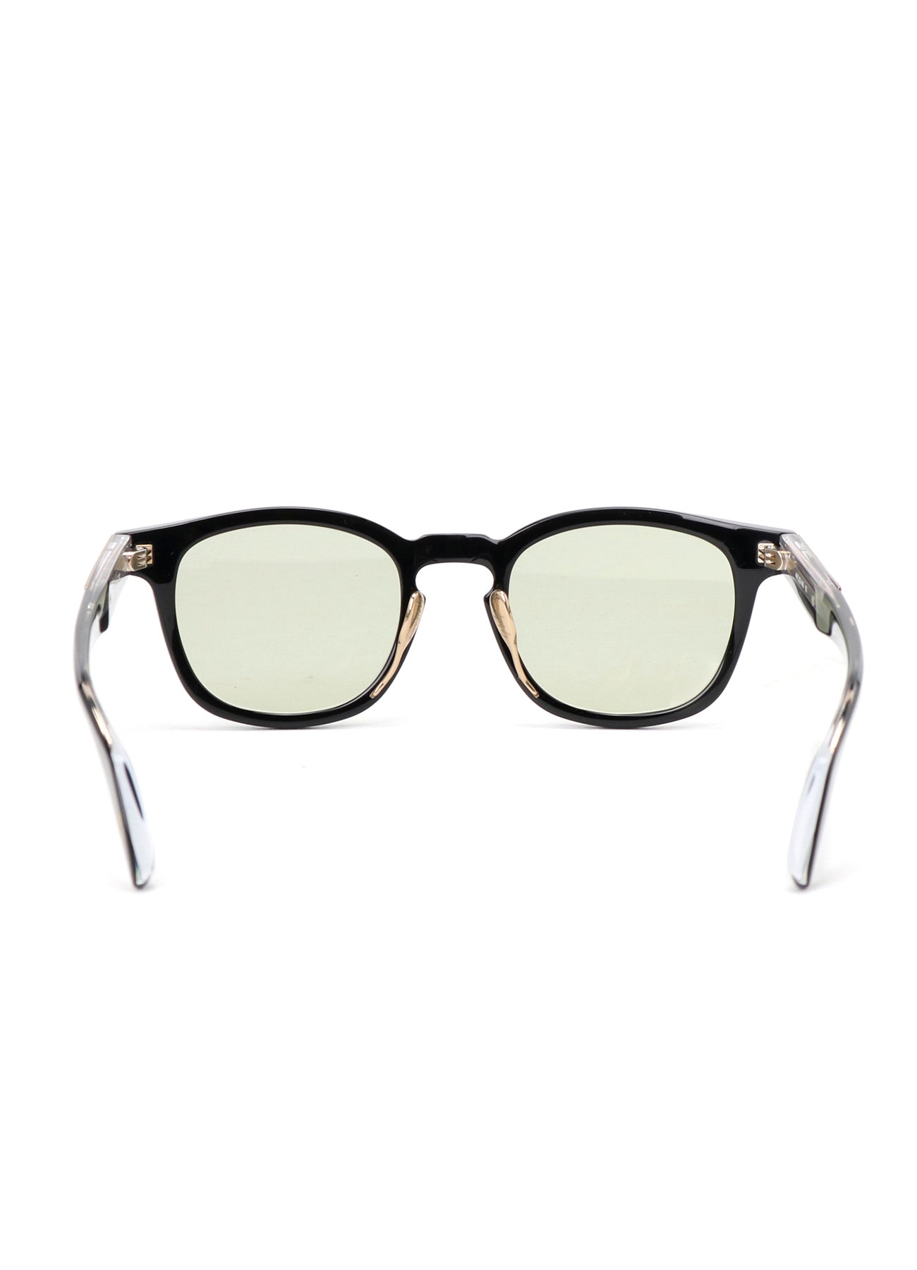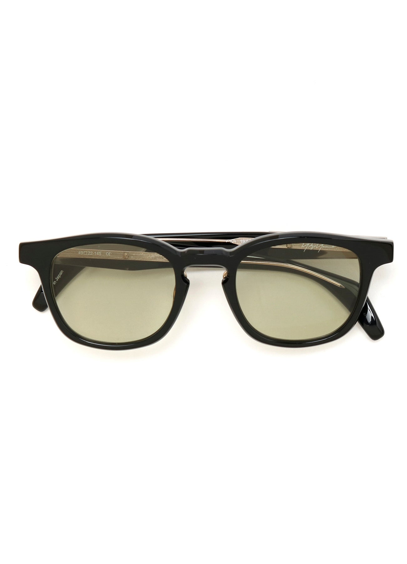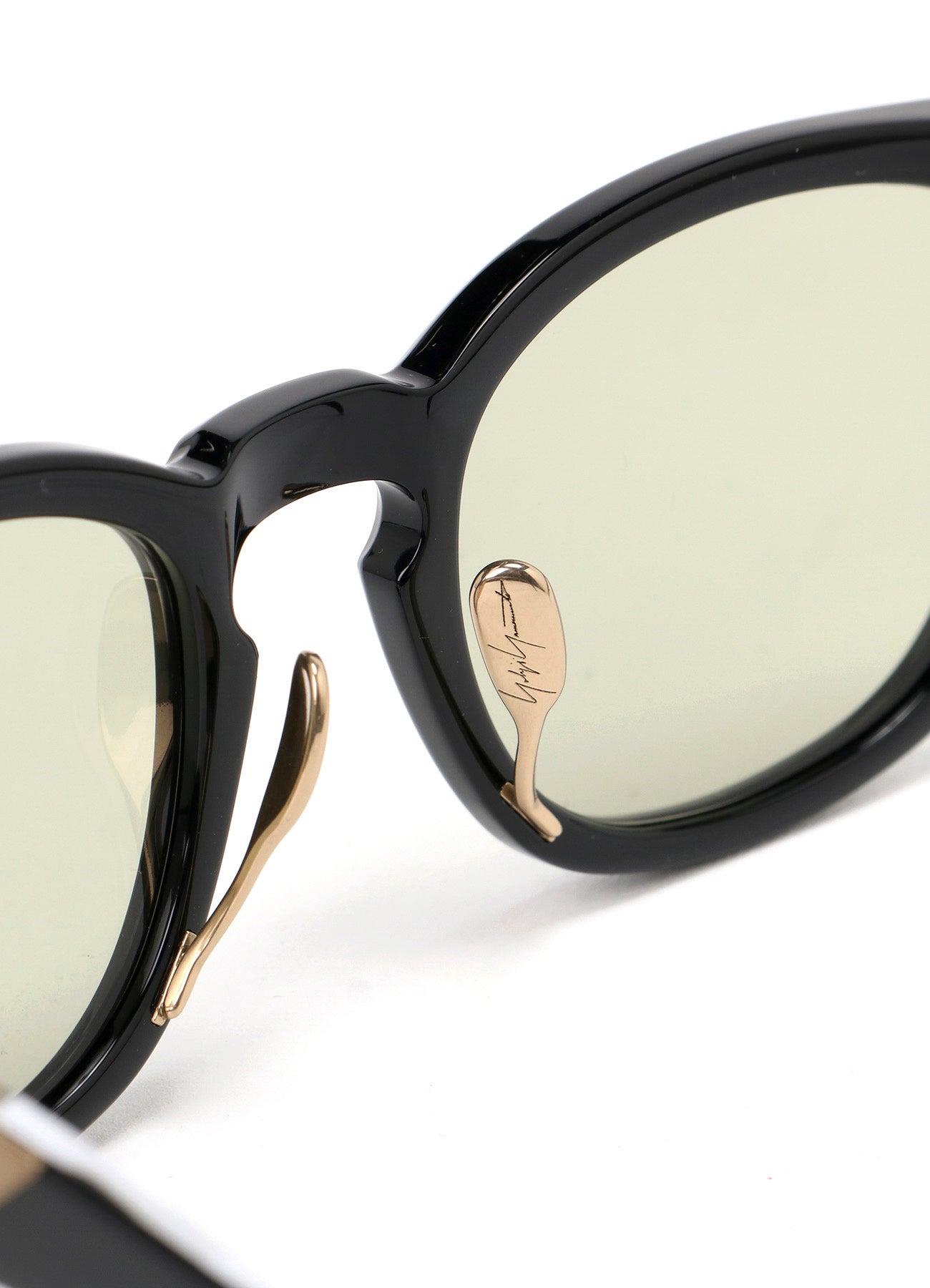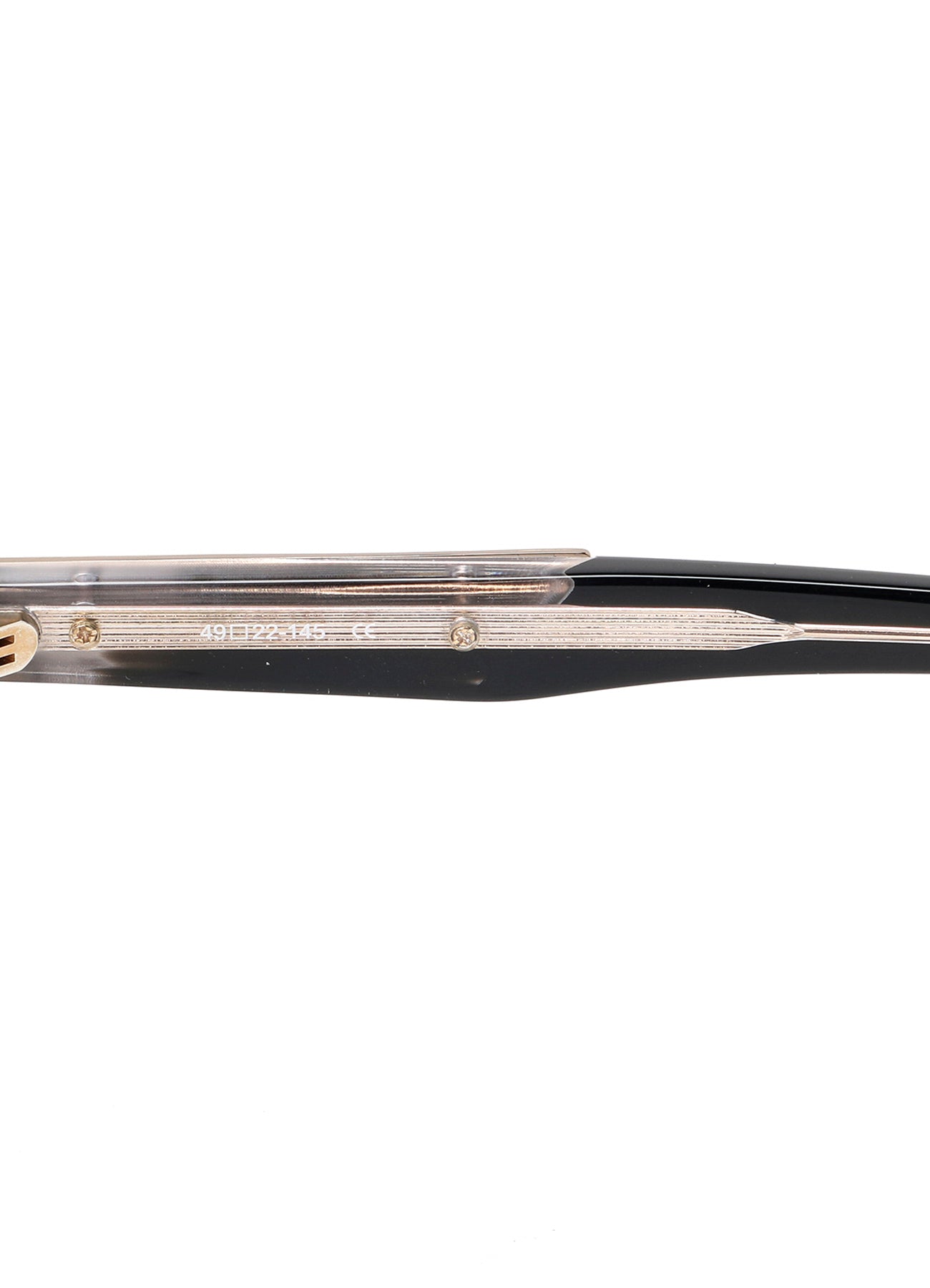 A design featuring authentic Wellington-style eyewear with a self-frame. Notably, it showcases different metal textures on each side, with a bold signature on the right side.