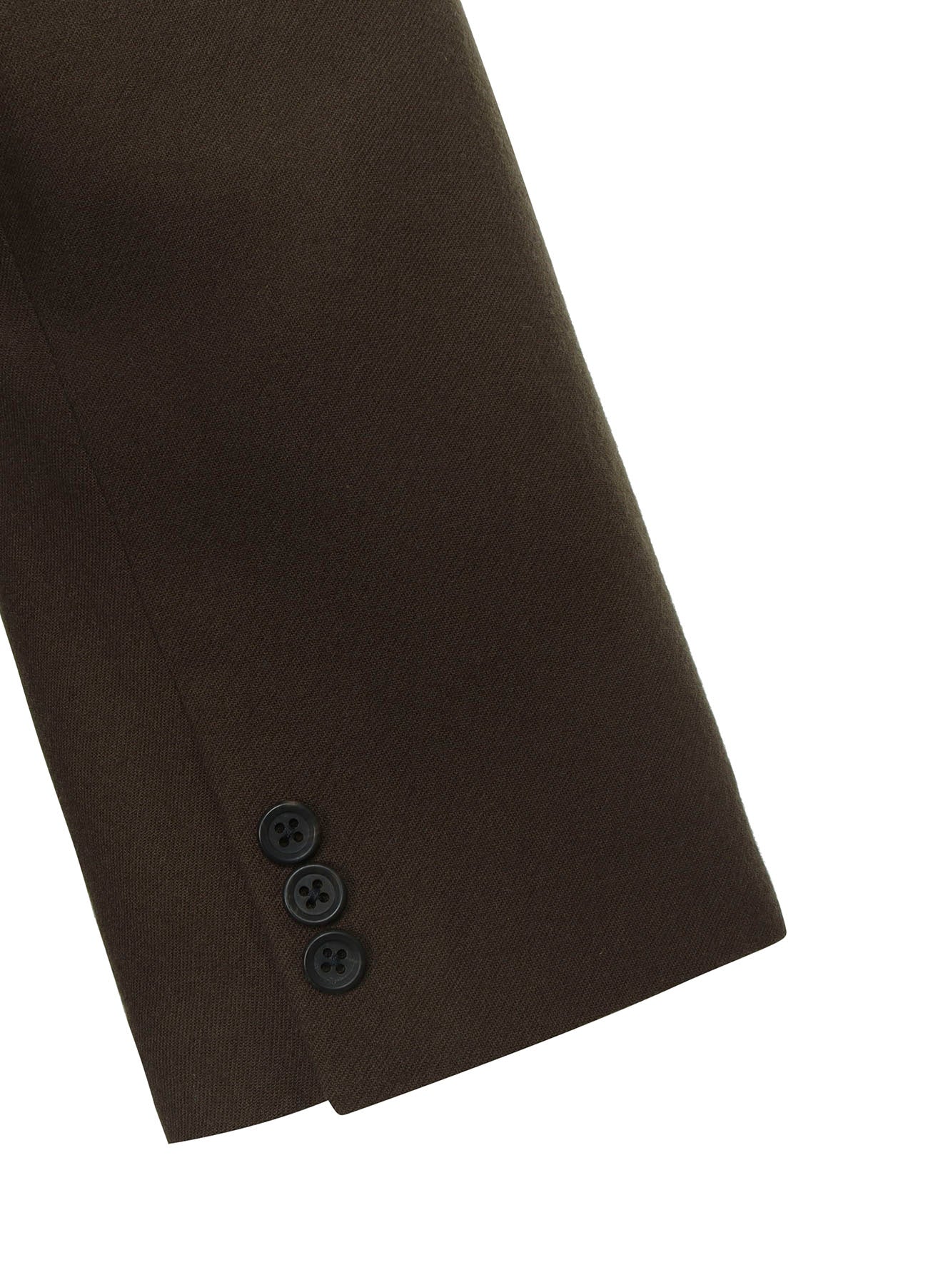 A long jacket made of 100% wool khaki flannel with a liner. The fabric is a soft textured Twill, offering a gentle appearance. The liner uses cationic chambray taffeta, featuring vintage processed gloss and firmness.
