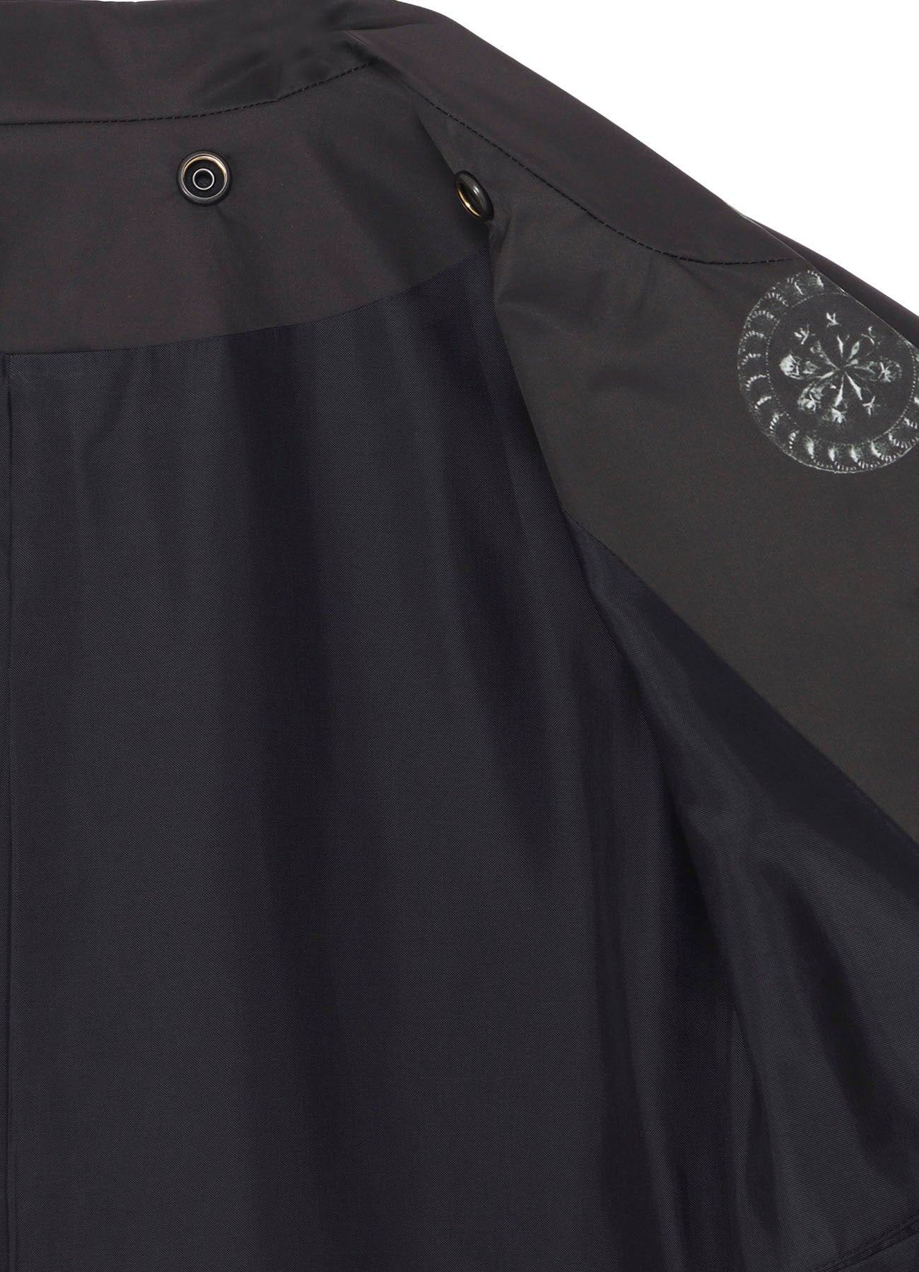 For the A/W 2025-26 Yohji Yamamoto POUR HOMME collection, Look 5 features a reversible padded long jacket. Its twill weave, made of 50d polyester threads, boasts a smooth texture. The fabric is inkjet printed in Kyoto with a nude collage and button motif.