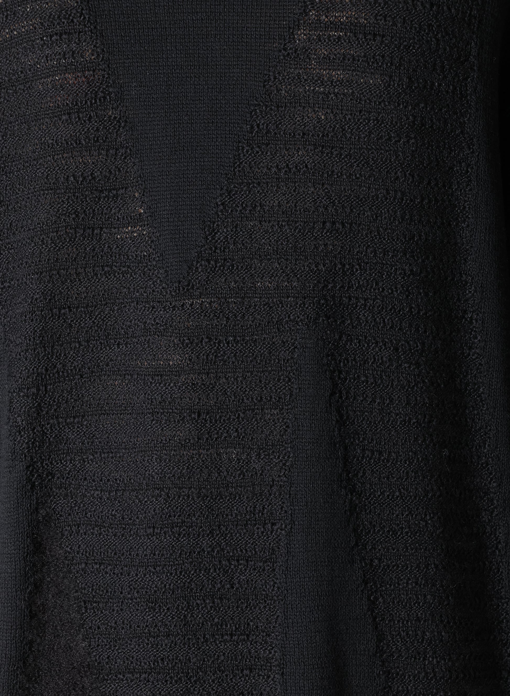 This high-neck knit features a combination design using wool-alpaca yarn. It blends Australian wool-dyed yarn, a natural random slub material, and yarn made from fine alpaca. Its standout feature is the textured knit with a distinctive unevenness.
