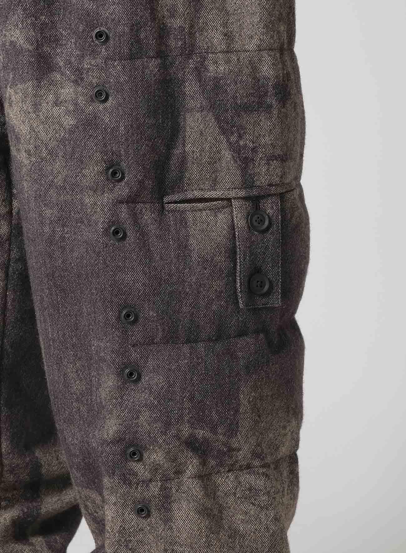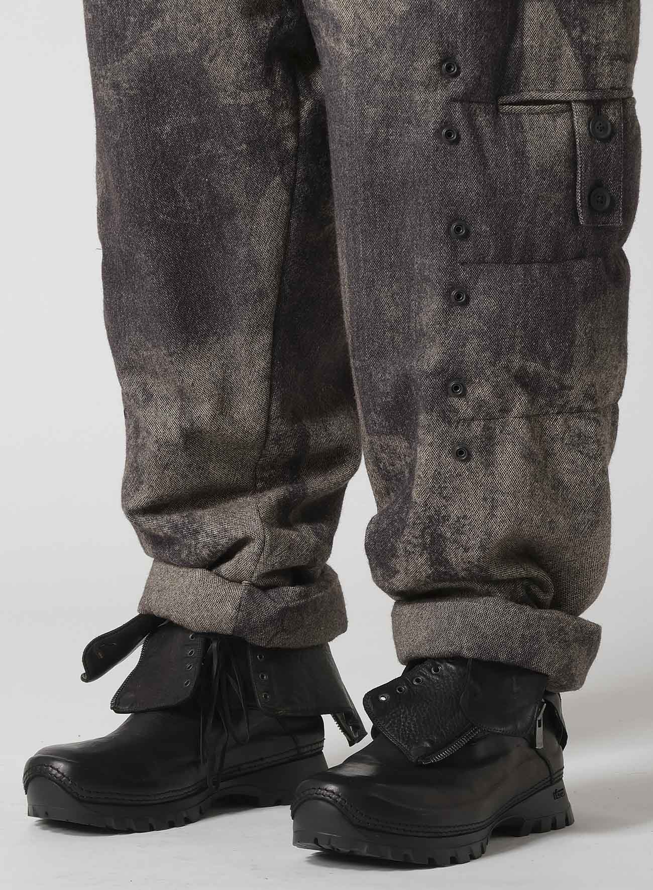 These padded pants feature an all-over collage pattern. Made from etamine with recycled wool in both the warp and the weft, and treated with tumbler processing for a rugged texture. Original designs are inkjet-printed at a Kyoto print factory.