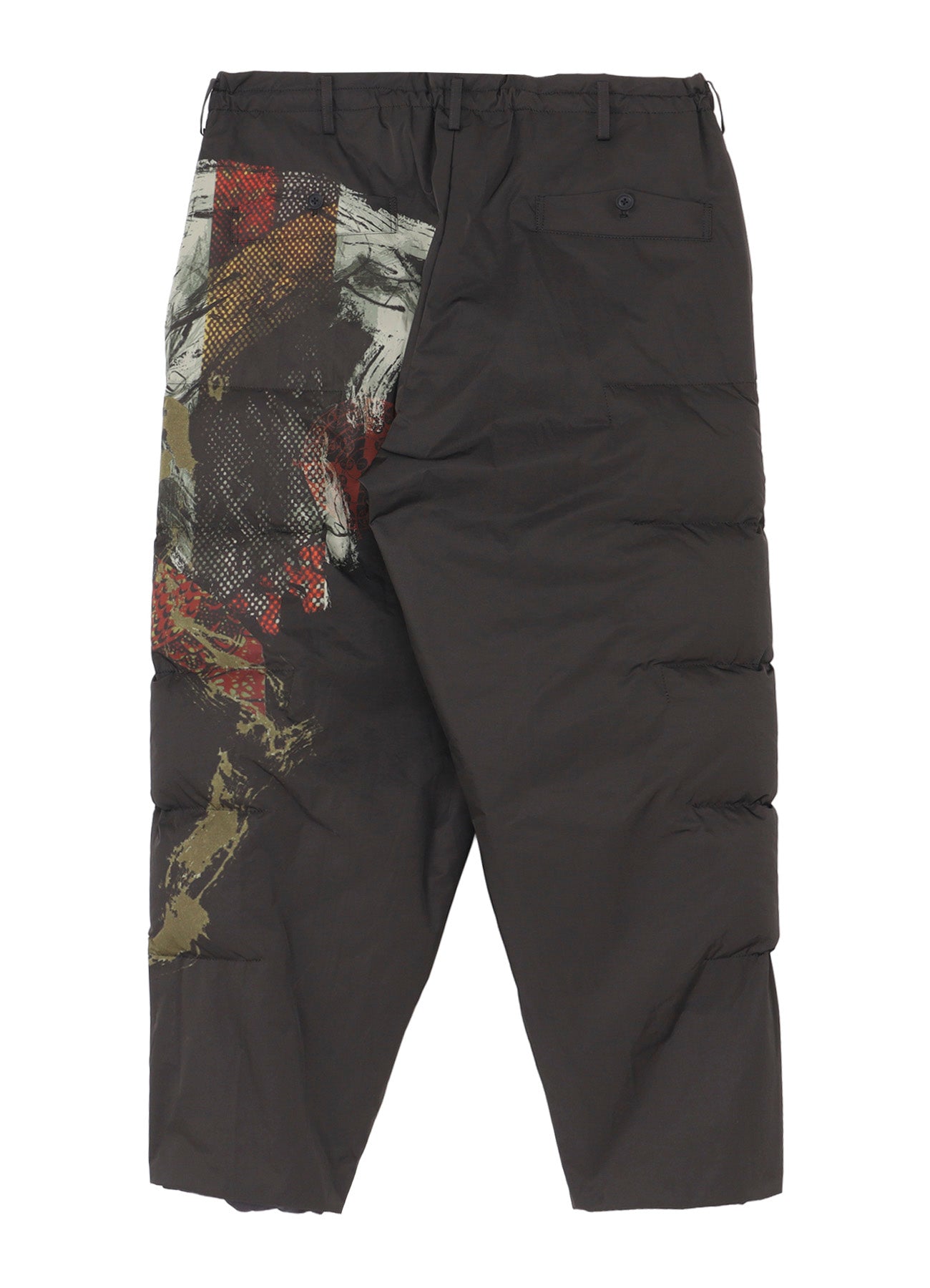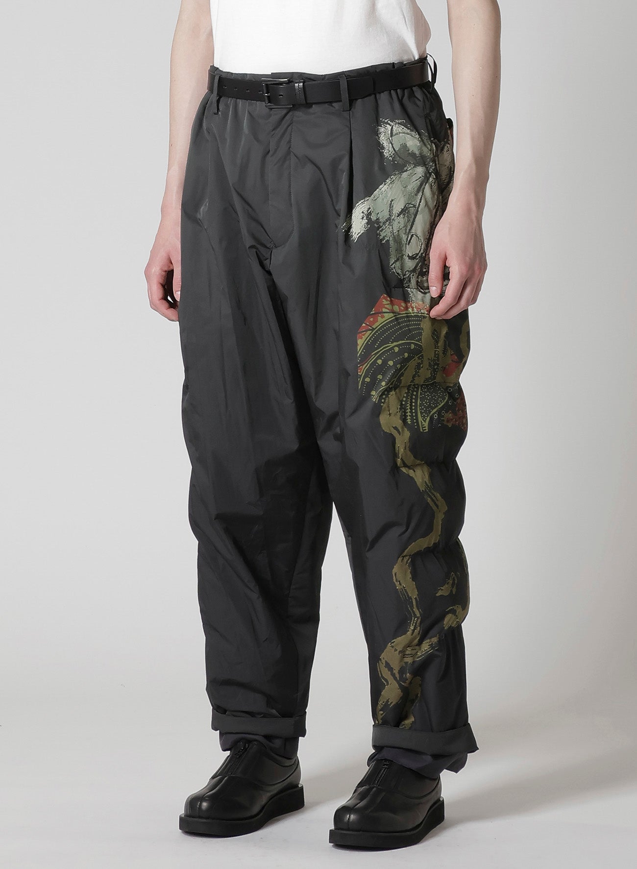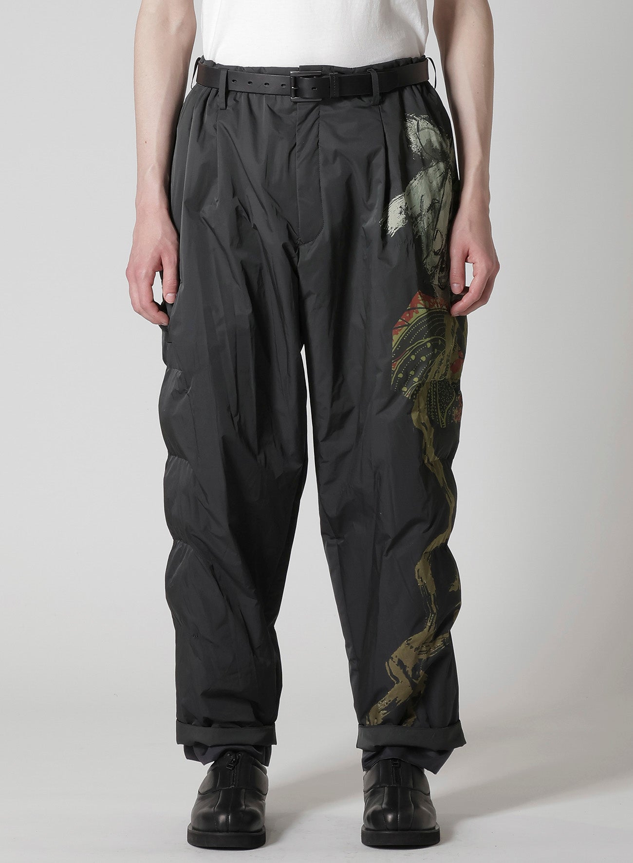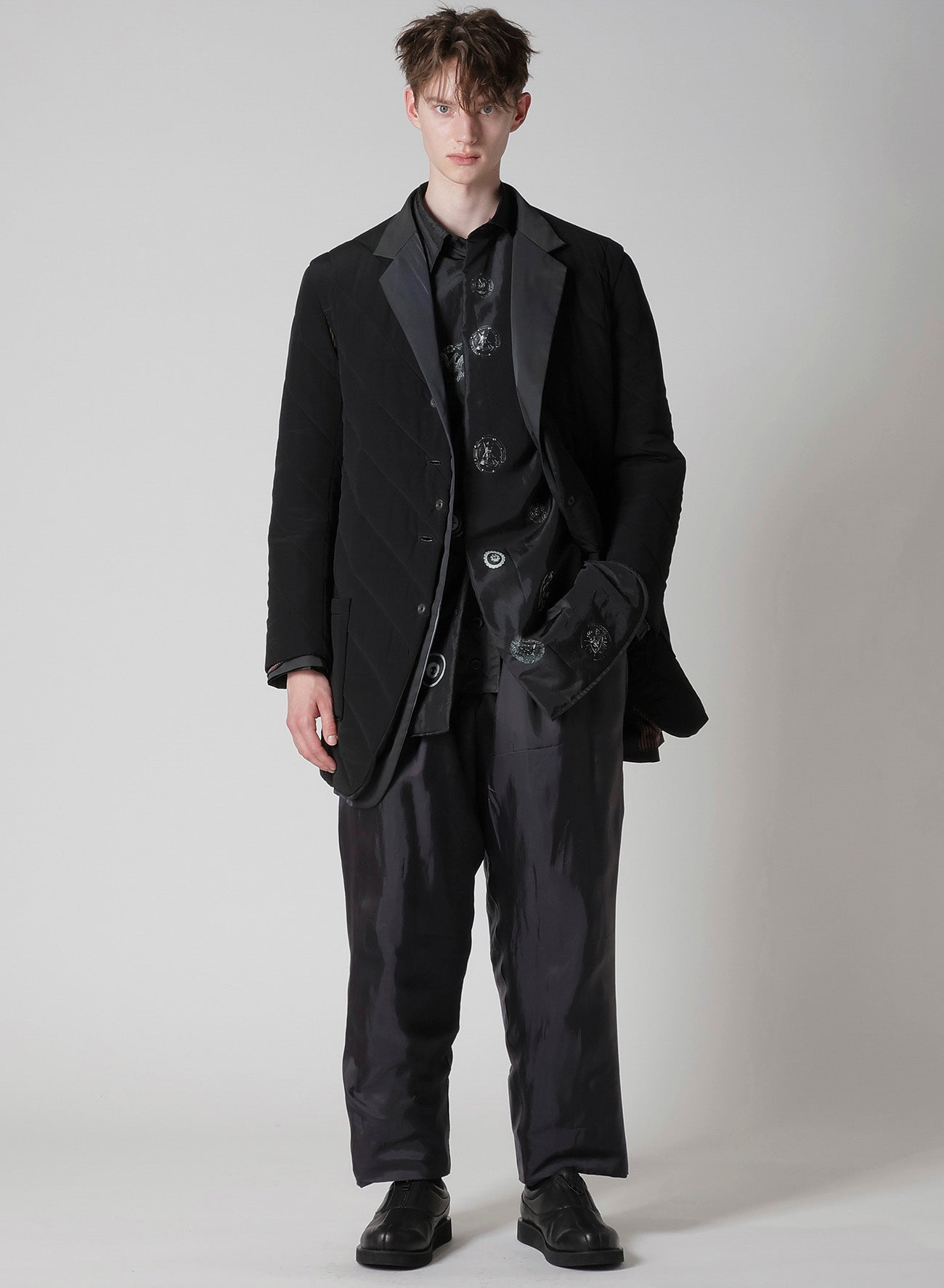 The Look 19 pants from Yohji Yamamoto POUR HOMME A/W 2025-26 collection feature padding and are crafted from Twill, utilizing polyester yarn in both the warp and the weft. Known for their smooth surface, these pants have an original print, created via inkjet printing, at a Kyoto factory.