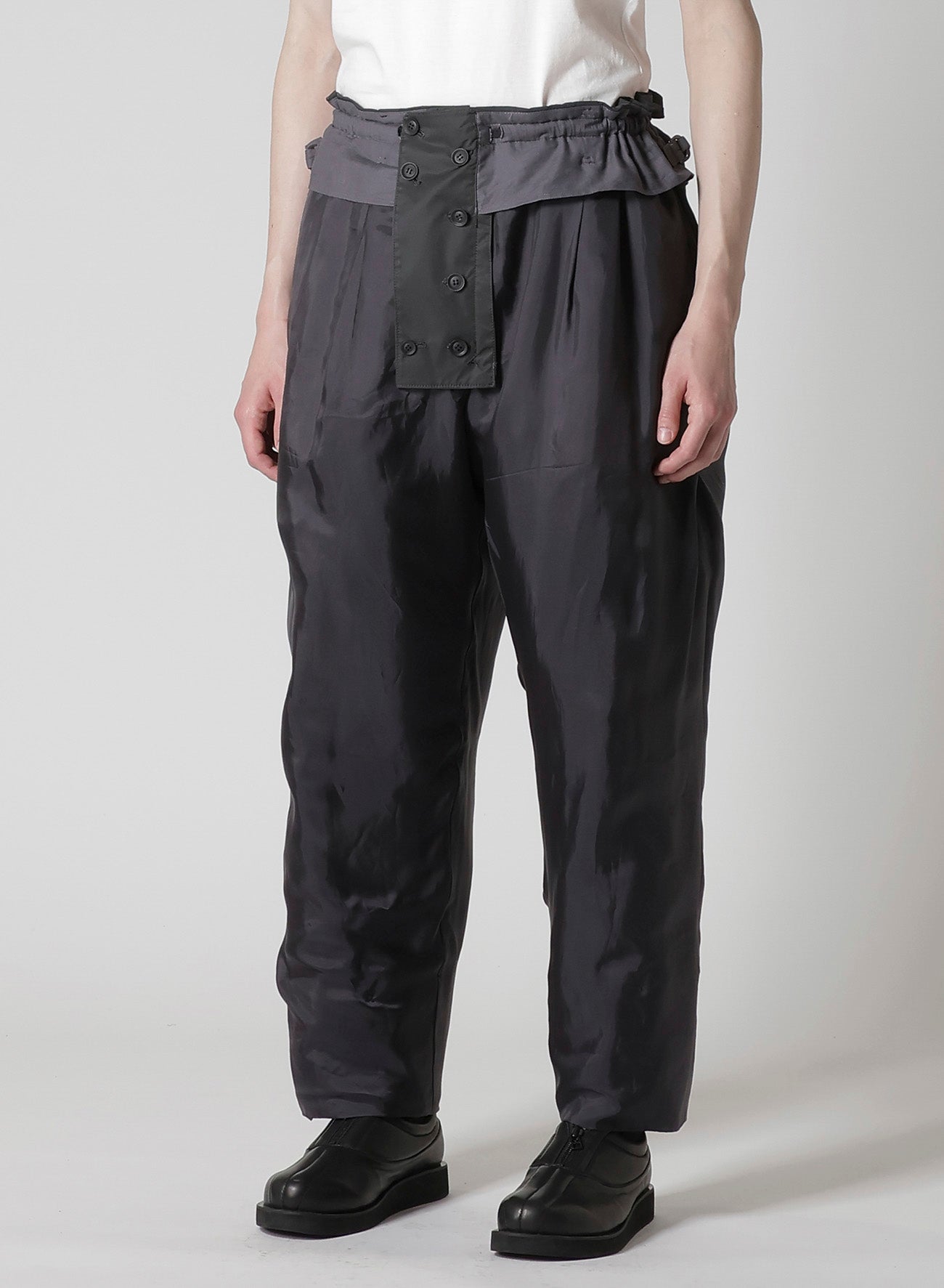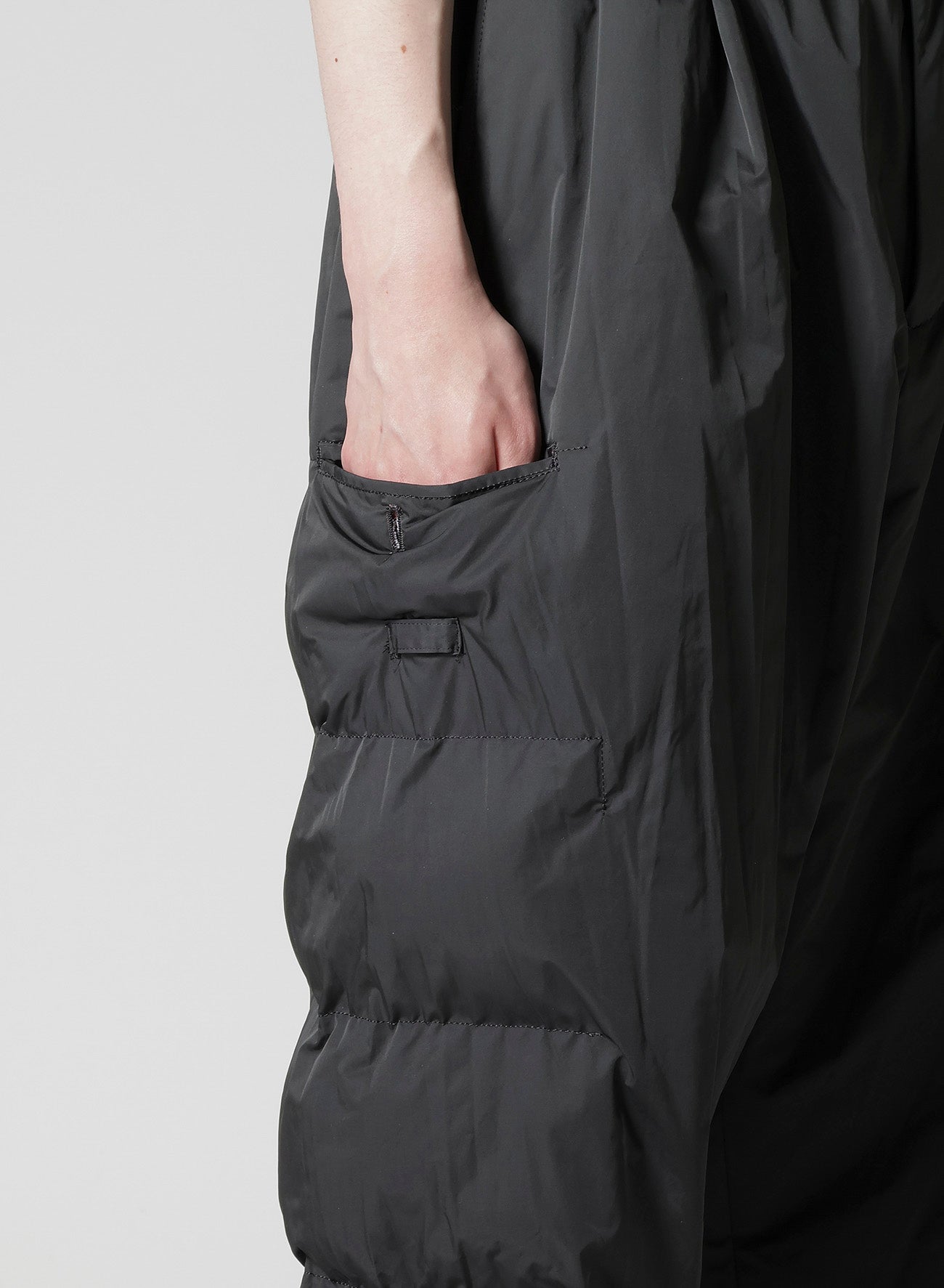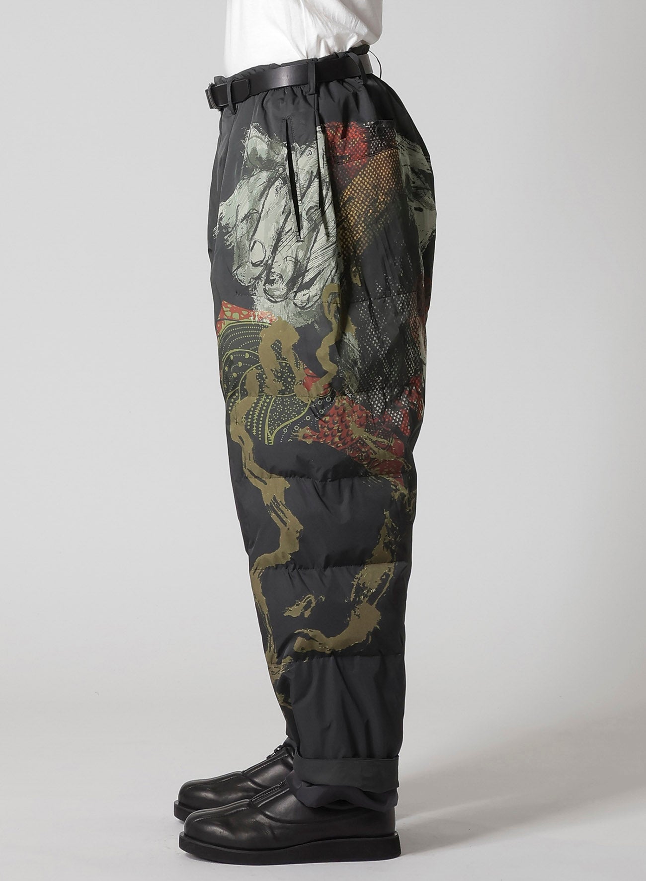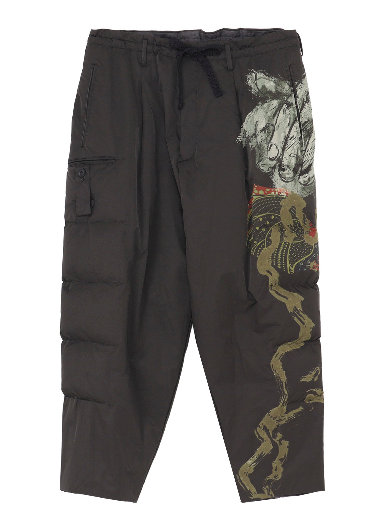 The Look 19 pants from Yohji Yamamoto POUR HOMME A/W 2025-26 collection feature padding and are crafted from Twill, utilizing polyester yarn in both the warp and the weft. Known for their smooth surface, these pants have an original print, created via inkjet printing, at a Kyoto factory.