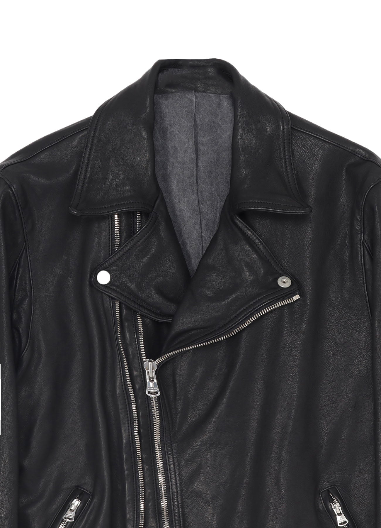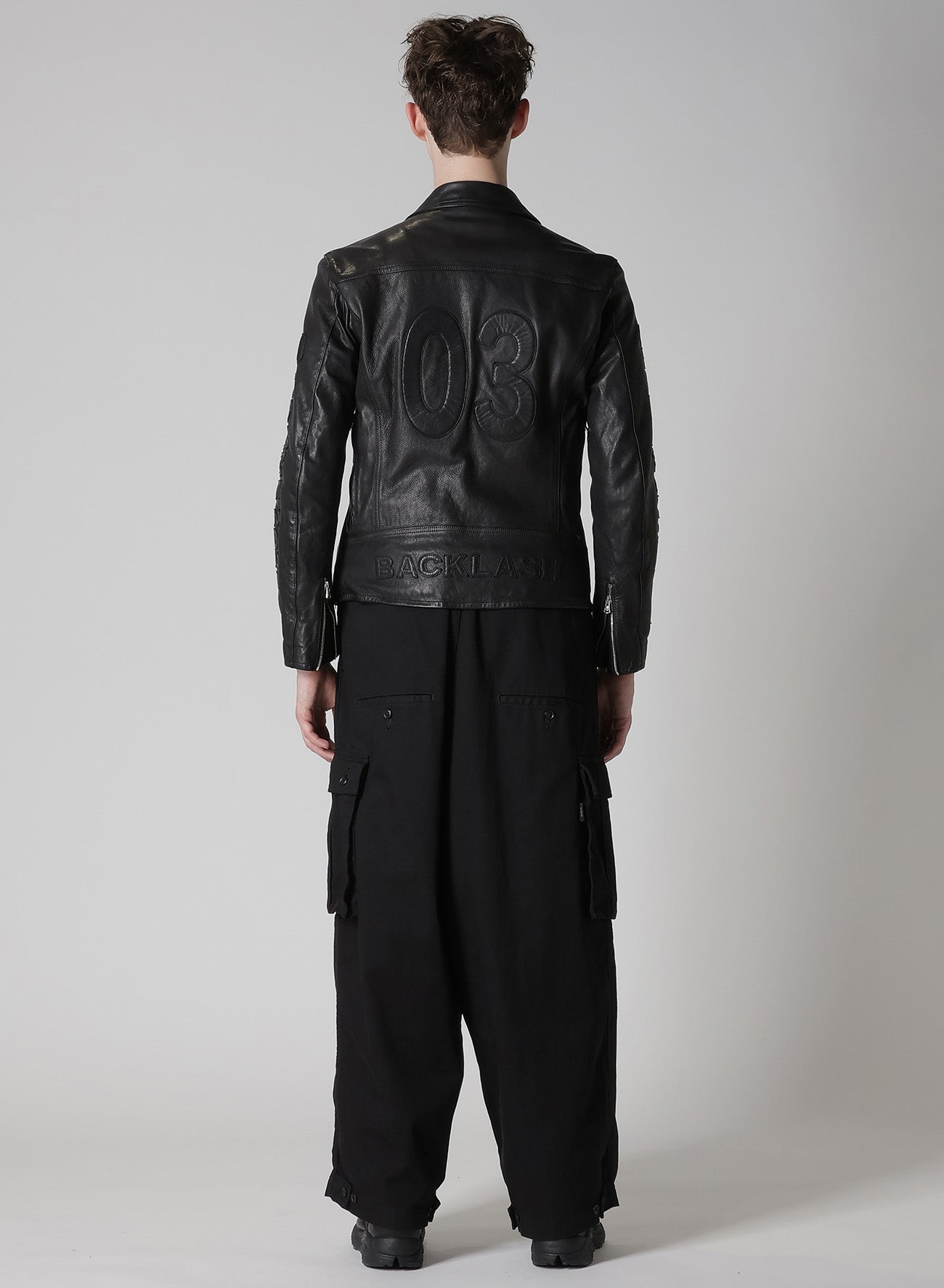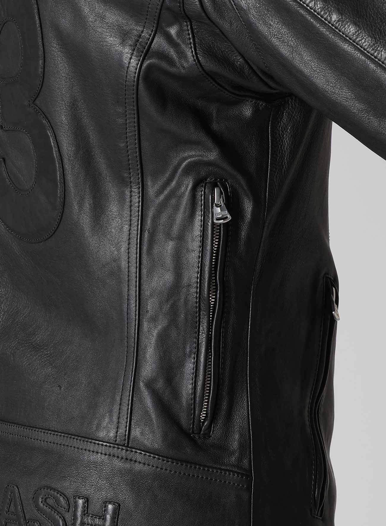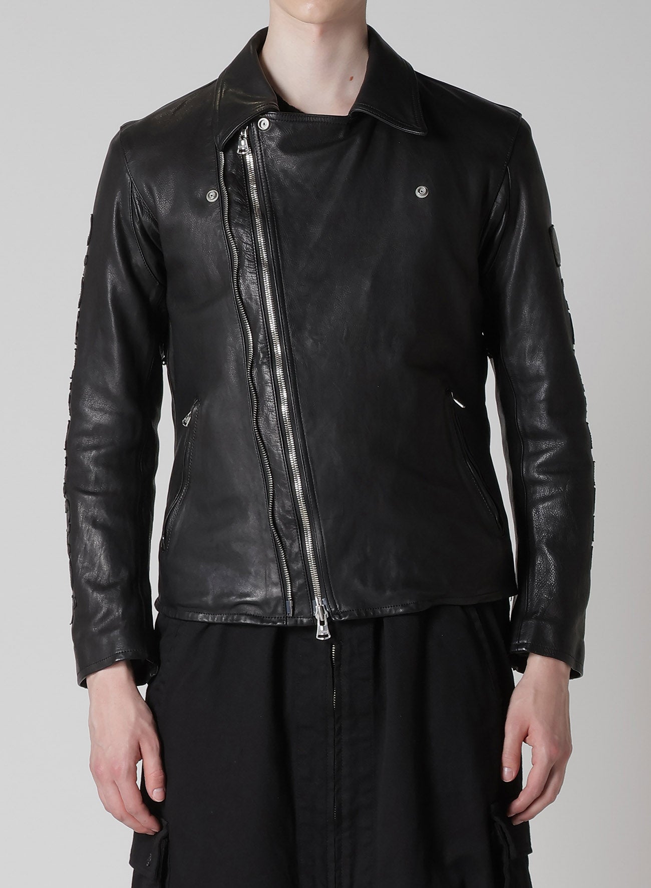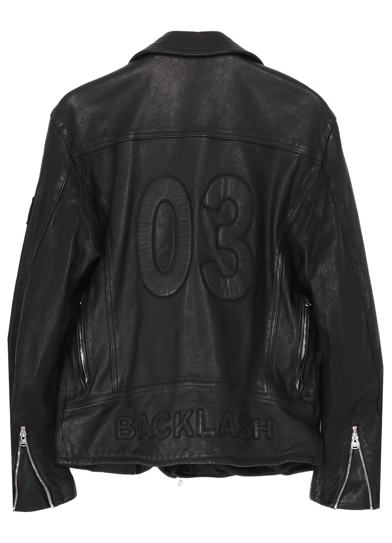This is a Double Riders Jacket crafted from Japanese Horse Leather. The garment's soft-washed finish creates a rich texture, while Backlash collaboration patch details add a bespoke touch, inspired by their first collection. The piece shrinks by about 5% after garment washing, enhancing its luxurious feel.