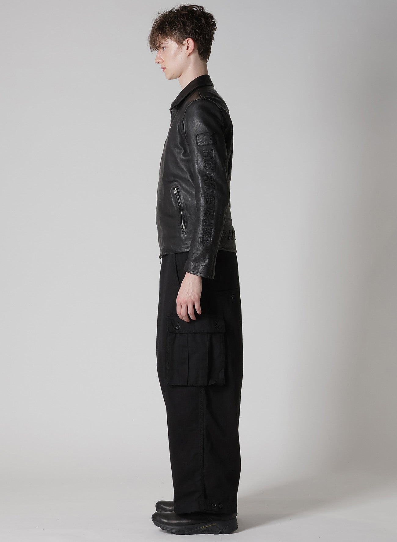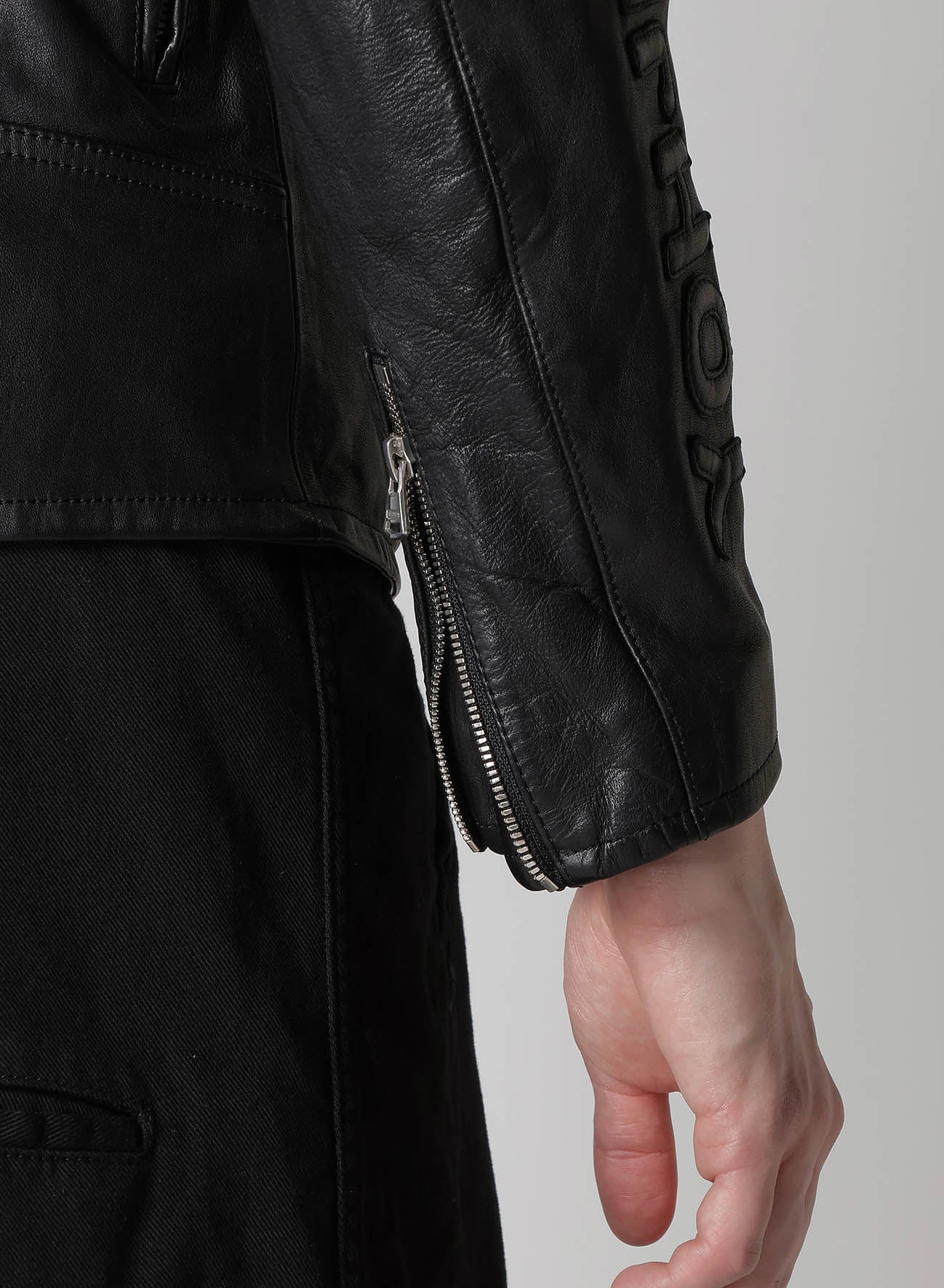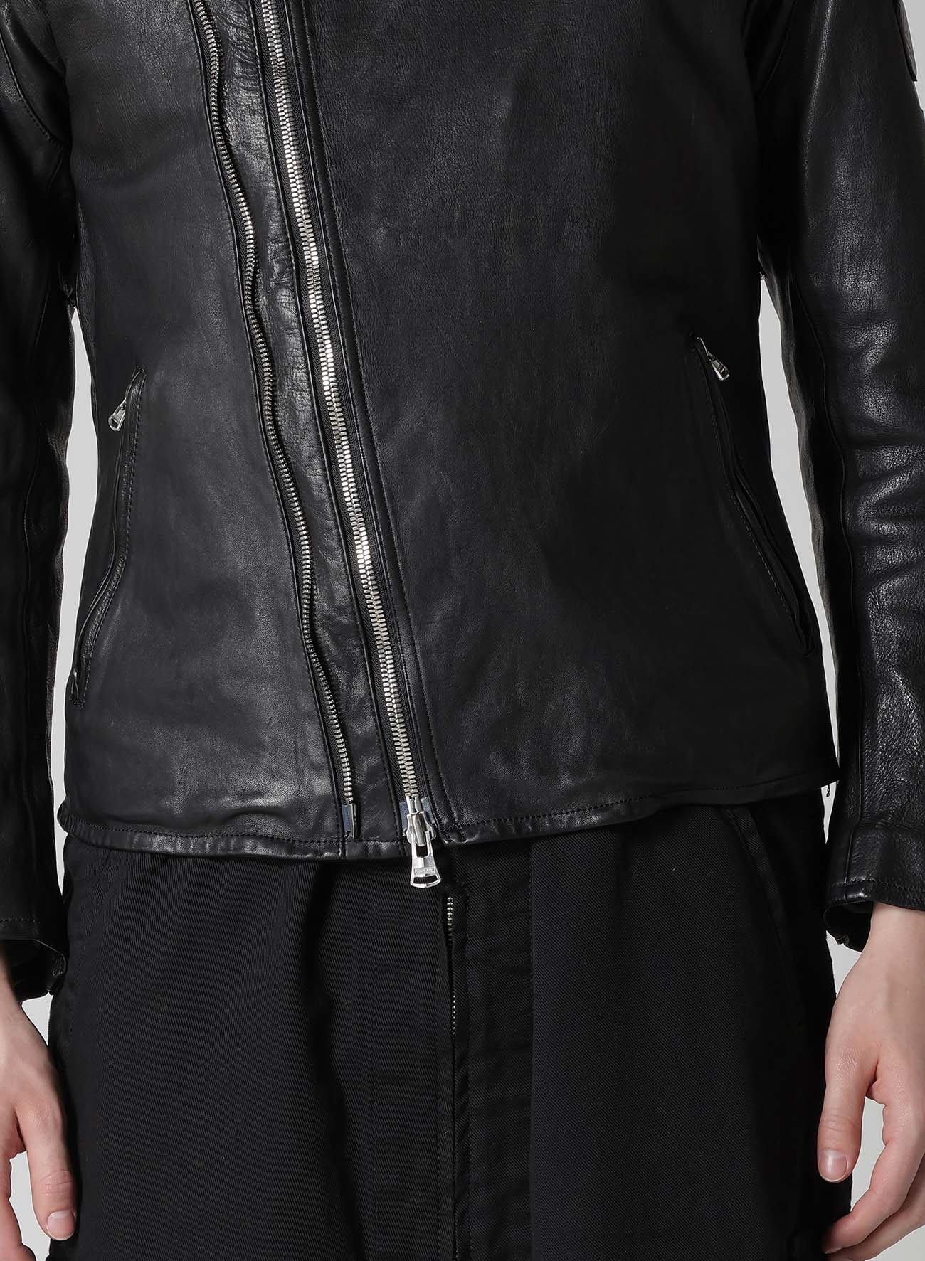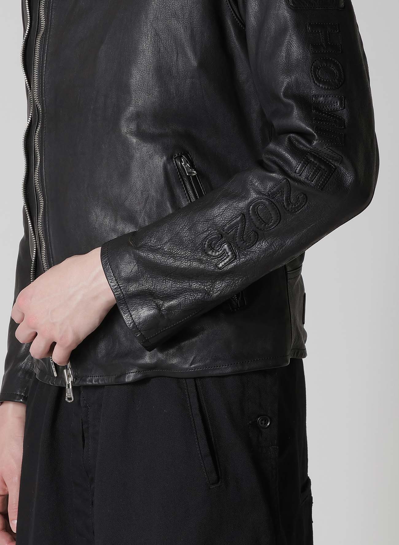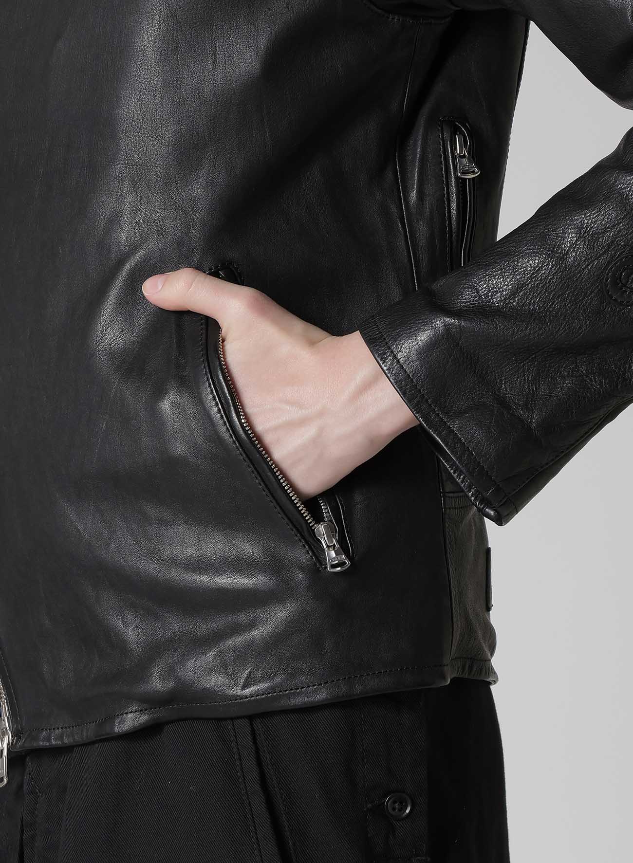 This is a Double Riders Jacket crafted from Japanese Horse Leather. The garment's soft-washed finish creates a rich texture, while Backlash collaboration patch details add a bespoke touch, inspired by their first collection. The piece shrinks by about 5% after garment washing, enhancing its luxurious feel.