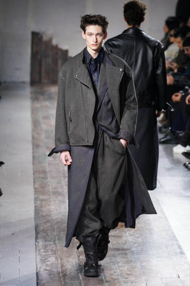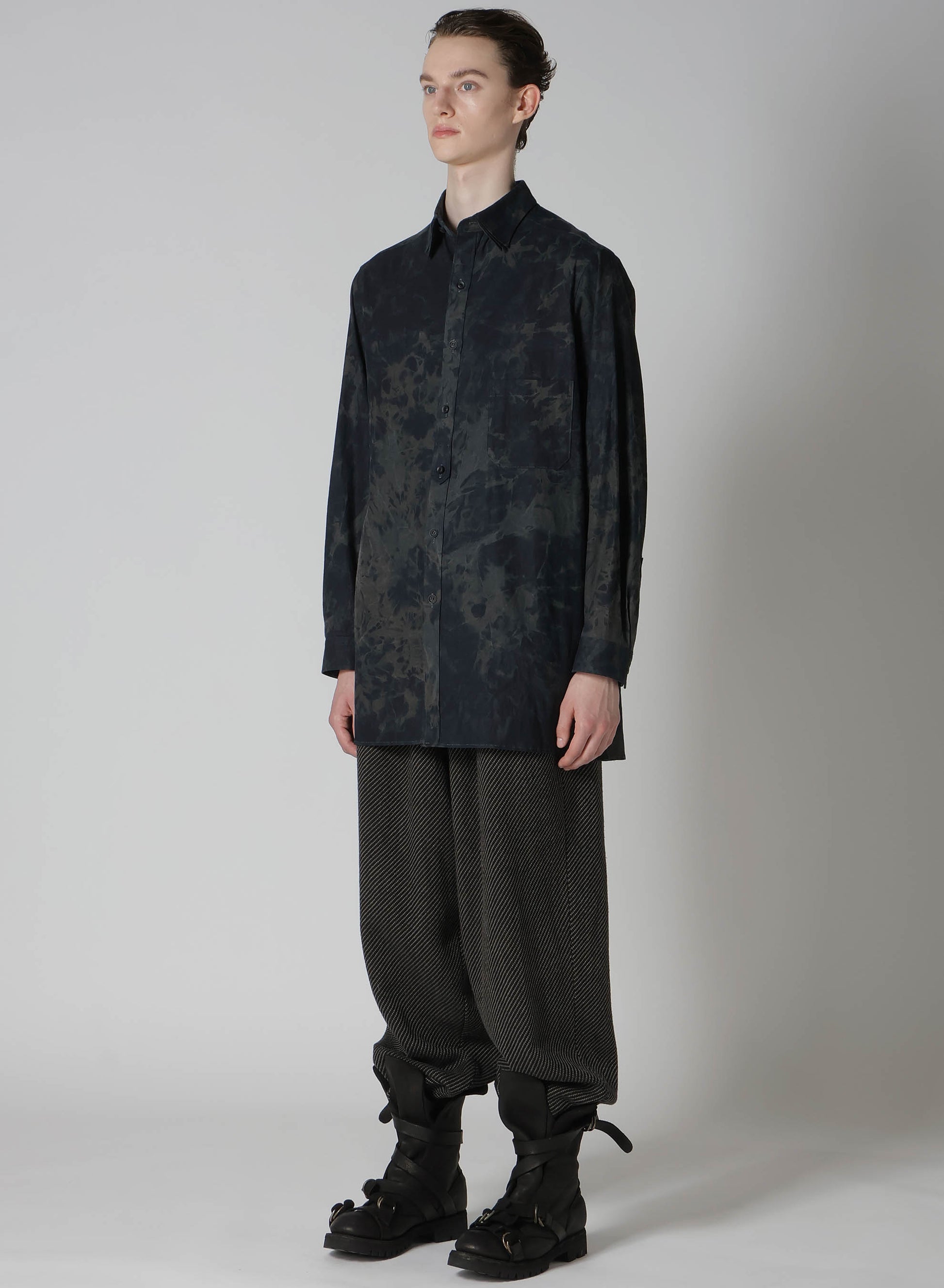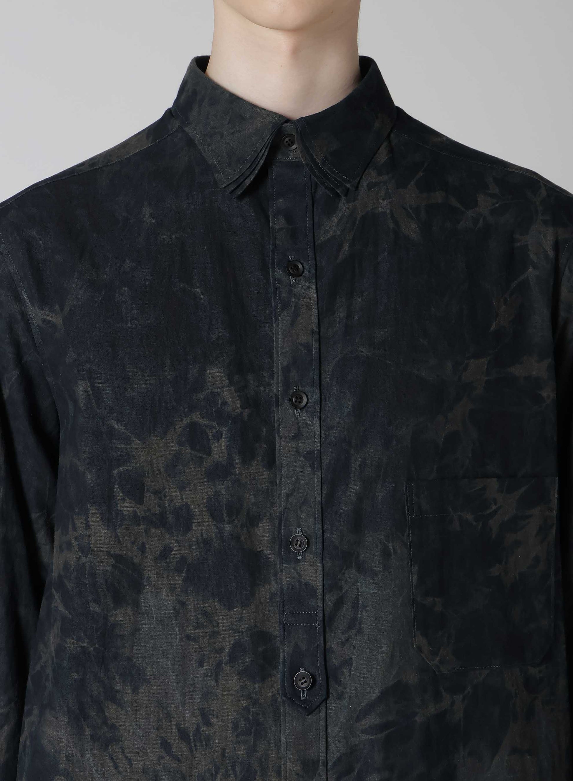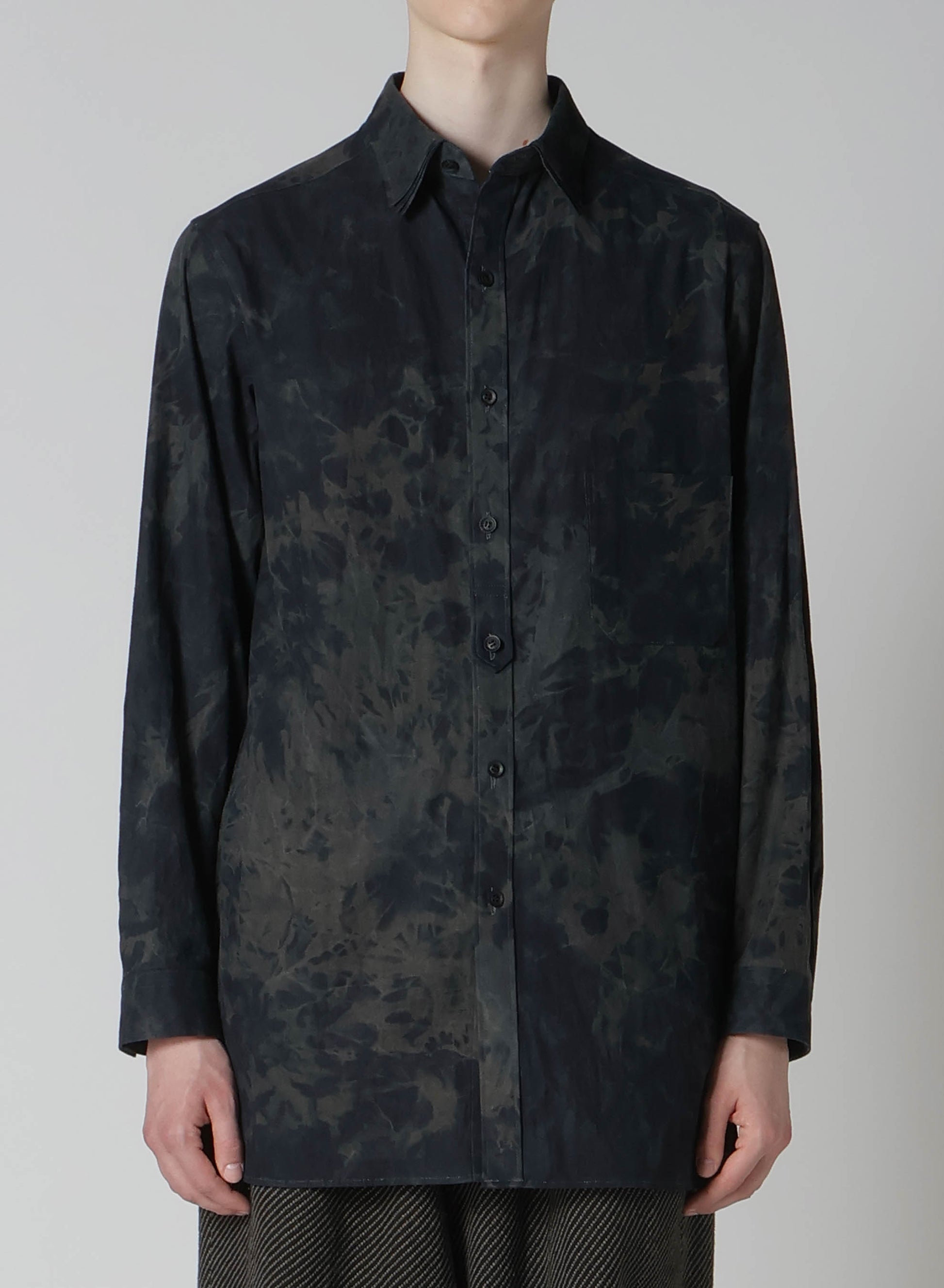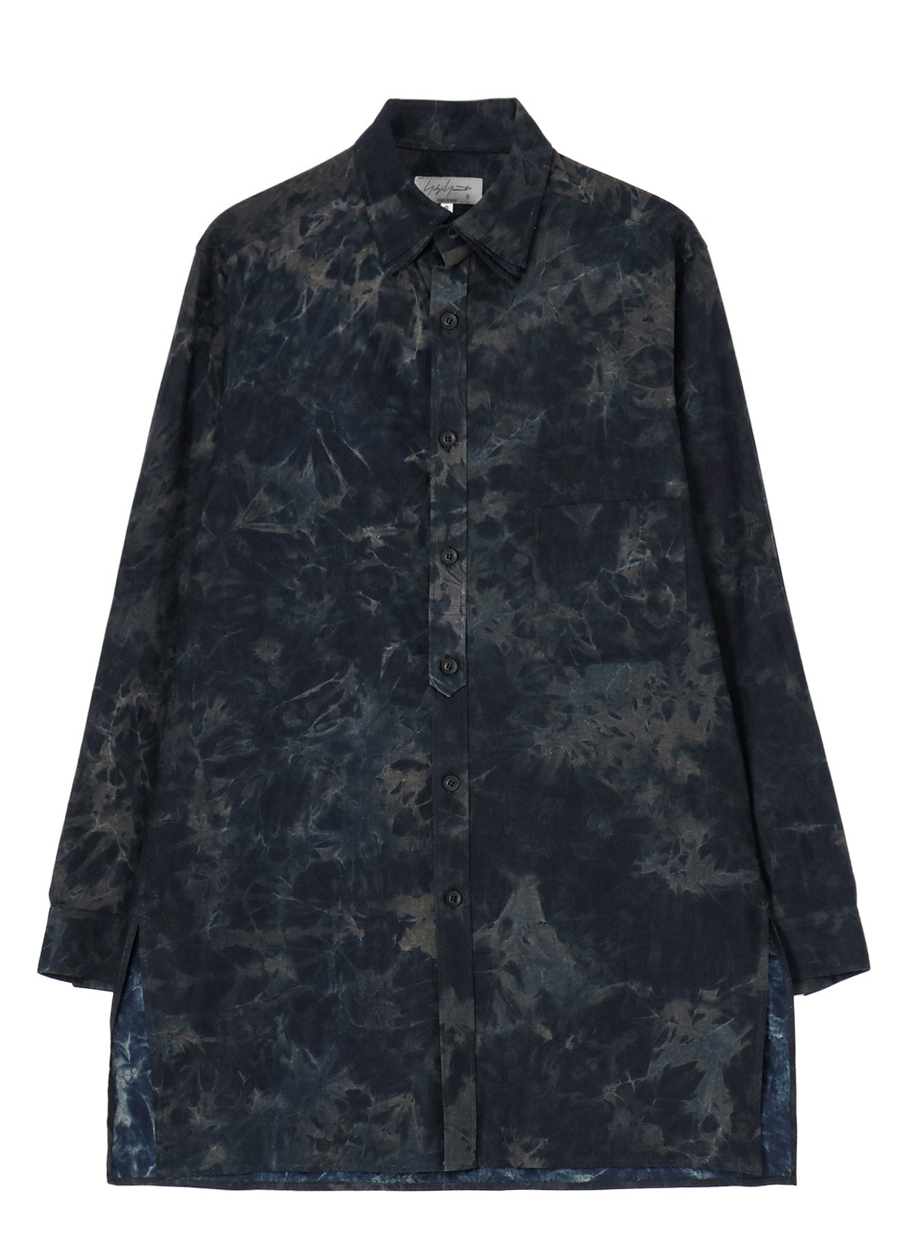 The three-collar blouse featured in LOOK18 showcases sheeting fabric made from cotton and linen, indigo-dyed and coated with ink for a darker navy appearance. Meticulously detailed with triple collars, a floating front placket tip, and layered side slits.