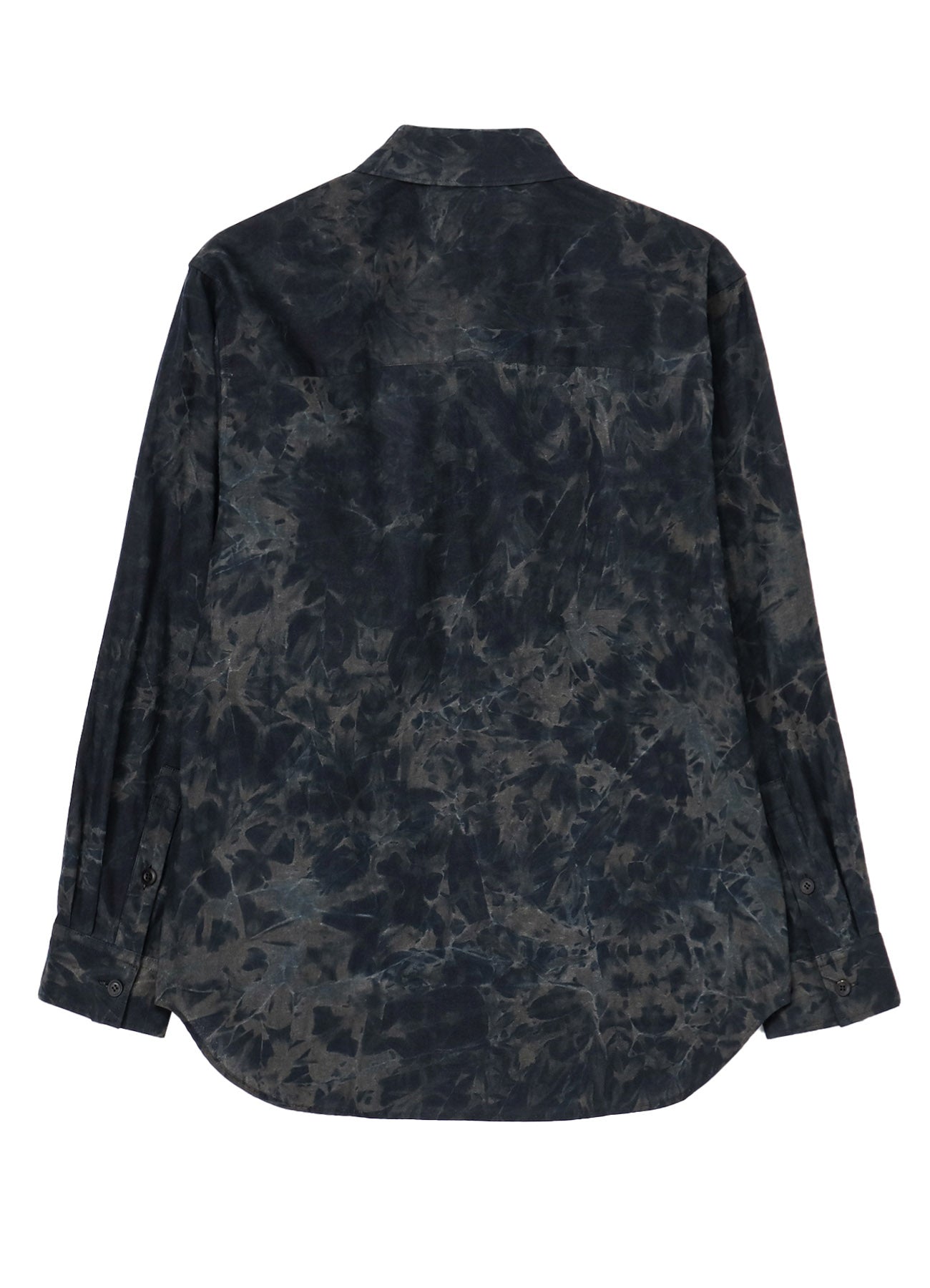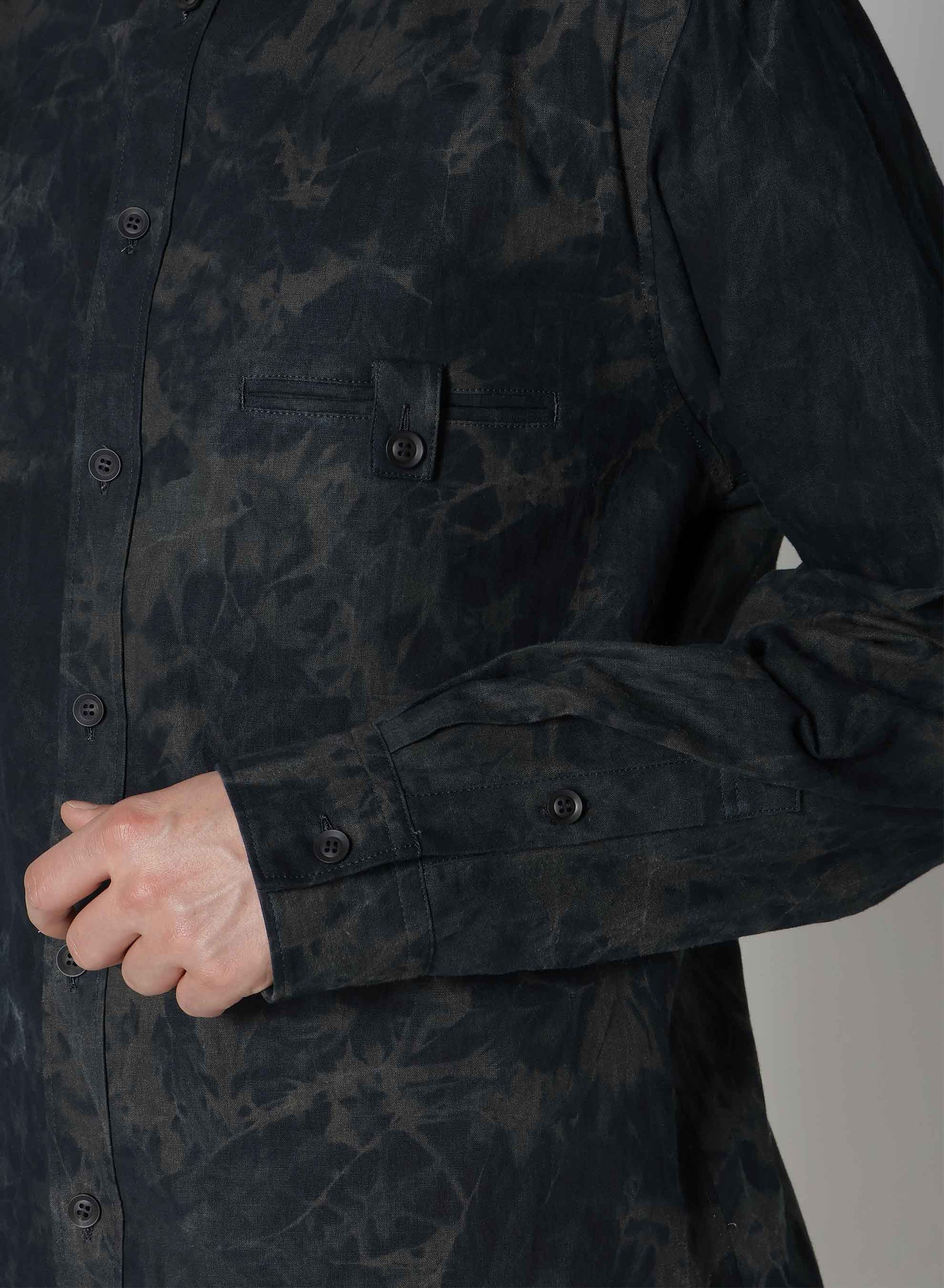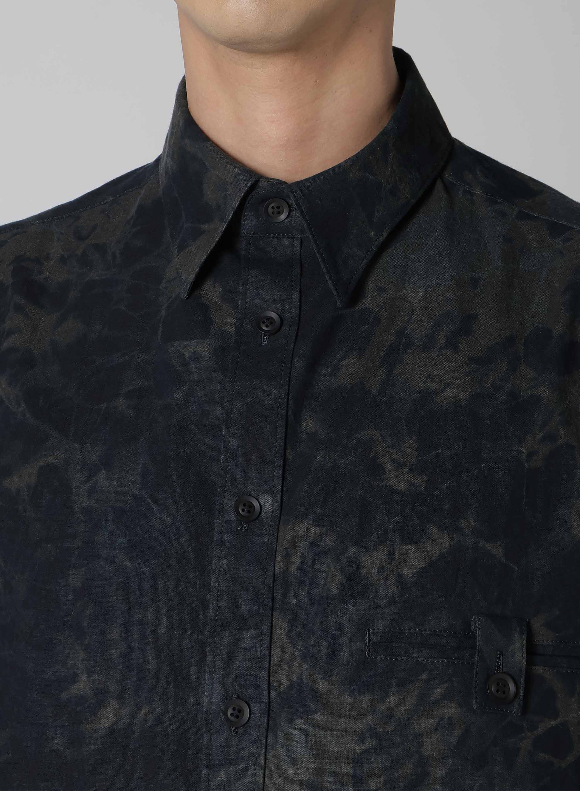 A blouse made from cotton-linen sheeting fabric featured in LOOK14. After indigo dyeing, it undergoes an ink coating to achieve a darker navy hue. The blouse is characterized by a chest pocket with double piping and a tab closure.