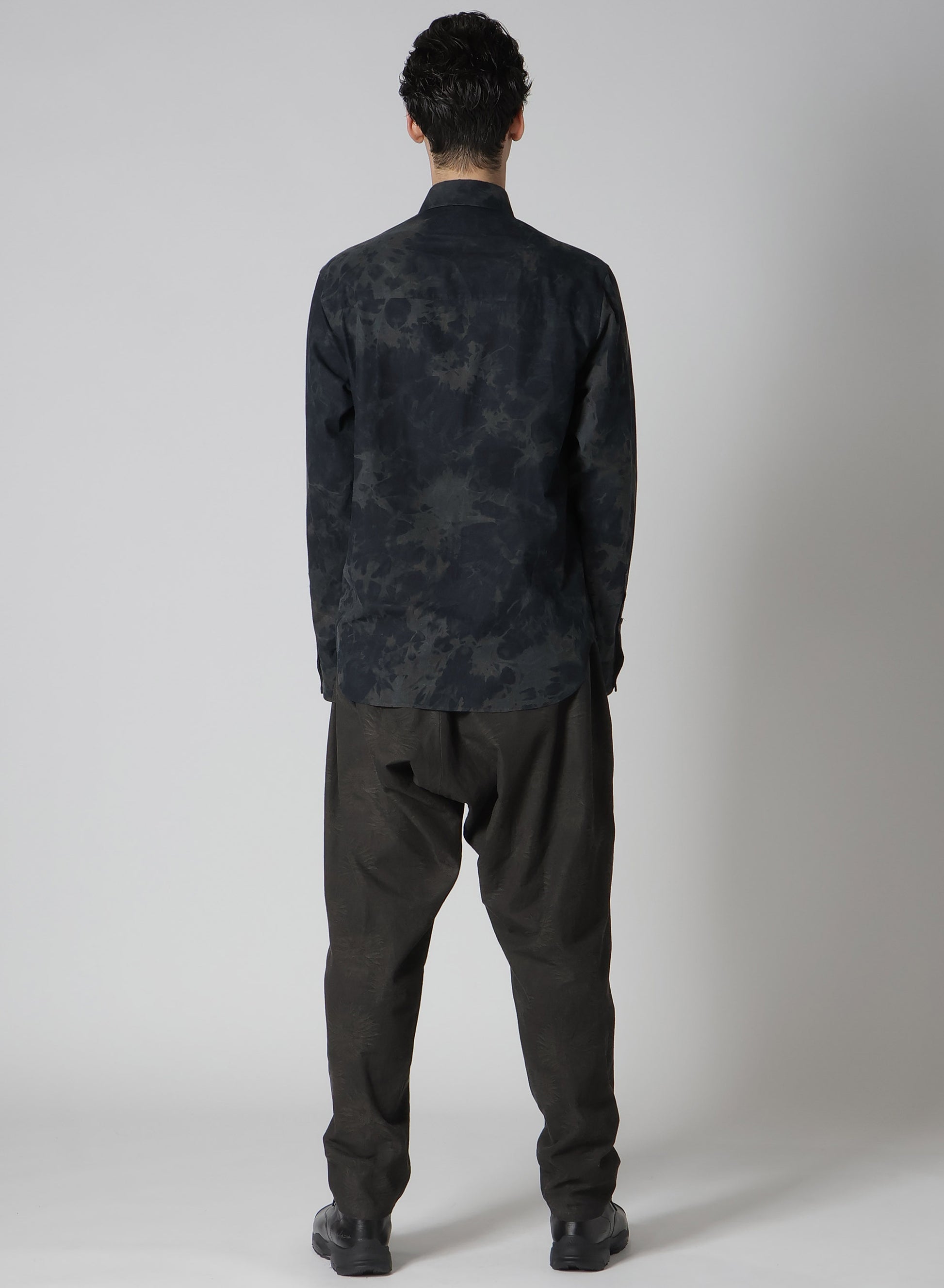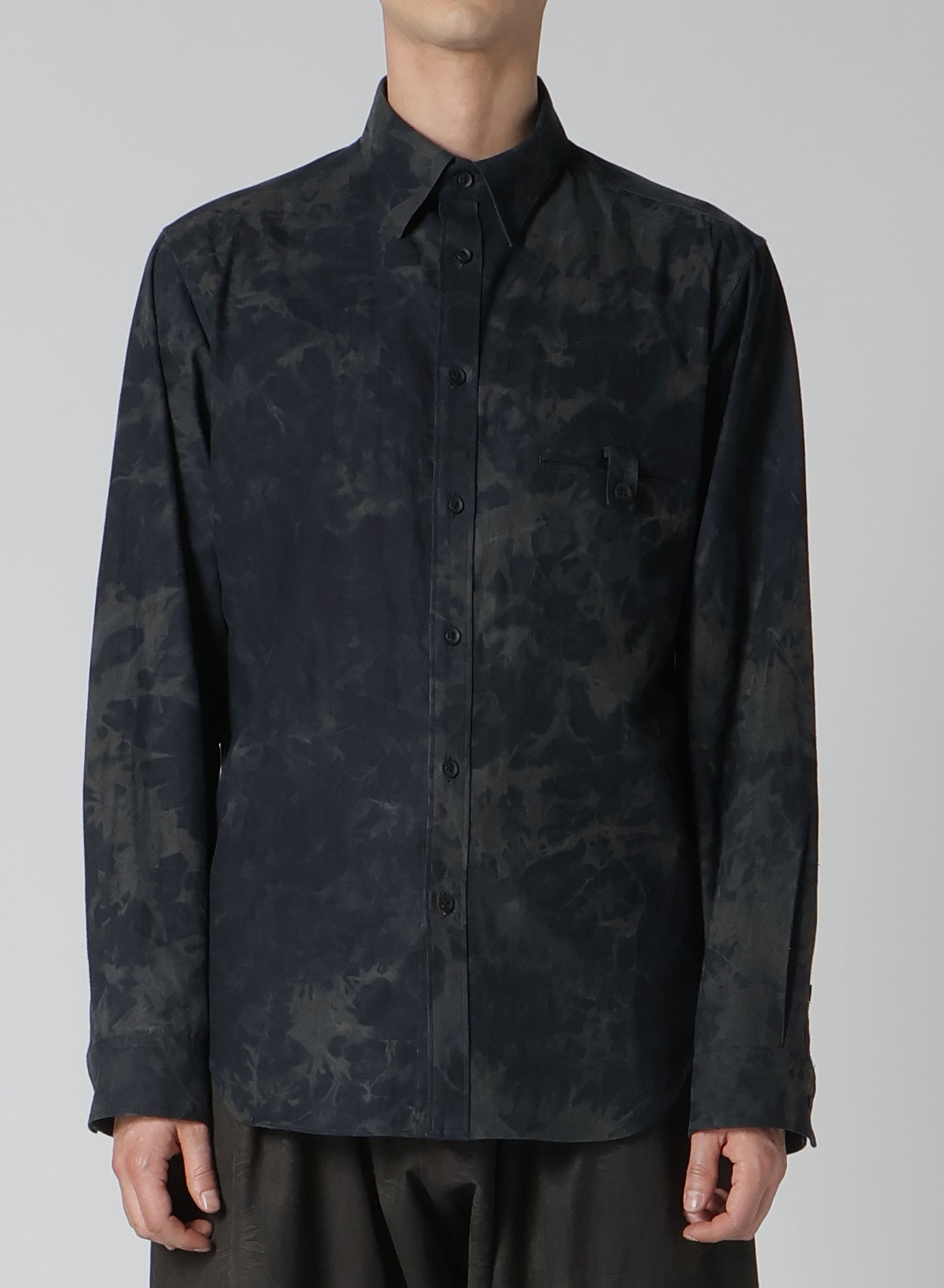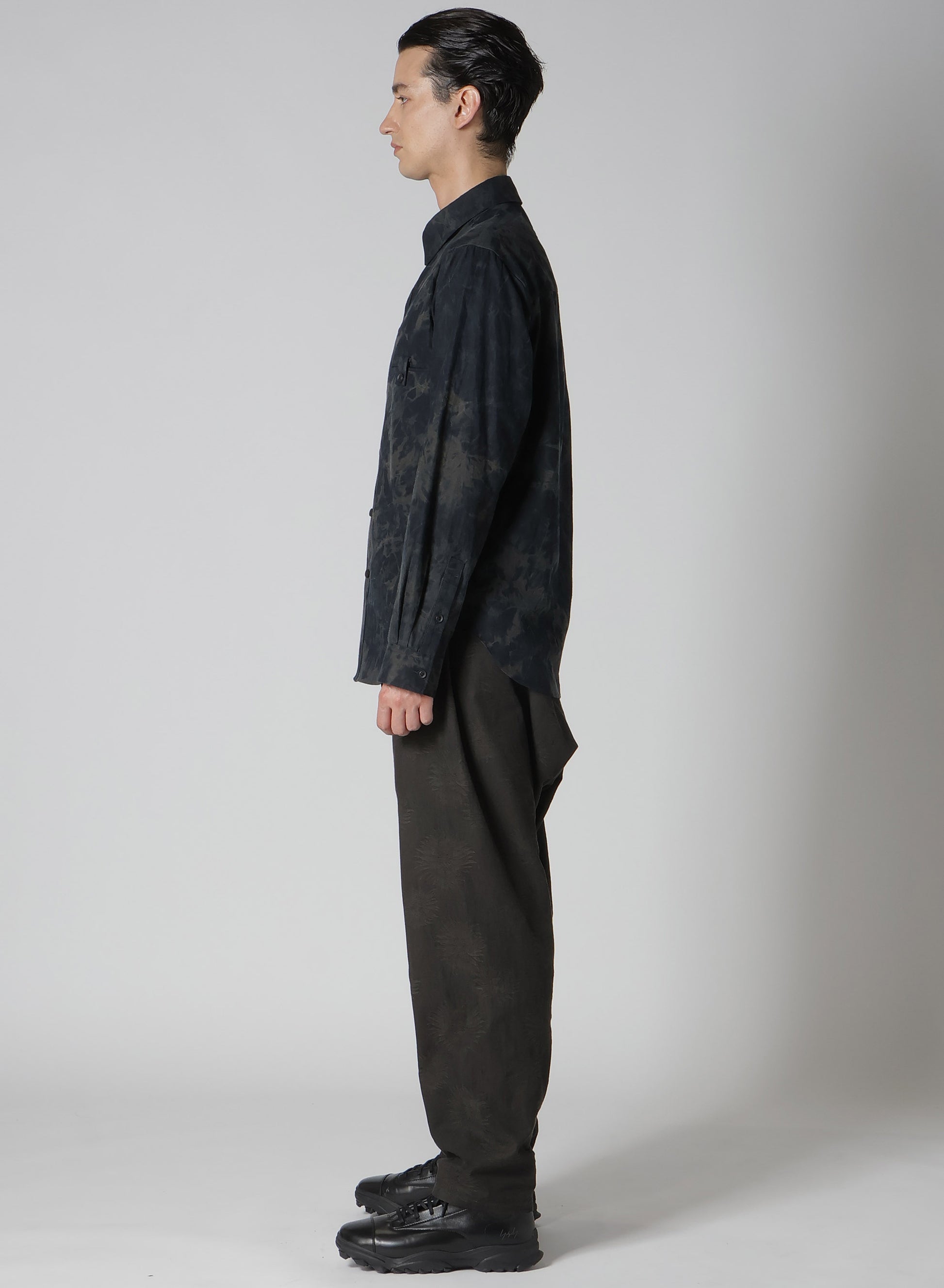 A blouse made from cotton-linen sheeting fabric featured in LOOK14. After indigo dyeing, it undergoes an ink coating to achieve a darker navy hue. The blouse is characterized by a chest pocket with double piping and a tab closure.