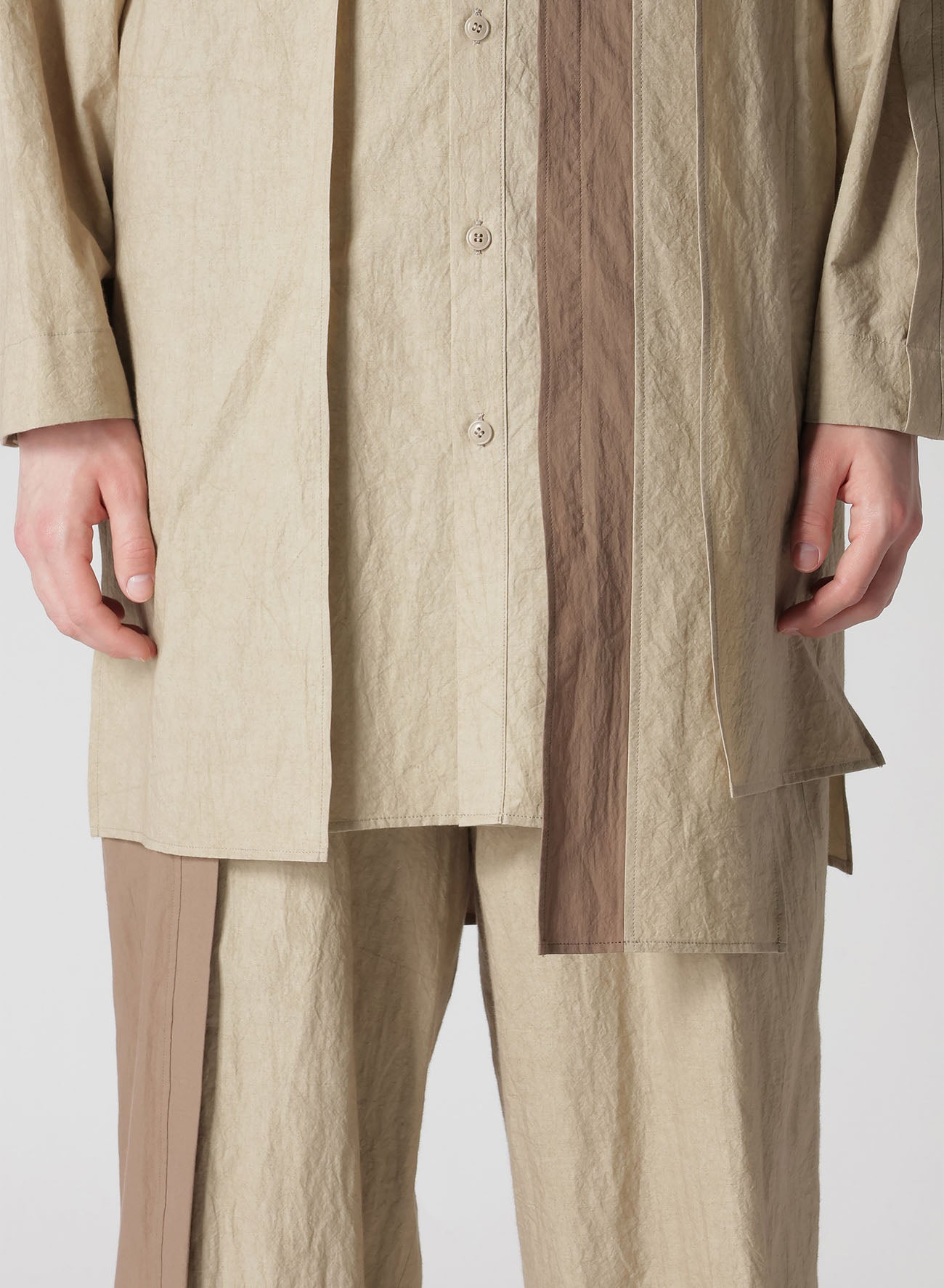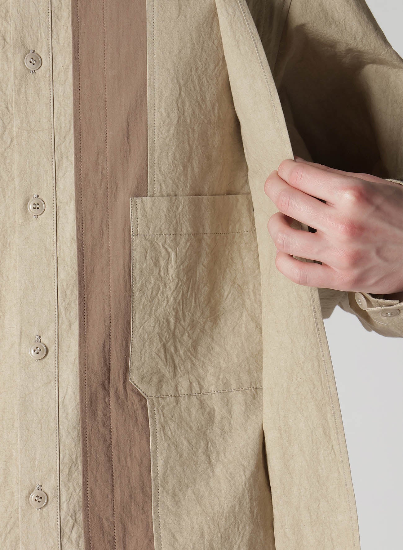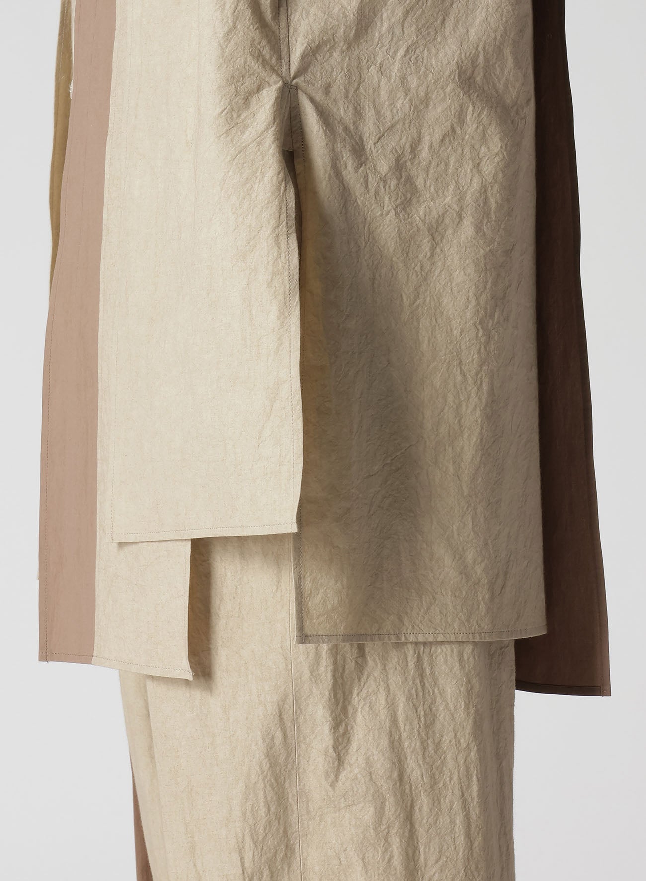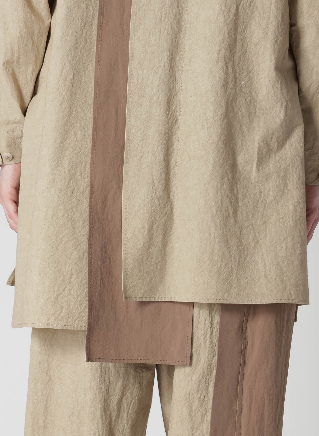 A versatile blouse featuring a natural wrinkled texture of cotton-linen and a unique combination design with different fabrics on the front and back. The comfortable fabric and refreshing design make it a suitable choice for a stylish and relaxed look.