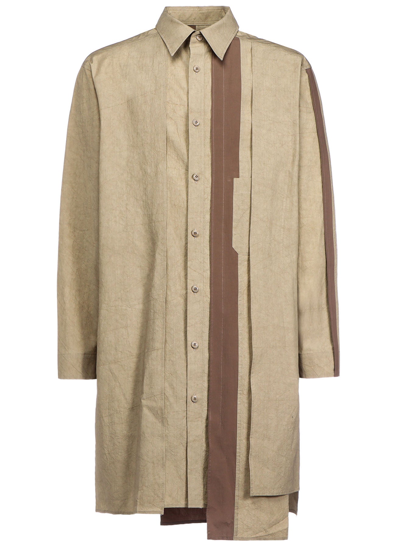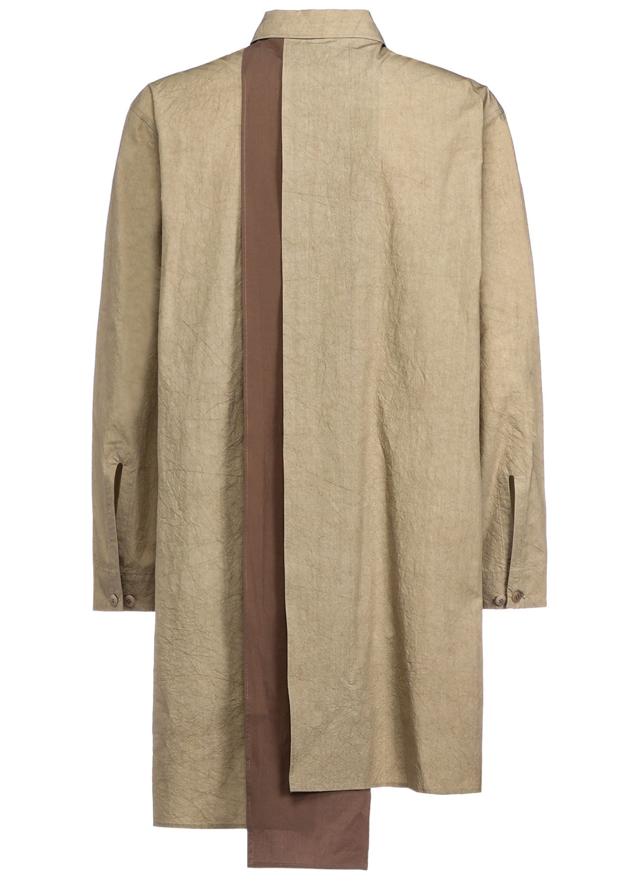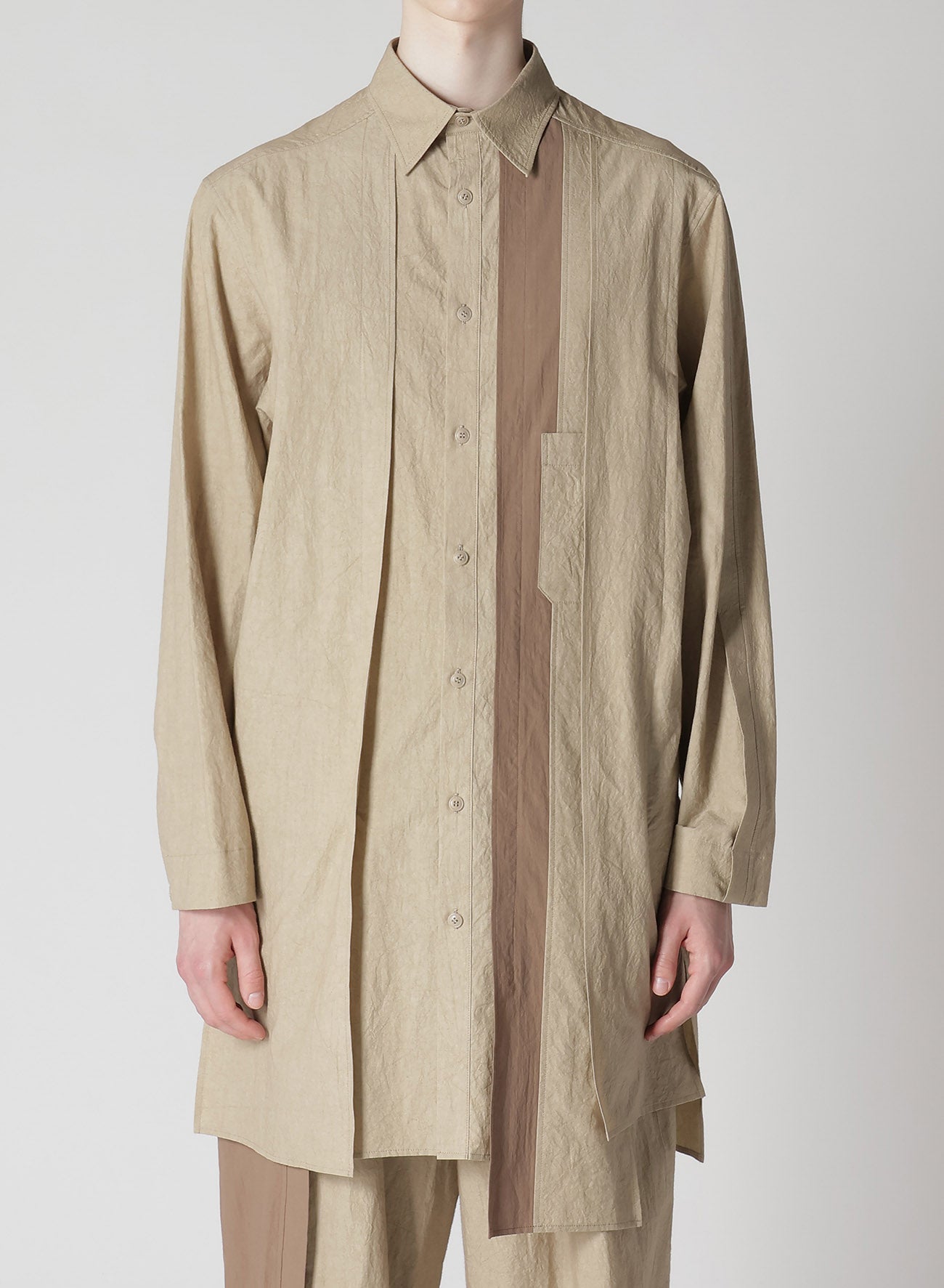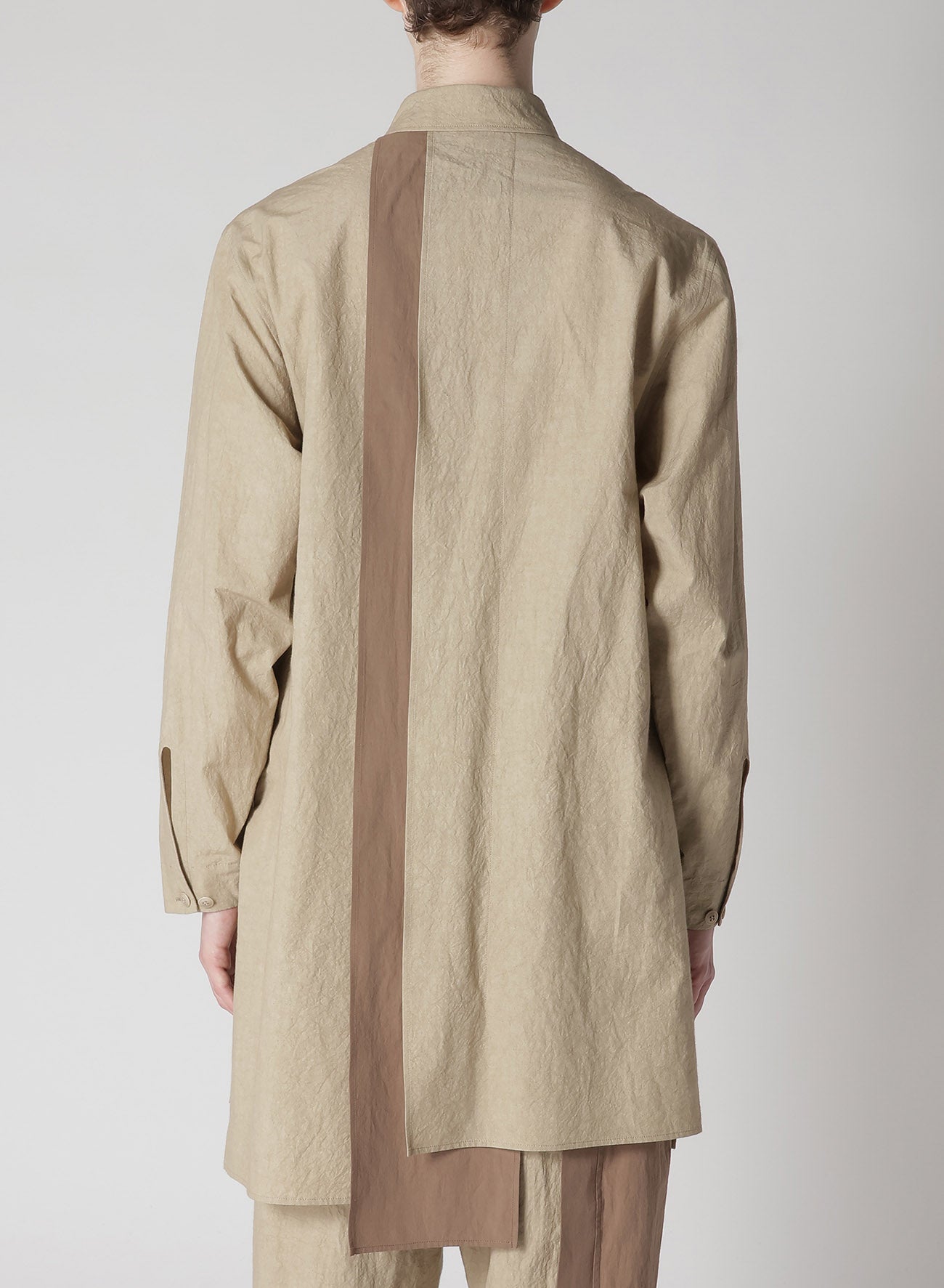 A versatile blouse featuring a natural wrinkled texture of cotton-linen and a unique combination design with different fabrics on the front and back. The comfortable fabric and refreshing design make it a suitable choice for a stylish and relaxed look.