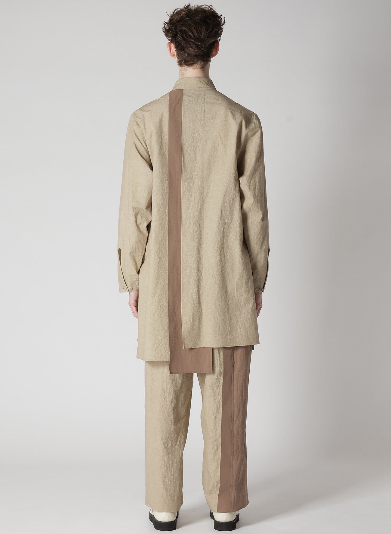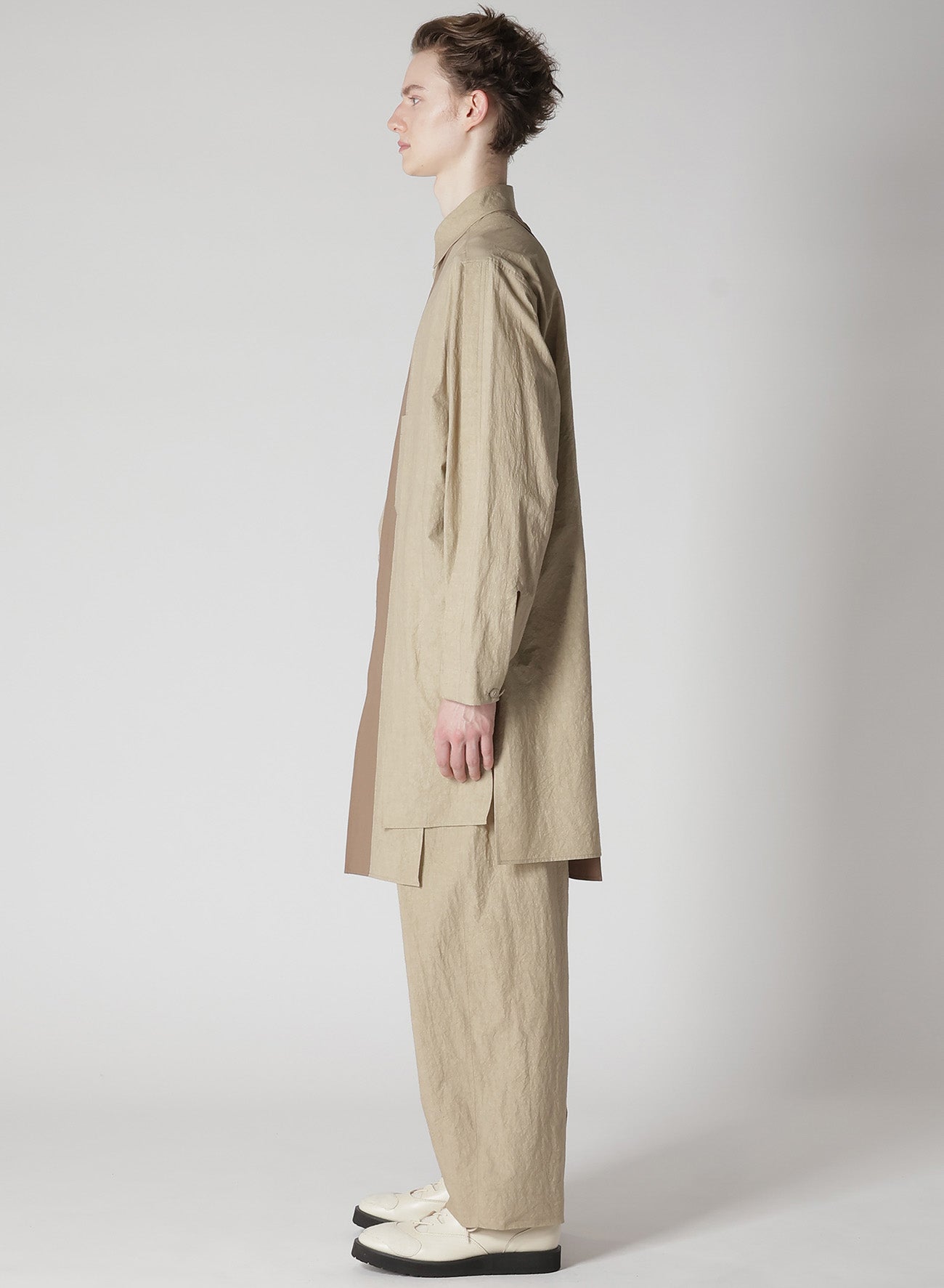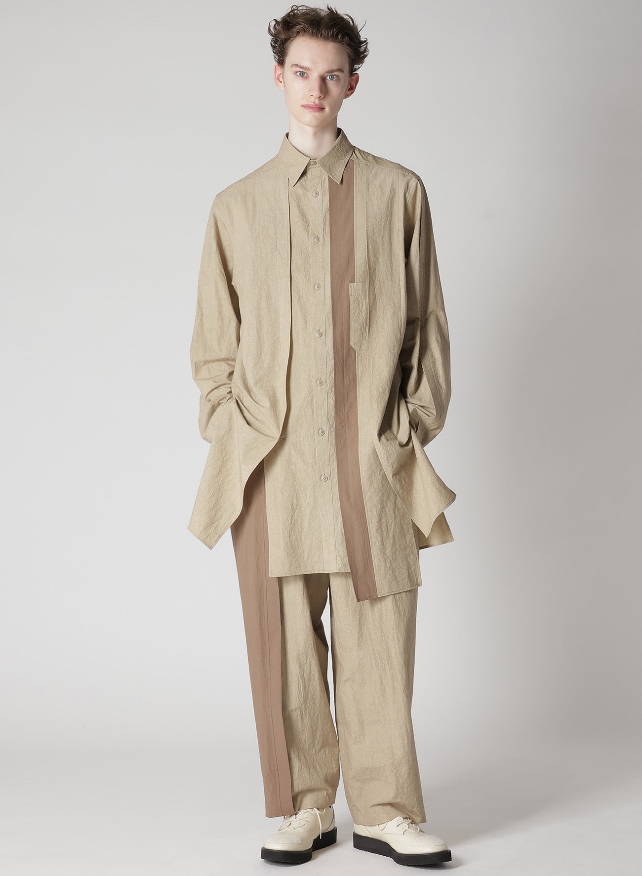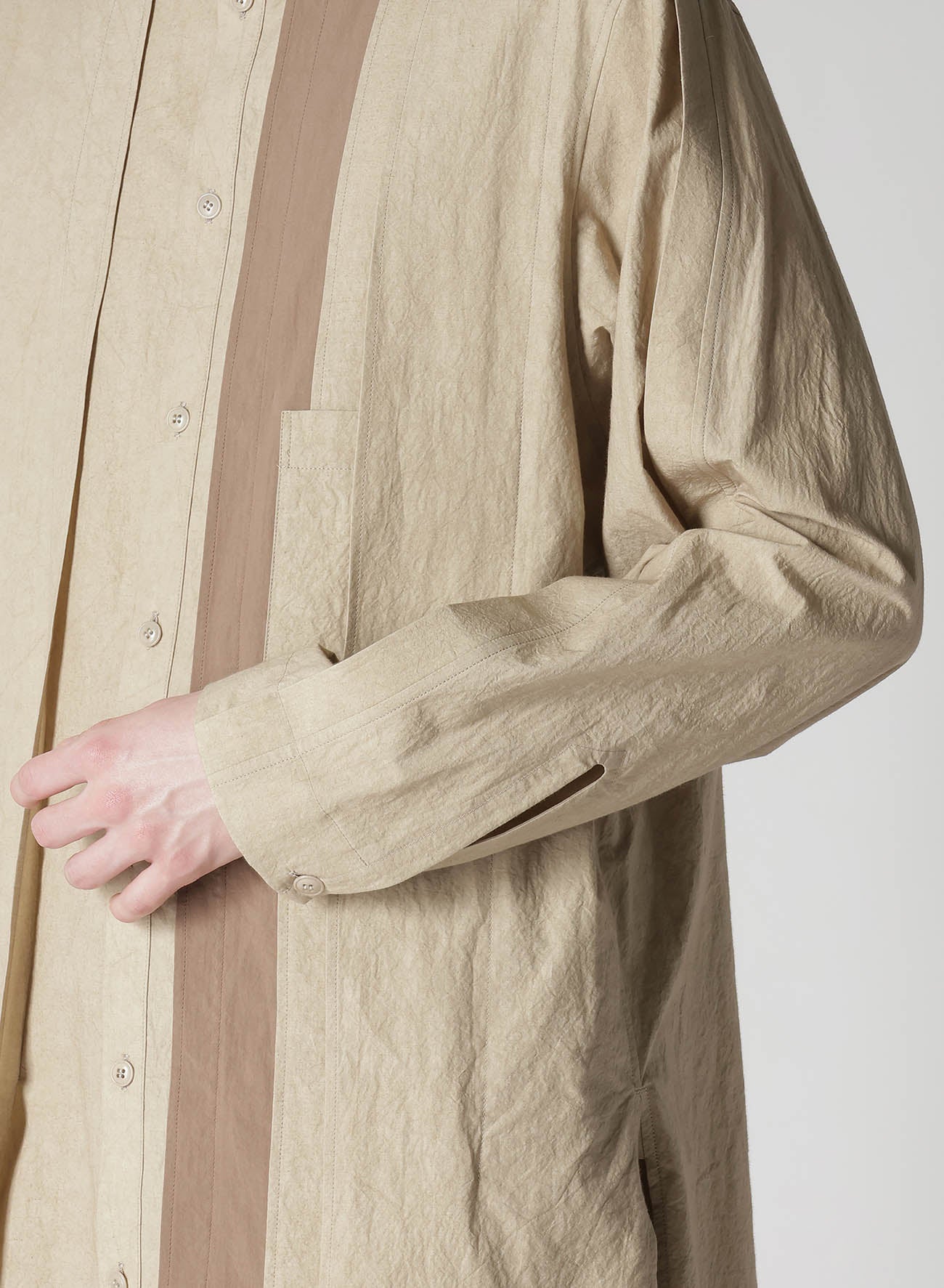 A versatile blouse featuring a natural wrinkled texture of cotton-linen and a unique combination design with different fabrics on the front and back. The comfortable fabric and refreshing design make it a suitable choice for a stylish and relaxed look.
