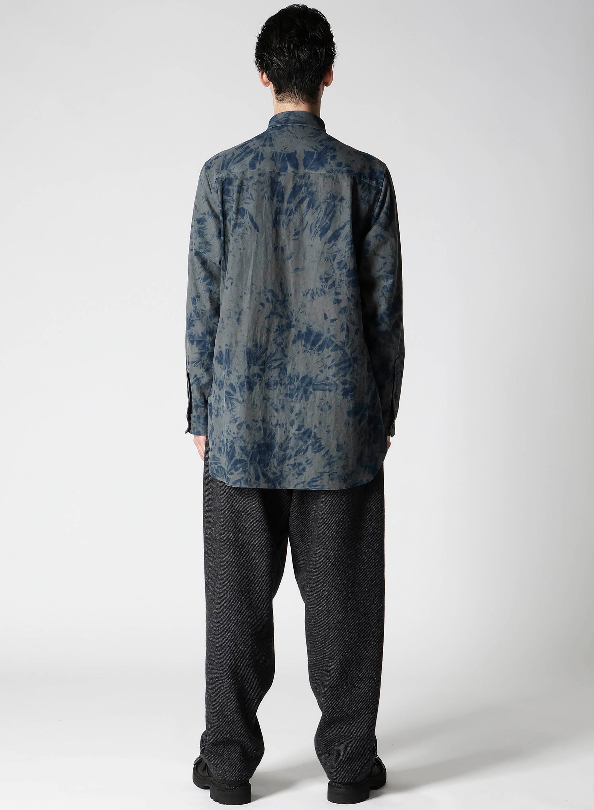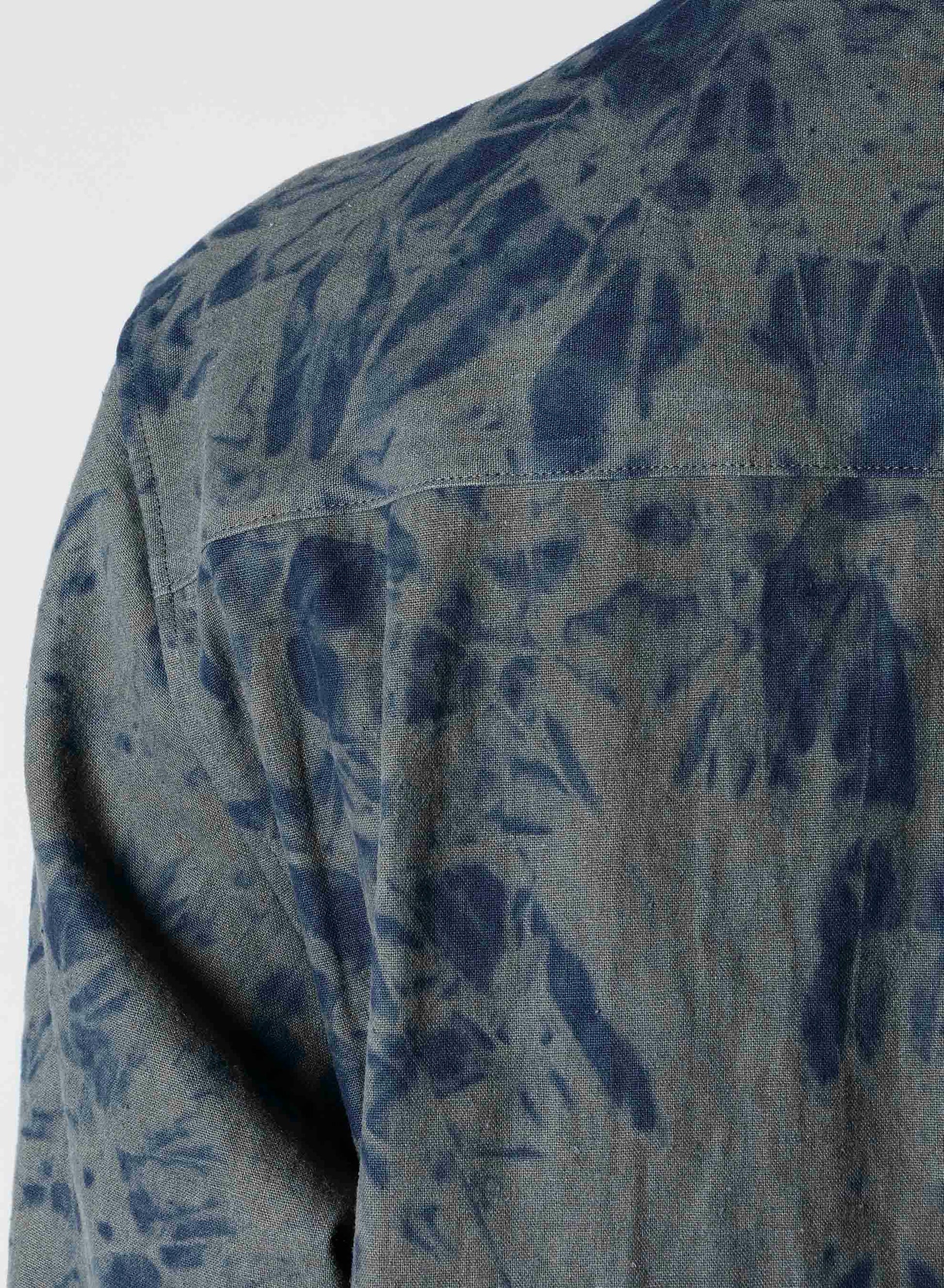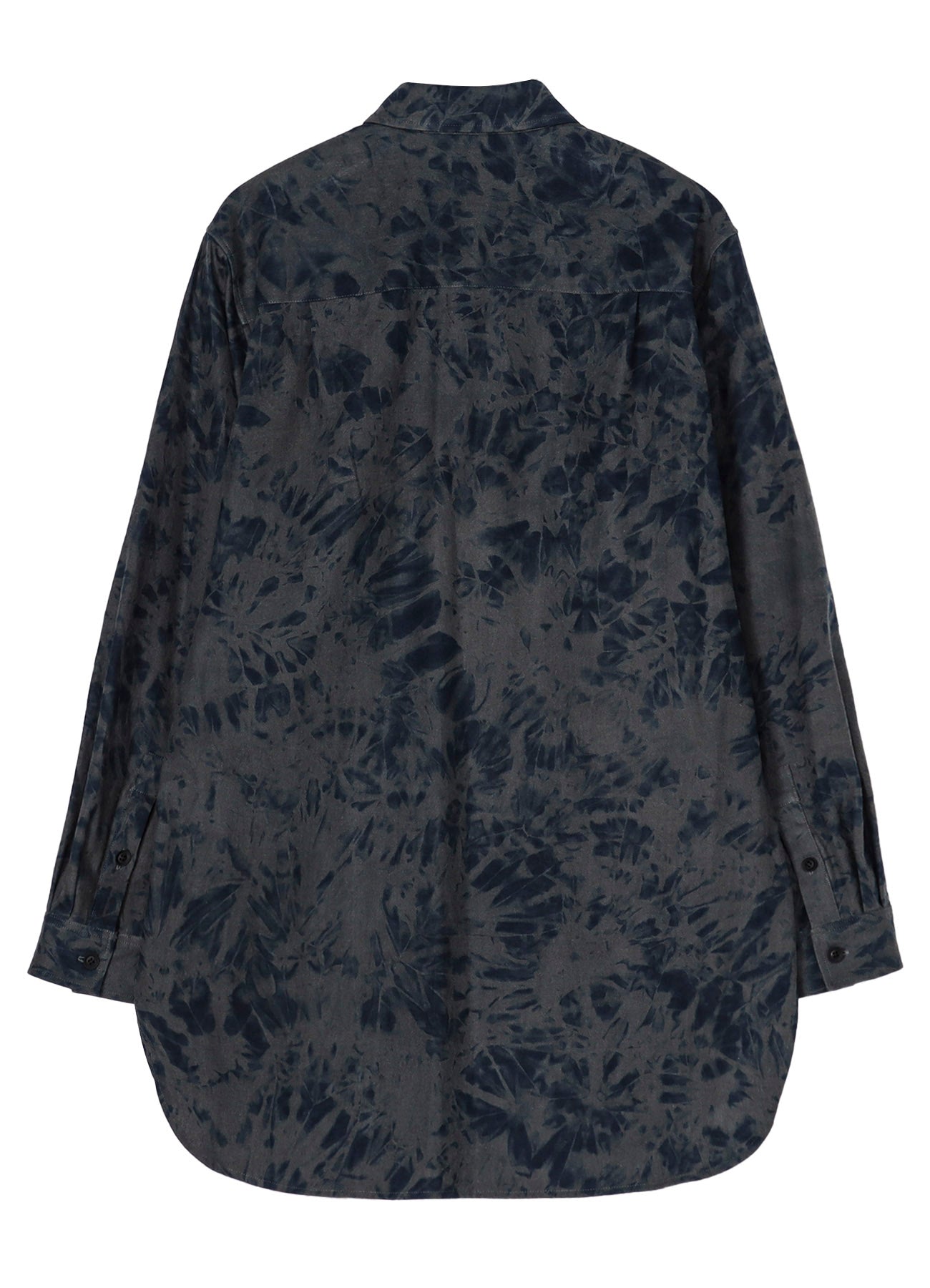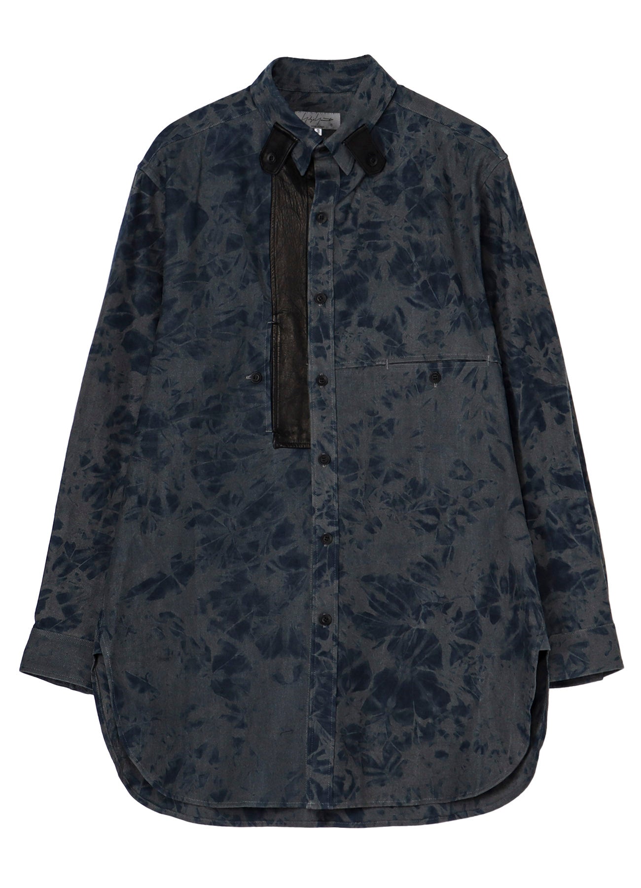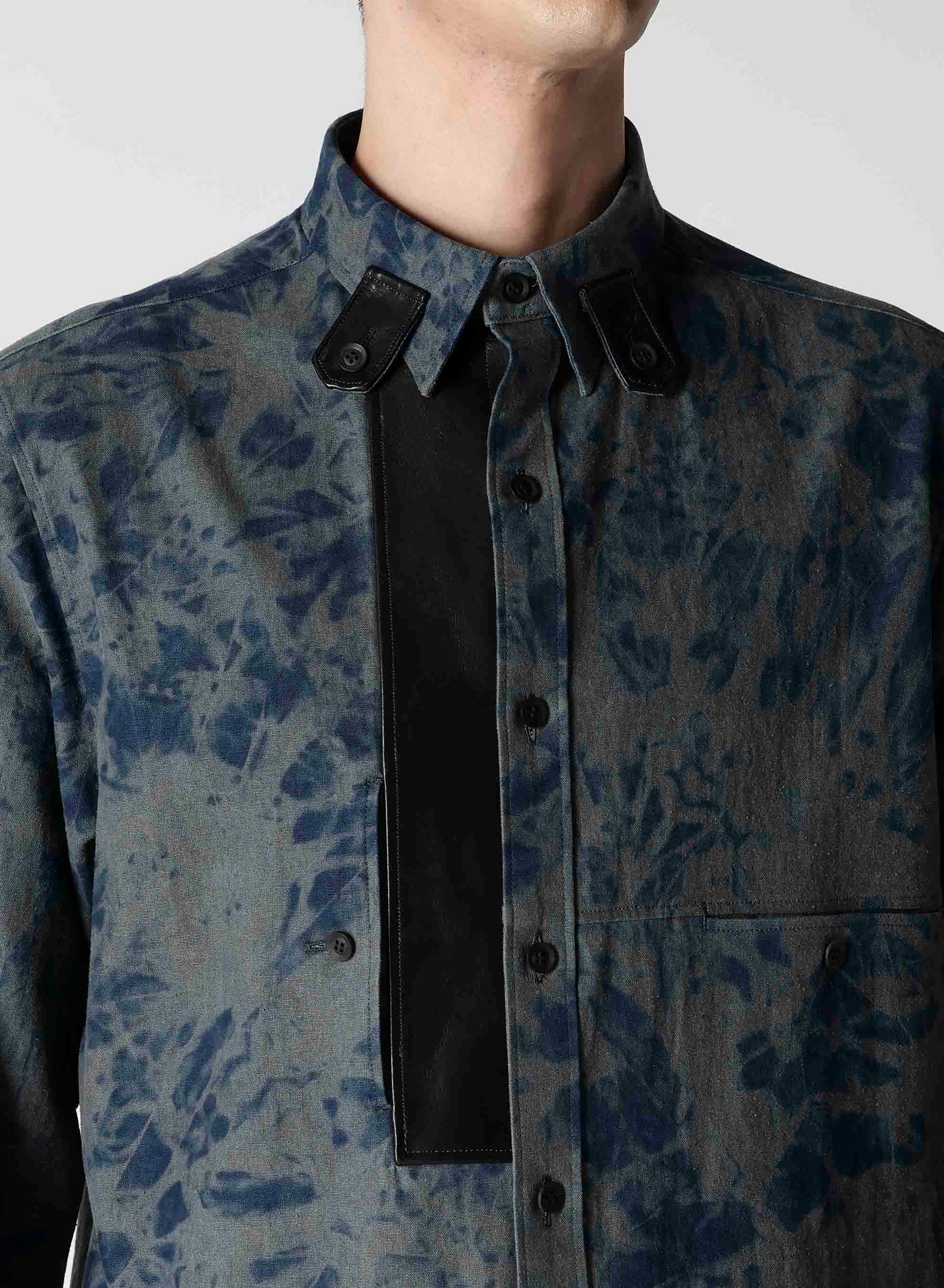 This blouse from LOOK16 features a combination of cotton-linen canvas and leather. It undergoes a bleaching process to create uneven shades and then over-dyed with sumi ink. Black leather is used on the left and right combination pockets, collar tab, and right front combination.