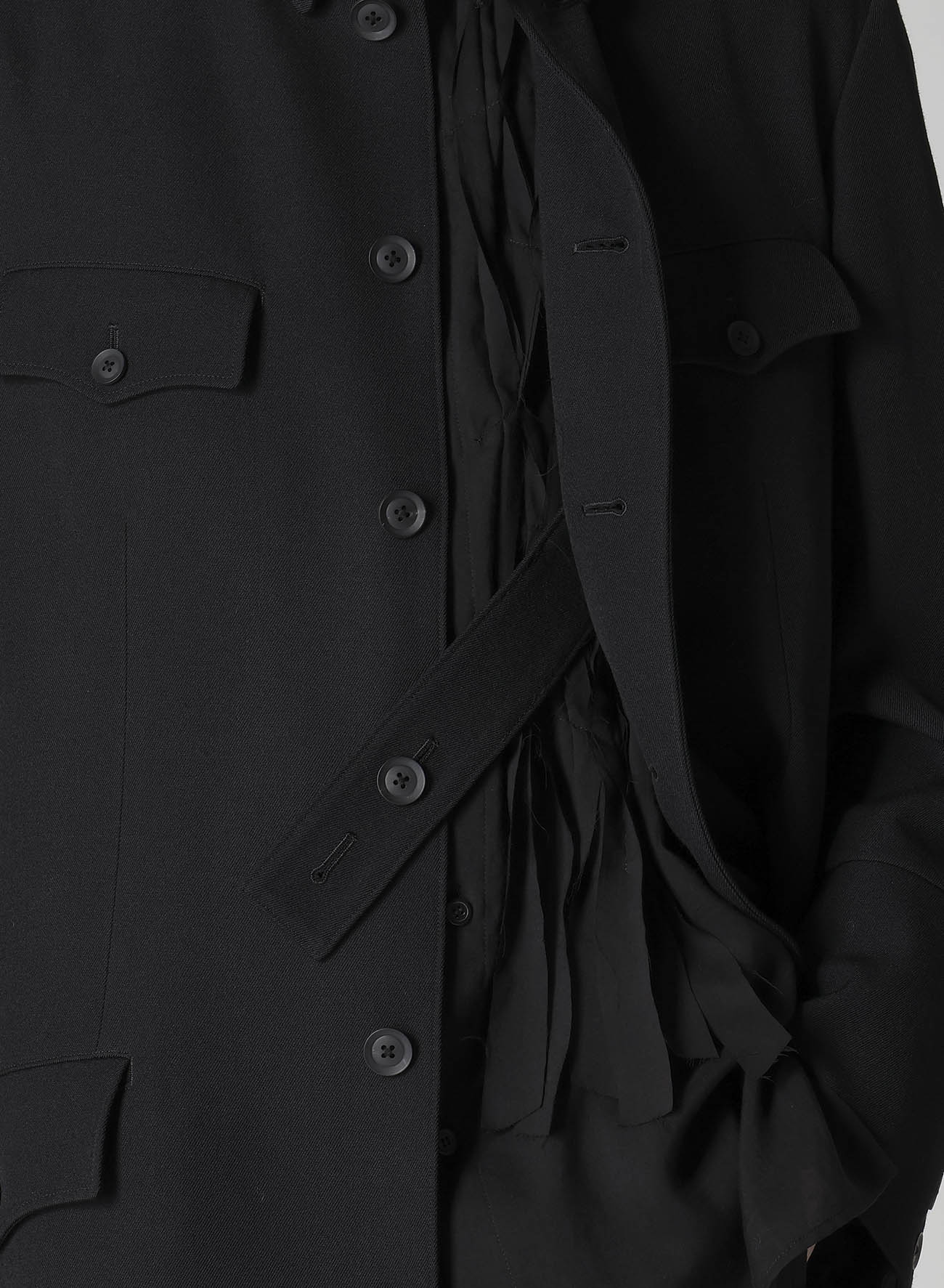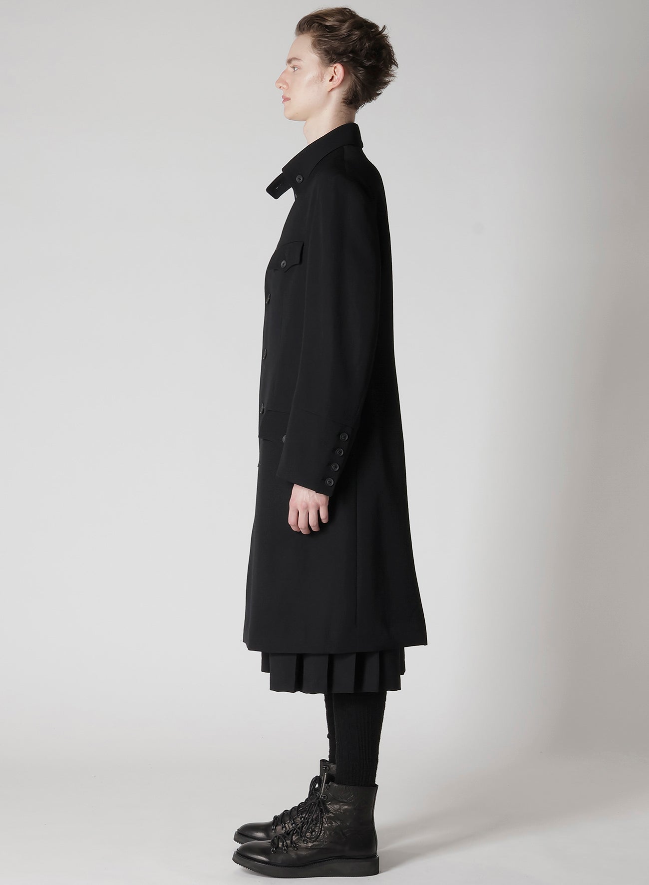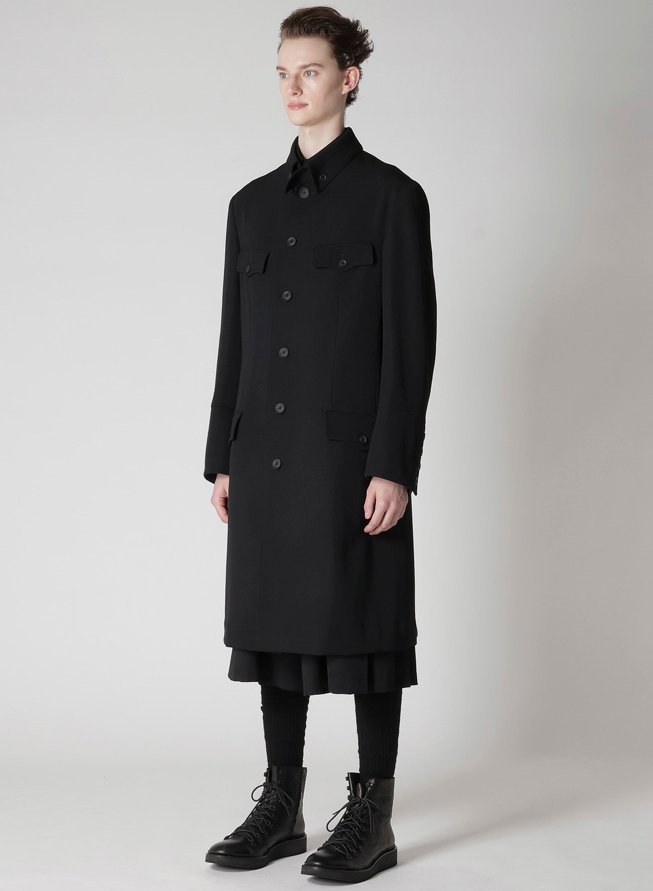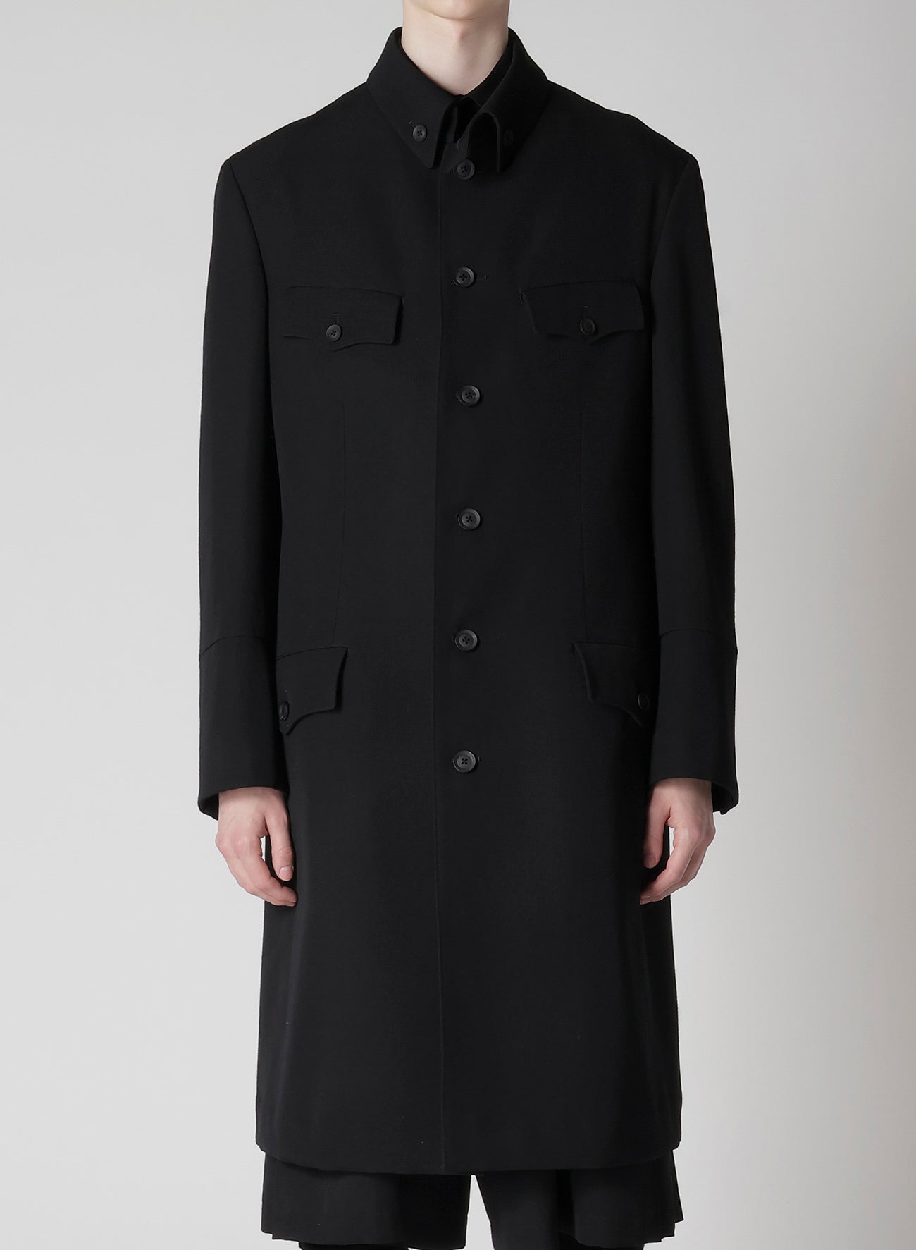 A back-pleated long jacket crafted from the signature material of army gabardine for the autumn-winter season. Characterized by military detail-inspired pleats at the back, it mimics the texture of vintage military fabric, being thicker than typical gabardine with pronounced twill lines.