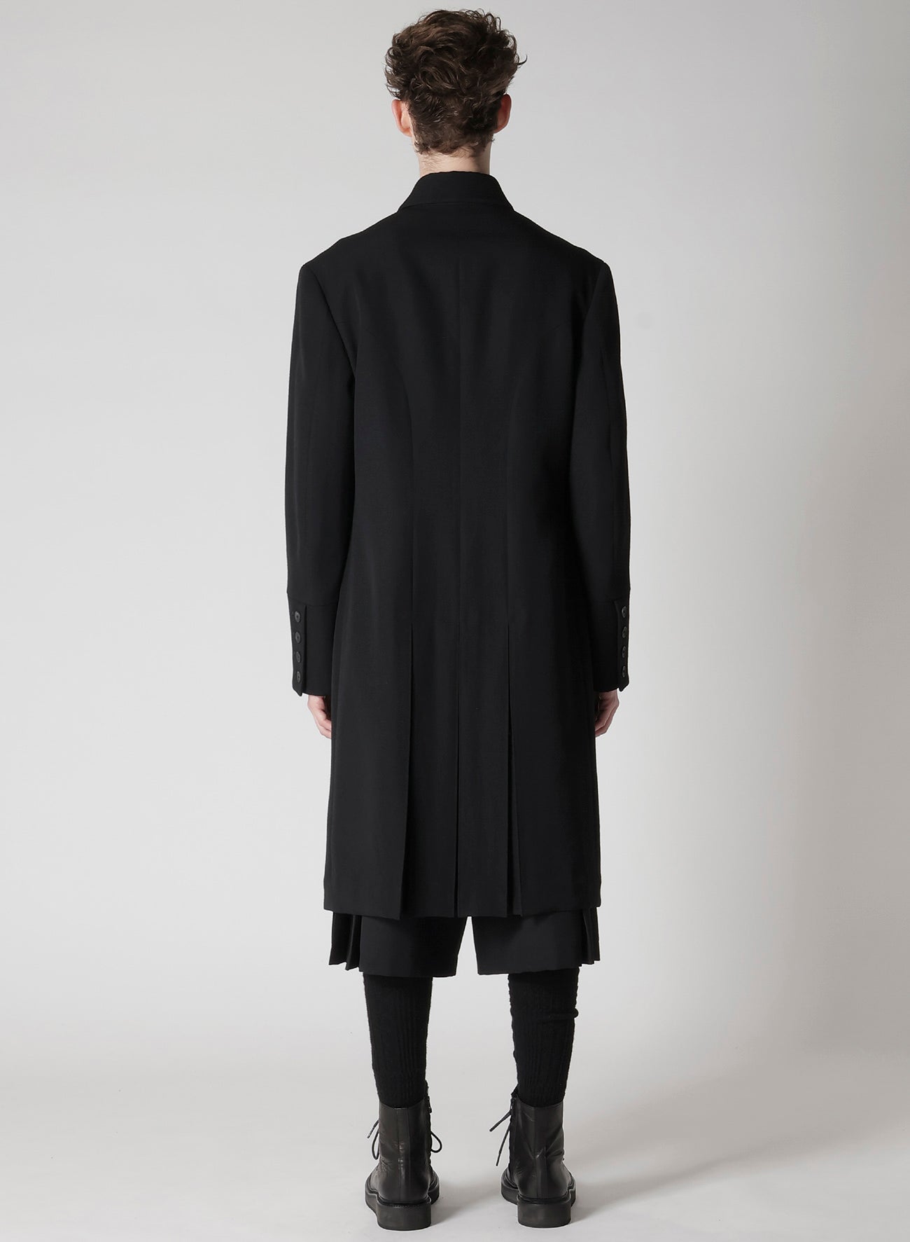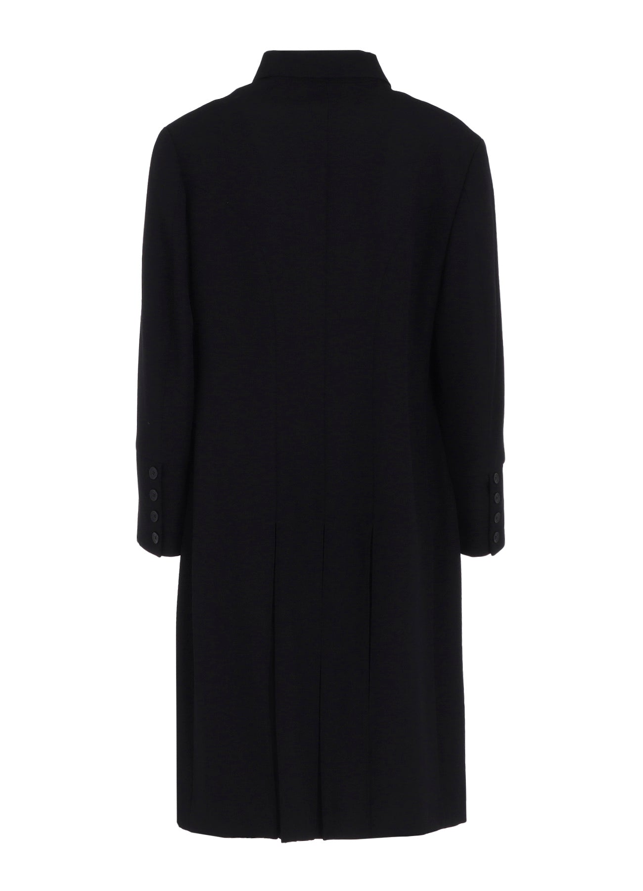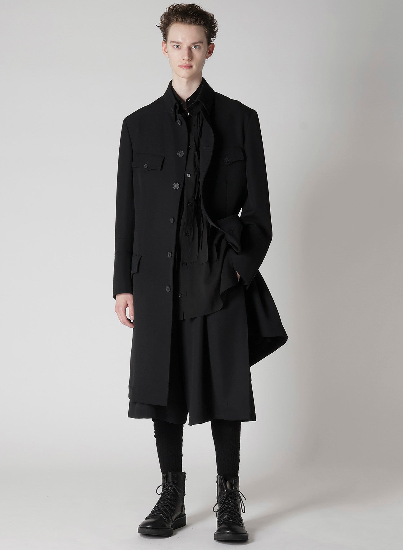 A back-pleated long jacket crafted from the signature material of army gabardine for the autumn-winter season. Characterized by military detail-inspired pleats at the back, it mimics the texture of vintage military fabric, being thicker than typical gabardine with pronounced twill lines.
