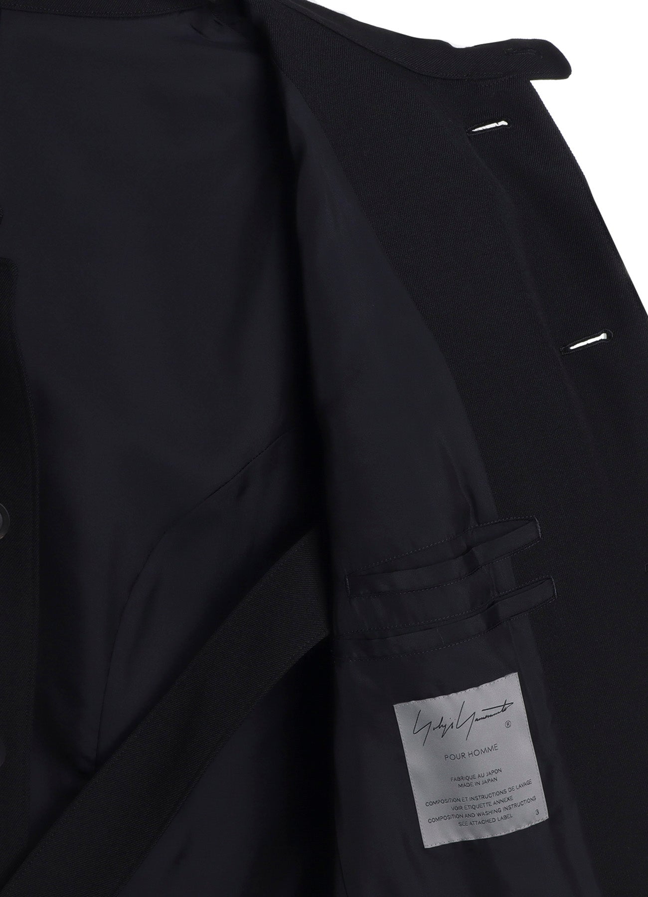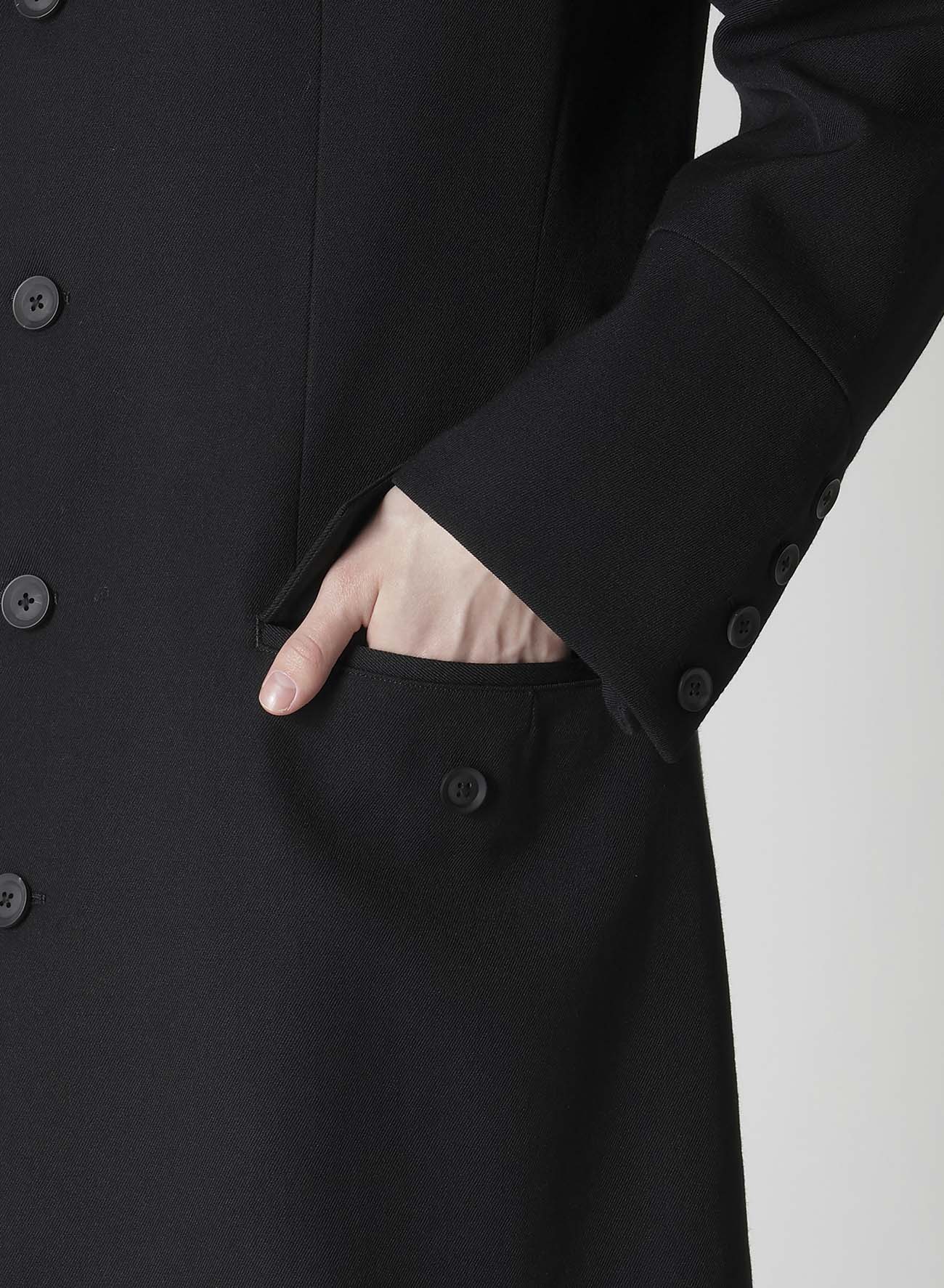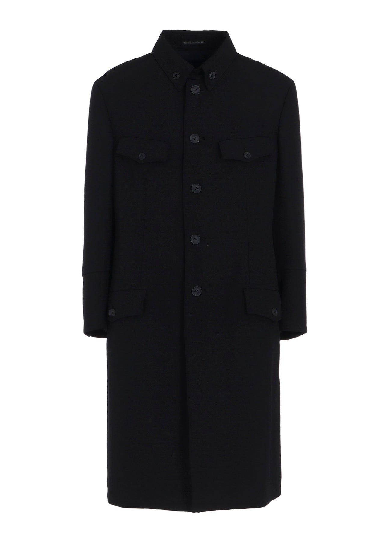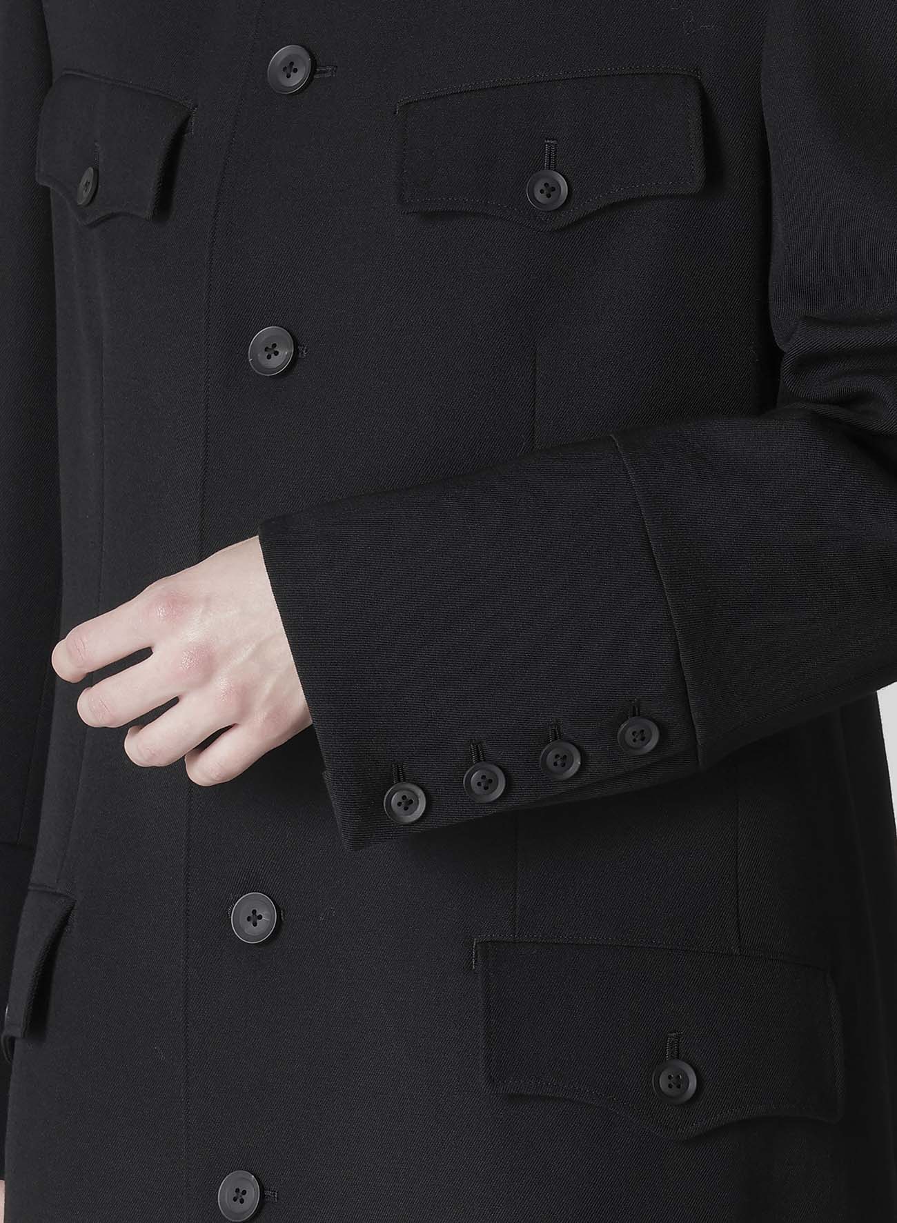 A back-pleated long jacket crafted from the signature material of army gabardine for the autumn-winter season. Characterized by military detail-inspired pleats at the back, it mimics the texture of vintage military fabric, being thicker than typical gabardine with pronounced twill lines.
