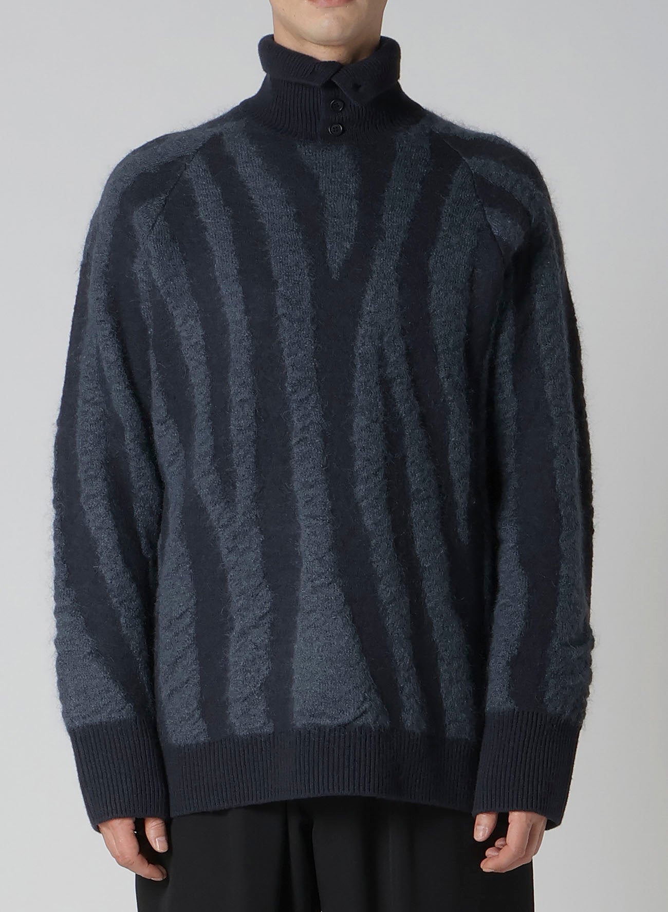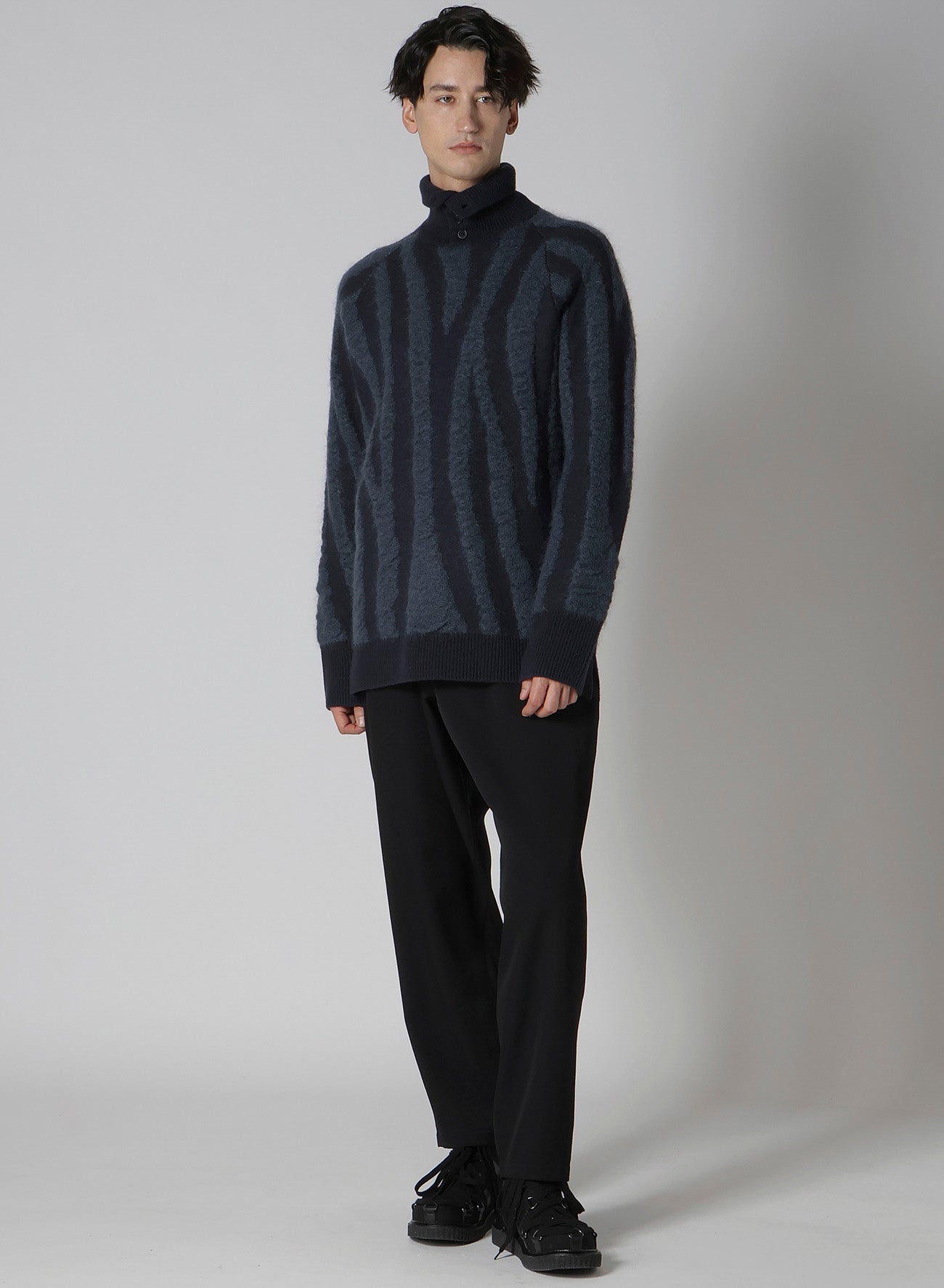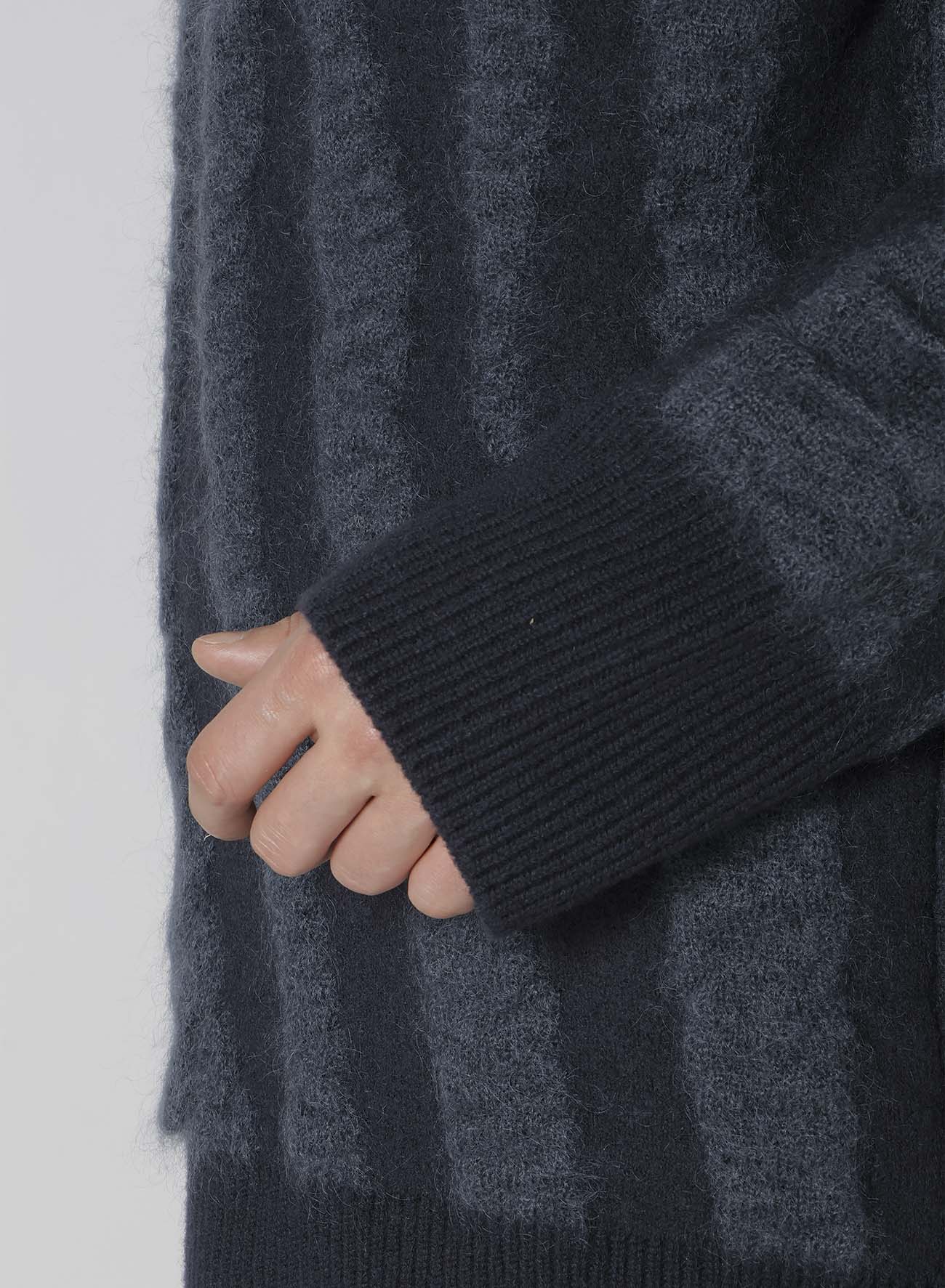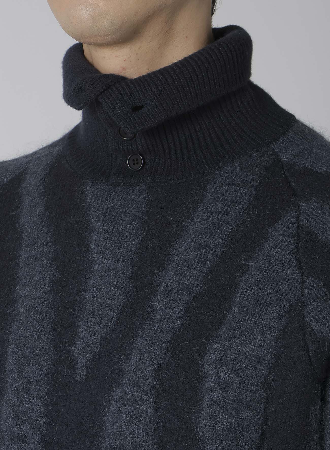 This Henley neck knit is made with a wool, mohair, and nylon blend yarn. Its unique design features a high-pile, volume-rich tam-tam yarn creating a striped pattern. Differences in shrinkage rates accentuate the material's texture variations.