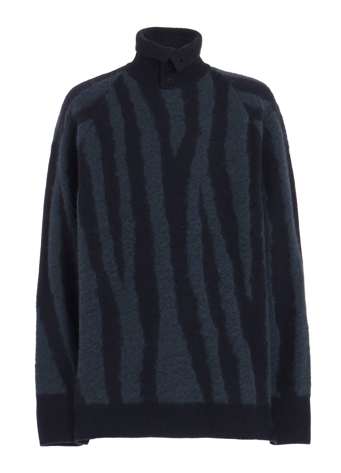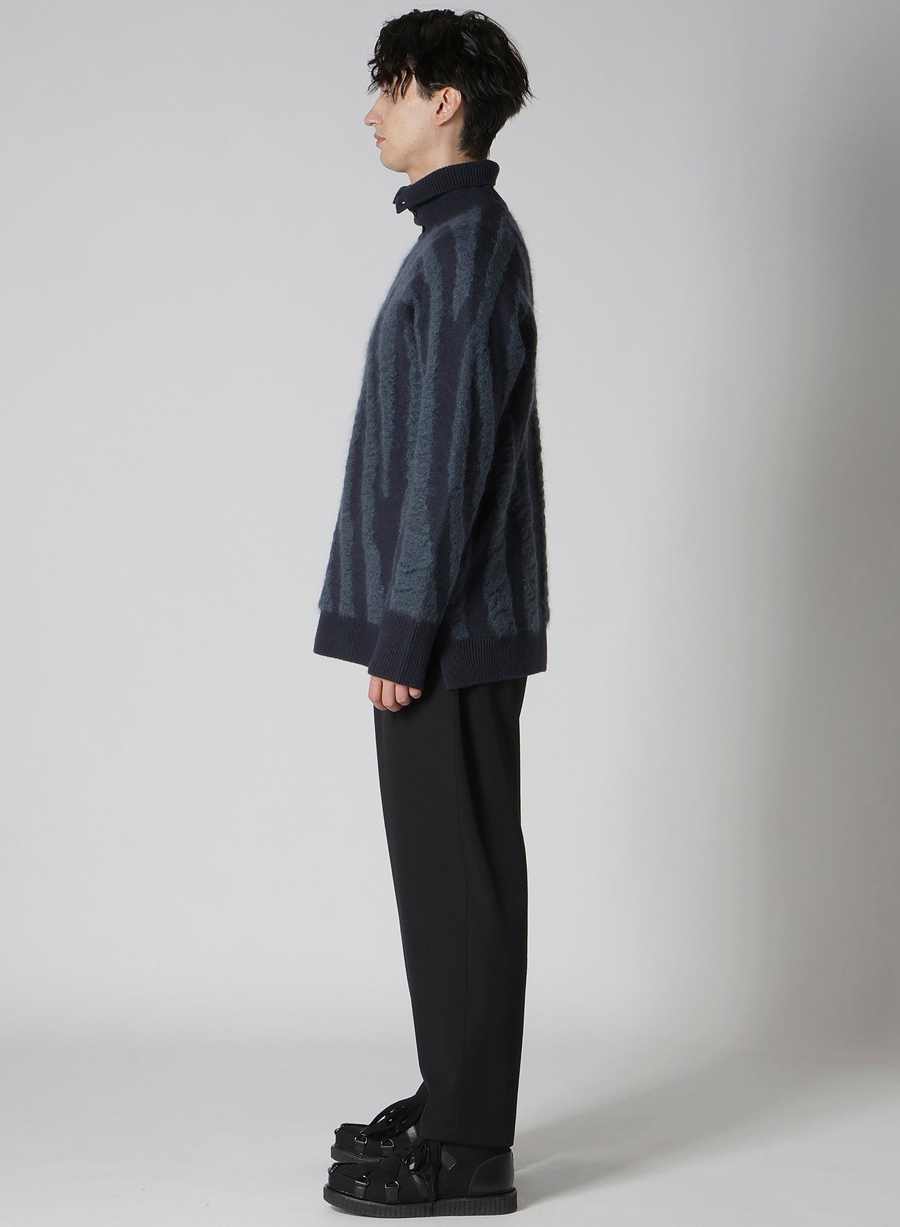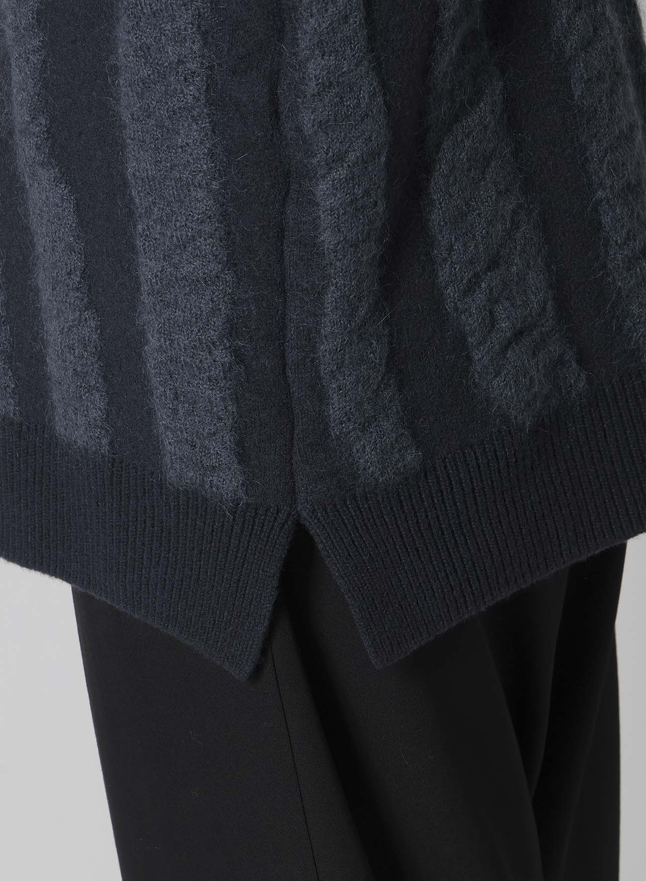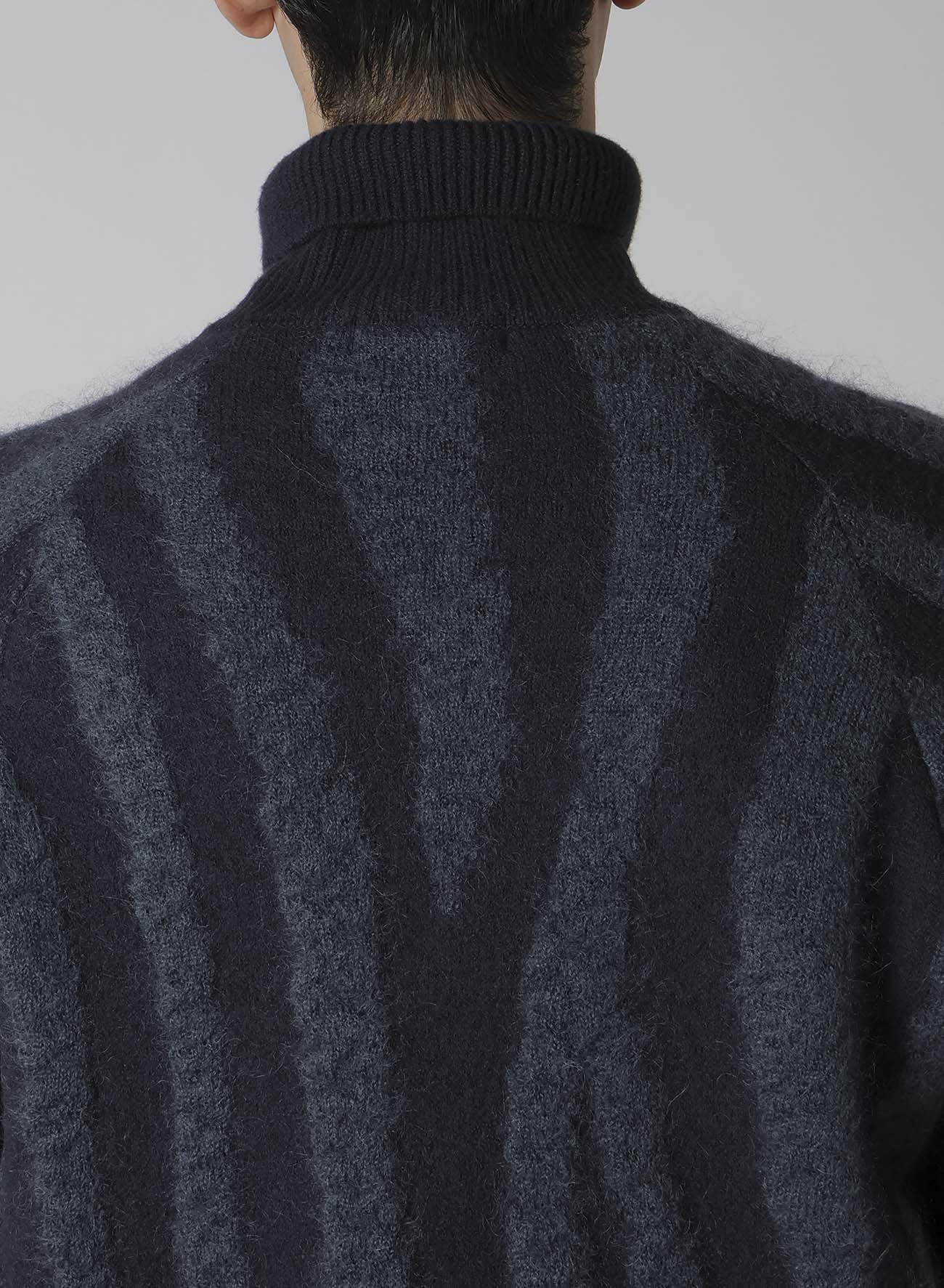 This Henley neck knit is made with a wool, mohair, and nylon blend yarn. Its unique design features a high-pile, volume-rich tam-tam yarn creating a striped pattern. Differences in shrinkage rates accentuate the material's texture variations.