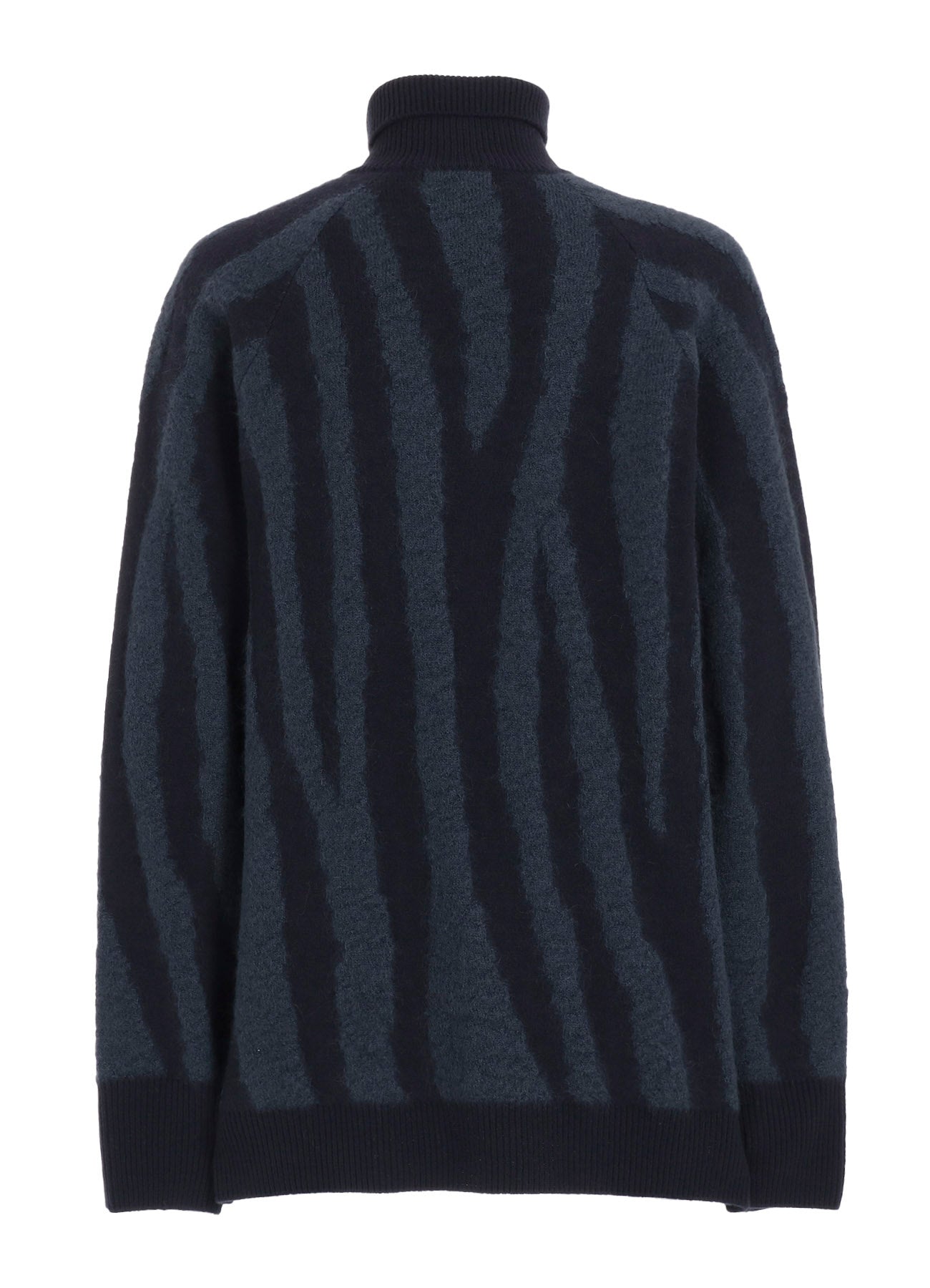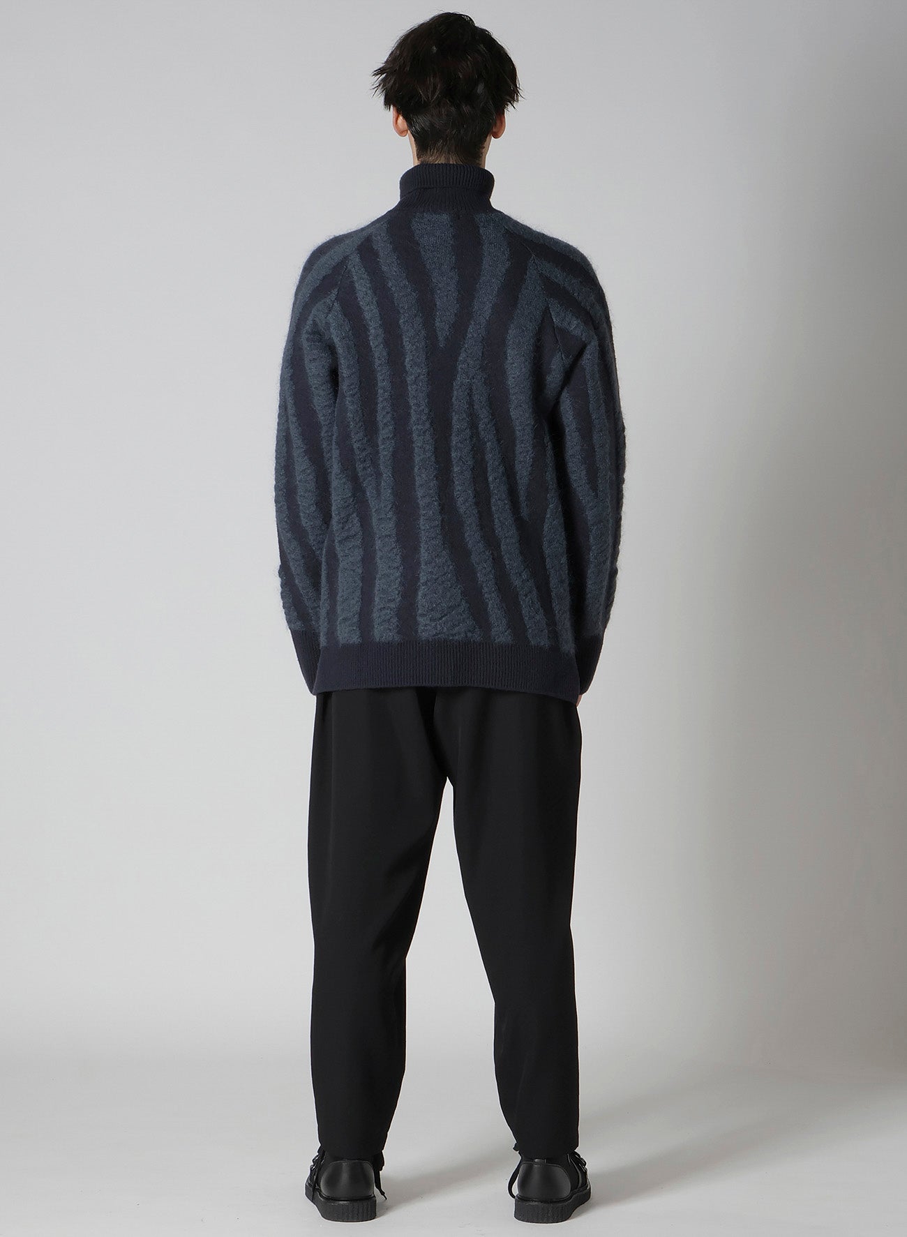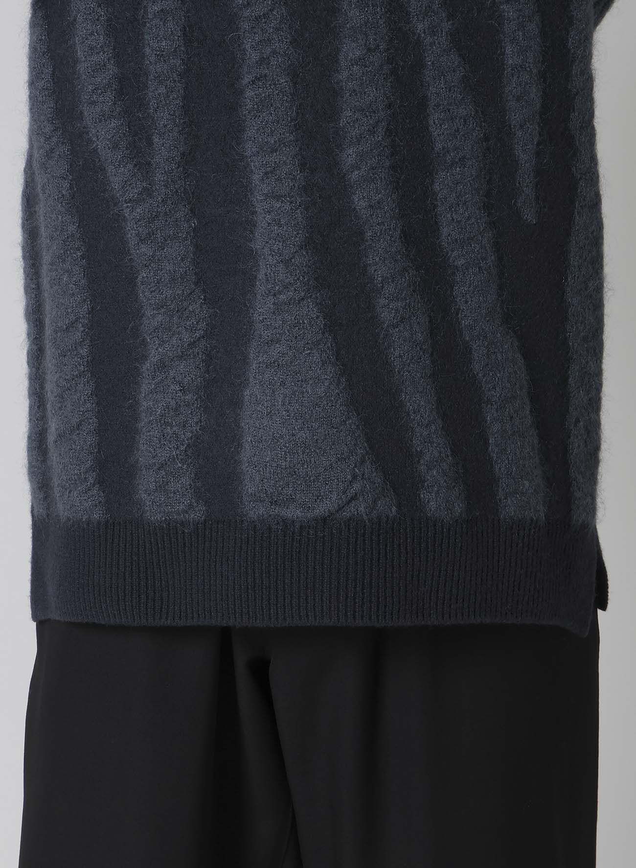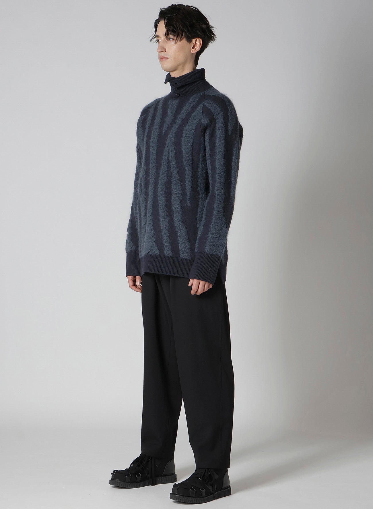 This Henley neck knit is made with a wool, mohair, and nylon blend yarn. Its unique design features a high-pile, volume-rich tam-tam yarn creating a striped pattern. Differences in shrinkage rates accentuate the material's texture variations.