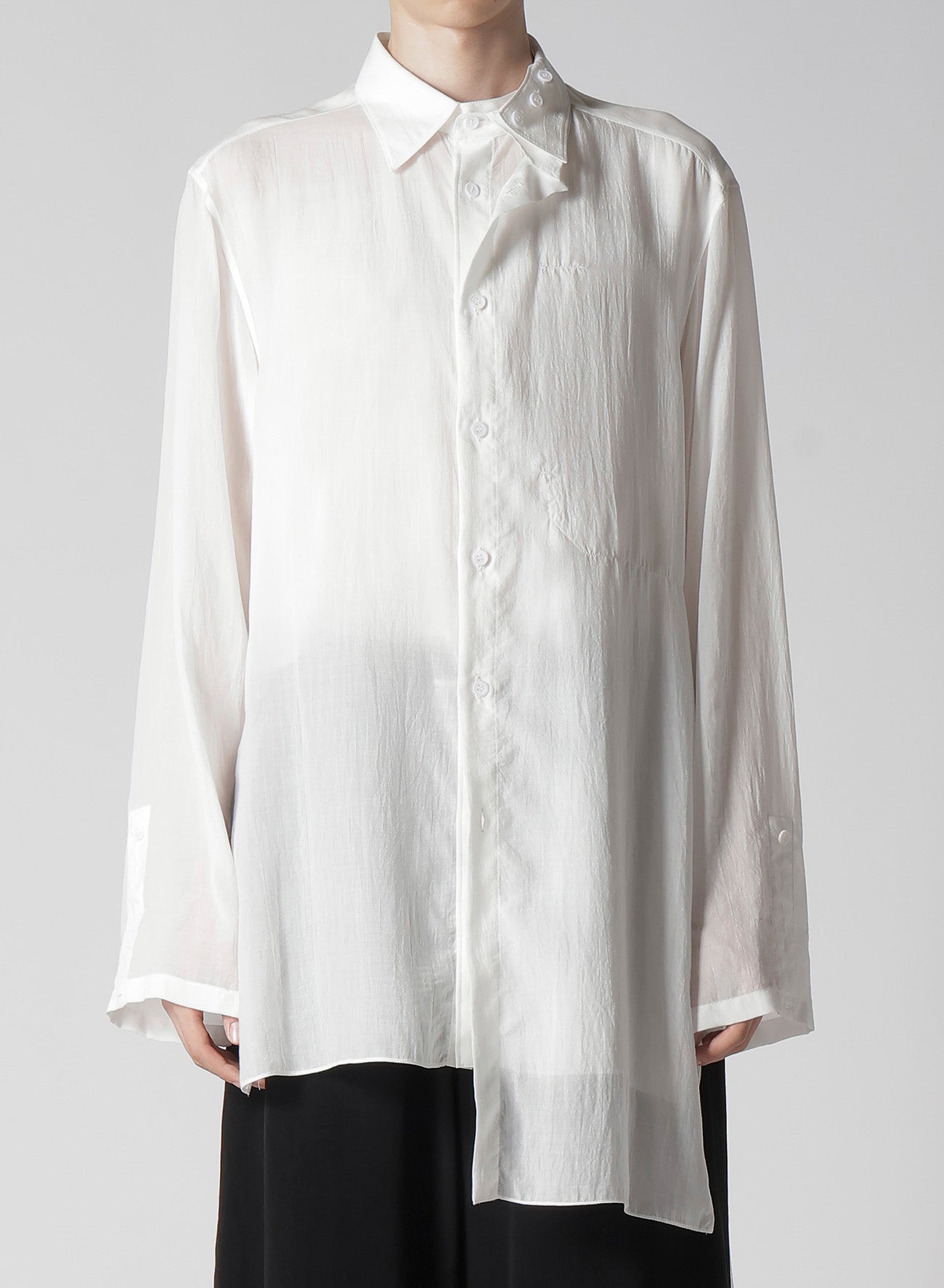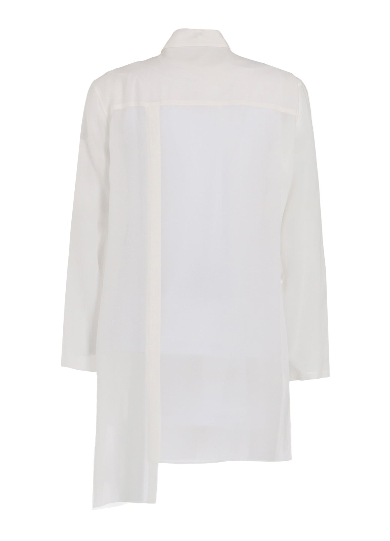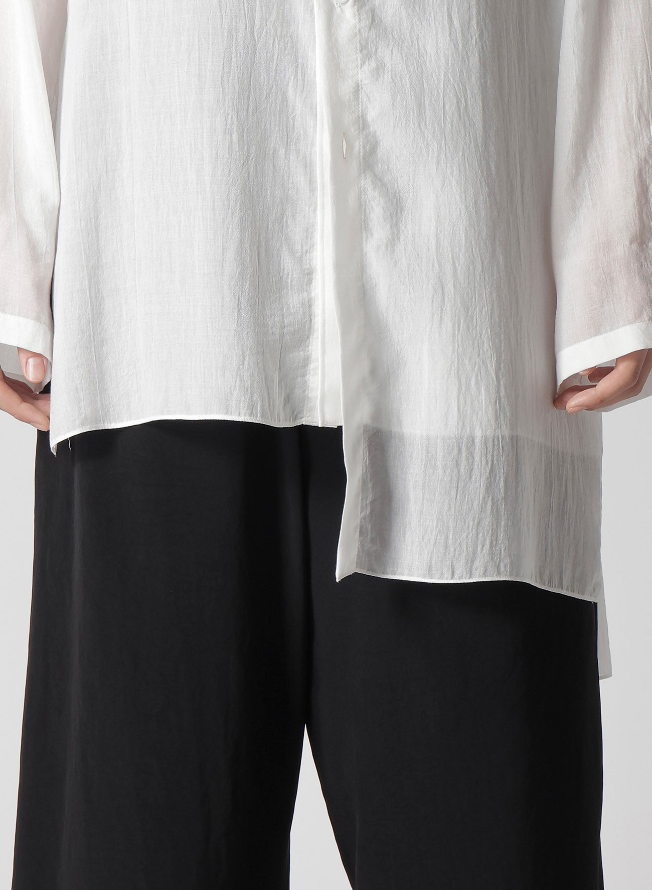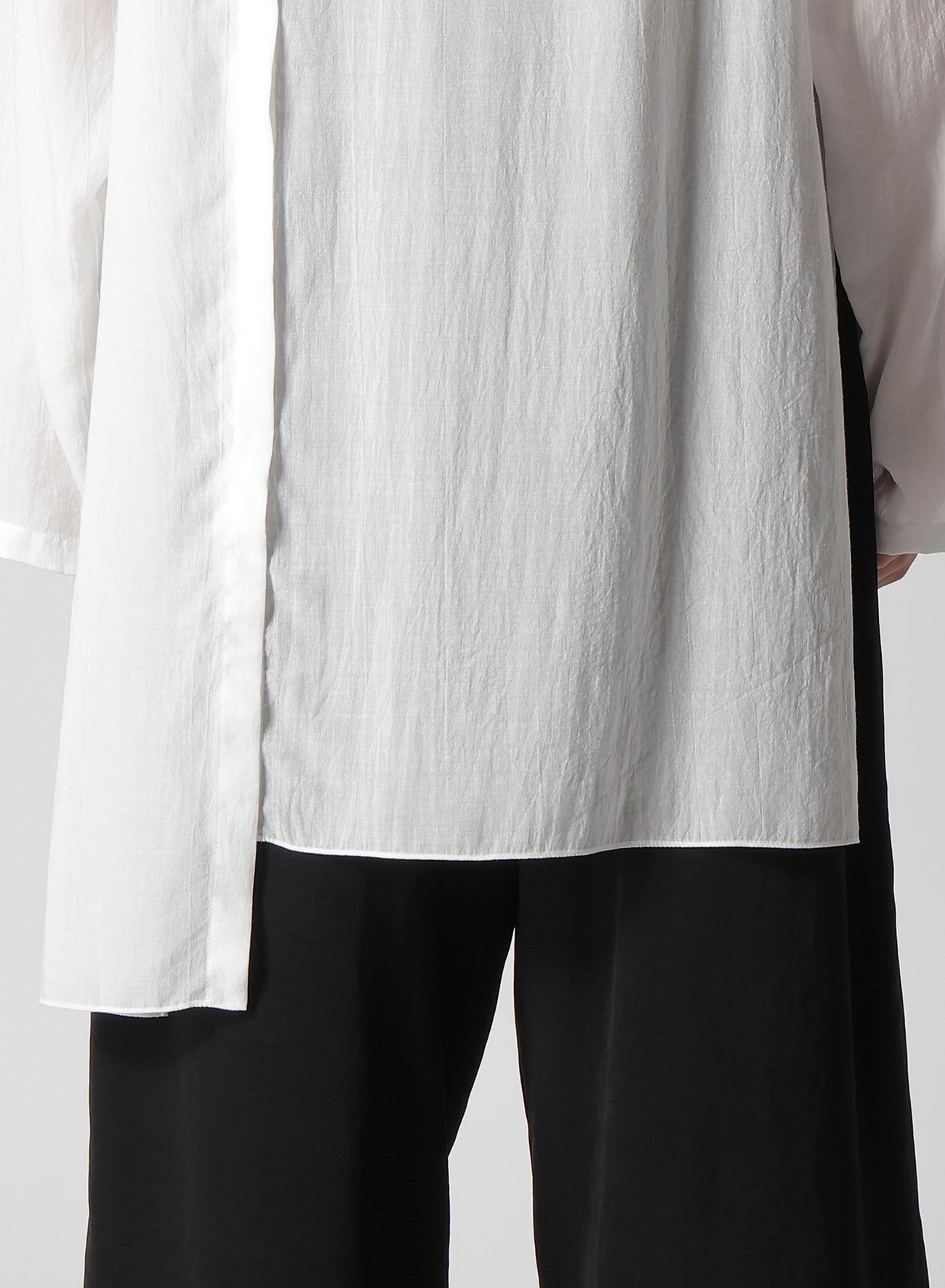 A blouse made with double-layered body using cellulosic lawn material. It features a lightweight and soft texture, with drapery and a natural sheer effect created by a unique washer processing method.
