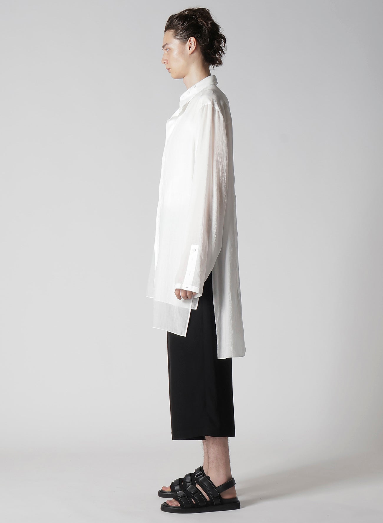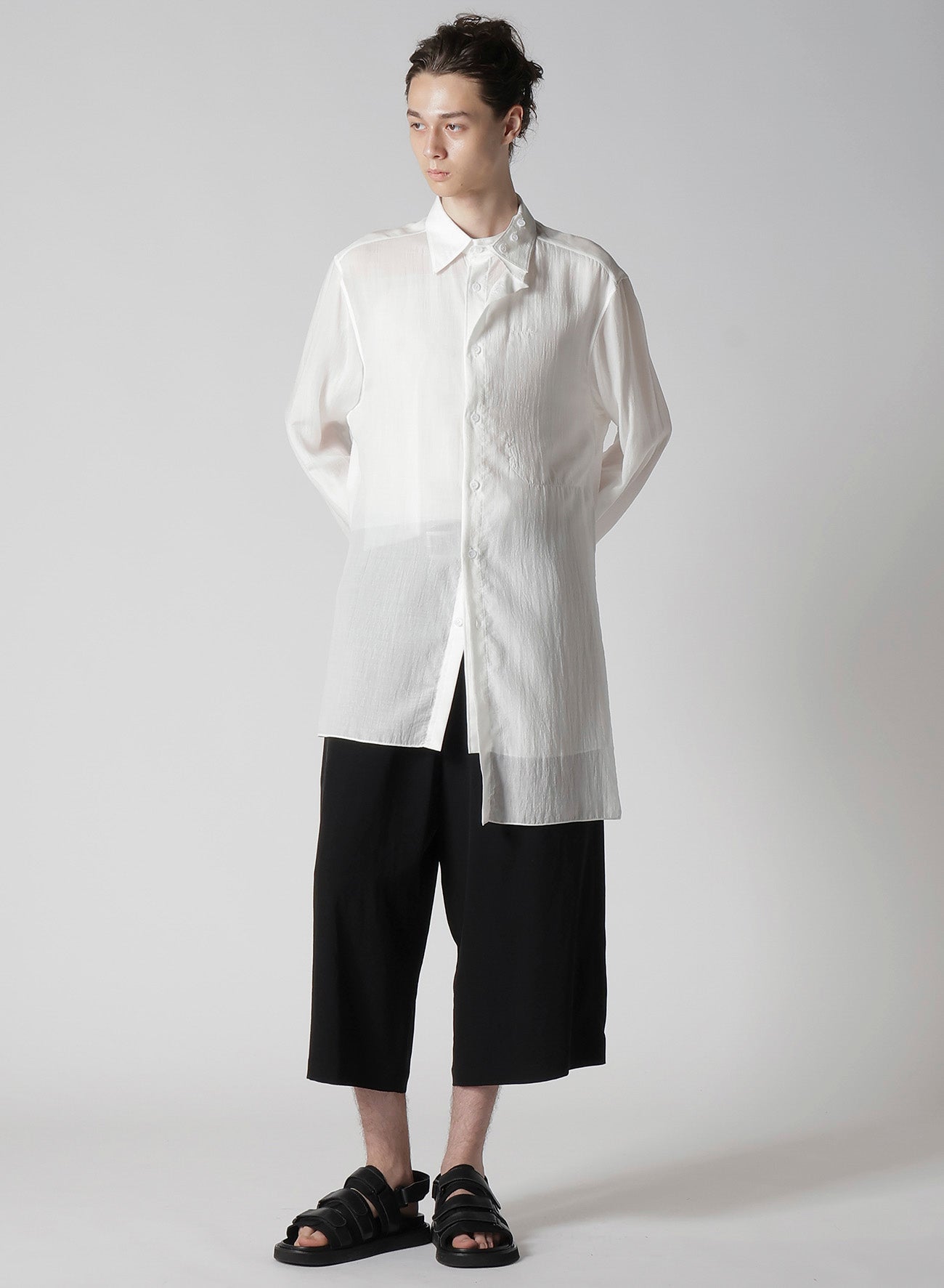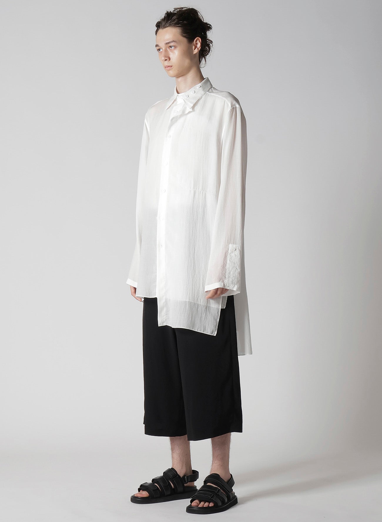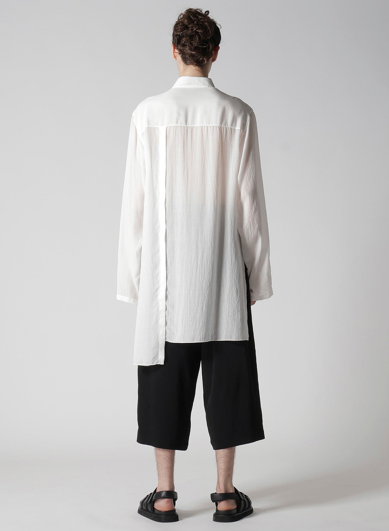 A blouse made with double-layered body using cellulosic lawn material. It features a lightweight and soft texture, with drapery and a natural sheer effect created by a unique washer processing method.