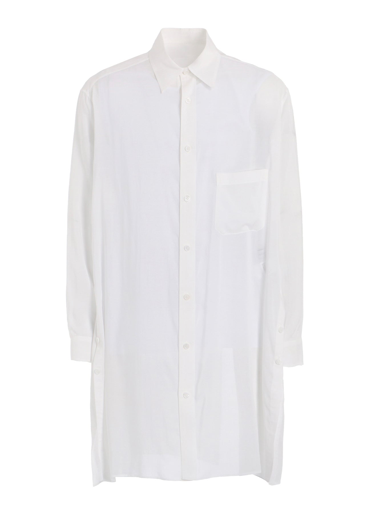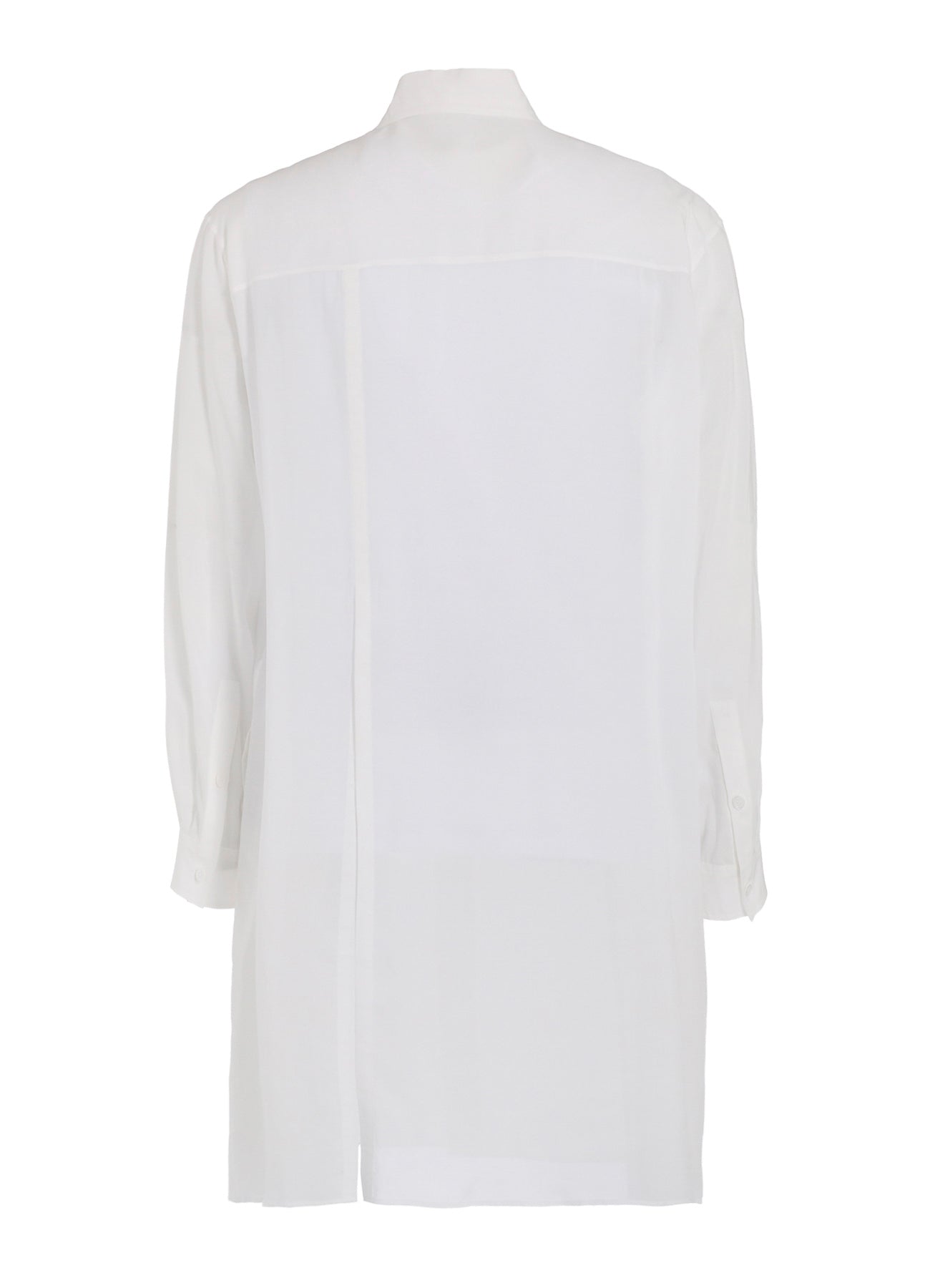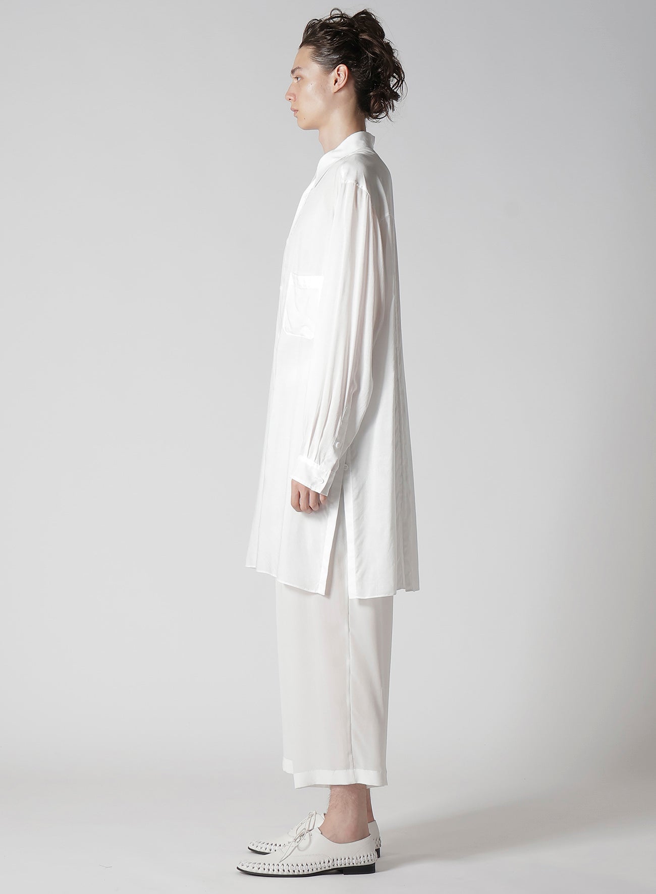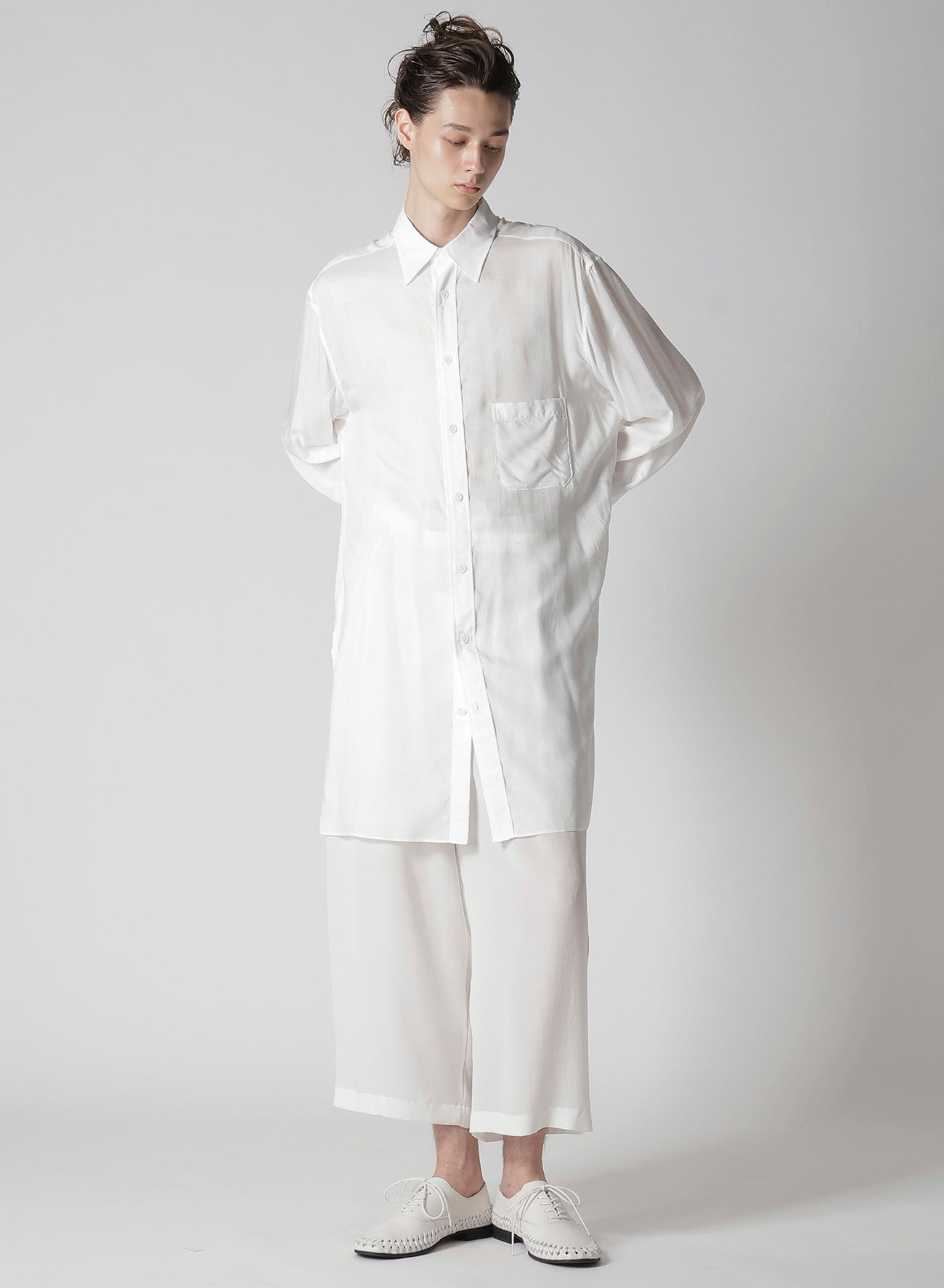 This Yohji Yamamoto POUR HOMME S/S 2025 Look 13 blouse features an elegant back combination. It's crafted from fine micro-modal lawn fabric, offering a lightweight, sheer, and soft texture made from rayon. Its high-quality fabric ensures maximum comfort against the skin for a sophisticated look.