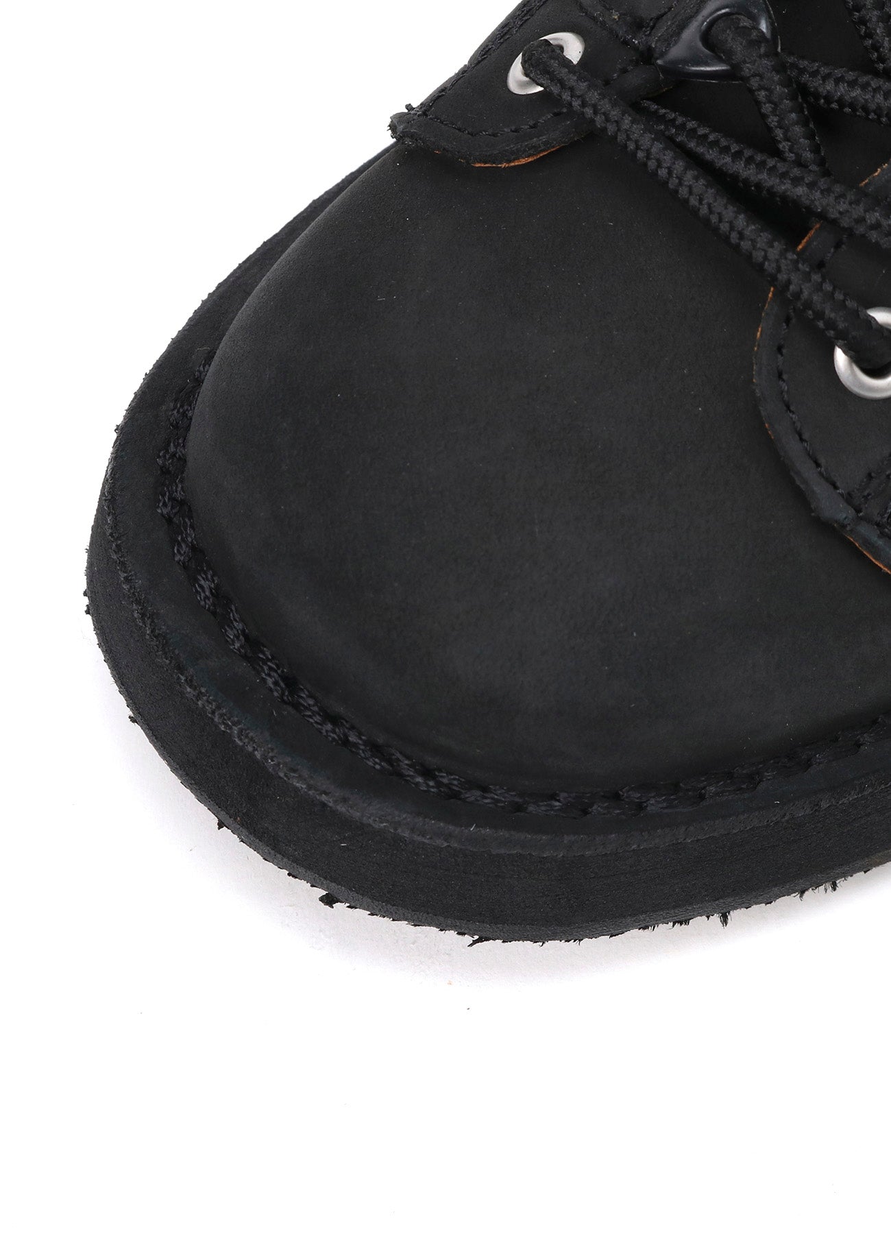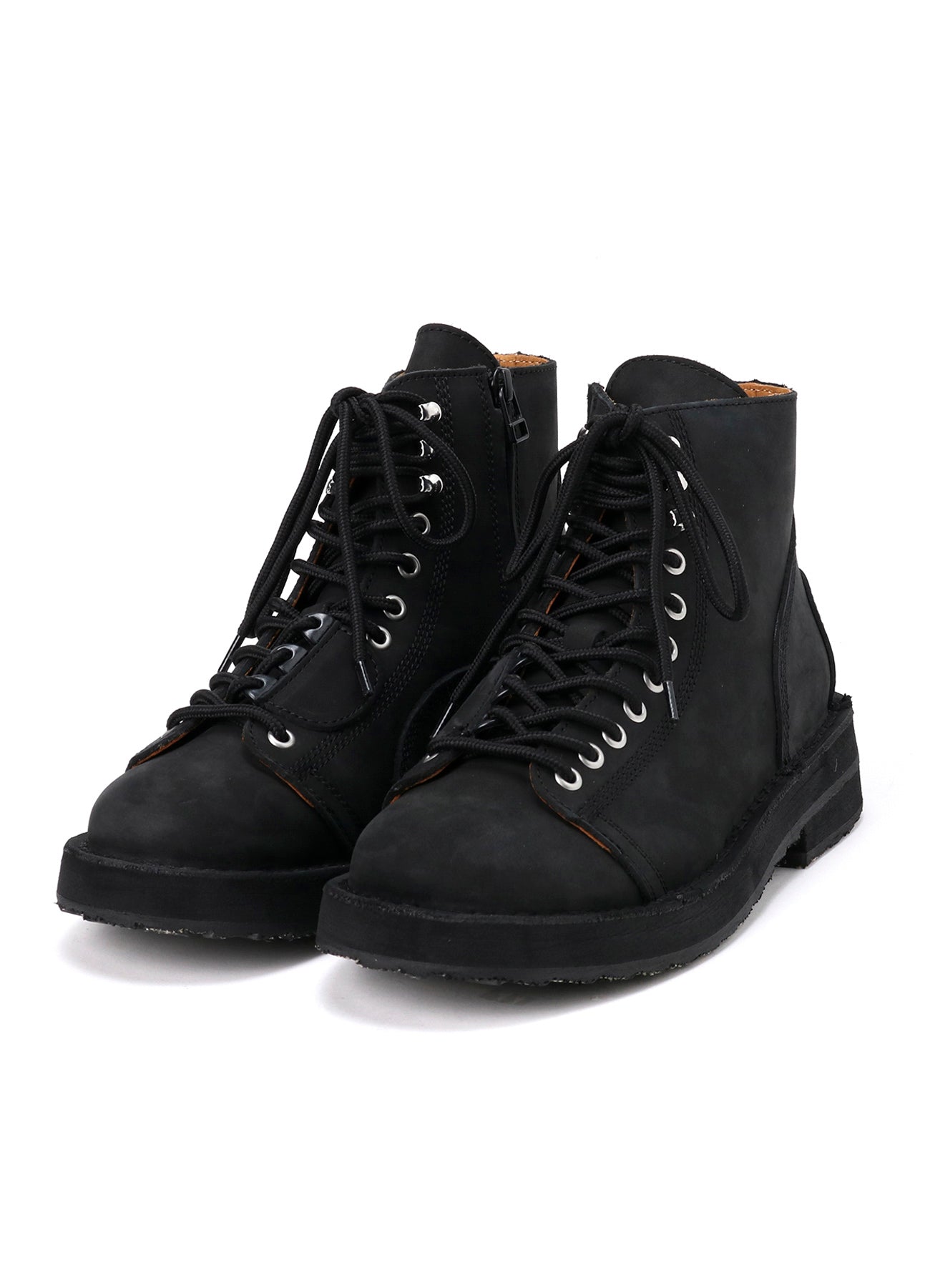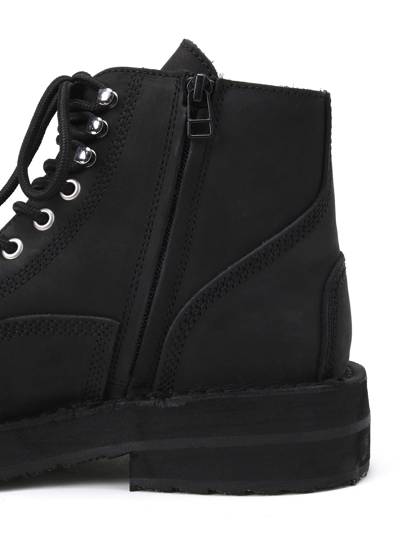 These REGULATION Yohji Yamamoto signature biker boots are made from matte leather, featuring silver eyelets for a vintage feel. The material may experience color fading due to friction or water exposure.