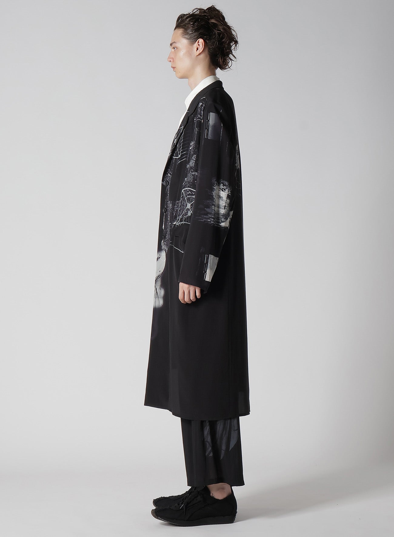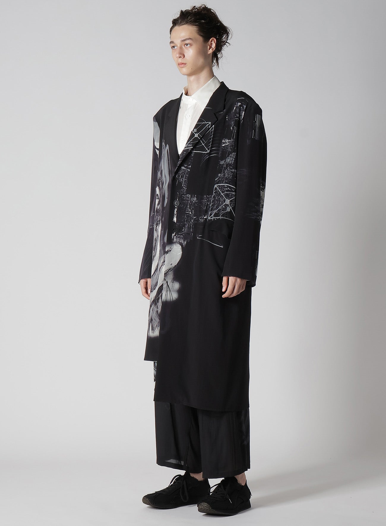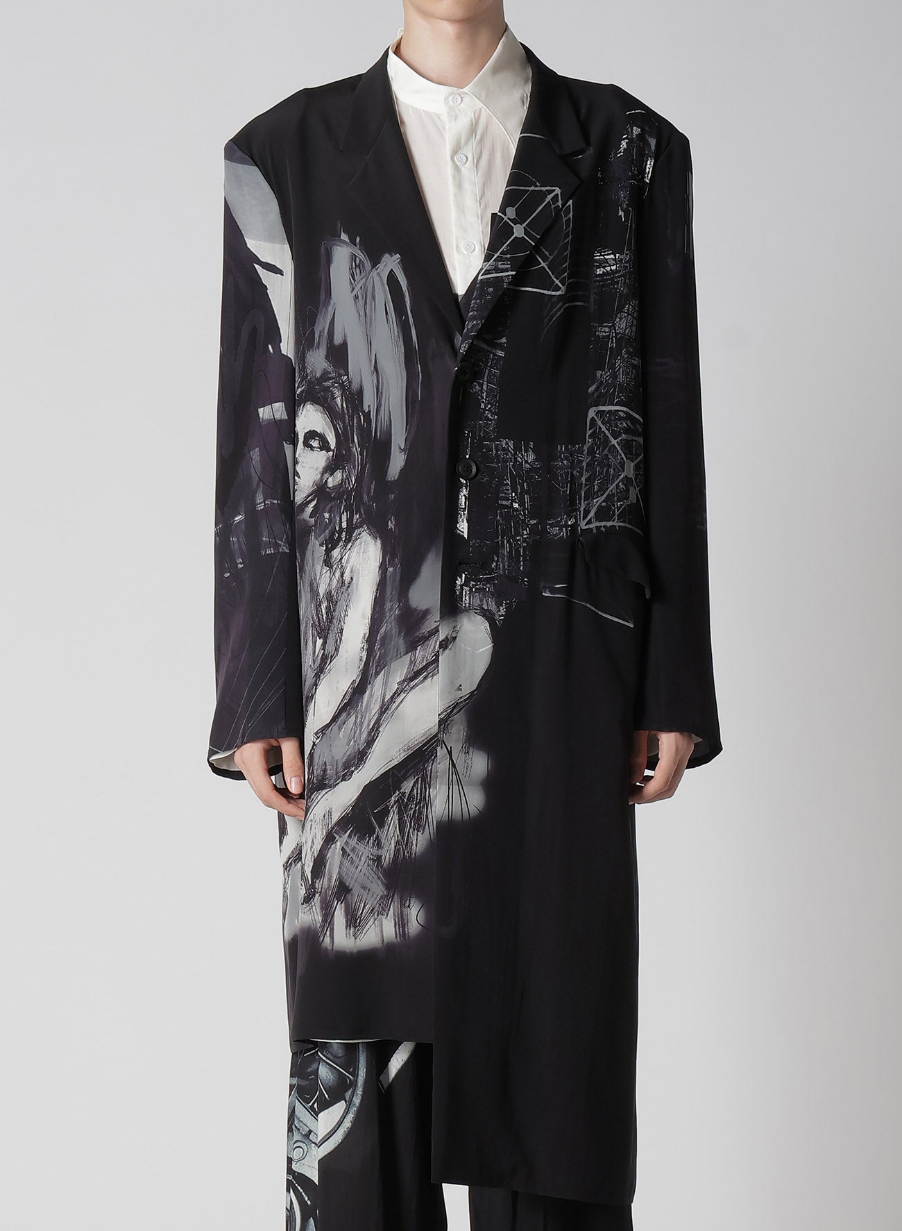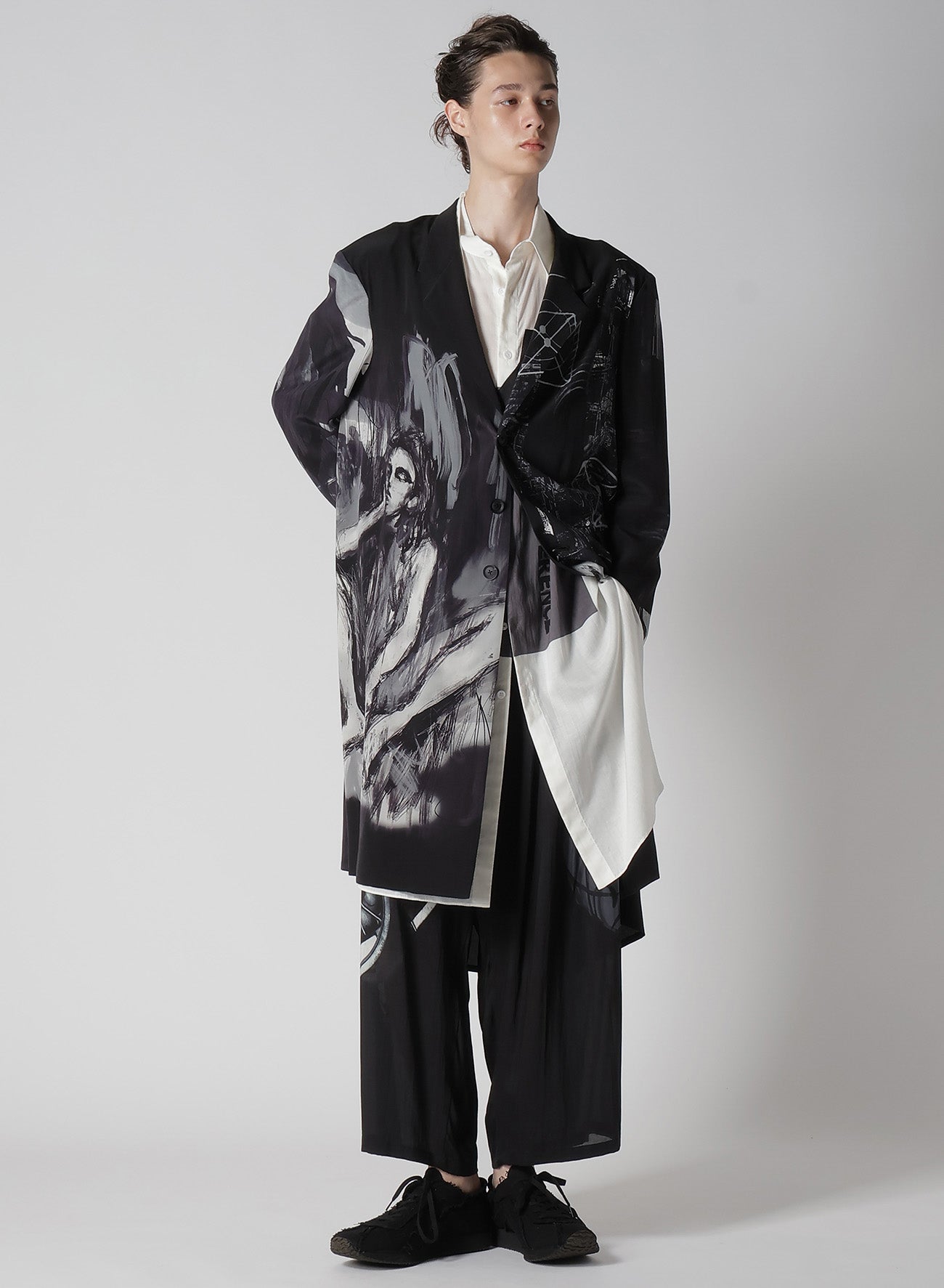 The Yohji Yamamoto POUR HOMME S/S 2025 collection features an asymmetric jacket made from 16-monme crepe de Chine fabric. This material is known for its delicate texture, beautiful sheen, and silk's unique drapery. An original design is inkjet printed on this fabric at a Kyoto factory.