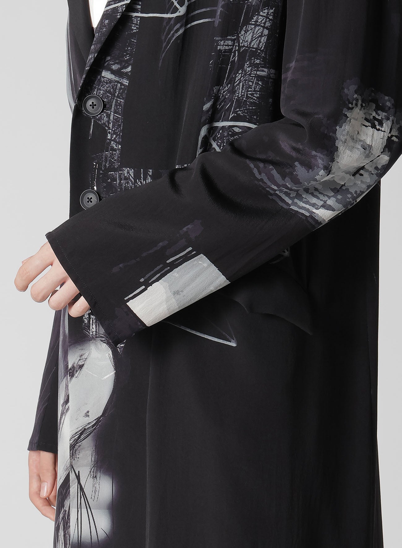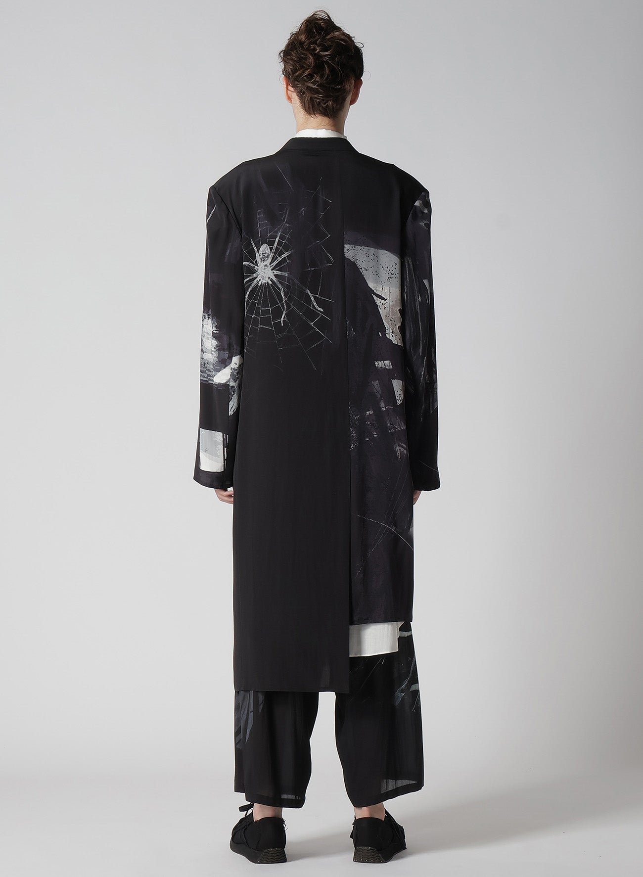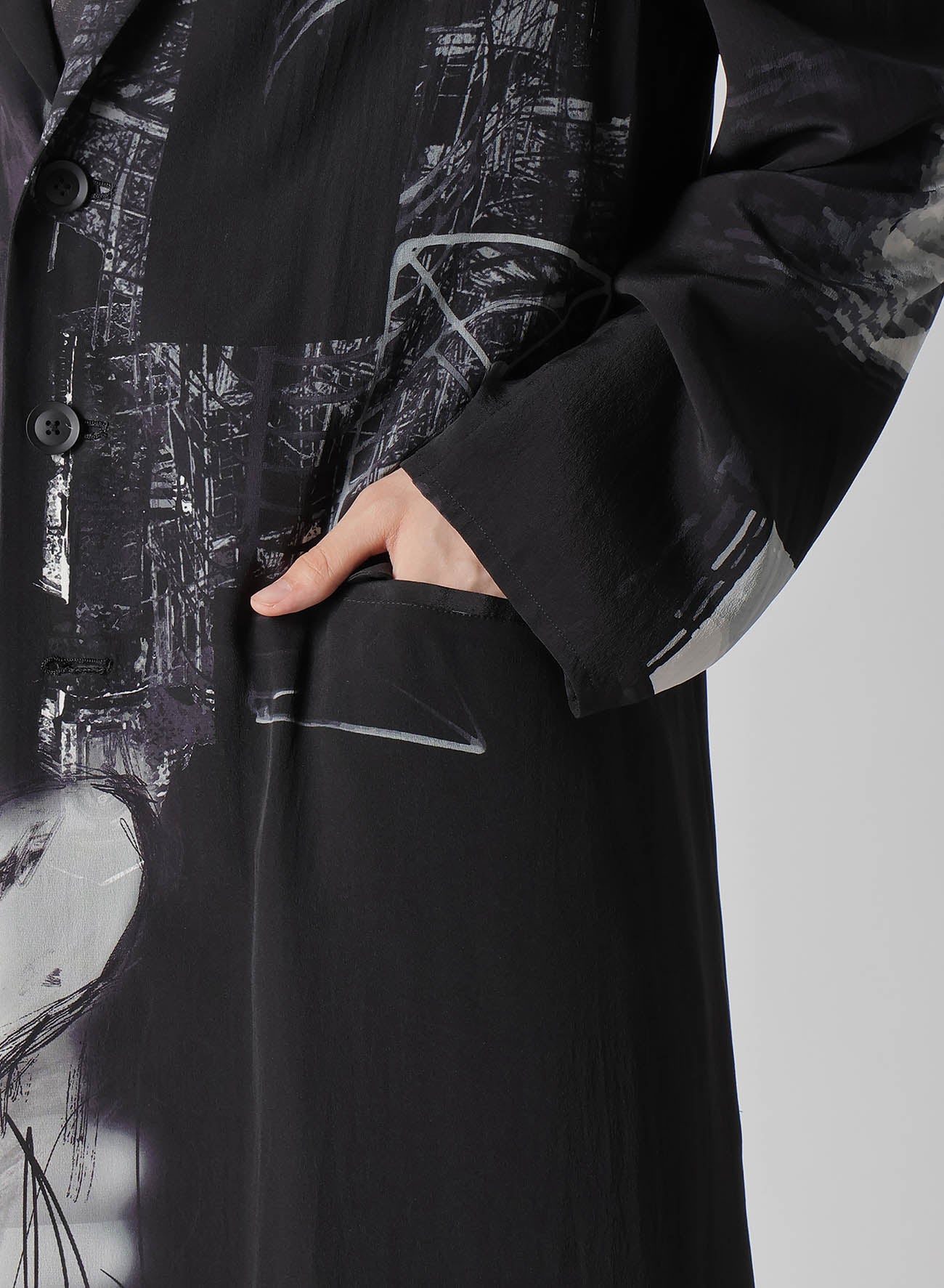 The Yohji Yamamoto POUR HOMME S/S 2025 collection features an asymmetric jacket made from 16-monme crepe de Chine fabric. This material is known for its delicate texture, beautiful sheen, and silk's unique drapery. An original design is inkjet printed on this fabric at a Kyoto factory.