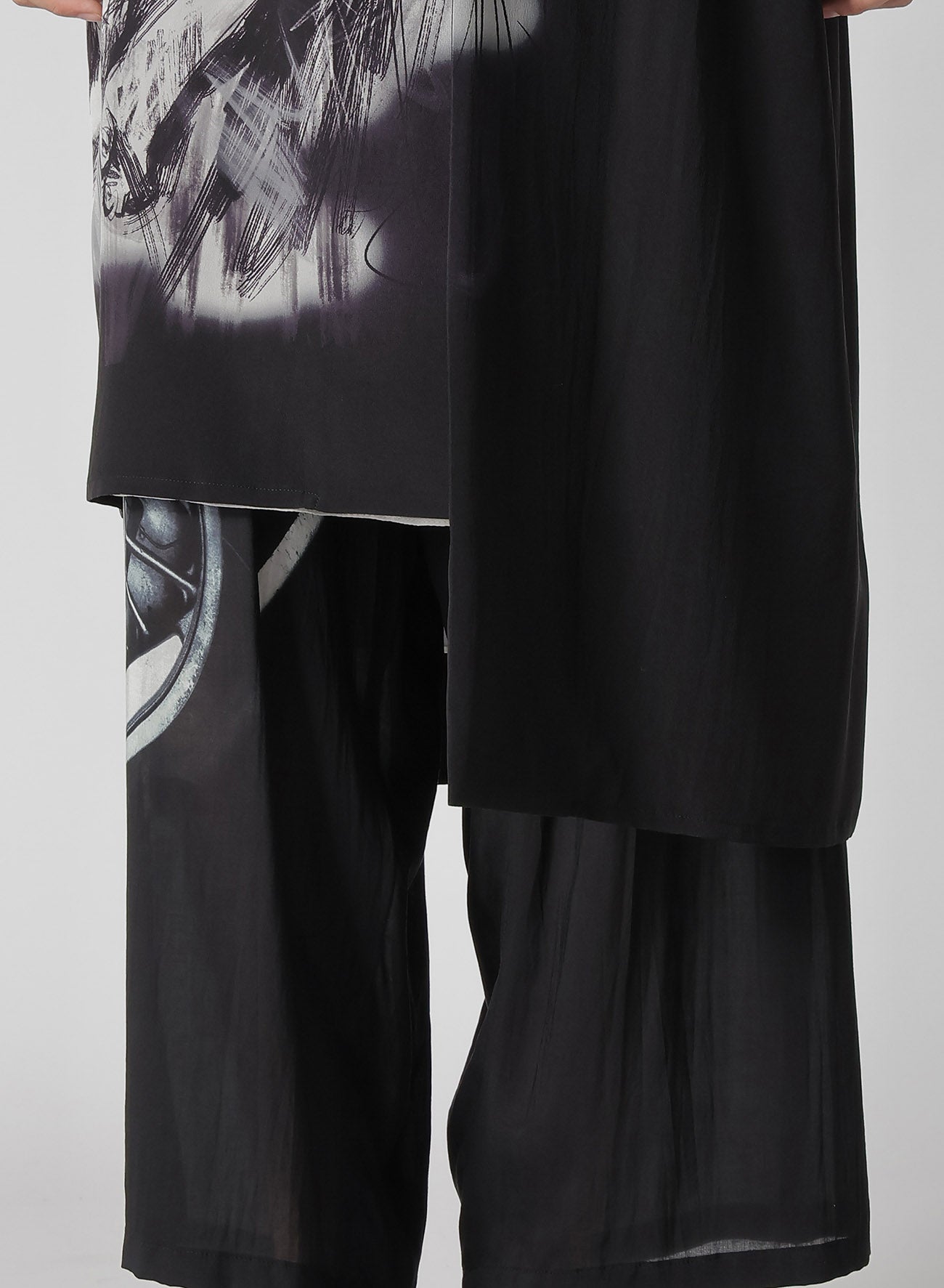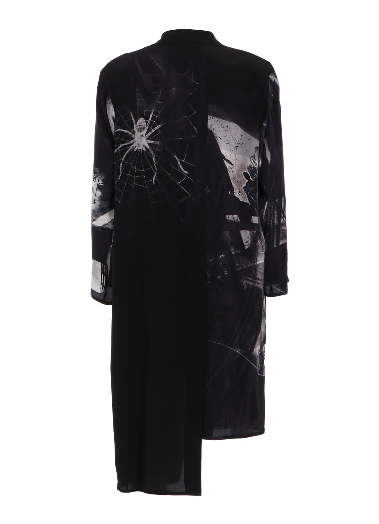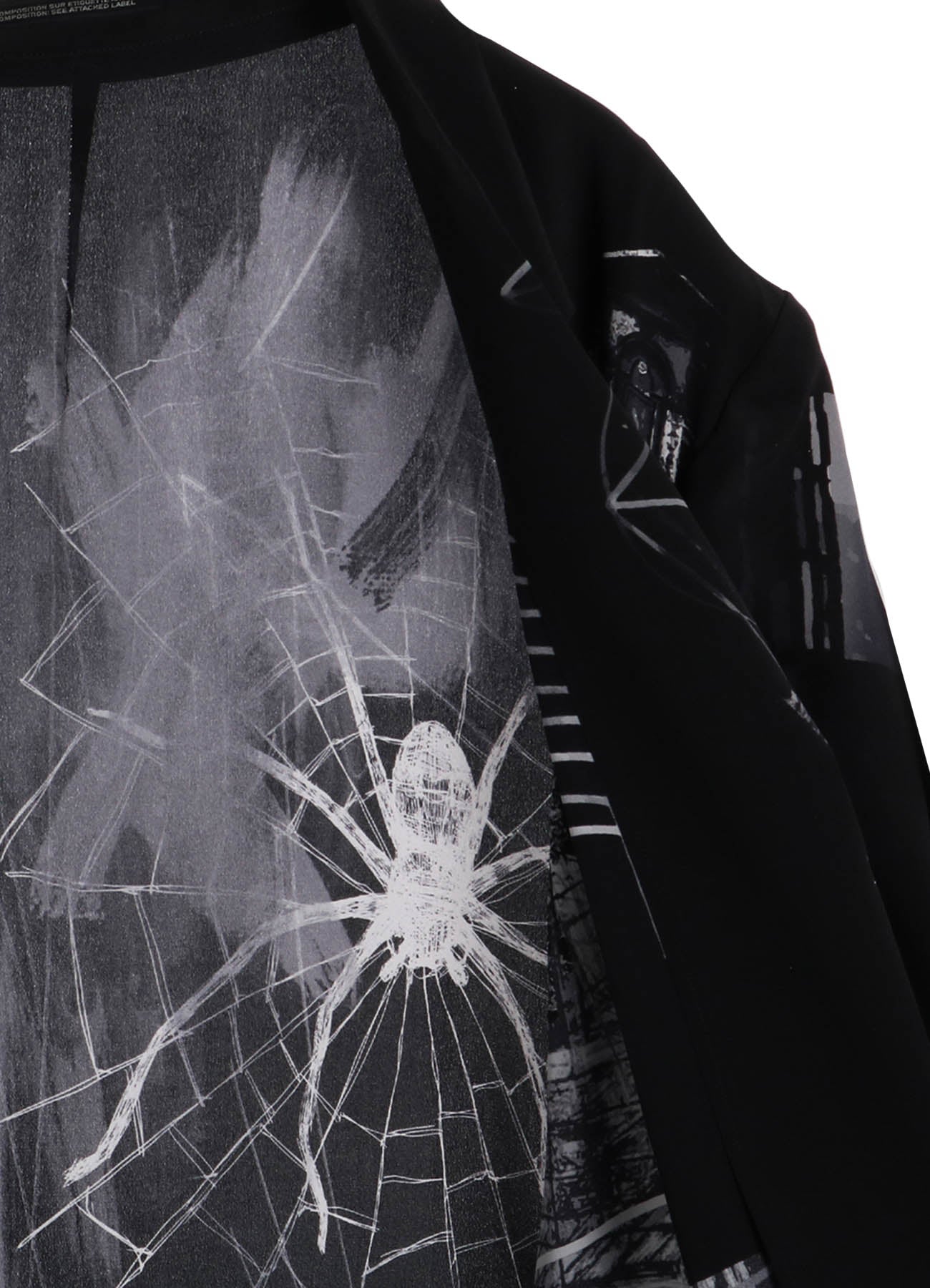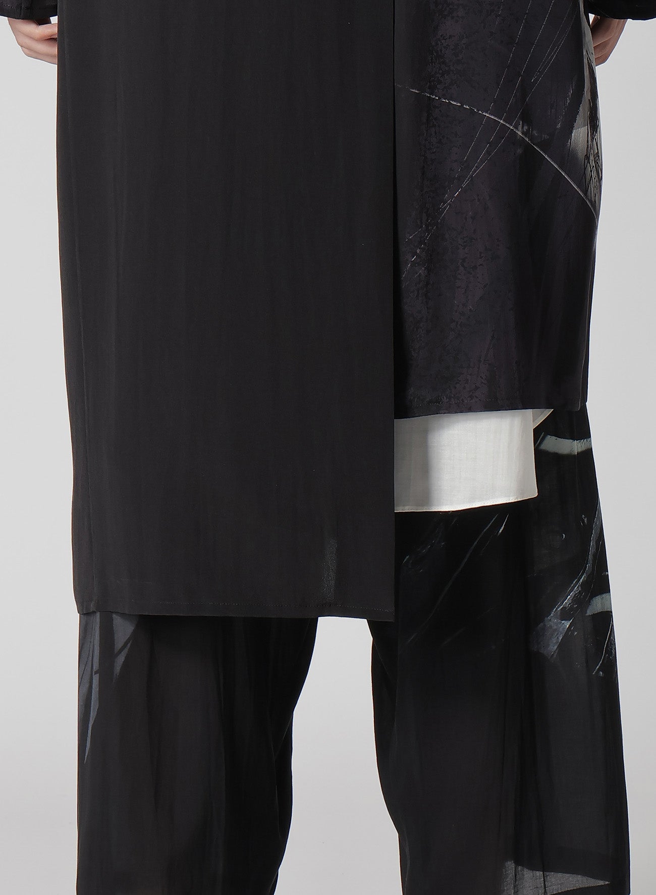 The Yohji Yamamoto POUR HOMME S/S 2025 collection features an asymmetric jacket made from 16-monme crepe de Chine fabric. This material is known for its delicate texture, beautiful sheen, and silk's unique drapery. An original design is inkjet printed on this fabric at a Kyoto factory.