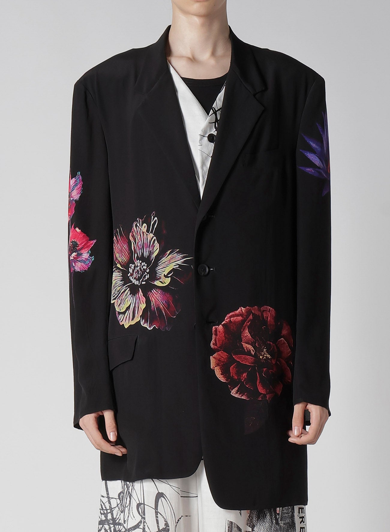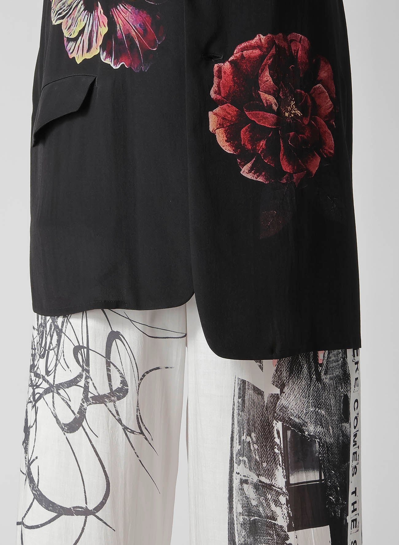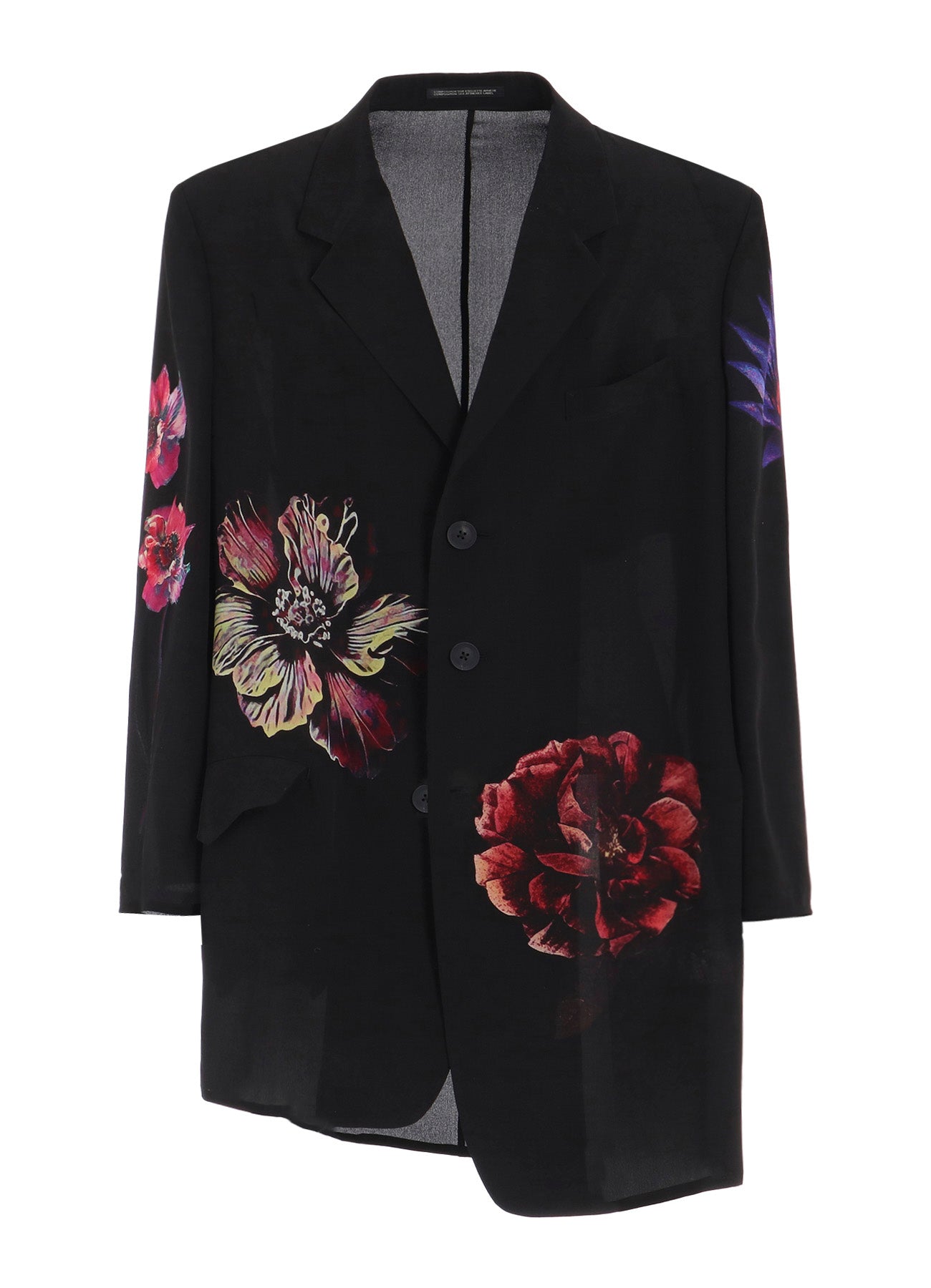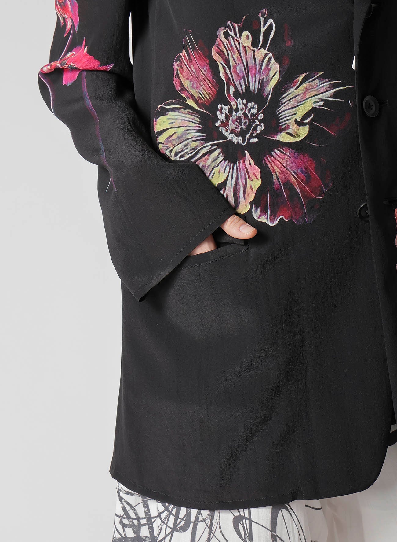 This flower-print jacket from the Yohji Yamamoto POUR HOMME S/S 2025 collection features an asymmetric front body and single-sleeve design. Made from 12 momme thin Decyne, it boasts a delicate crepe feel, beautiful luster, and silk's flowing drapery. Original patterns are inkjet printed at a Kyoto factory.