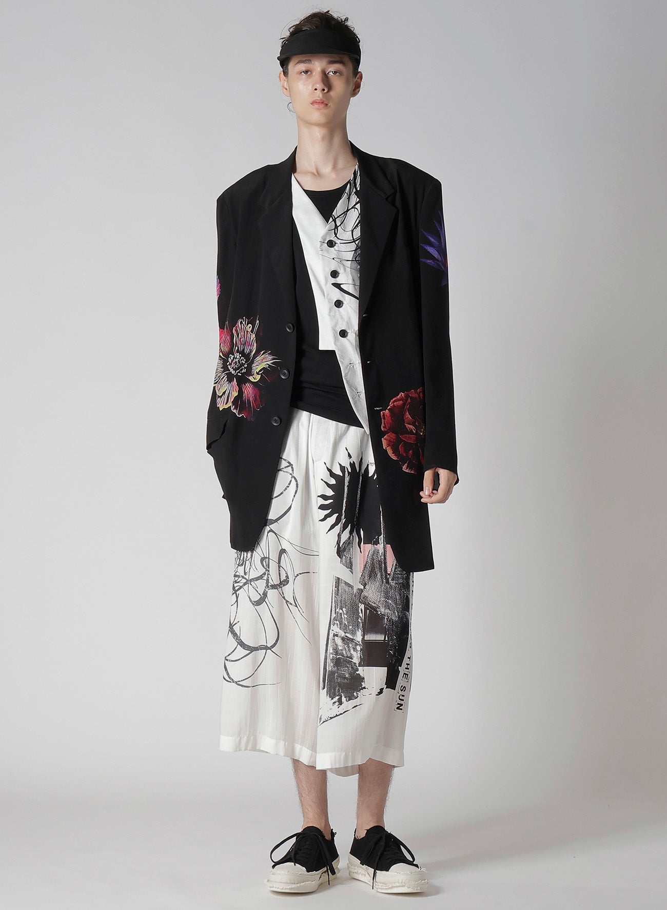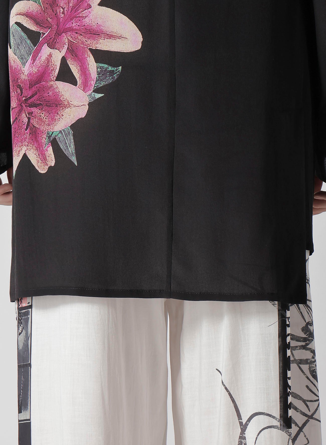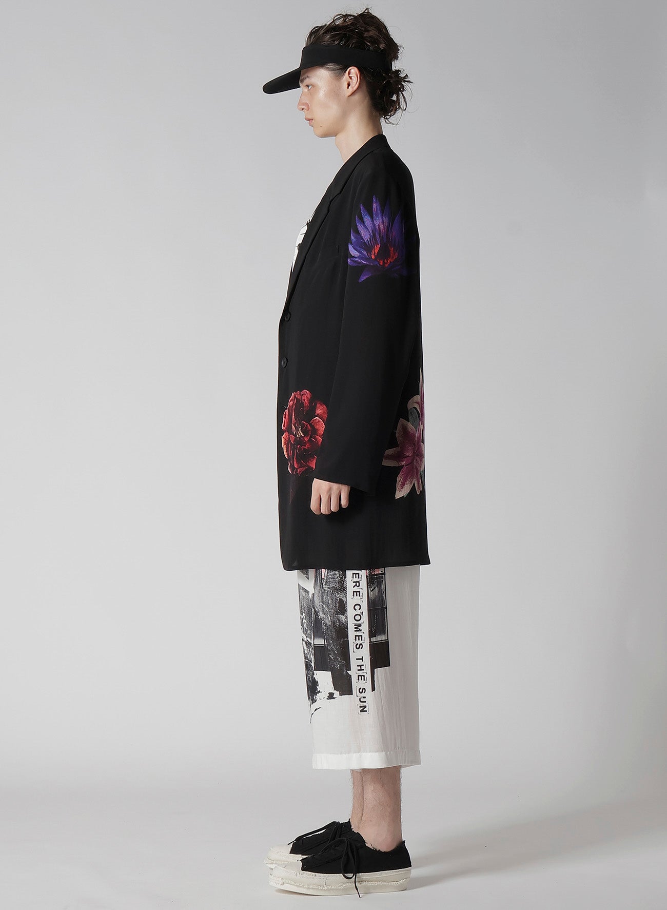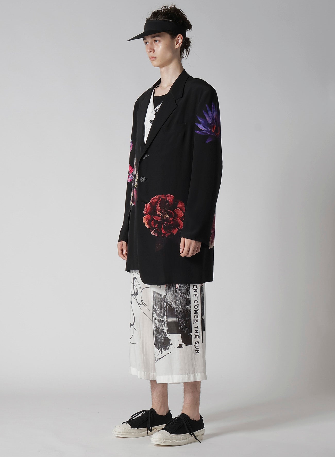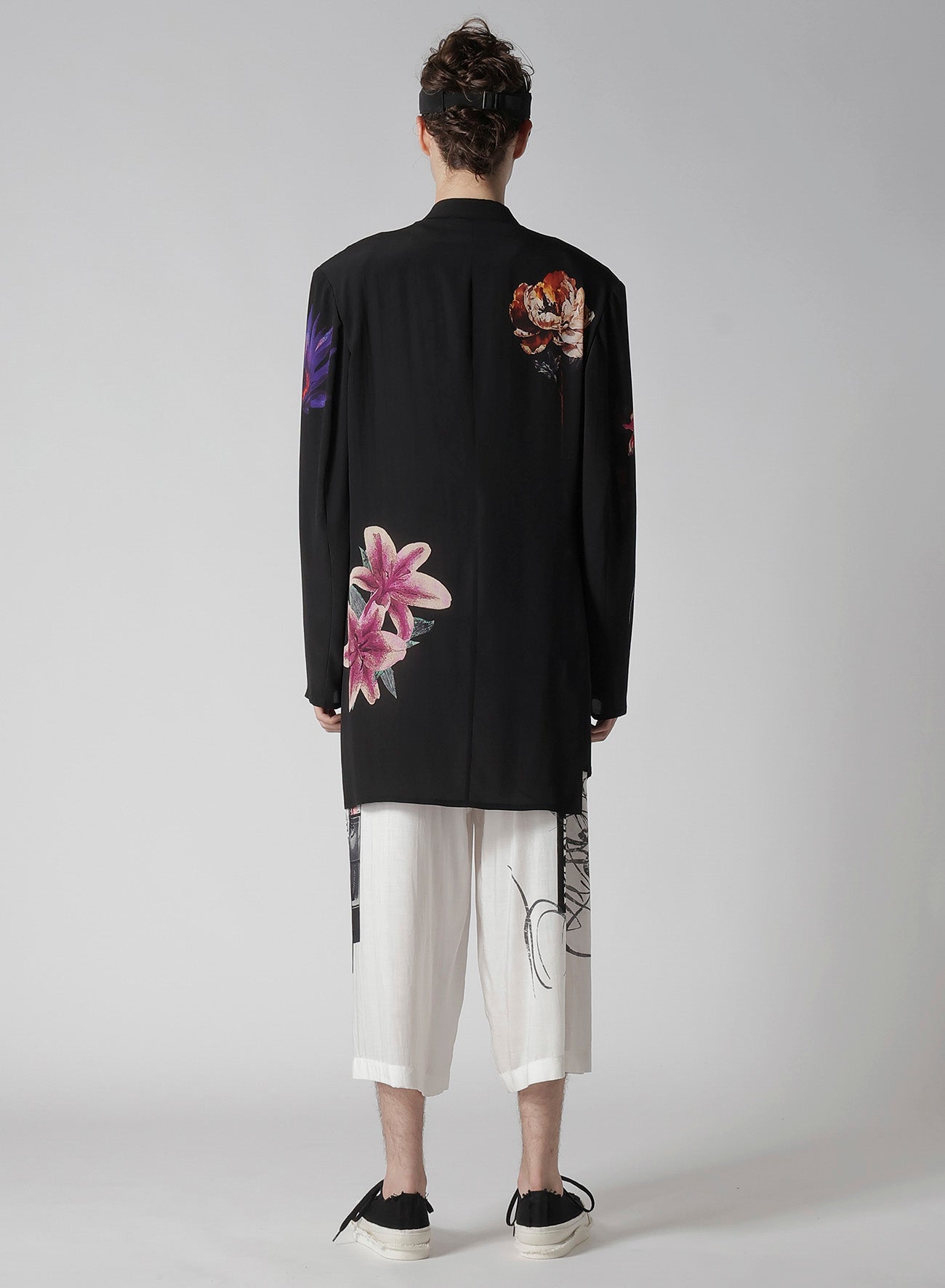 This flower-print jacket from the Yohji Yamamoto POUR HOMME S/S 2025 collection features an asymmetric front body and single-sleeve design. Made from 12 momme thin Decyne, it boasts a delicate crepe feel, beautiful luster, and silk's flowing drapery. Original patterns are inkjet printed at a Kyoto factory.