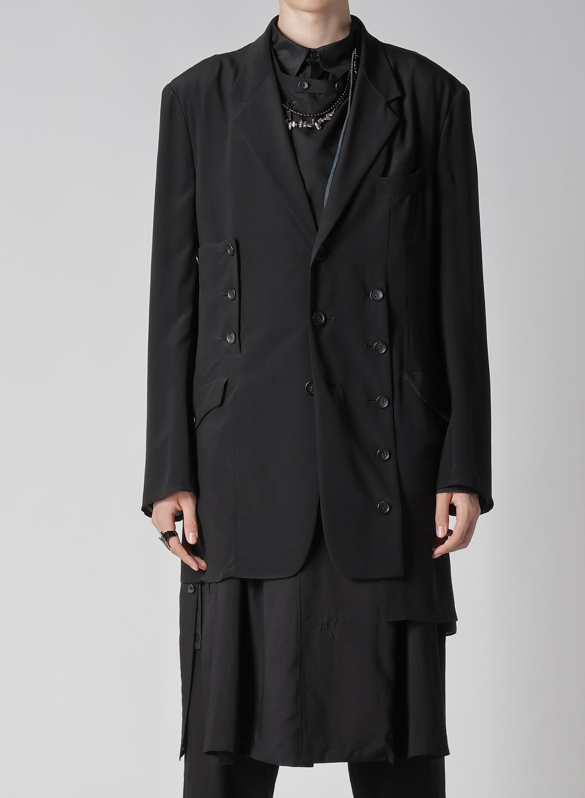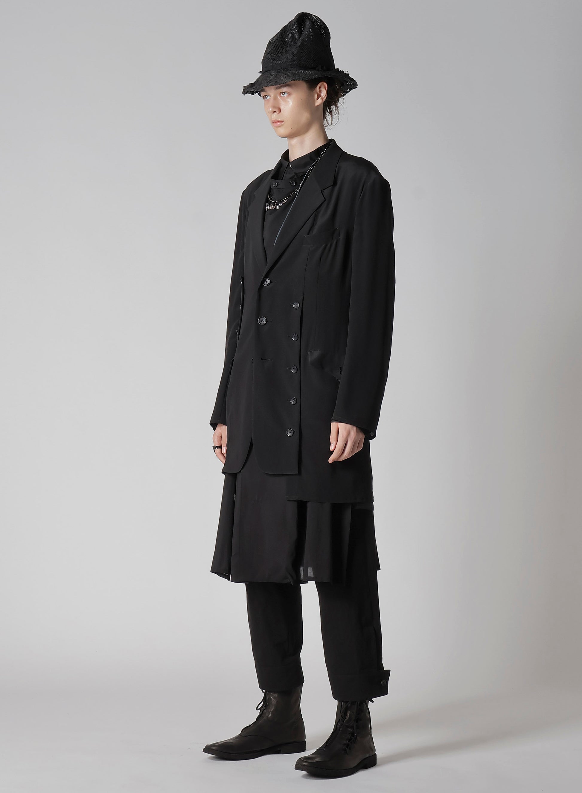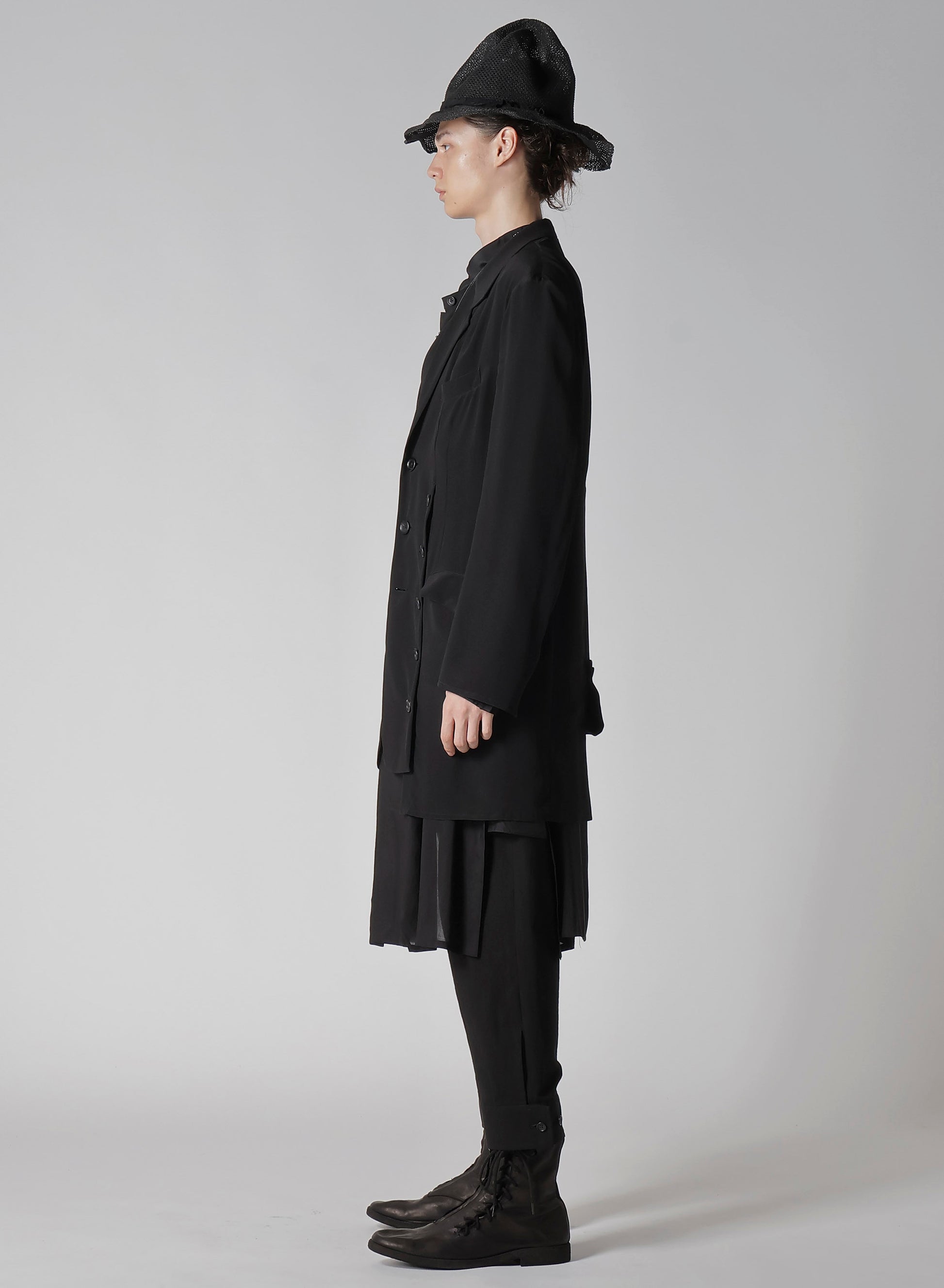 Yohji Yamamoto POUR HOMME S/S 2025 Collection Look 21 features a buttoned jacket crafted from 12-momme silk crepe de Chine. It showcases a refined texture and luxurious sheen, with the silky fabric offering a graceful drape. The fabric is solid-dyed using a special hanging dye method in Kyoto, creating a deep color.