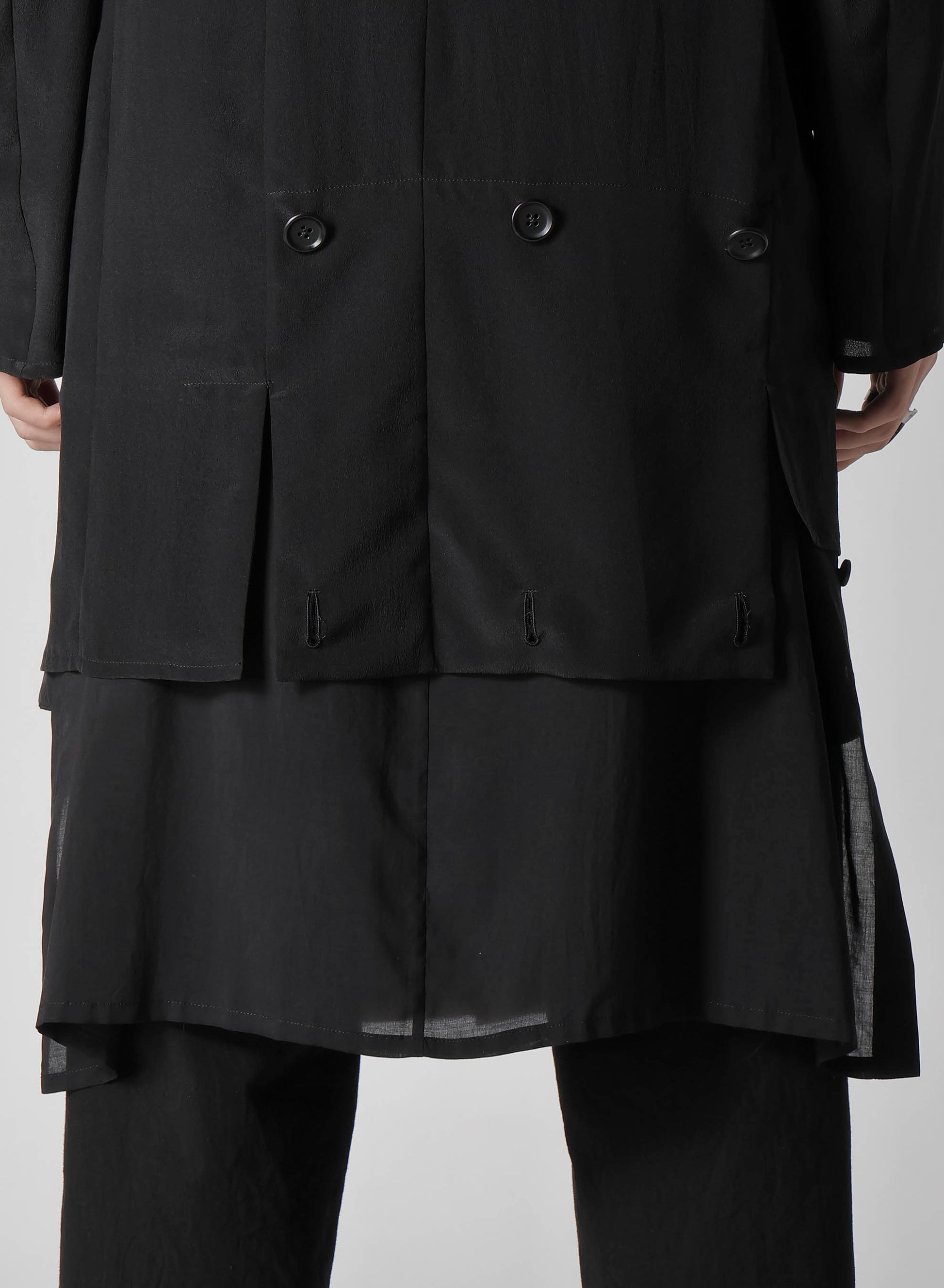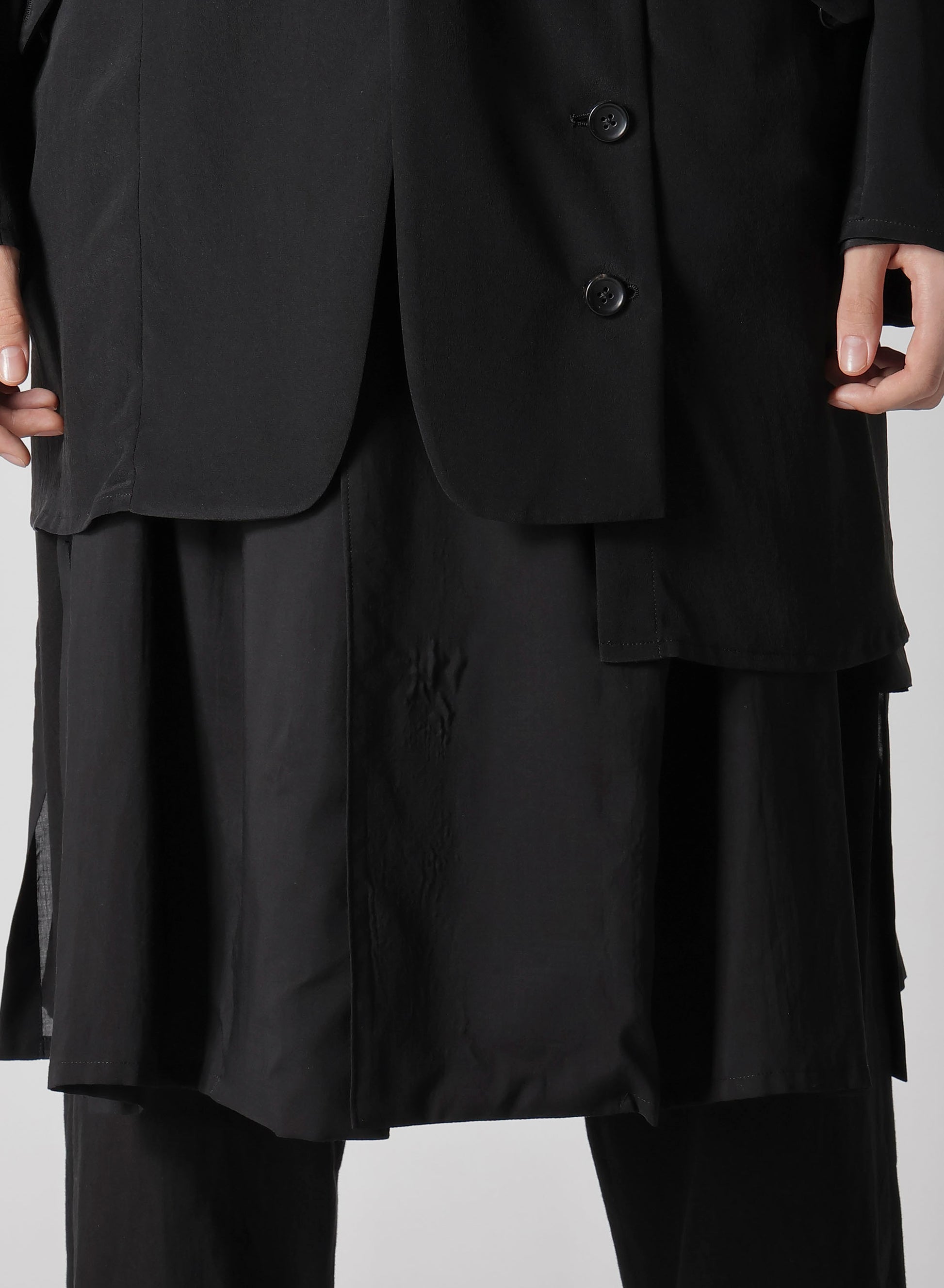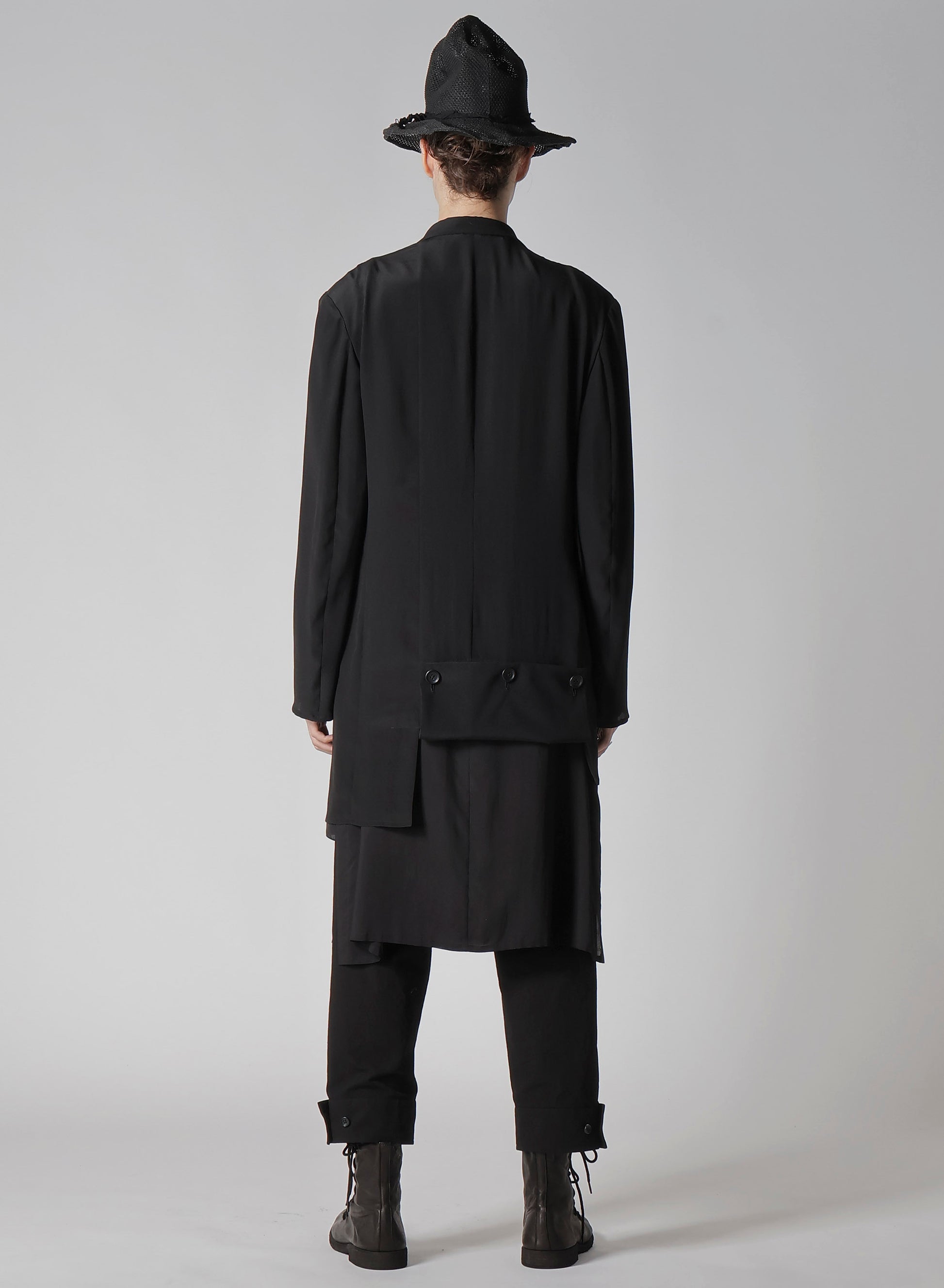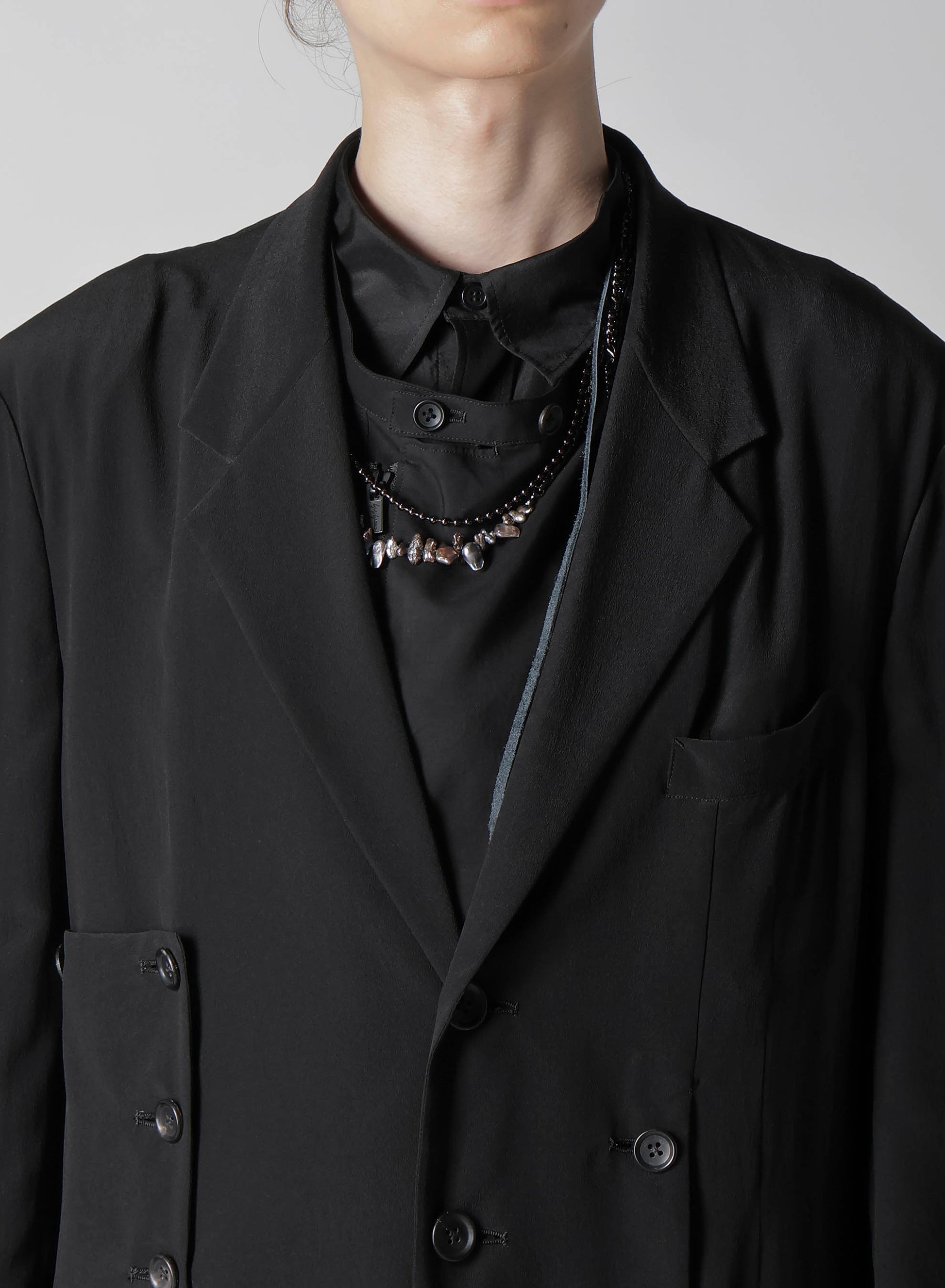 Yohji Yamamoto POUR HOMME S/S 2025 Collection Look 21 features a buttoned jacket crafted from 12-momme silk crepe de Chine. It showcases a refined texture and luxurious sheen, with the silky fabric offering a graceful drape. The fabric is solid-dyed using a special hanging dye method in Kyoto, creating a deep color.