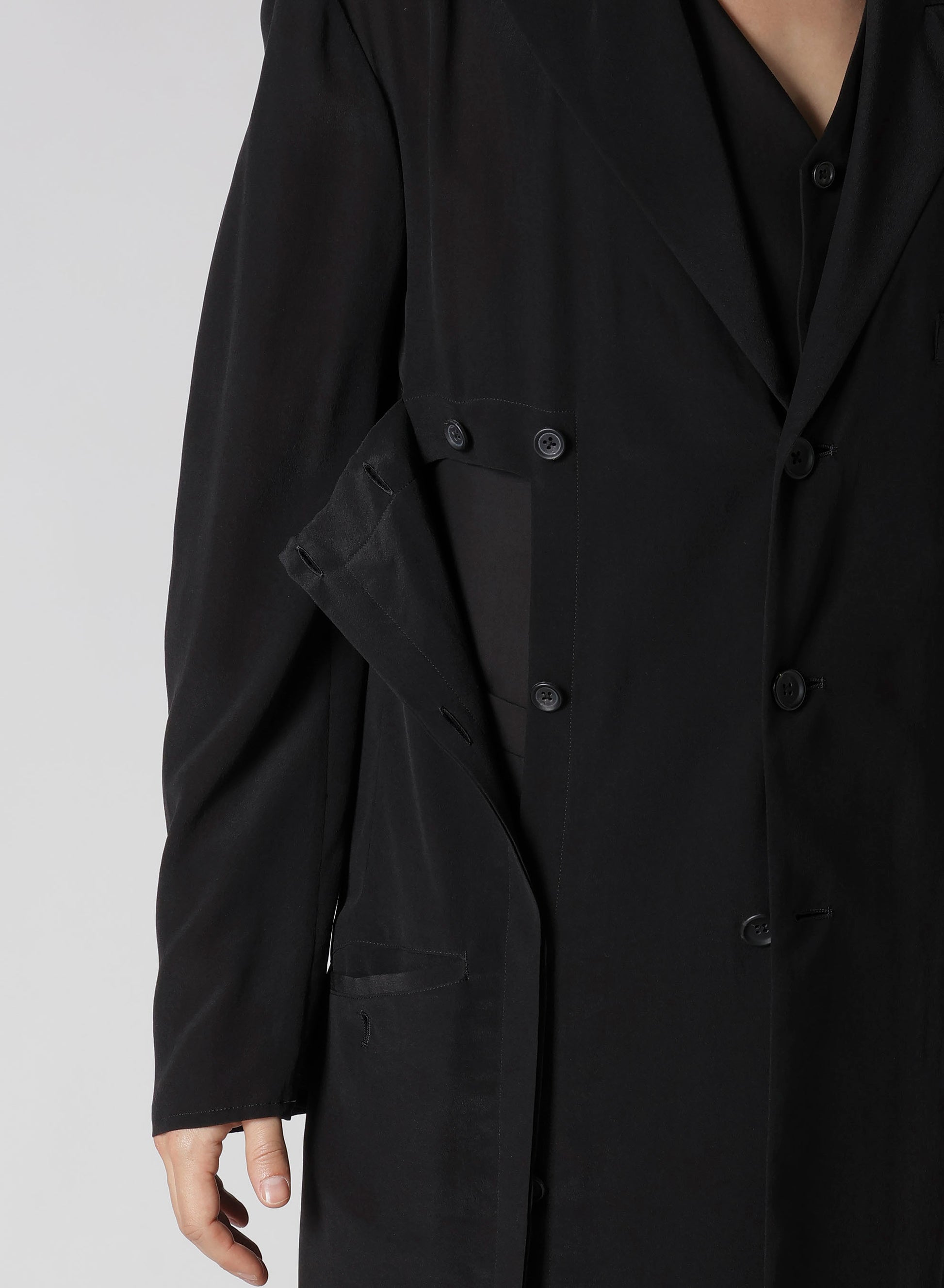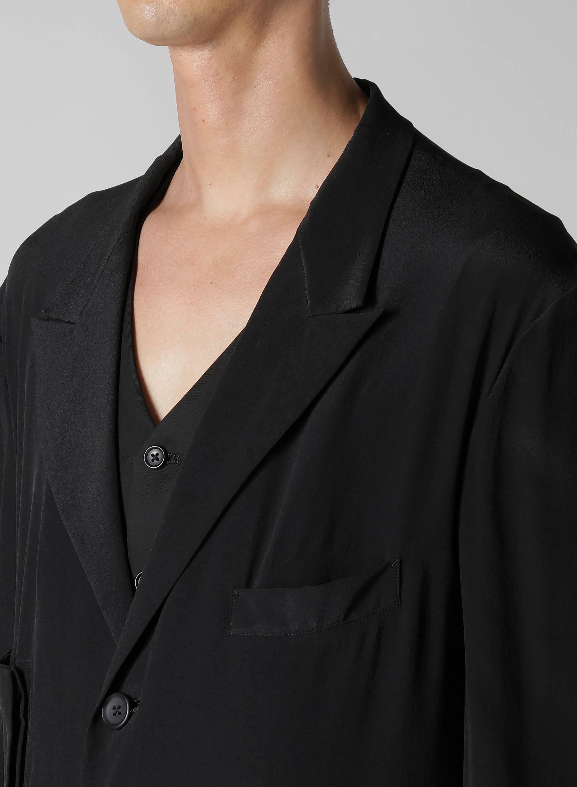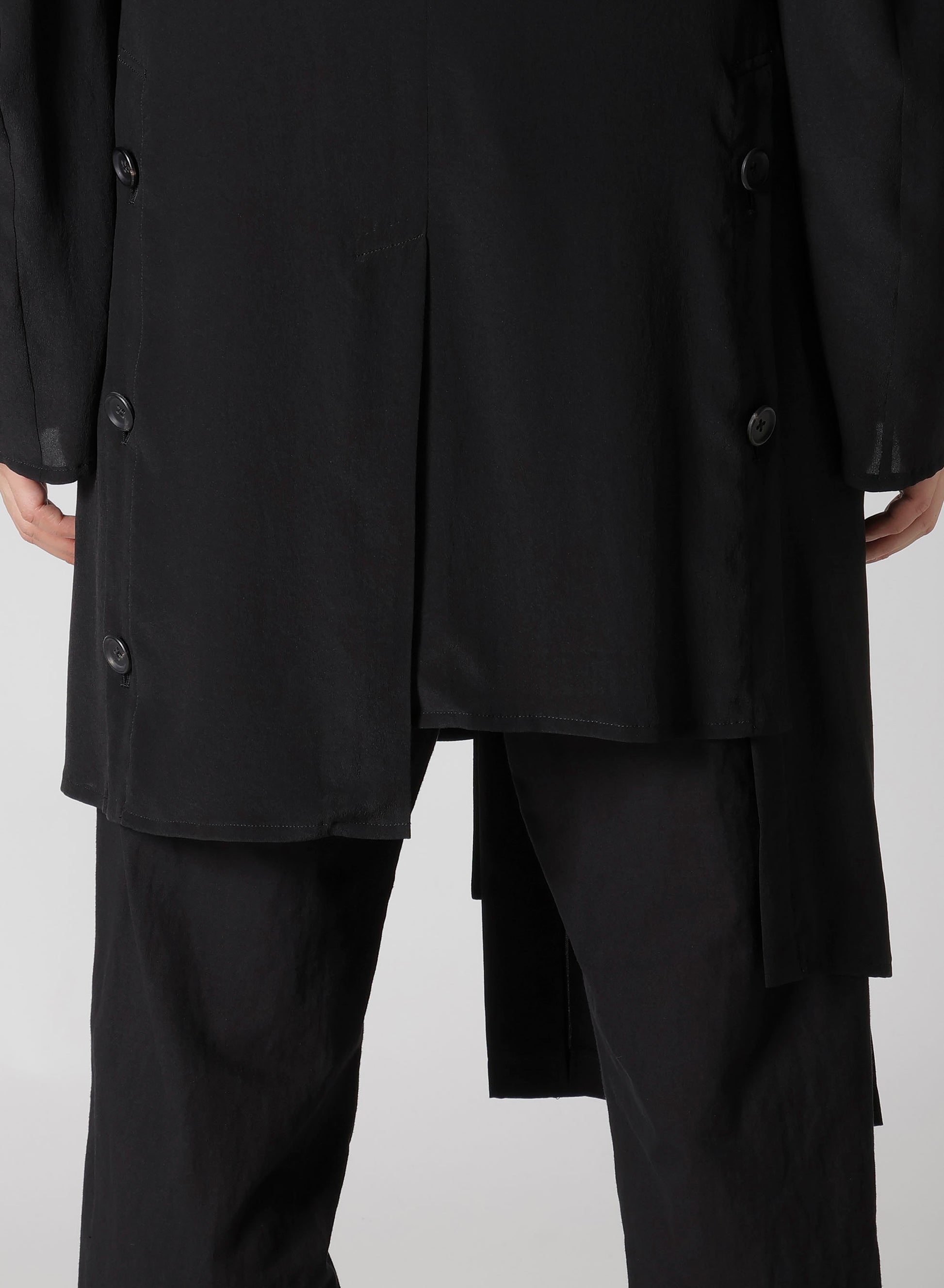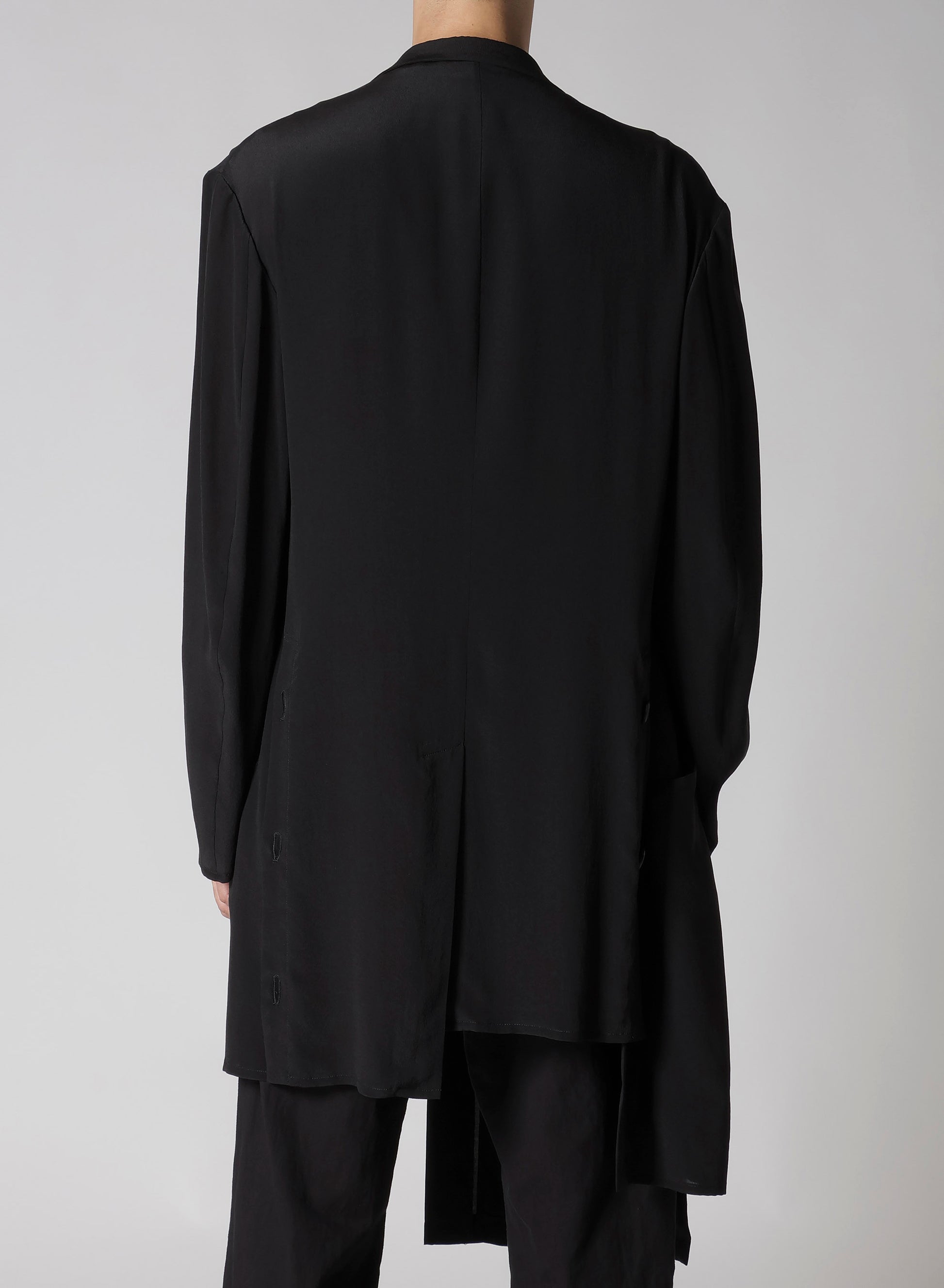 This piece from the Yohji Yamamoto POUR HOMME S/S 2025 collection, Look 24, showcases a jacket with a unique right-side button opening. Crafted from 12 momme silk crepe de Chine, it offers a refined texture and a graceful drapery. Kyoto artisans used a special dyeing method to achieve its rich color.