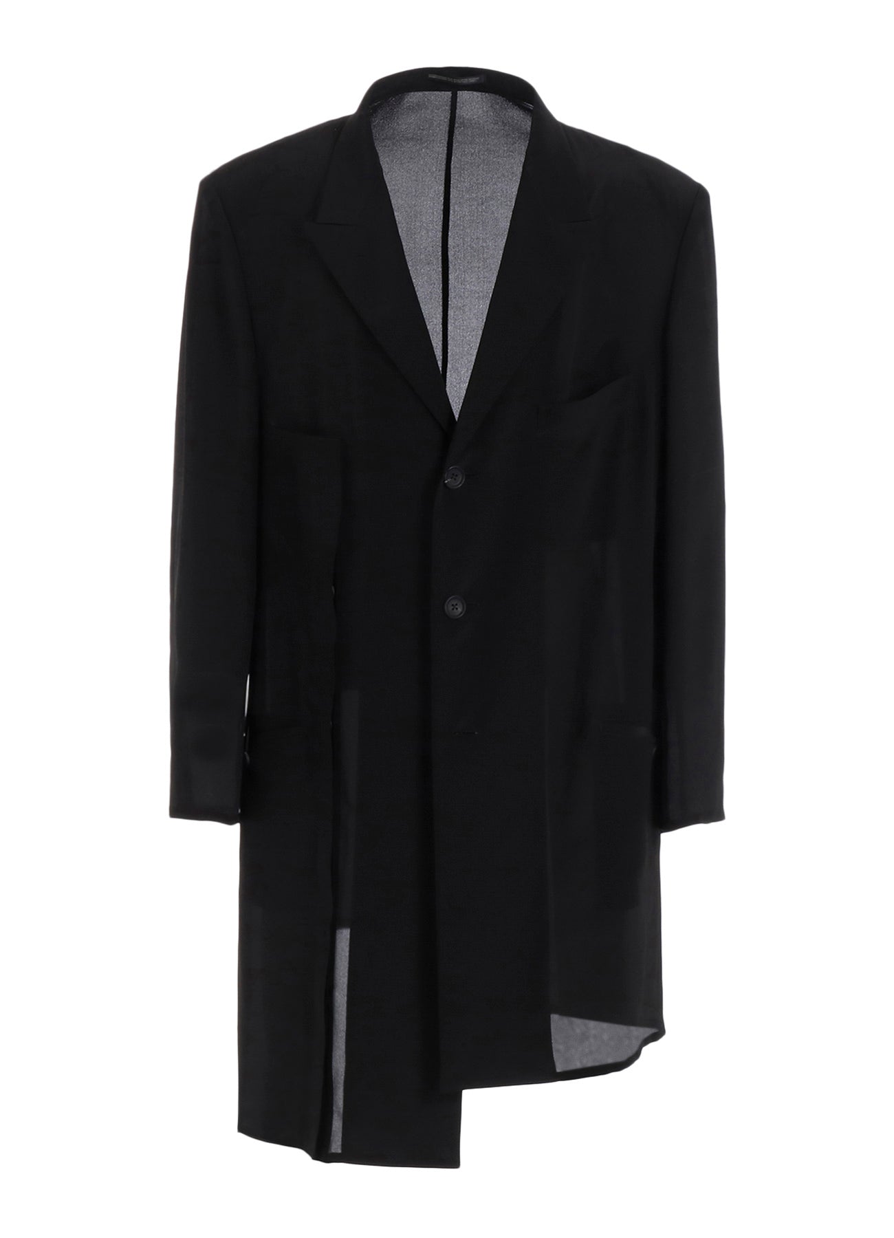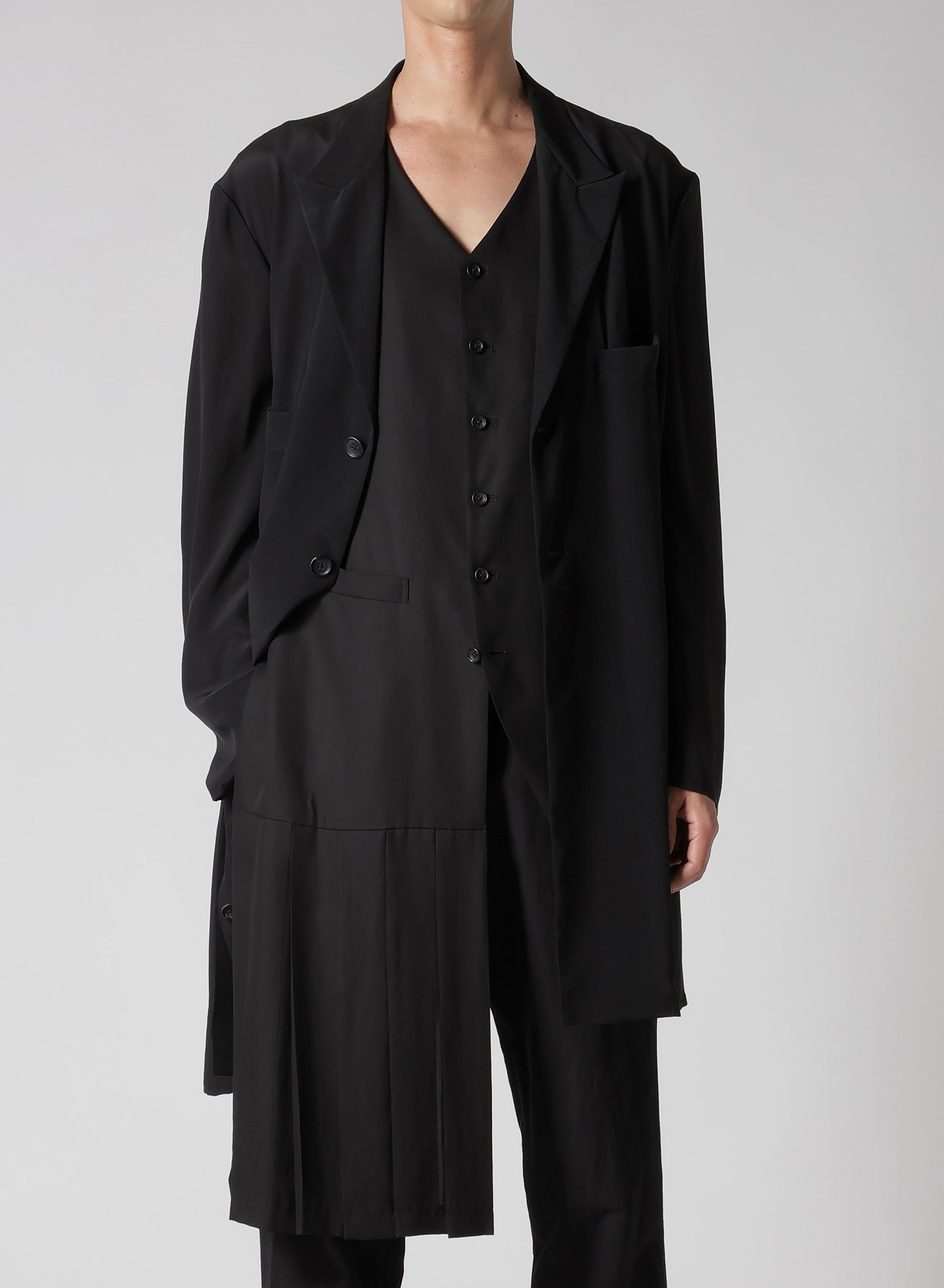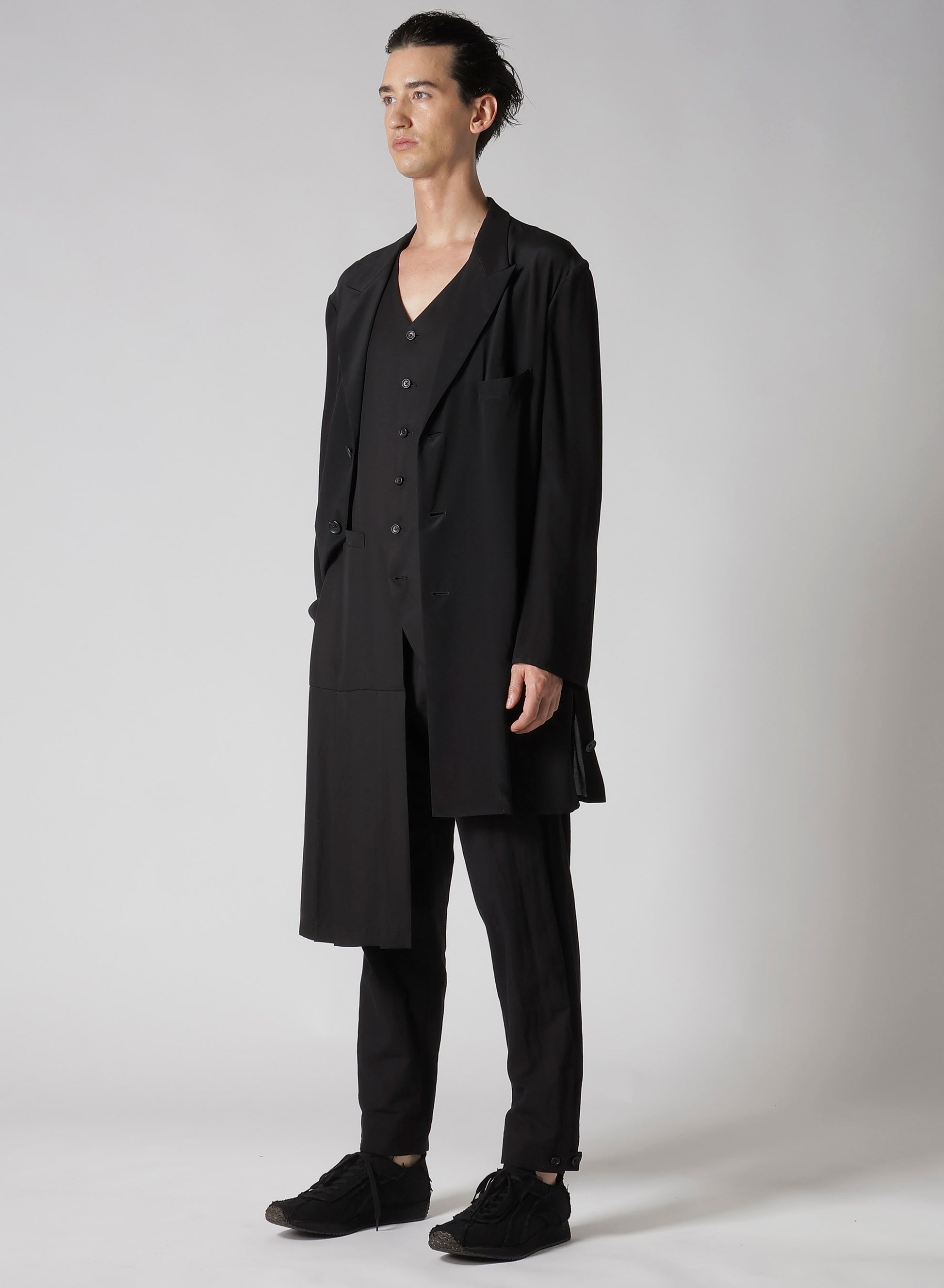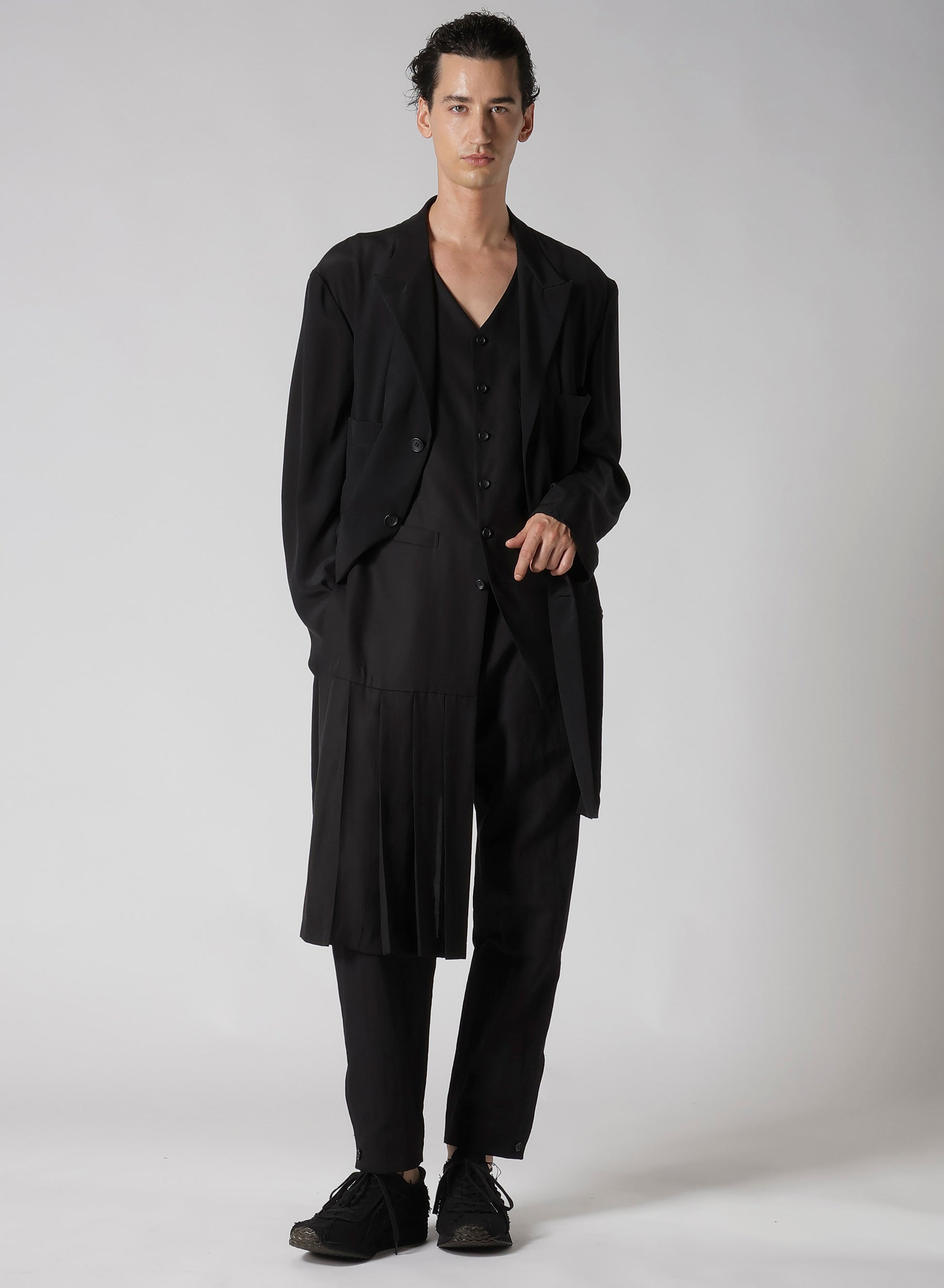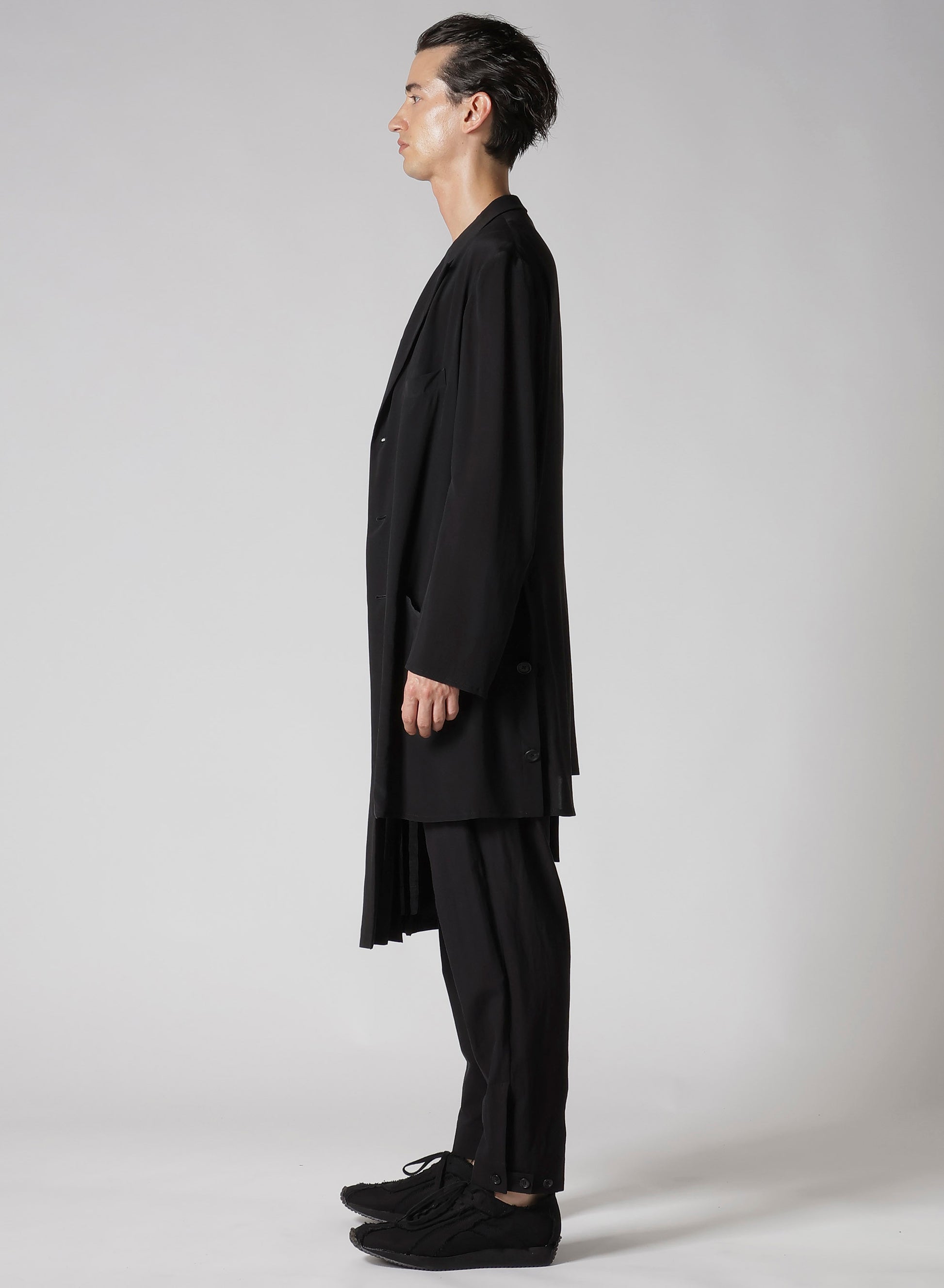 This piece from the Yohji Yamamoto POUR HOMME S/S 2025 collection, Look 24, showcases a jacket with a unique right-side button opening. Crafted from 12 momme silk crepe de Chine, it offers a refined texture and a graceful drapery. Kyoto artisans used a special dyeing method to achieve its rich color.