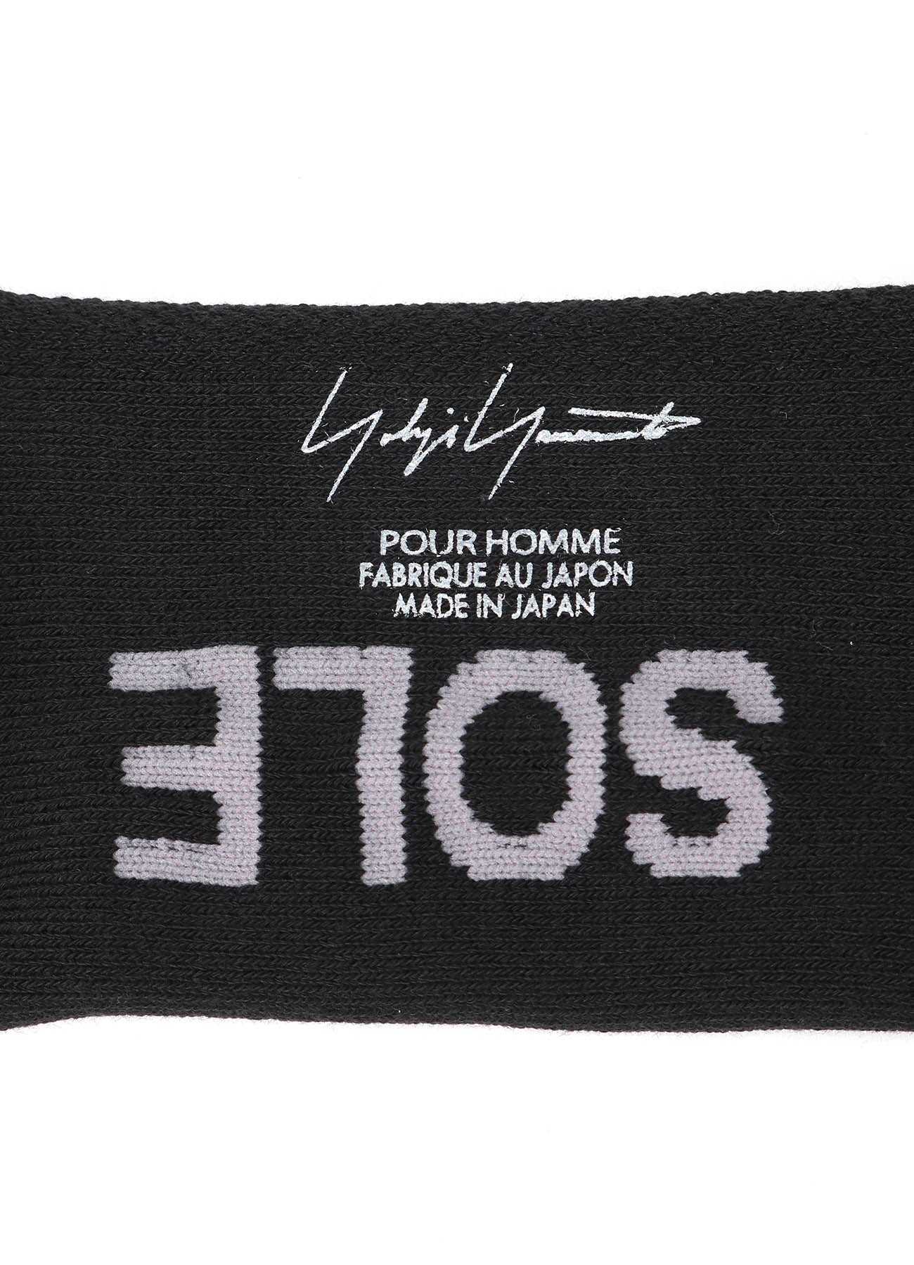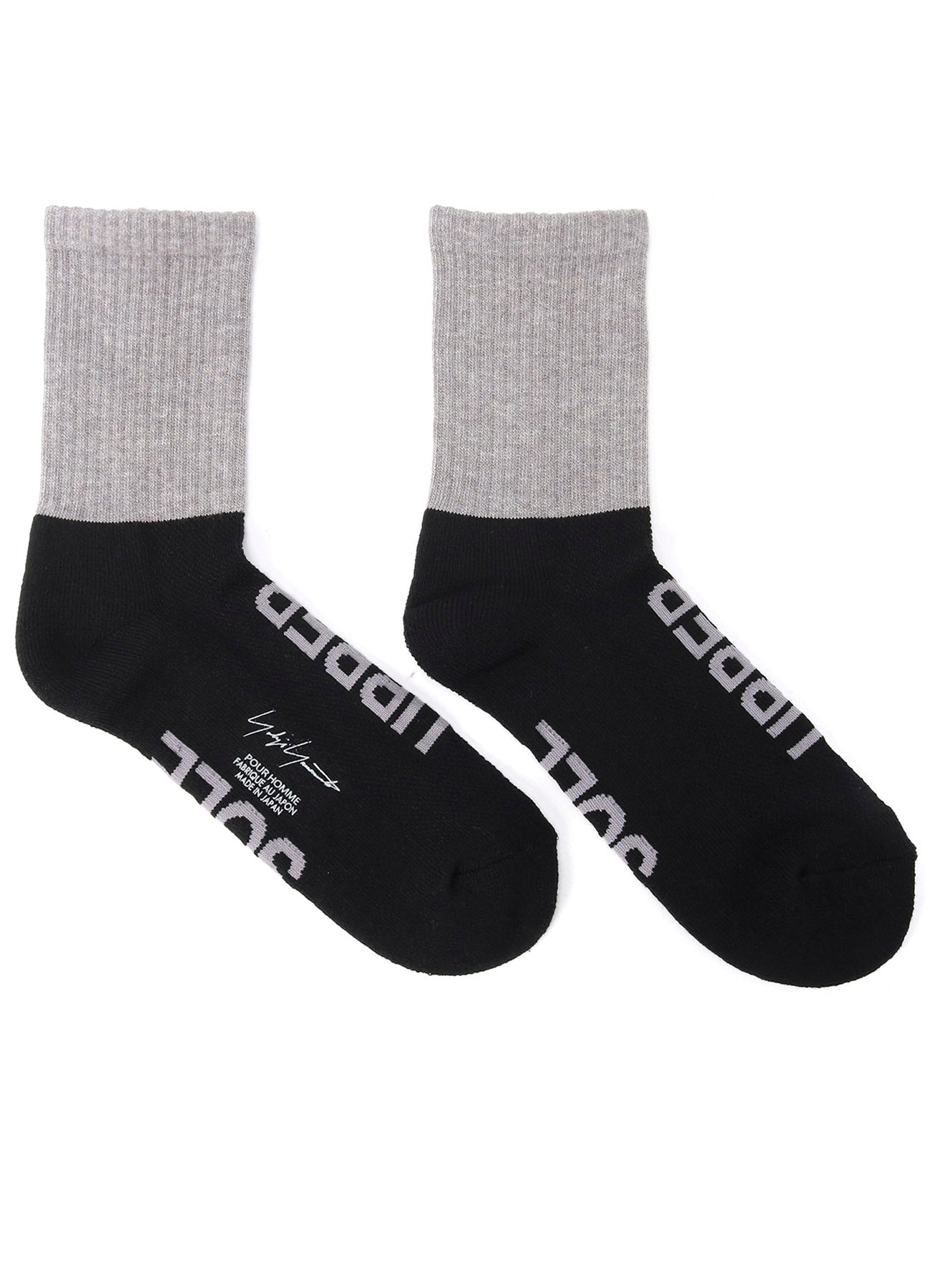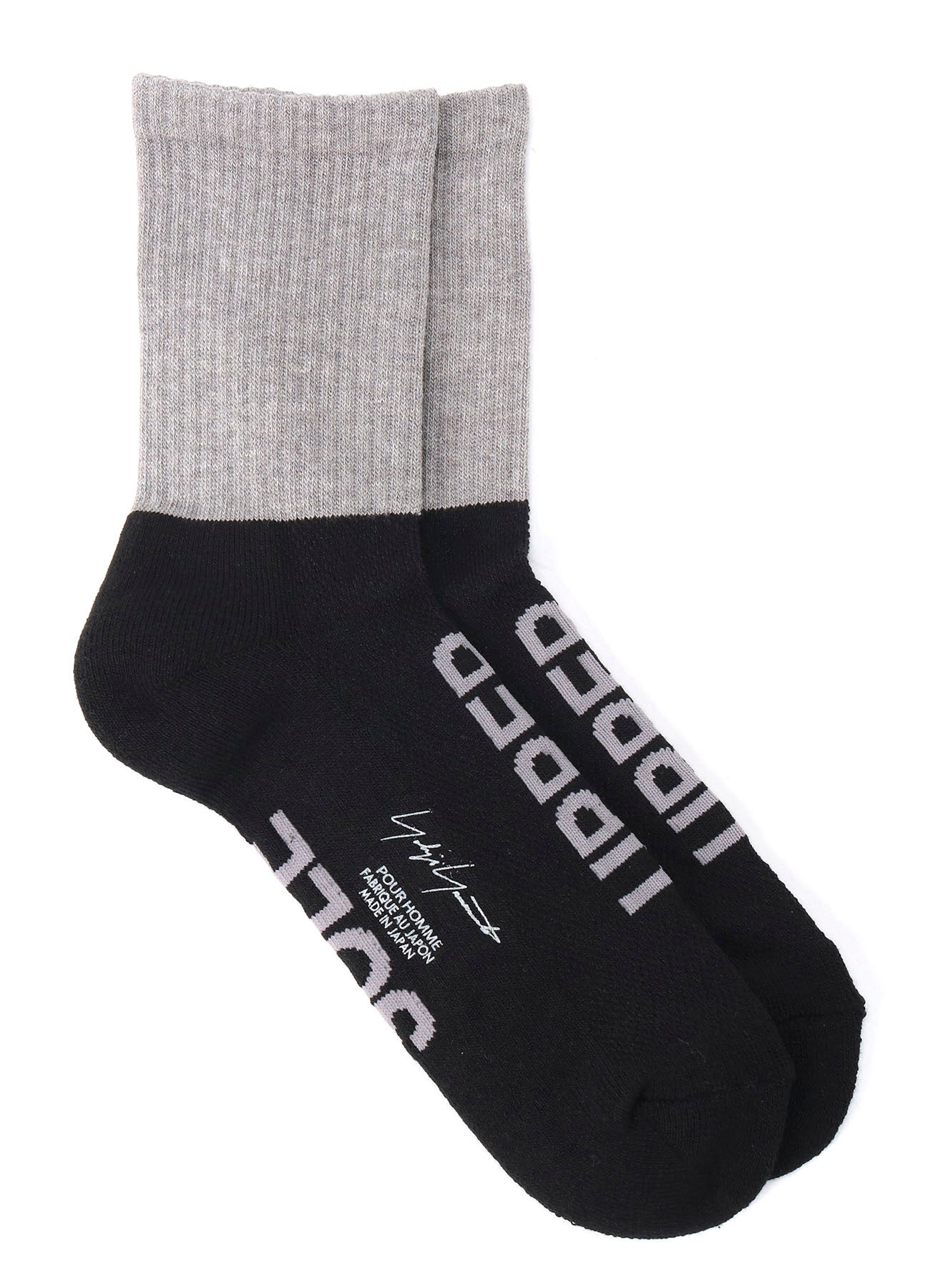 Yohji Yamamoto POUR HOMME's S/S 2025 Collection Look 21 features bicolor socks made from cotton-acrylic yarn, with a pile bottom. They display lettering on the foot and top side.