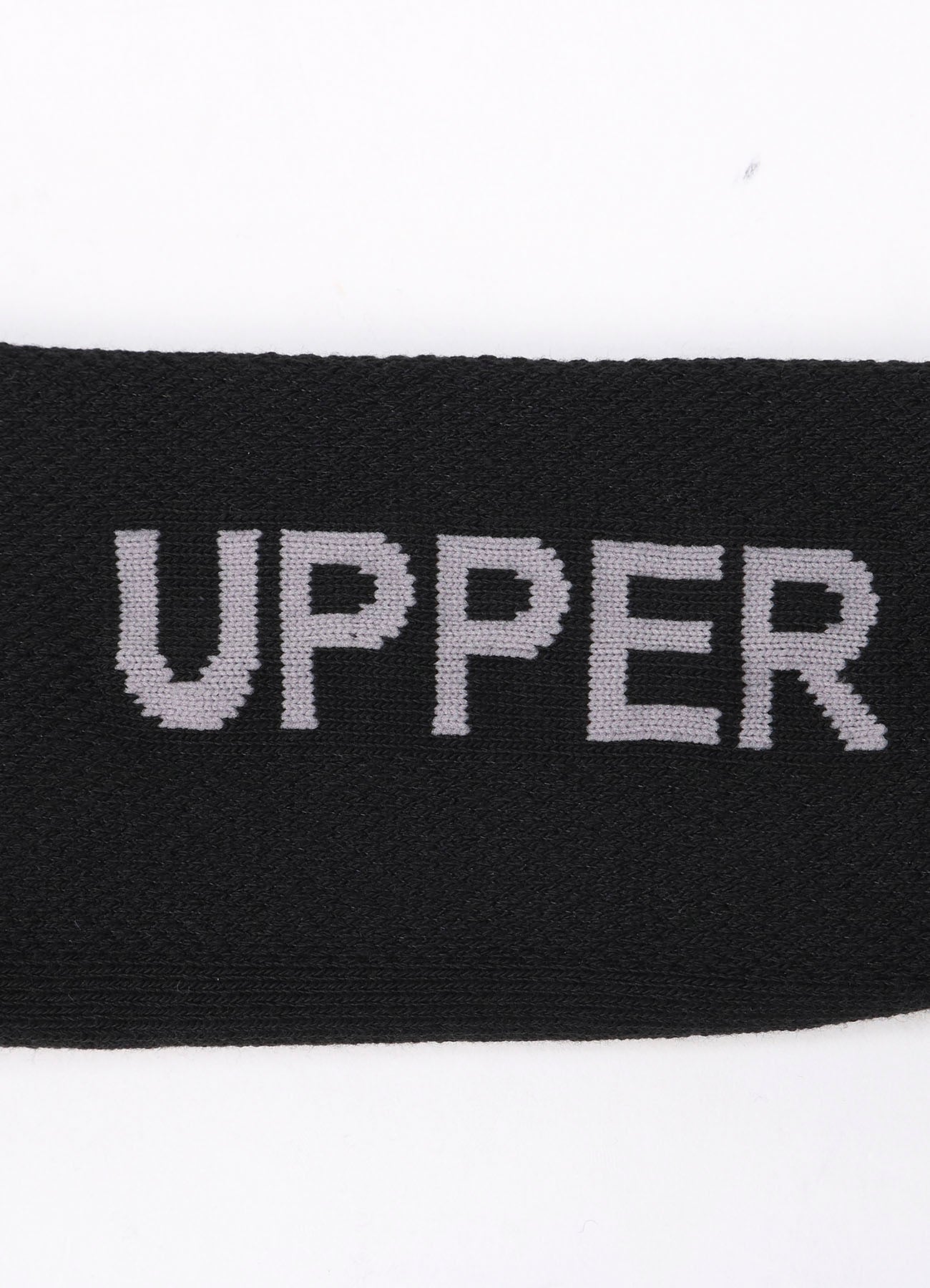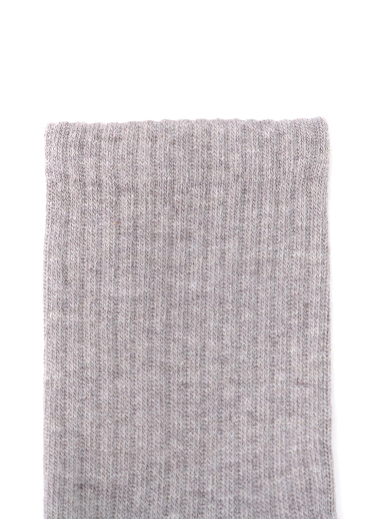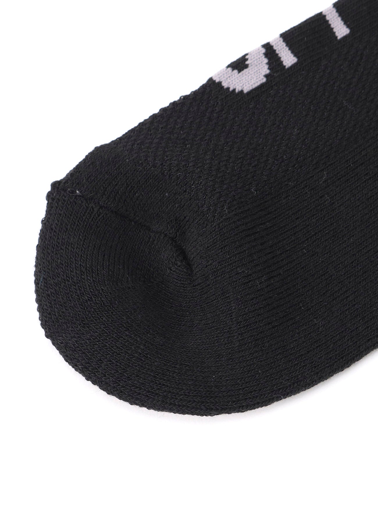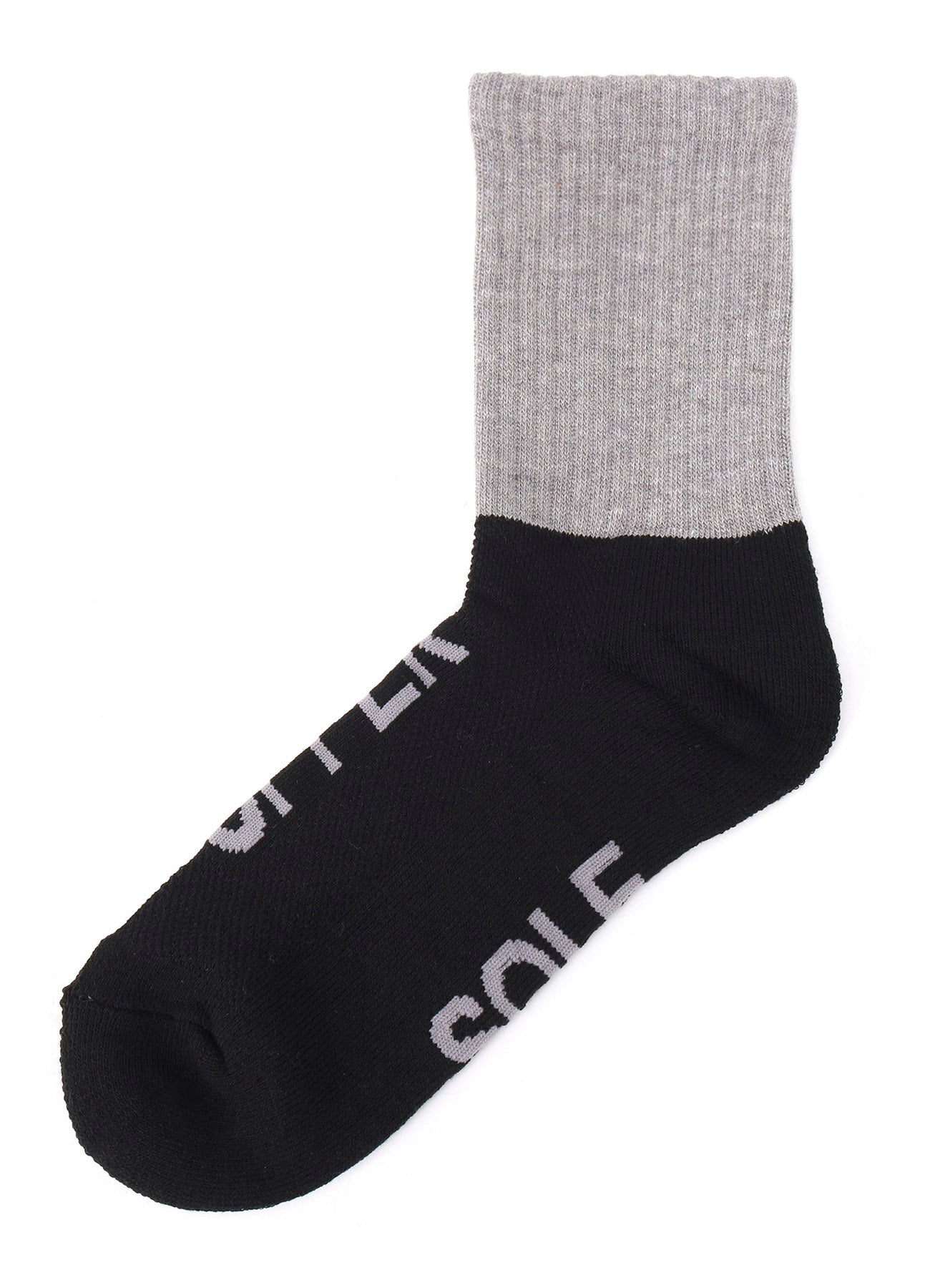 Yohji Yamamoto POUR HOMME's S/S 2025 Collection Look 21 features bicolor socks made from cotton-acrylic yarn, with a pile bottom. They display lettering on the foot and top side.