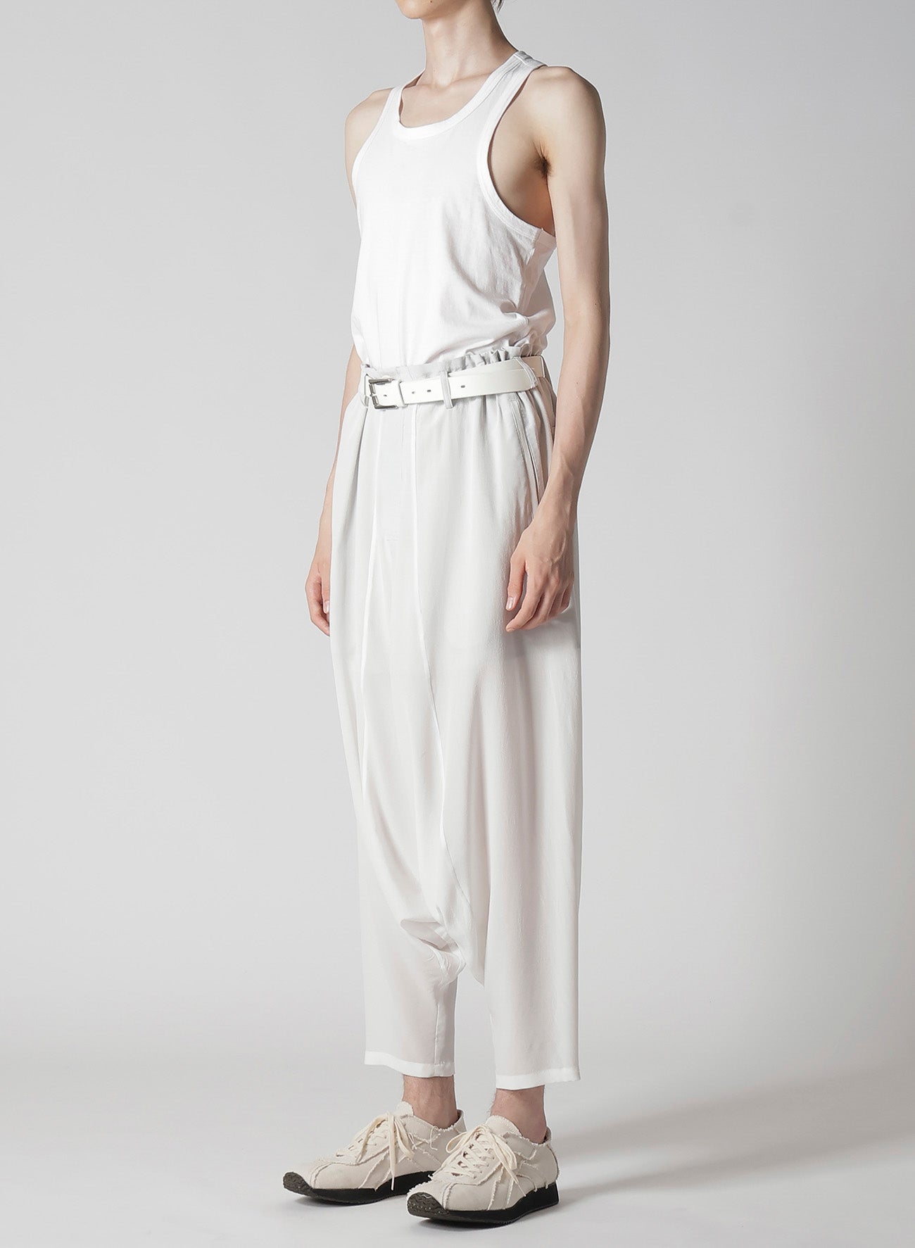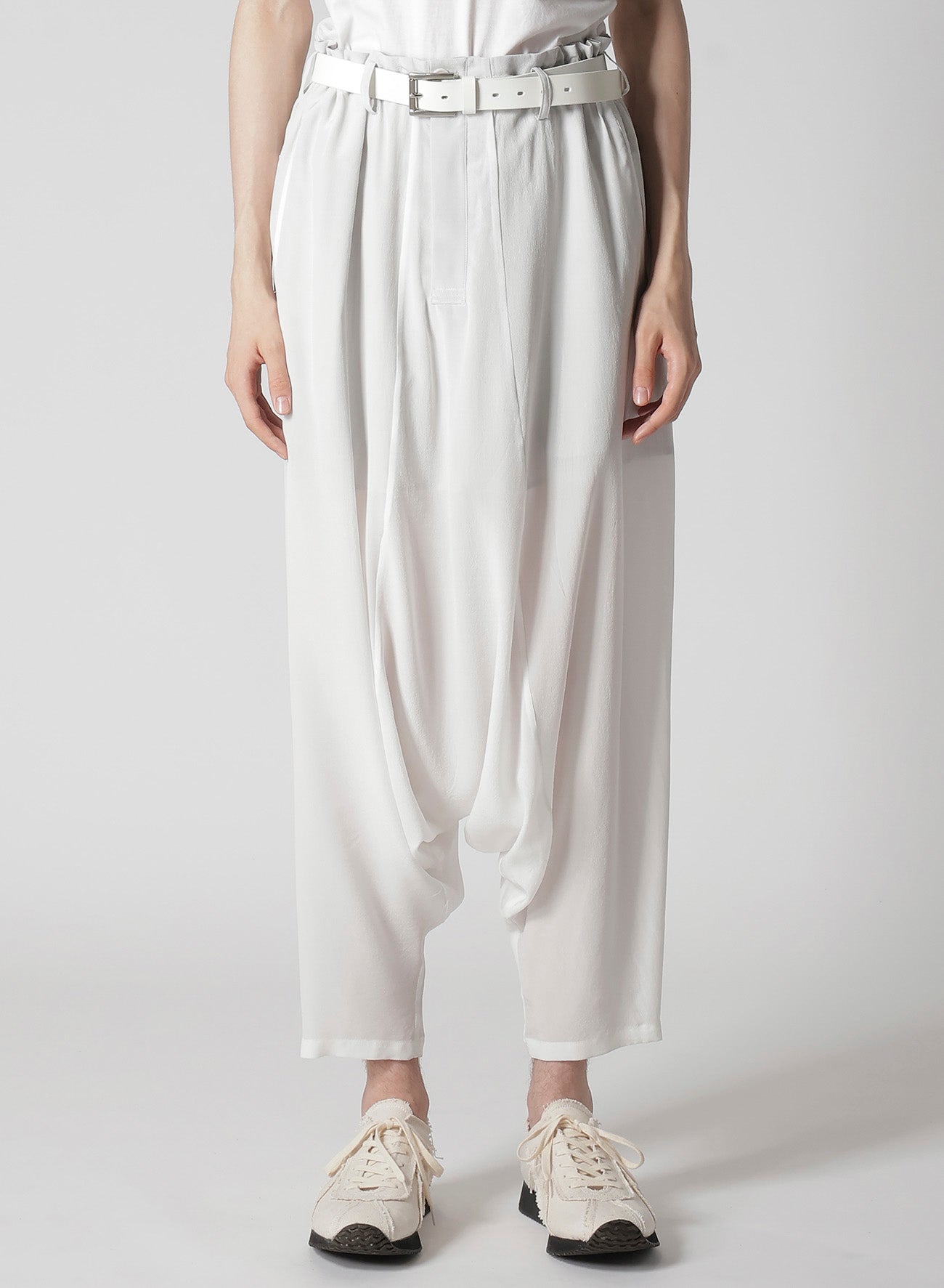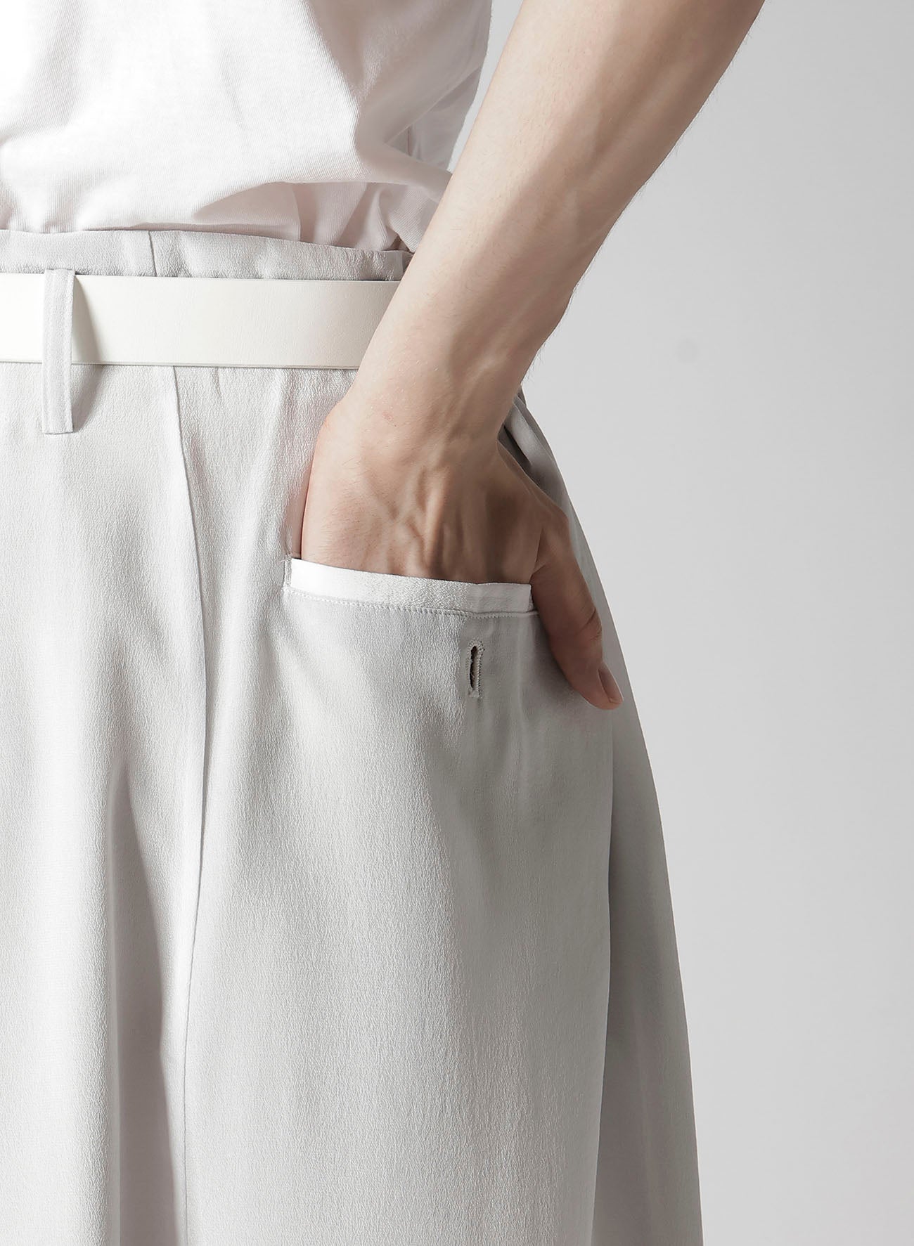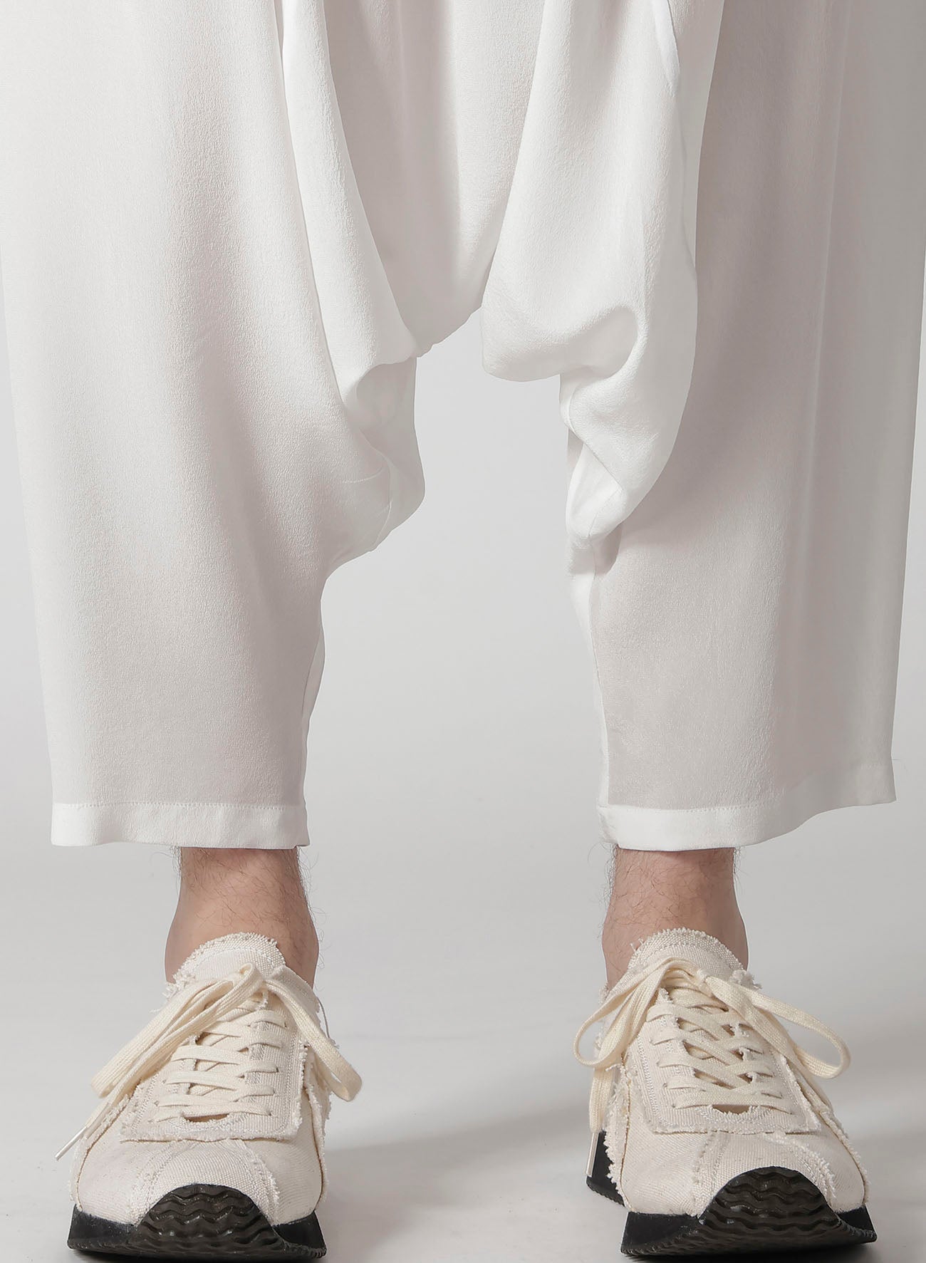 Yohji Yamamoto POUR HOMME's S/S 2025 collection includes sarouel pants with gusset. Crafted from 12-momme crepe de Chine, these pants offer a delicate texture, exquisite shine, and a flowy drapery distinctive to silk. Ideal for creating a refined yet relaxed look.
