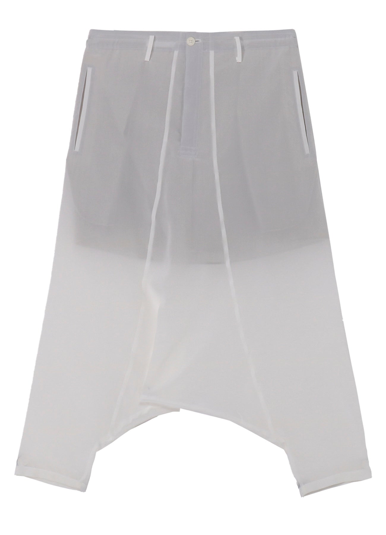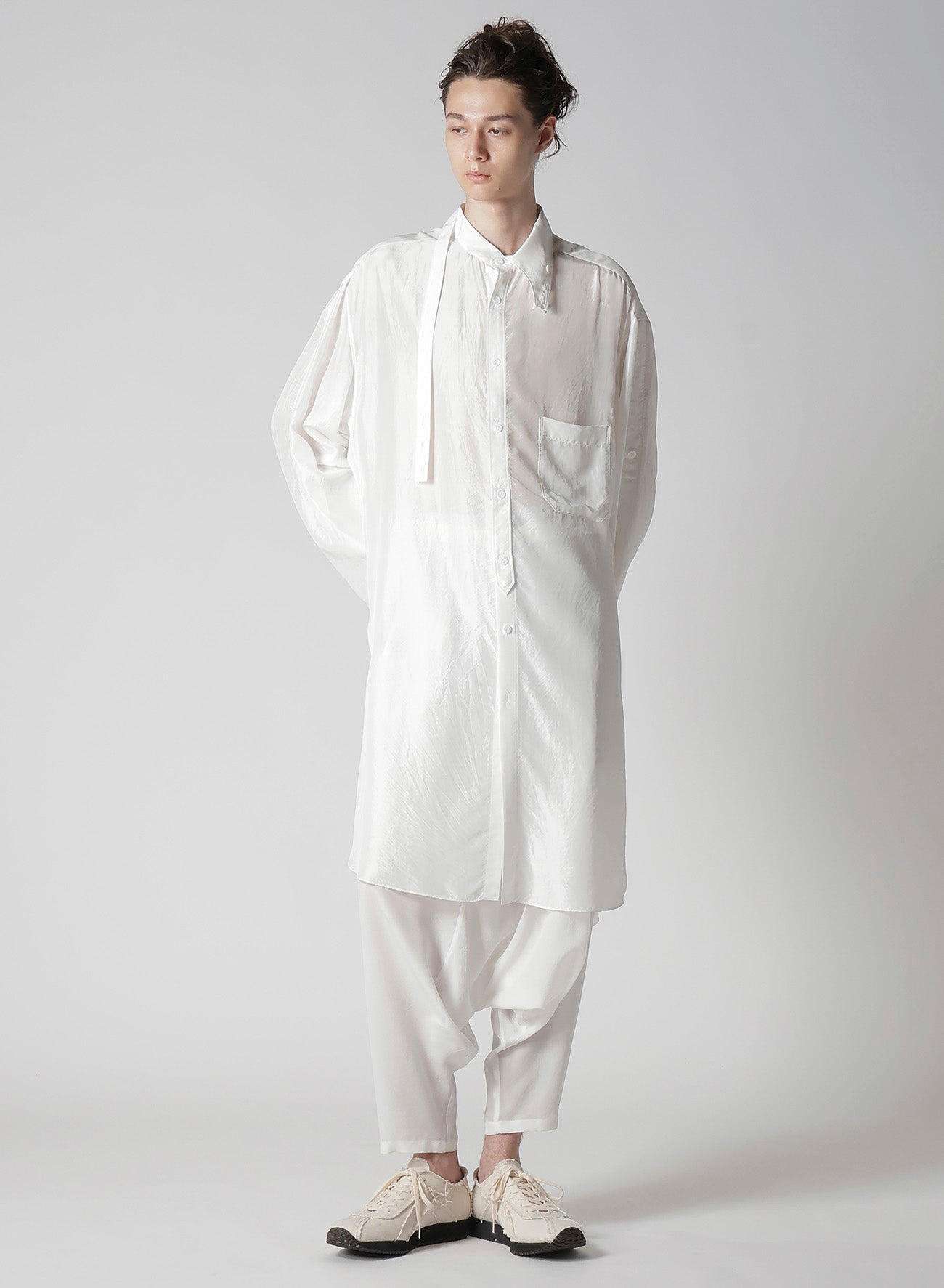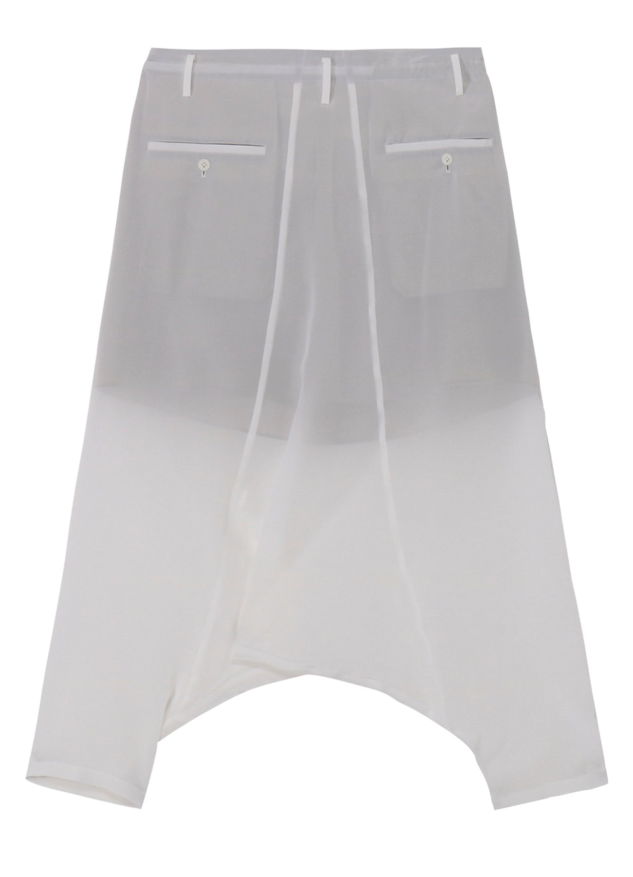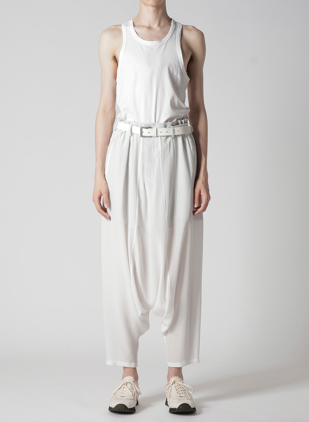Yohji Yamamoto POUR HOMME's S/S 2025 collection includes sarouel pants with gusset. Crafted from 12-momme crepe de Chine, these pants offer a delicate texture, exquisite shine, and a flowy drapery distinctive to silk. Ideal for creating a refined yet relaxed look.