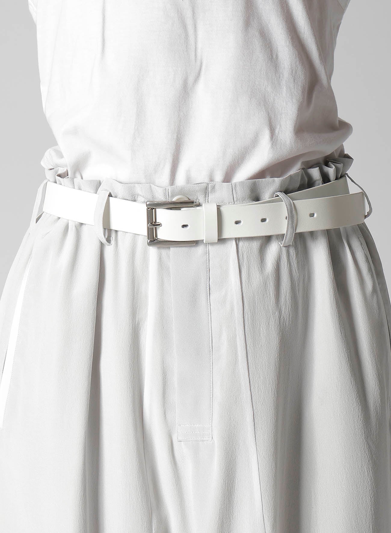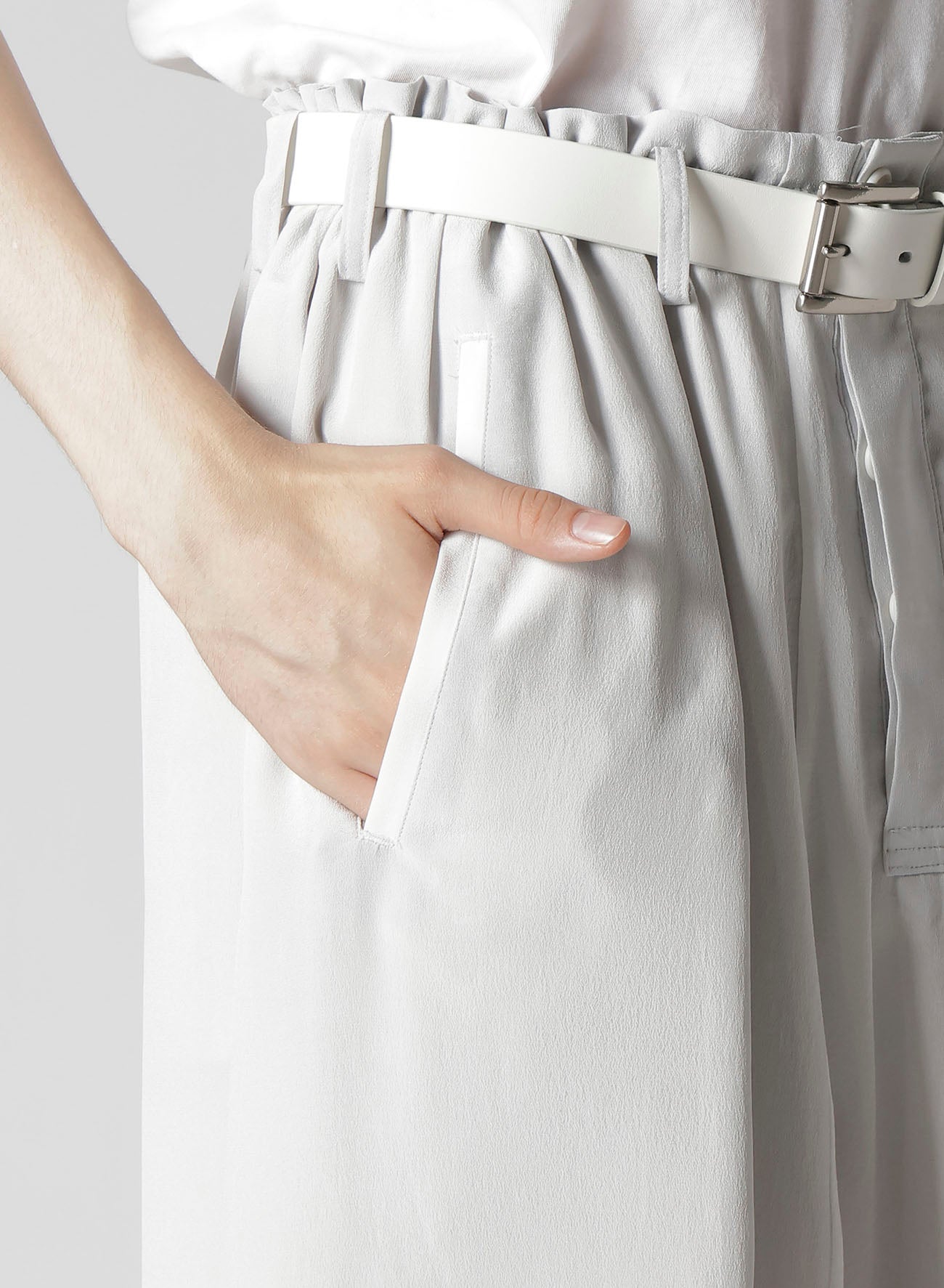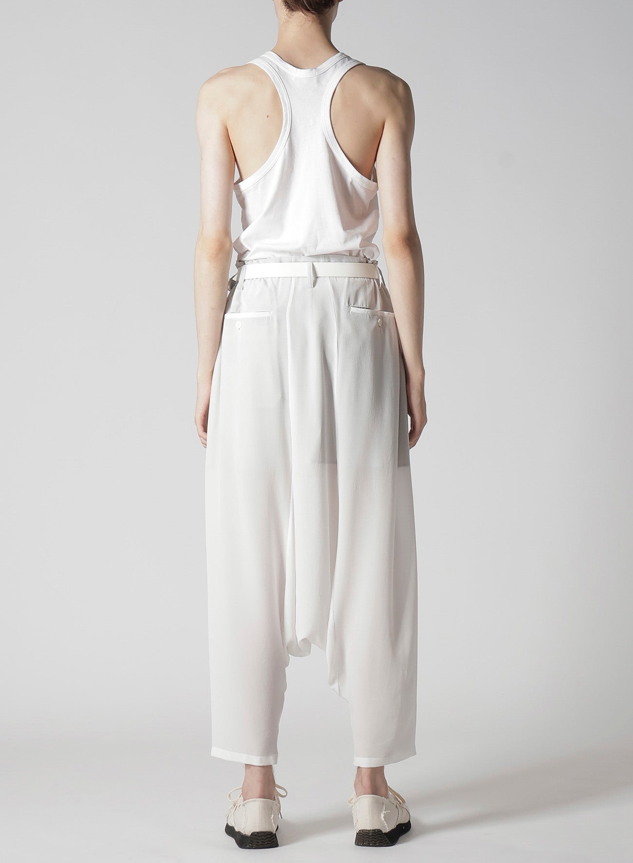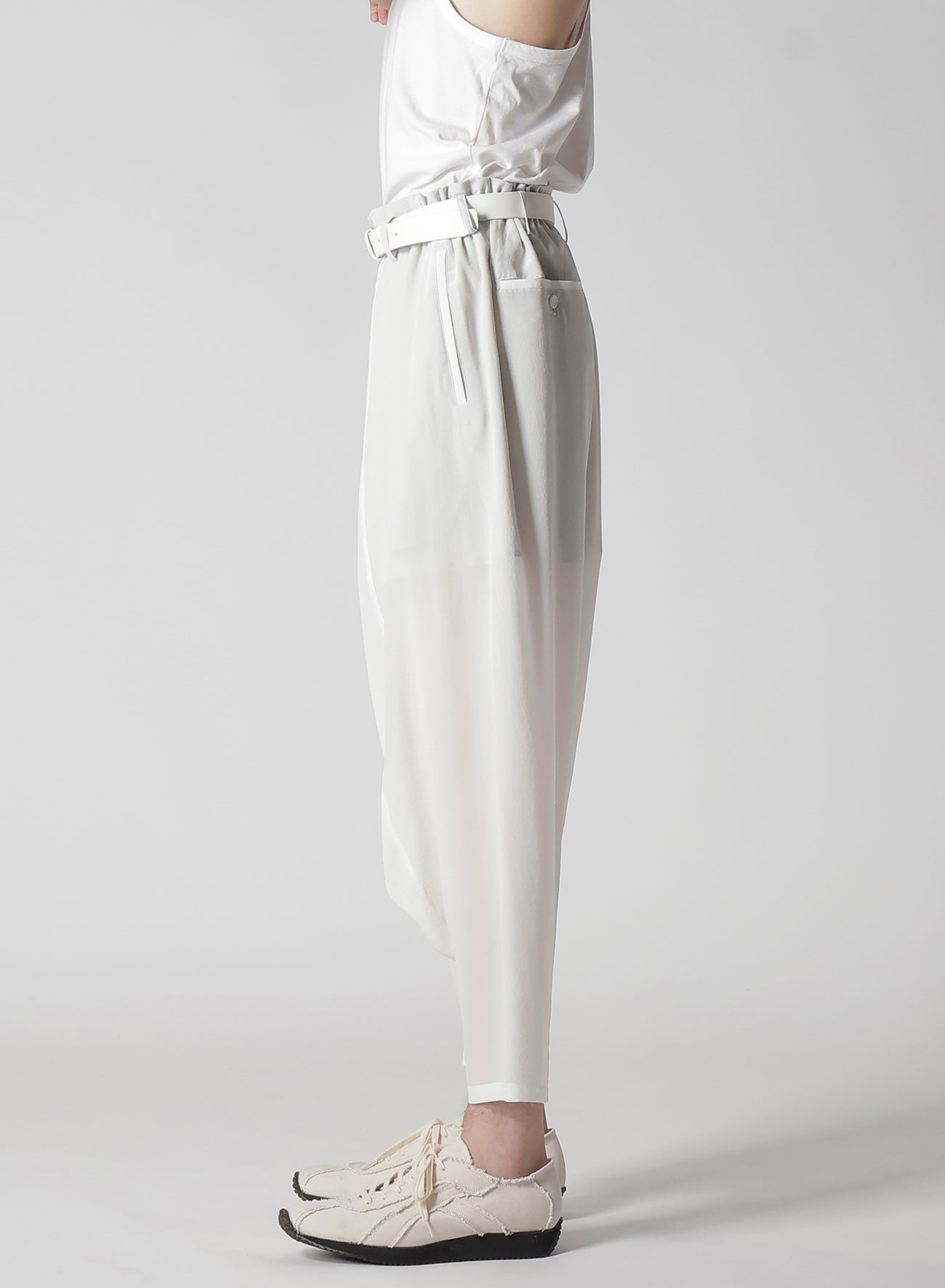 Yohji Yamamoto POUR HOMME's S/S 2025 collection includes sarouel pants with gusset. Crafted from 12-momme crepe de Chine, these pants offer a delicate texture, exquisite shine, and a flowy drapery distinctive to silk. Ideal for creating a refined yet relaxed look.