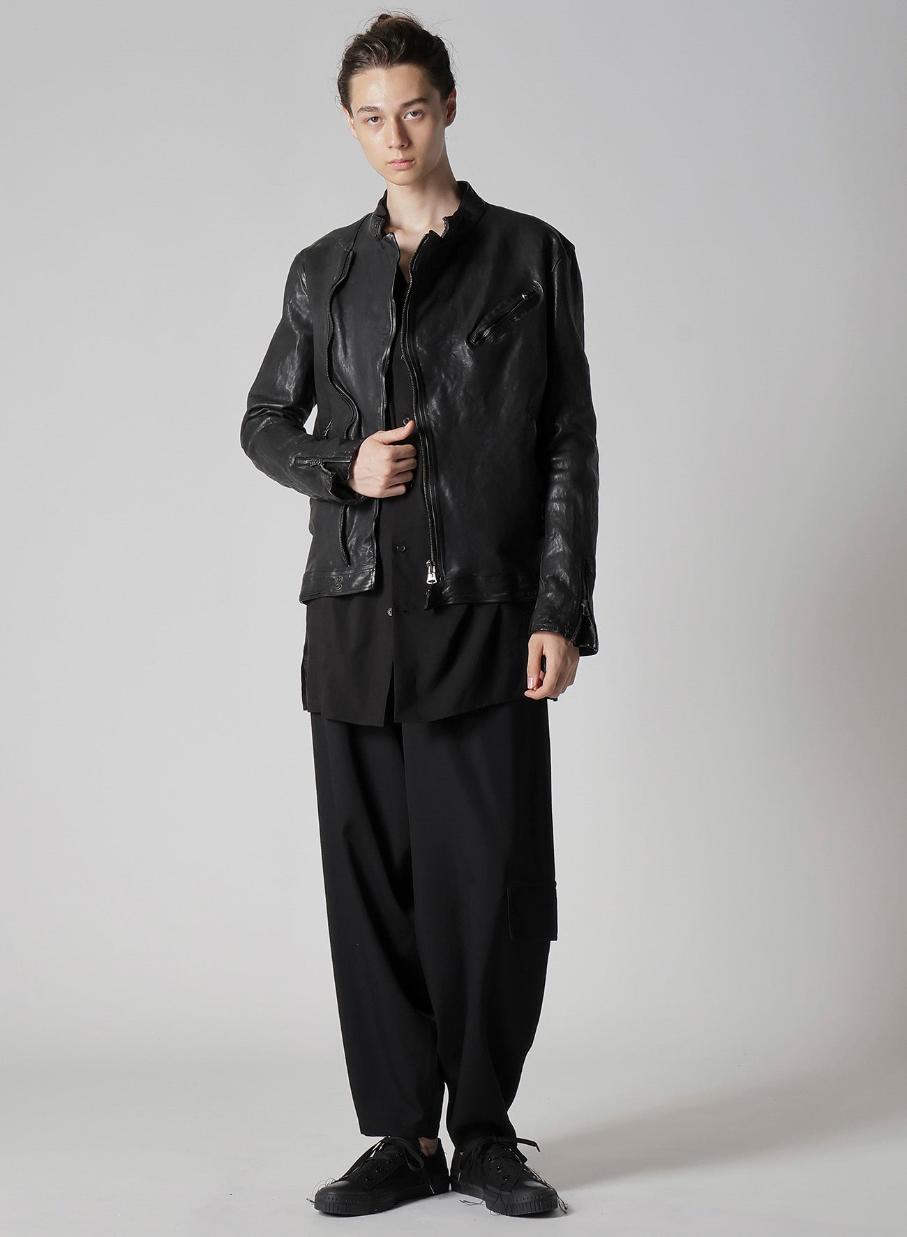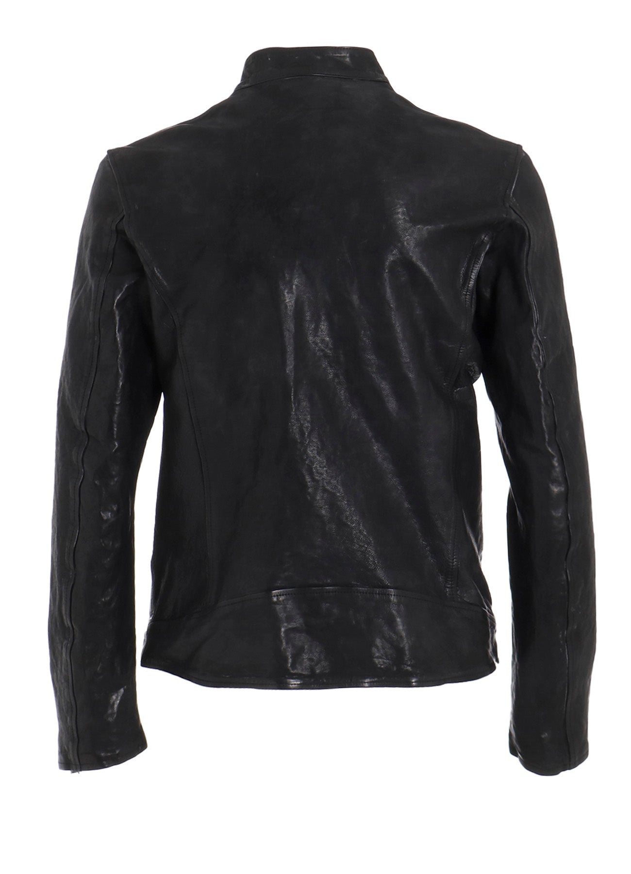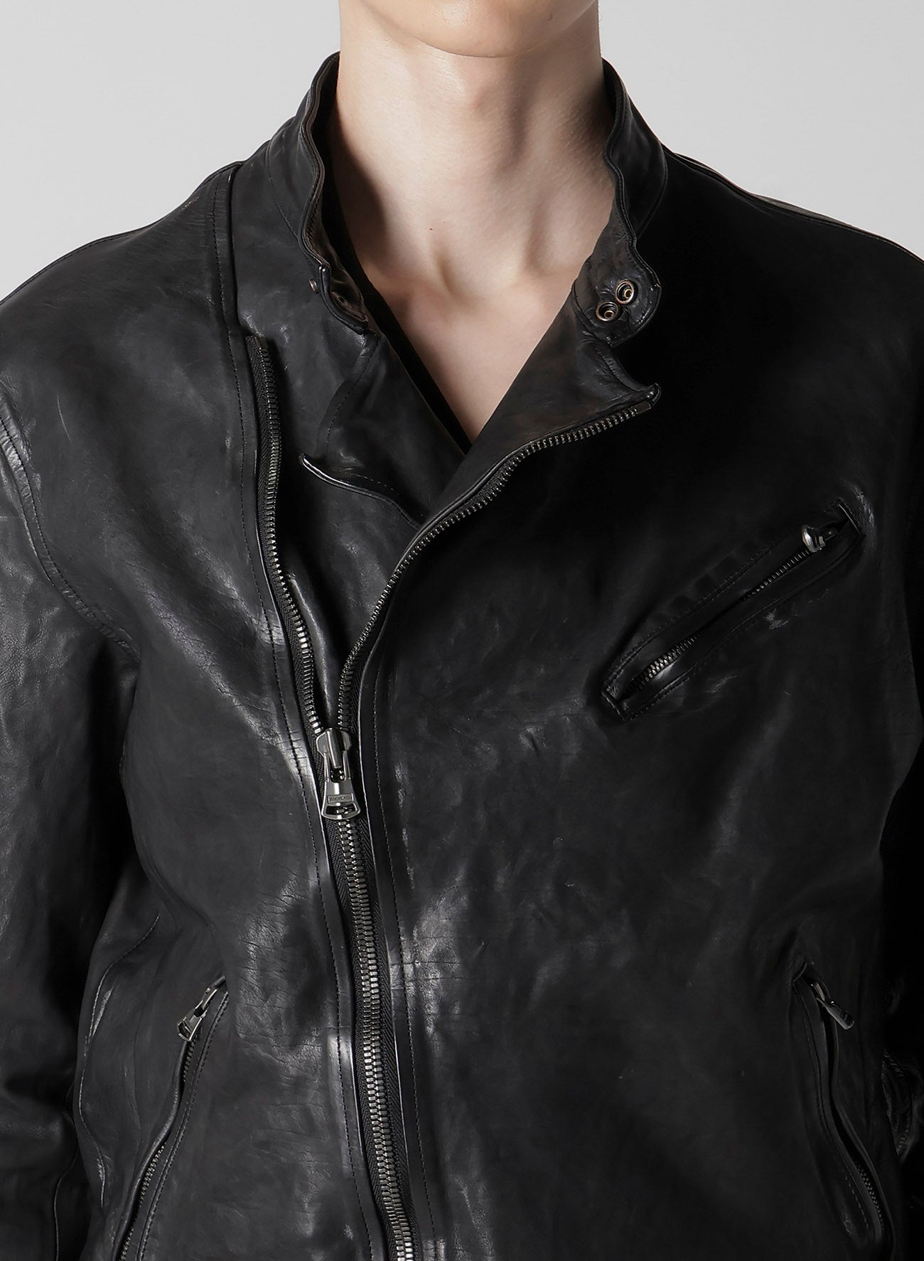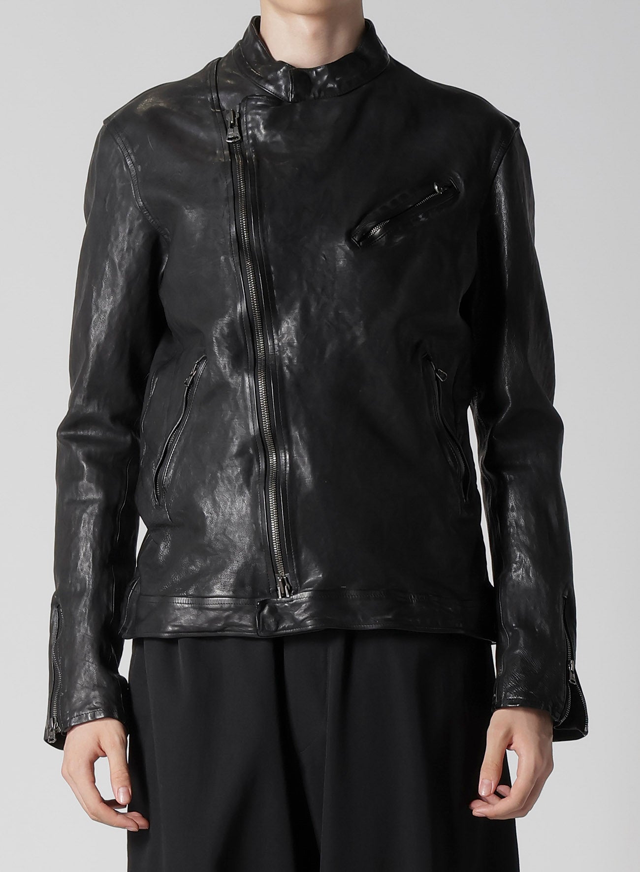 A semi-double jacket crafted from domestically sourced vegetable tanned leather. Post-sewing, the garment is dyed, followed by the application of wax which is ironed to set, creating a deep black finish. Over time, the wax blends into the leather, further enhancing its smooth texture and allowing for an aged transformation.