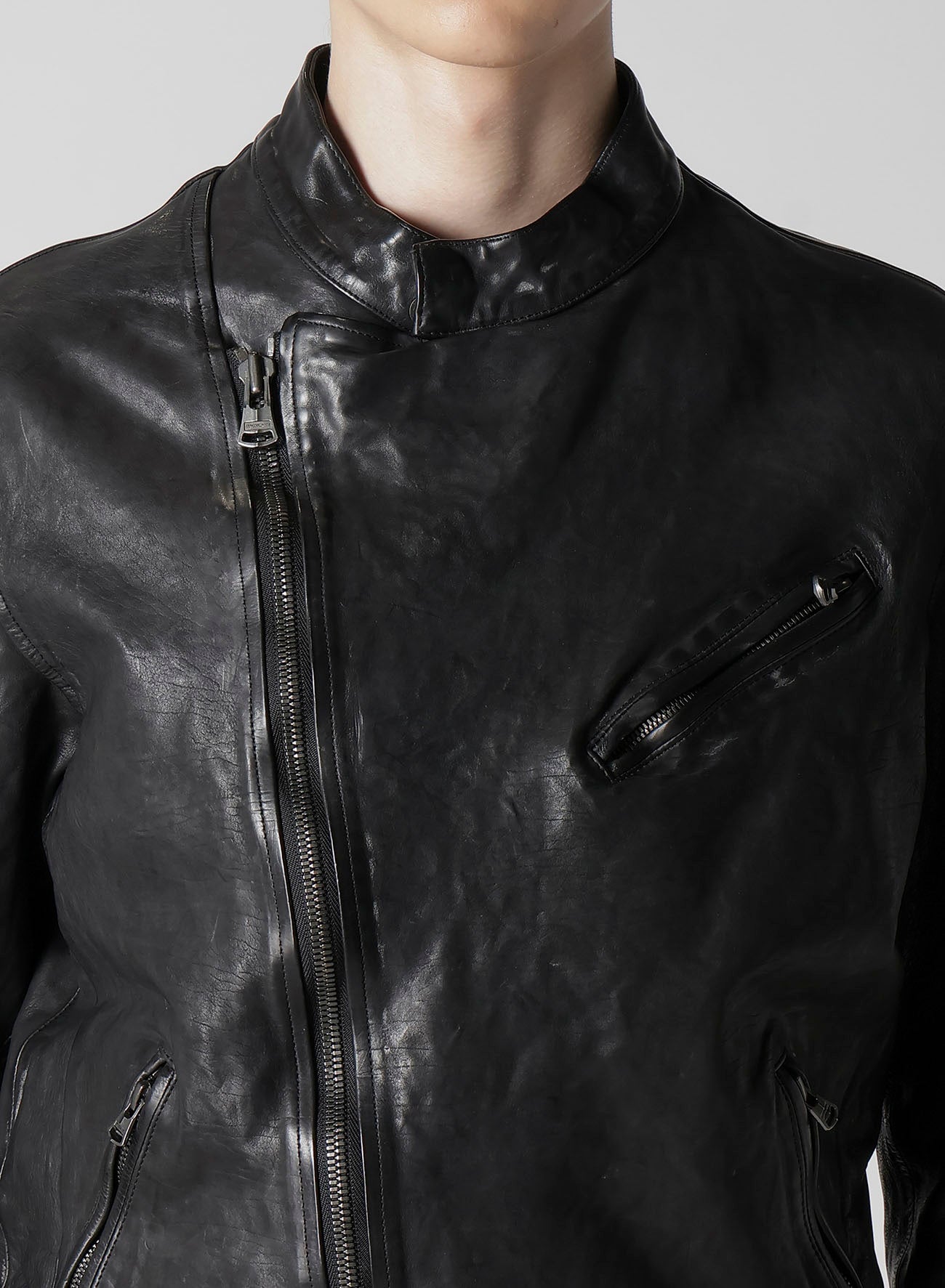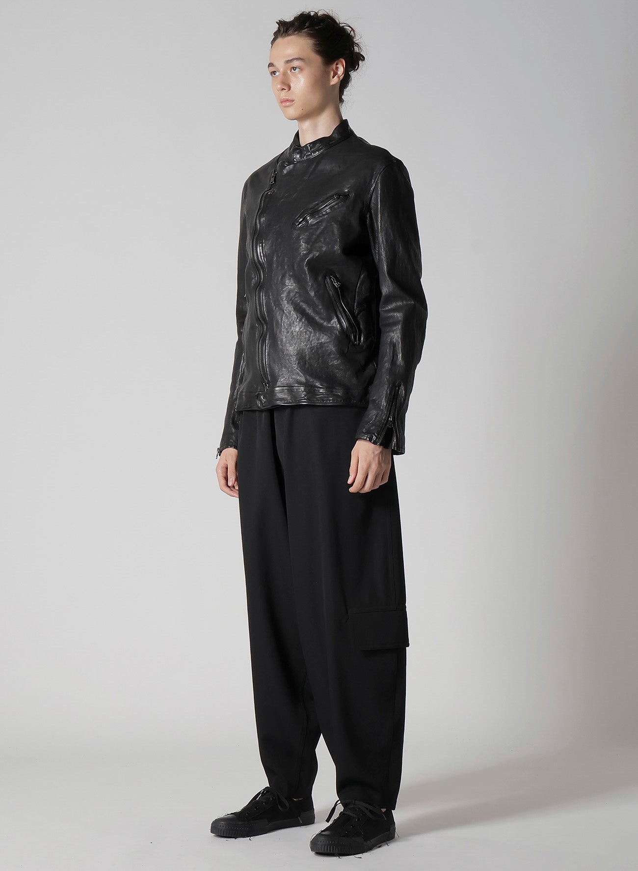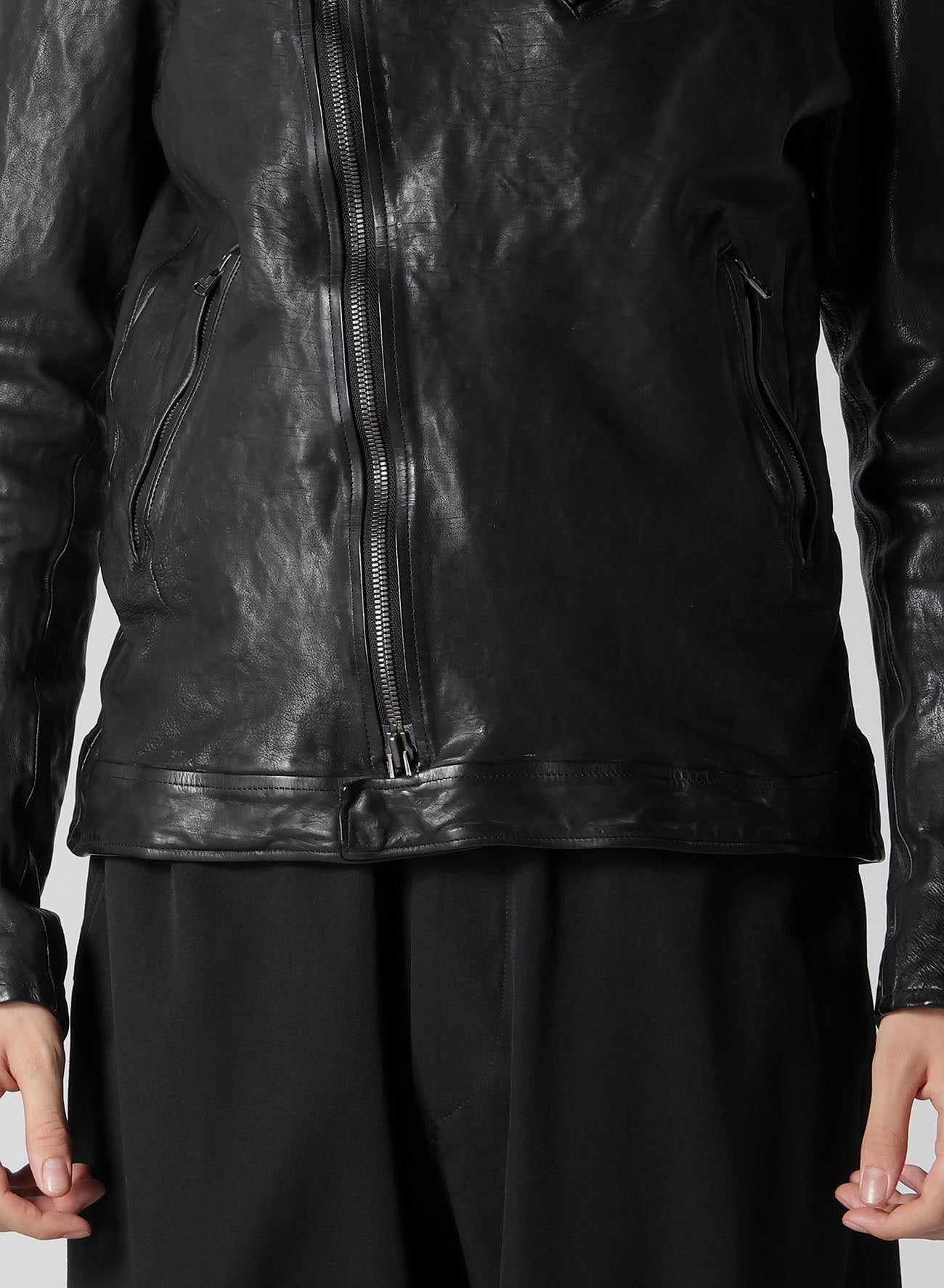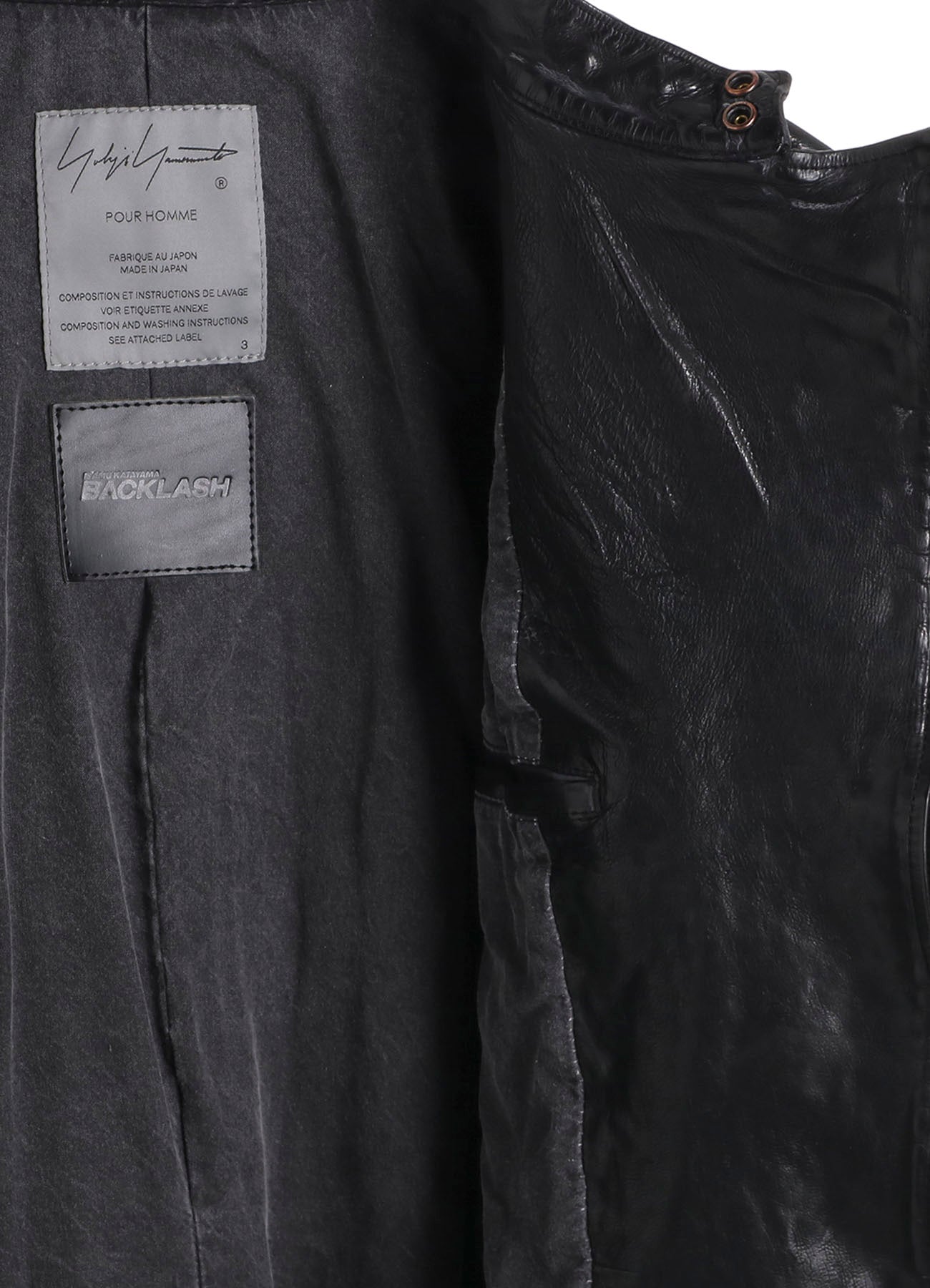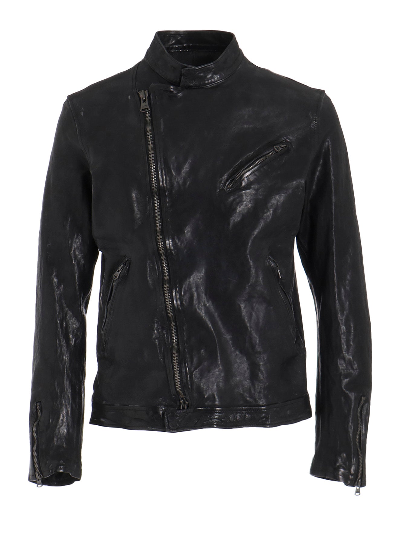 A semi-double jacket crafted from domestically sourced vegetable tanned leather. Post-sewing, the garment is dyed, followed by the application of wax which is ironed to set, creating a deep black finish. Over time, the wax blends into the leather, further enhancing its smooth texture and allowing for an aged transformation.