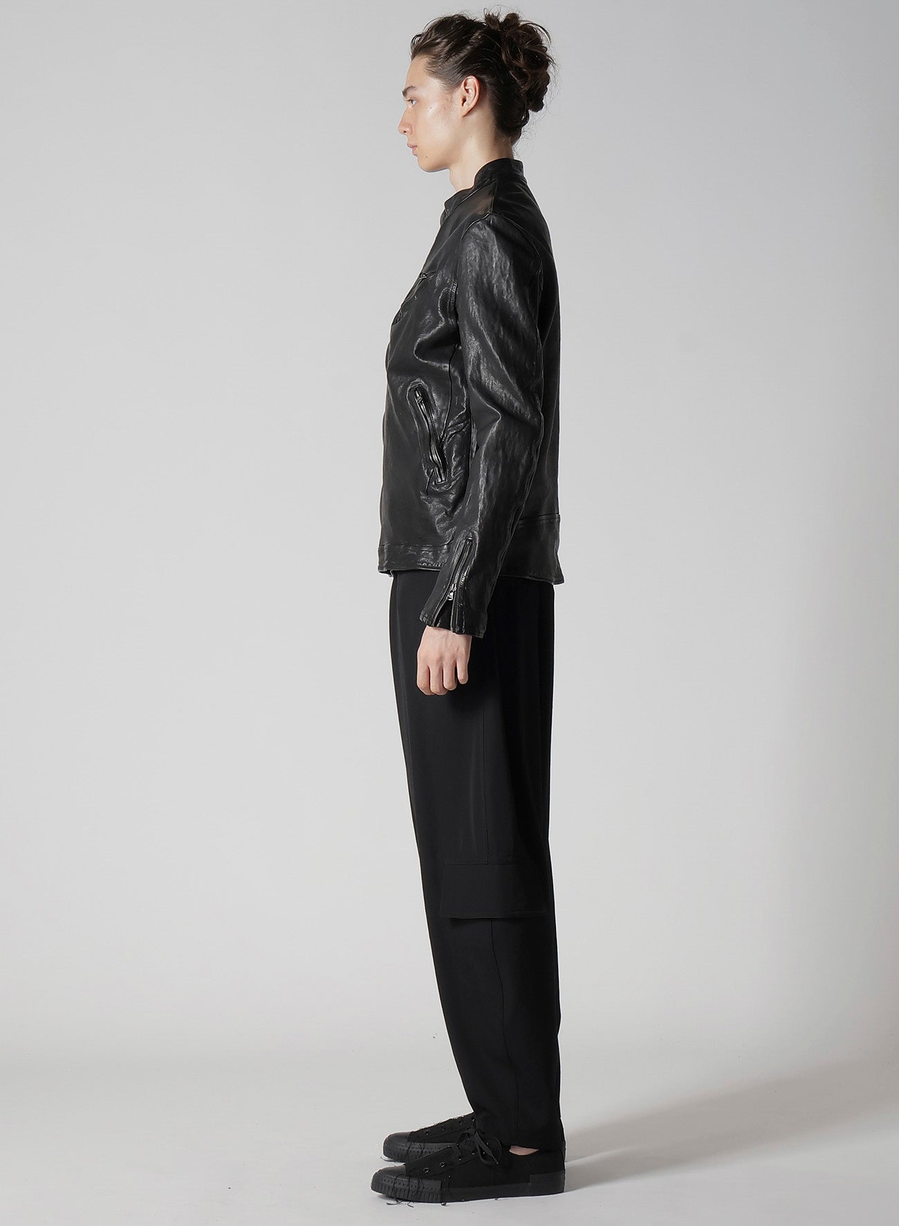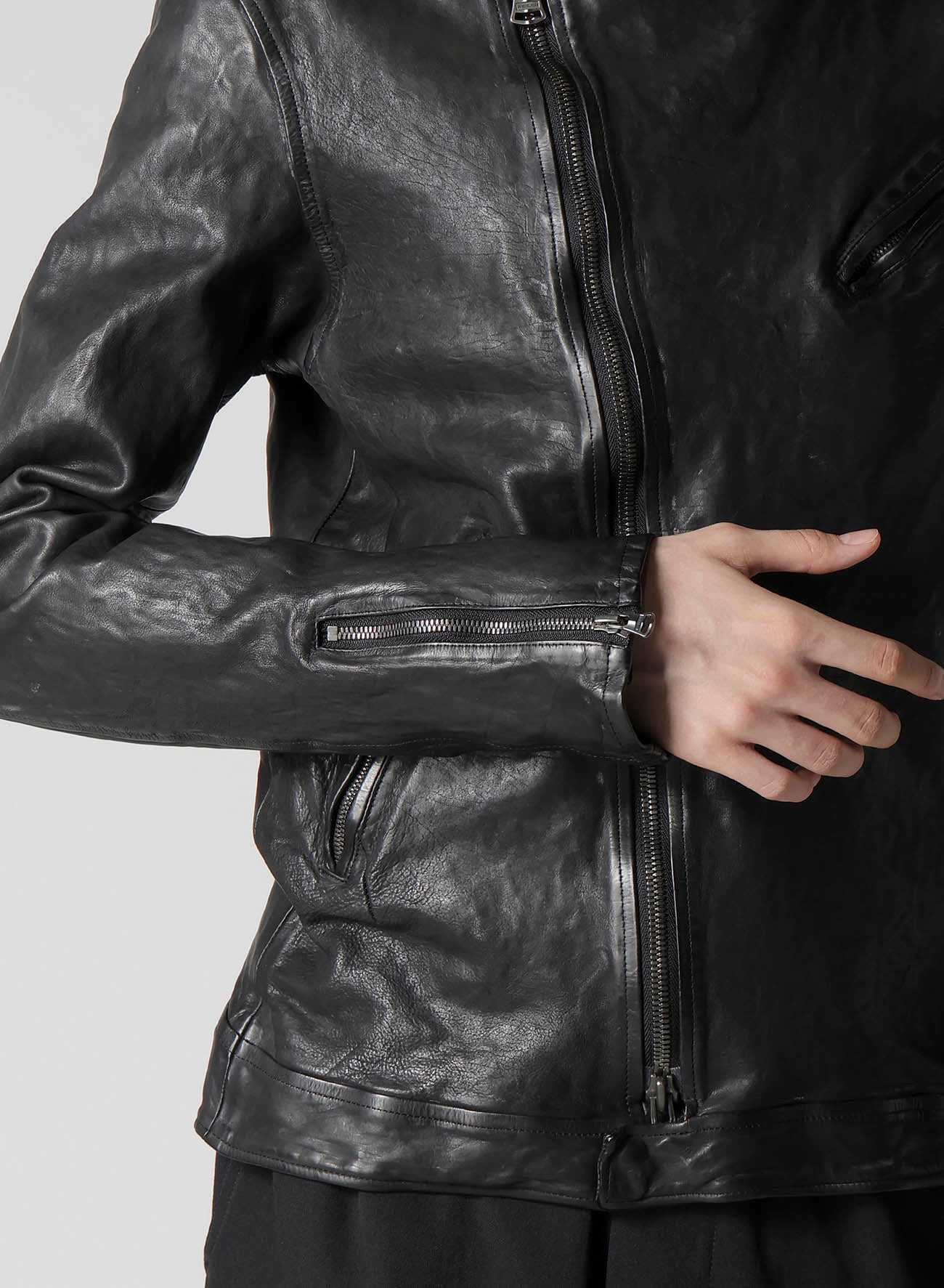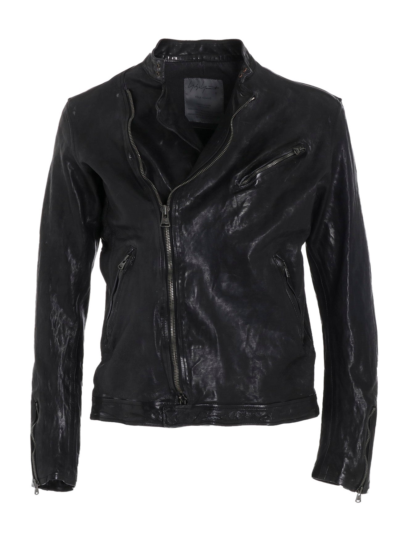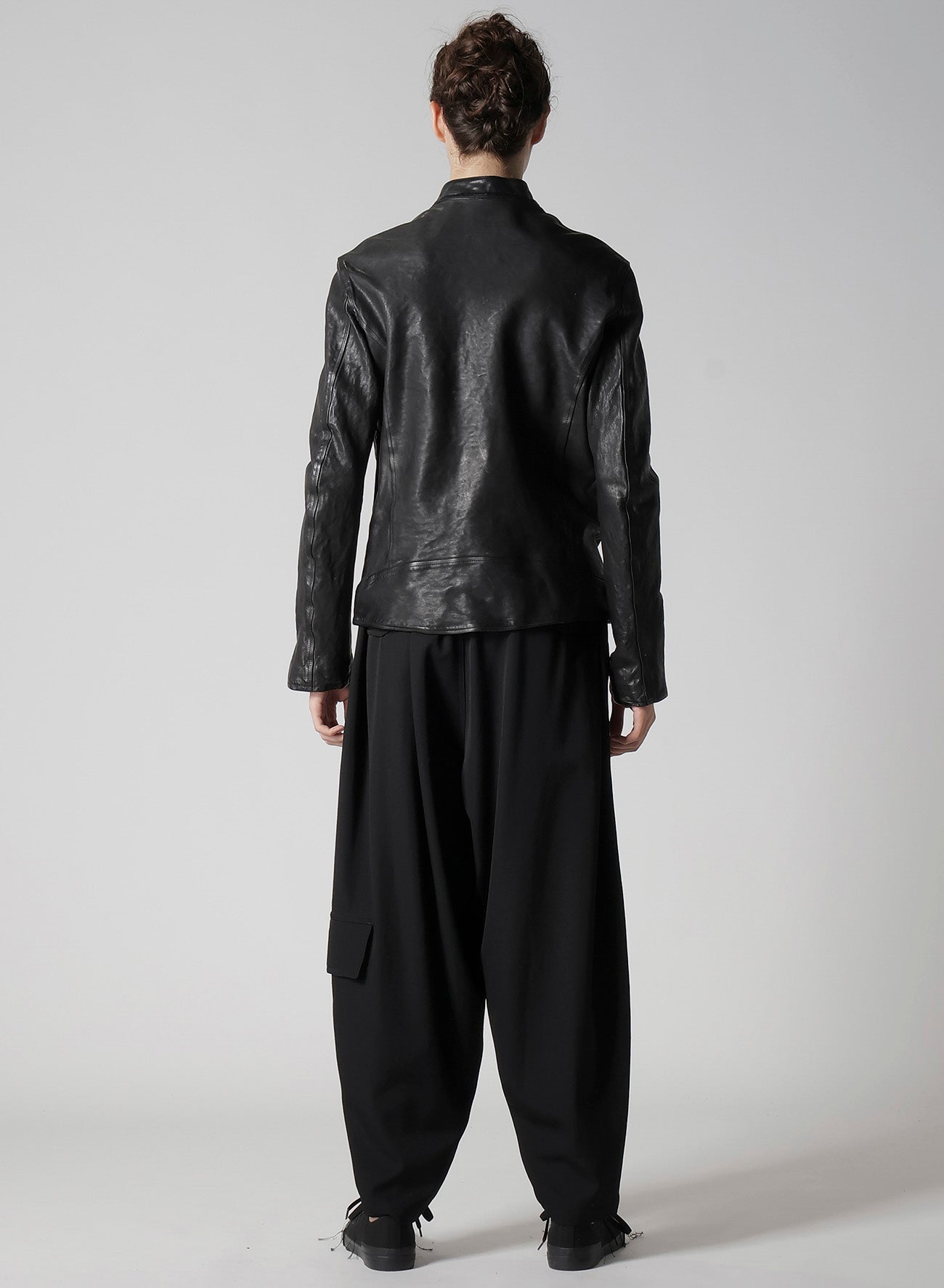 A semi-double jacket crafted from domestically sourced vegetable tanned leather. Post-sewing, the garment is dyed, followed by the application of wax which is ironed to set, creating a deep black finish. Over time, the wax blends into the leather, further enhancing its smooth texture and allowing for an aged transformation.