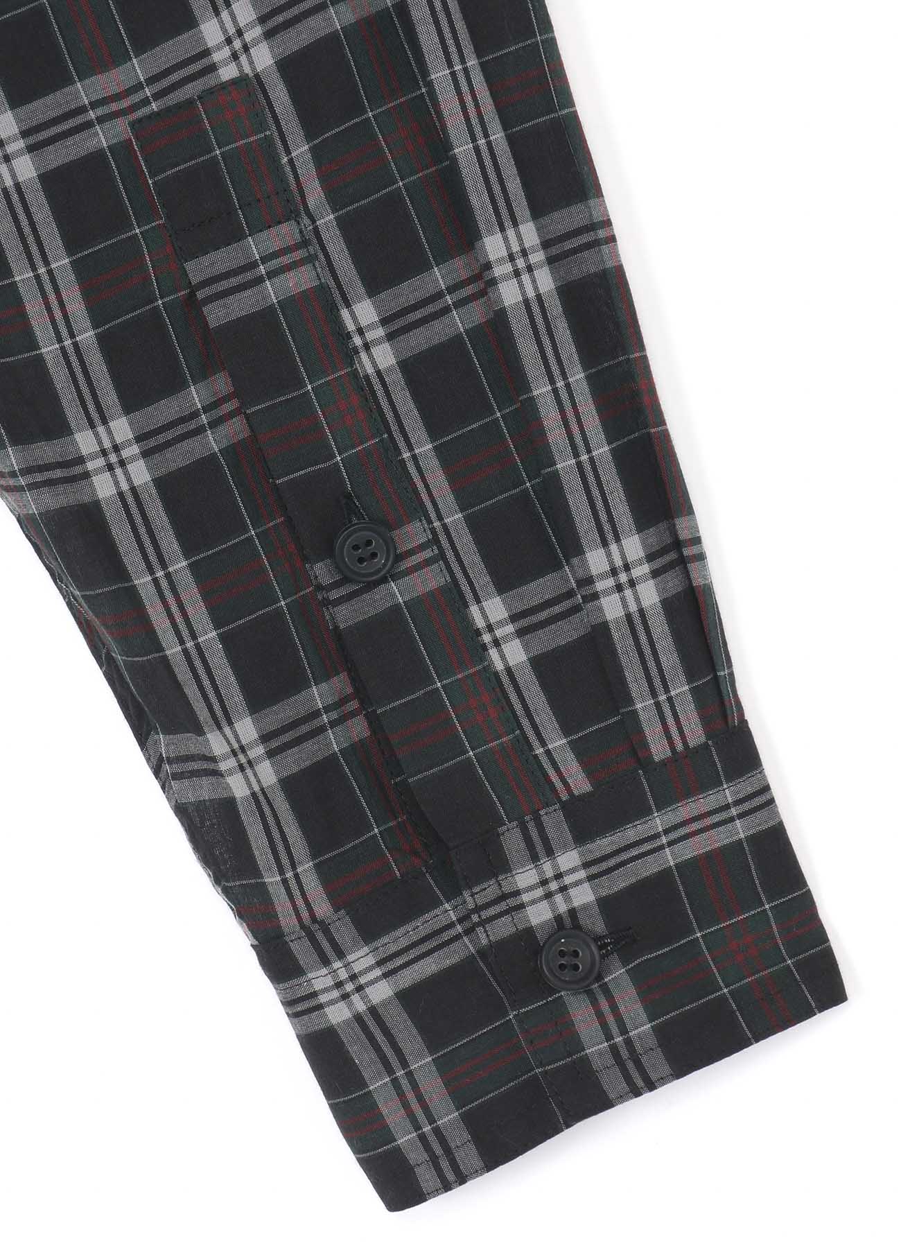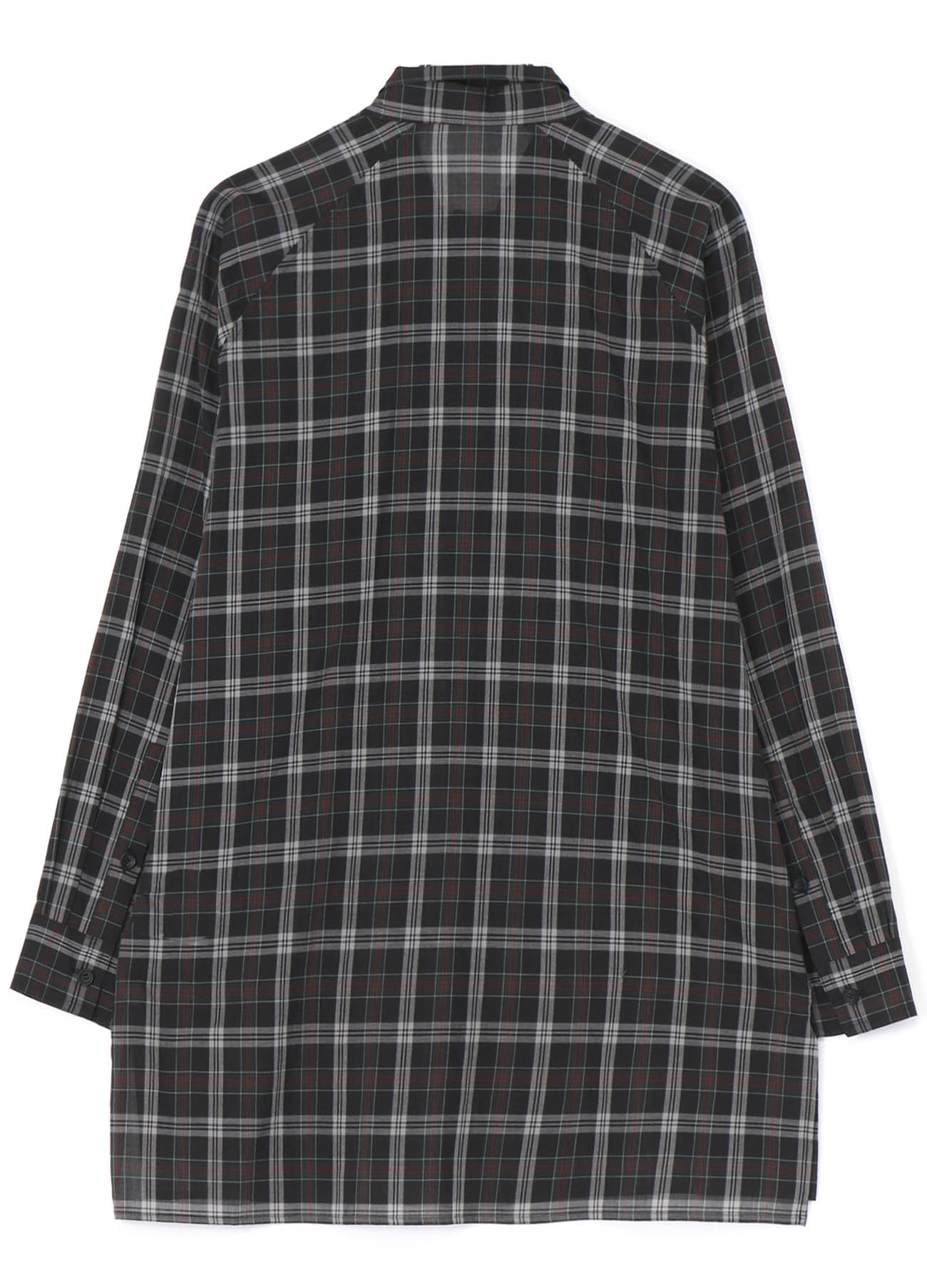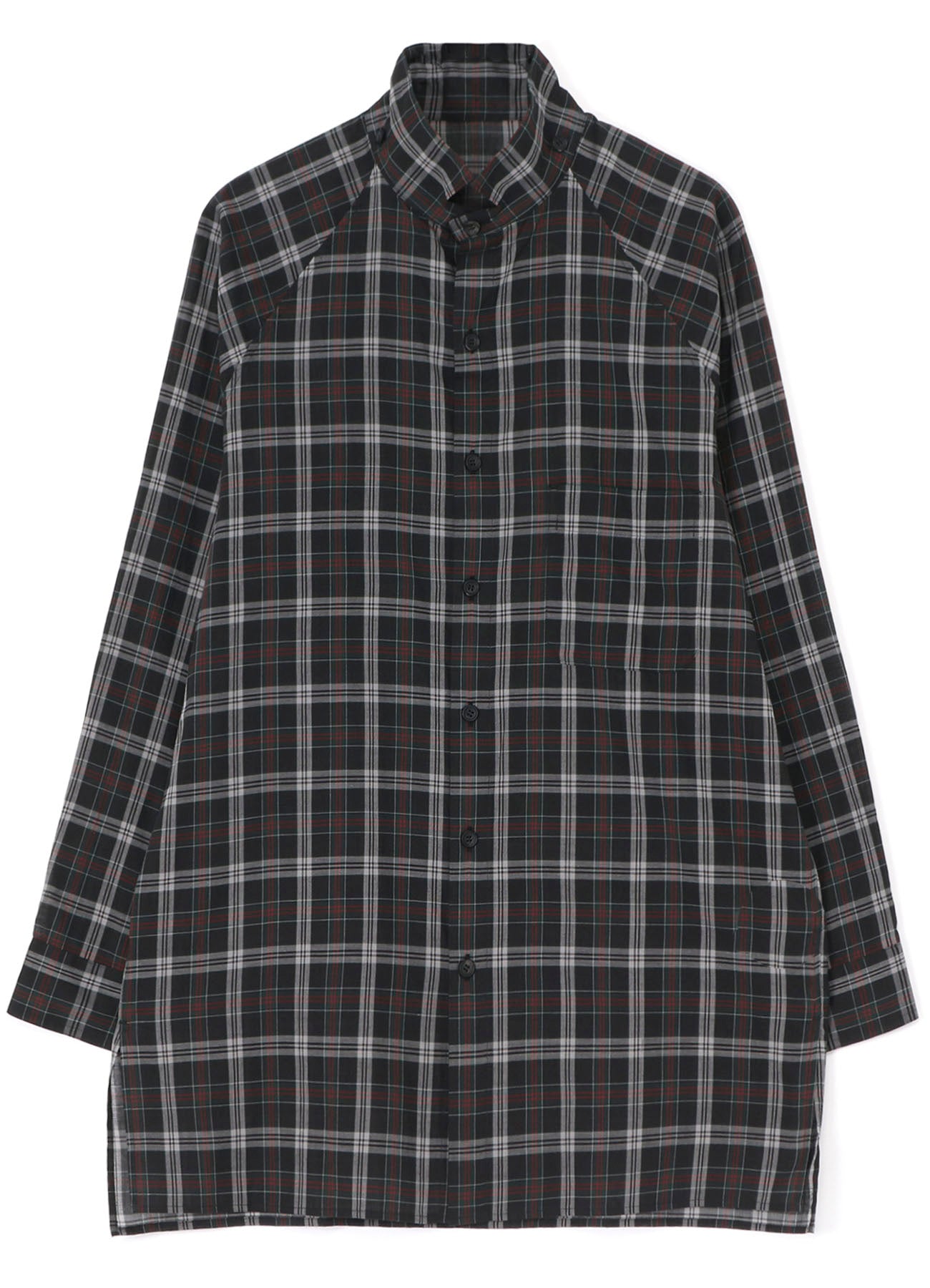 A check-pattern blouse with detachable collar appears in LOOK1. This multi-colored check design consists of four colors, with additional work to over-dye the white sections. Utilizing its material, the blouse undergoes a sun-drying finish for a natural touch.