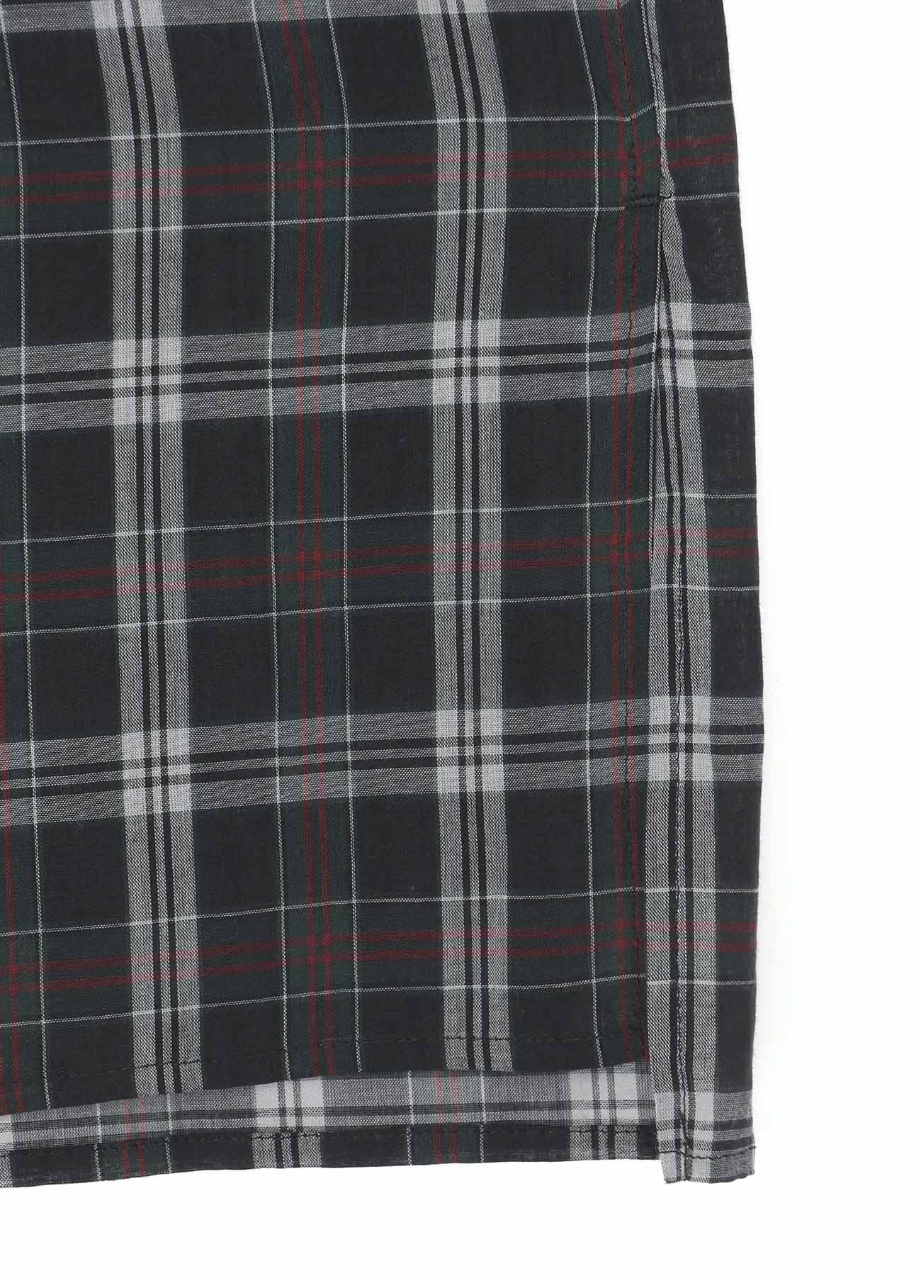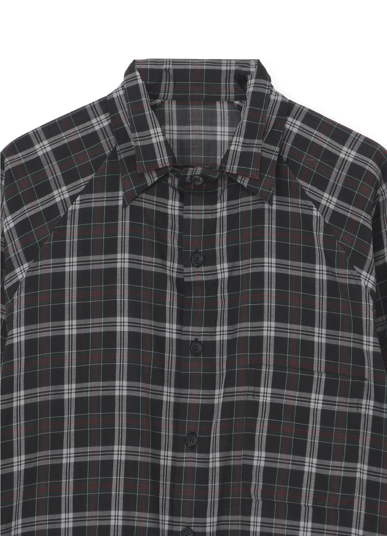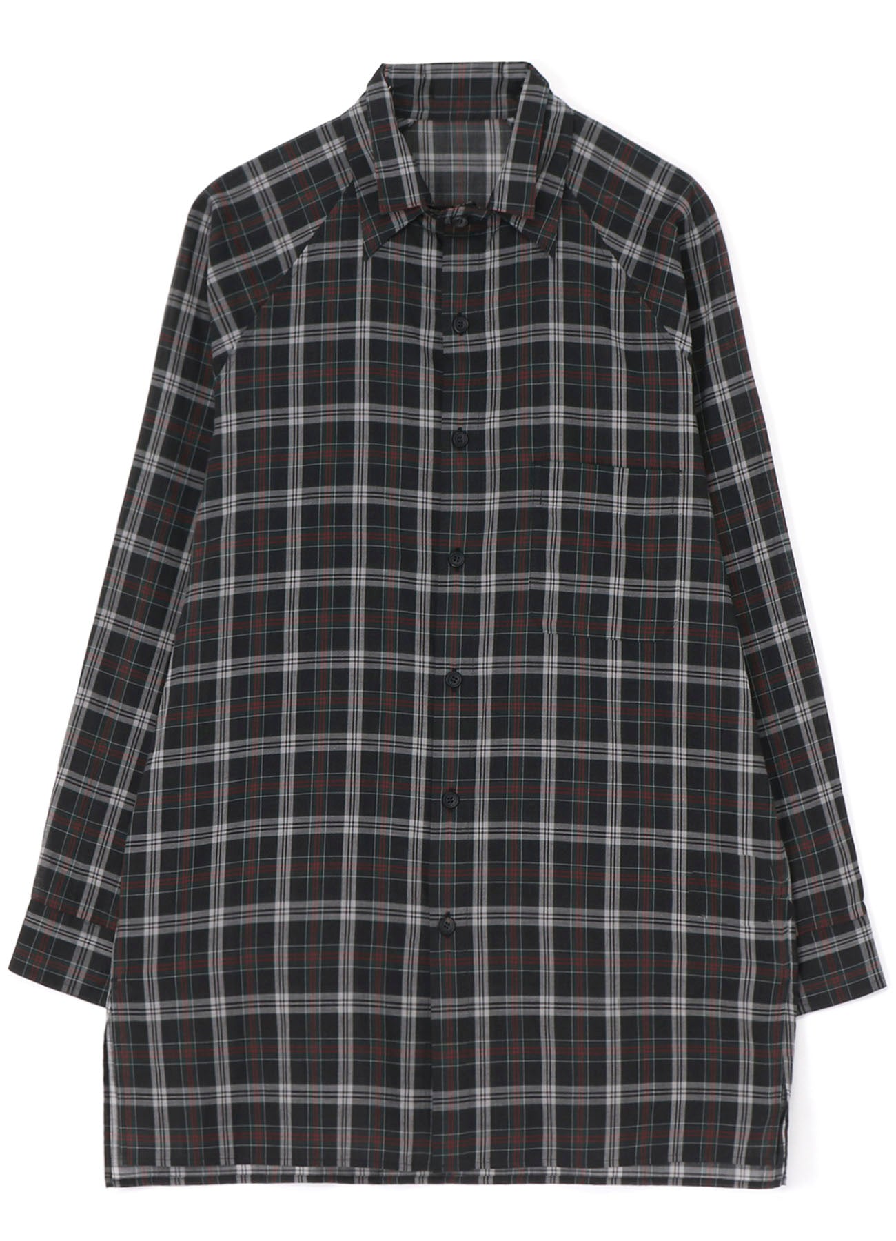 A check-pattern blouse with detachable collar appears in LOOK1. This multi-colored check design consists of four colors, with additional work to over-dye the white sections. Utilizing its material, the blouse undergoes a sun-drying finish for a natural touch.