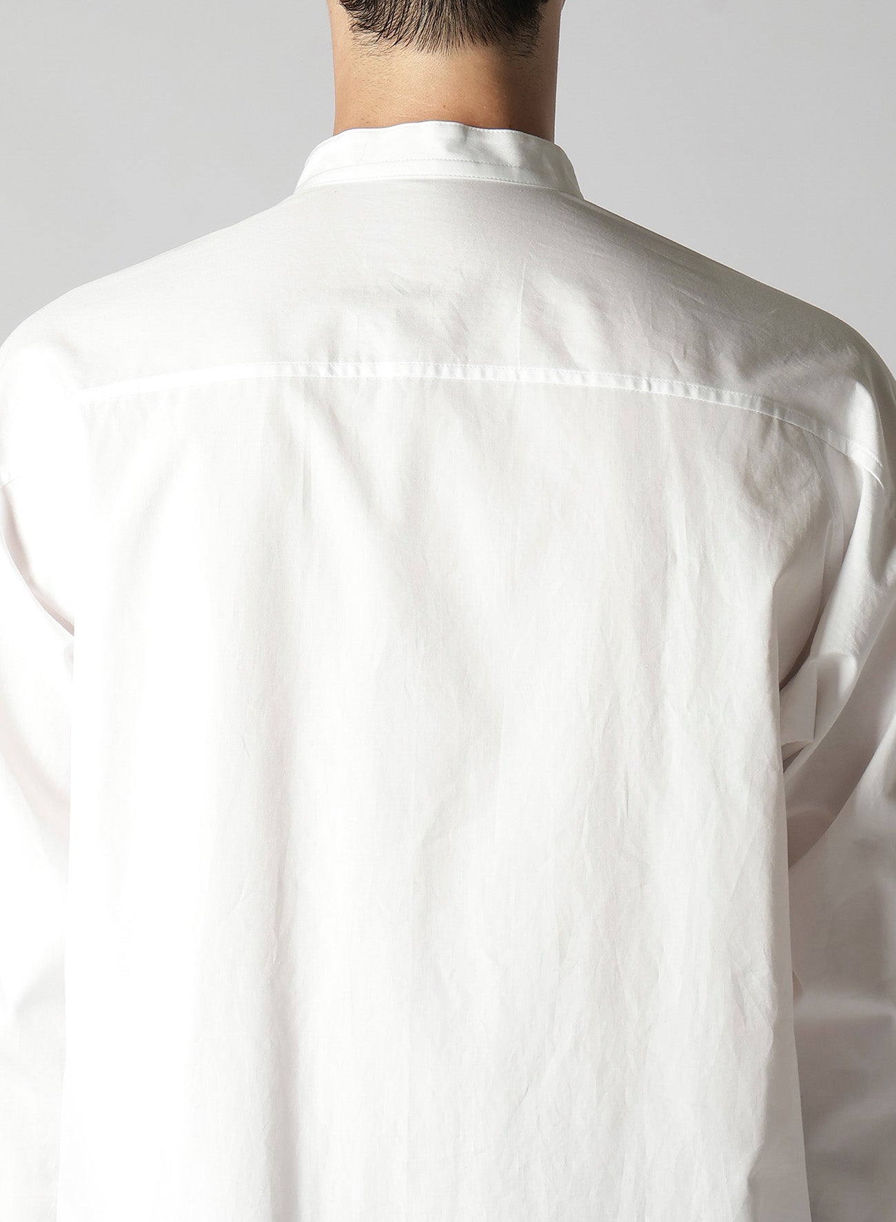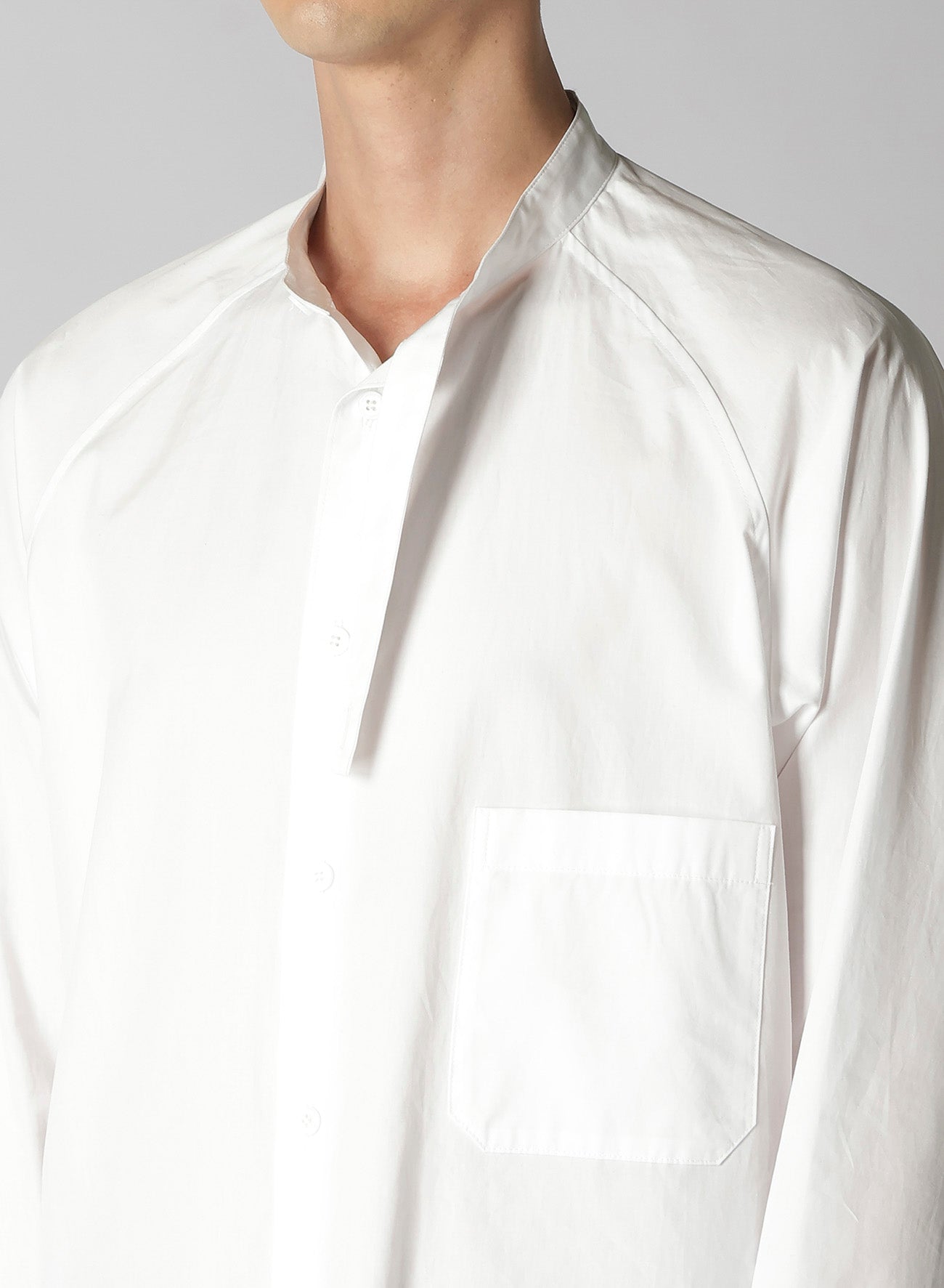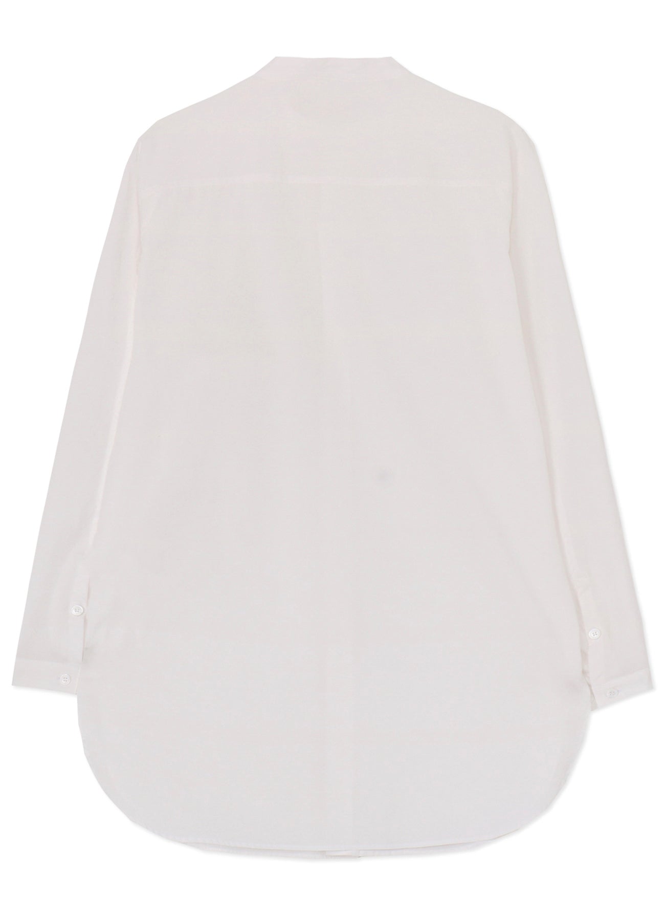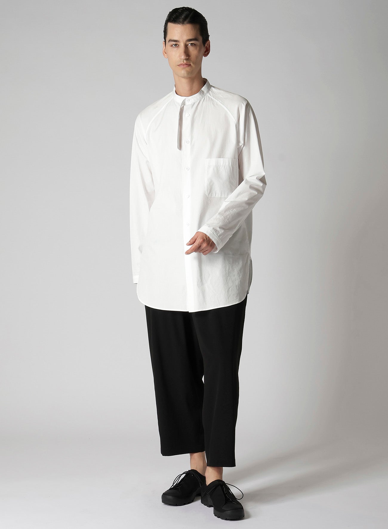 A blouse using signature material with a standing collar and a unique two-piece sleeve design attached from the back yoke. Special washing and processing give it texture and puffiness.