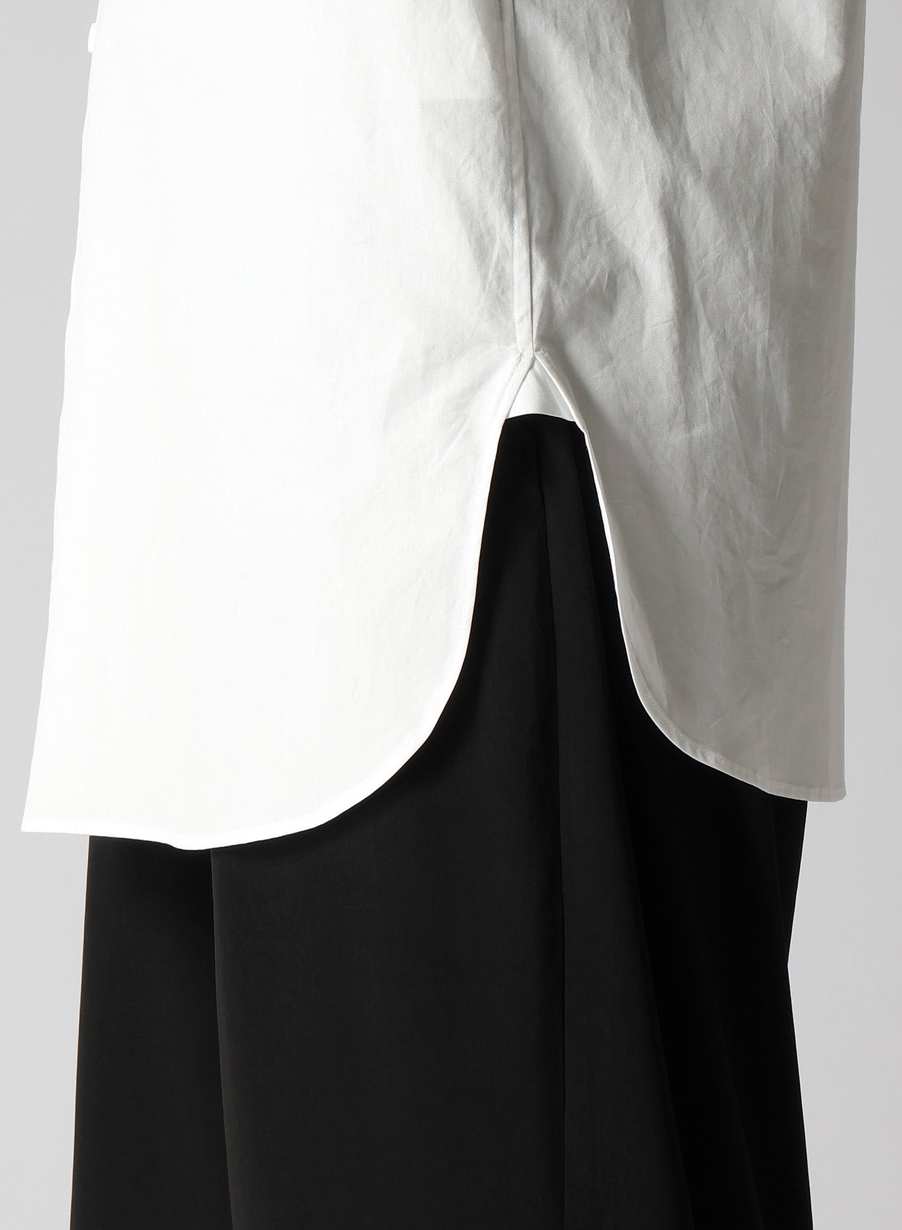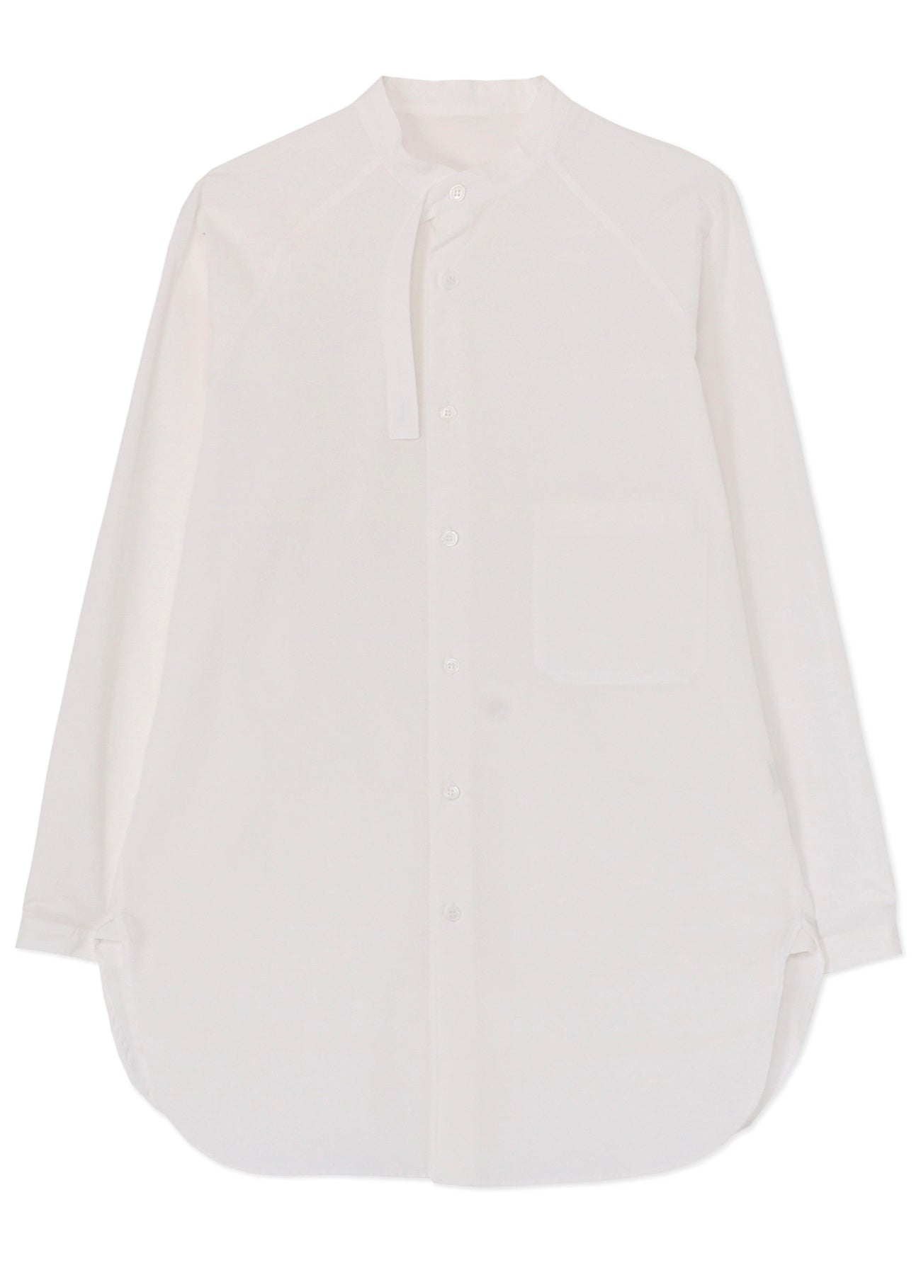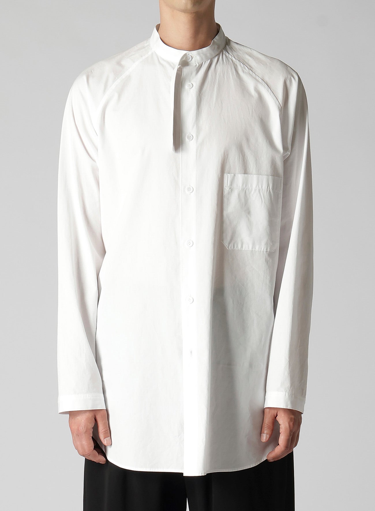 A blouse using signature material with a standing collar and a unique two-piece sleeve design attached from the back yoke. Special washing and processing give it texture and puffiness.