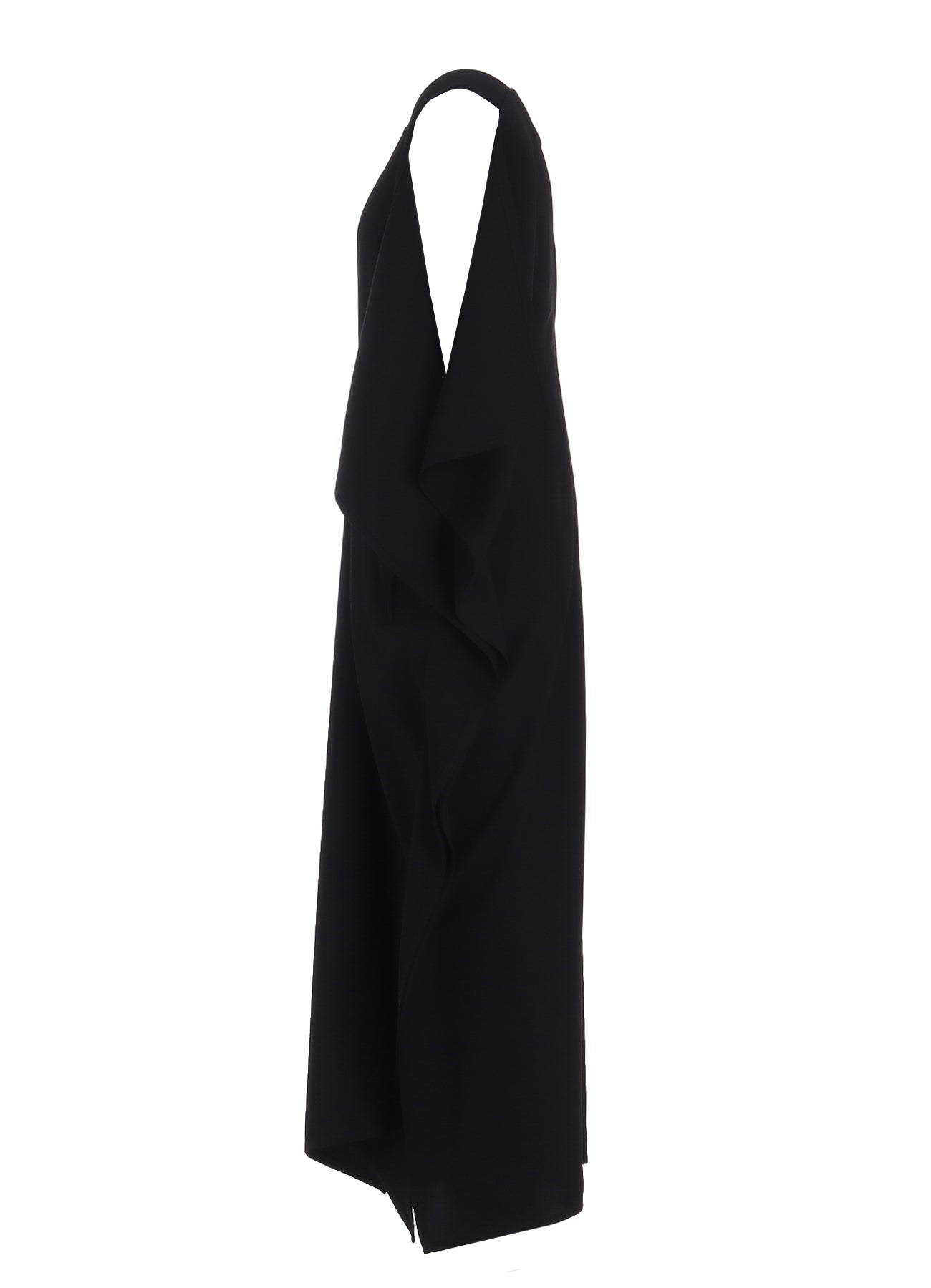 The dress offers a perfect blend of stretch and lightness with its thick polyester fabric. It features a wide silhouette, enhancing the drapery with distinctive shoulders and broad width. The deeply dyed black and smooth feel are ideal for formal occasions and adaptable for long-term wear with different inner wear arrangements.