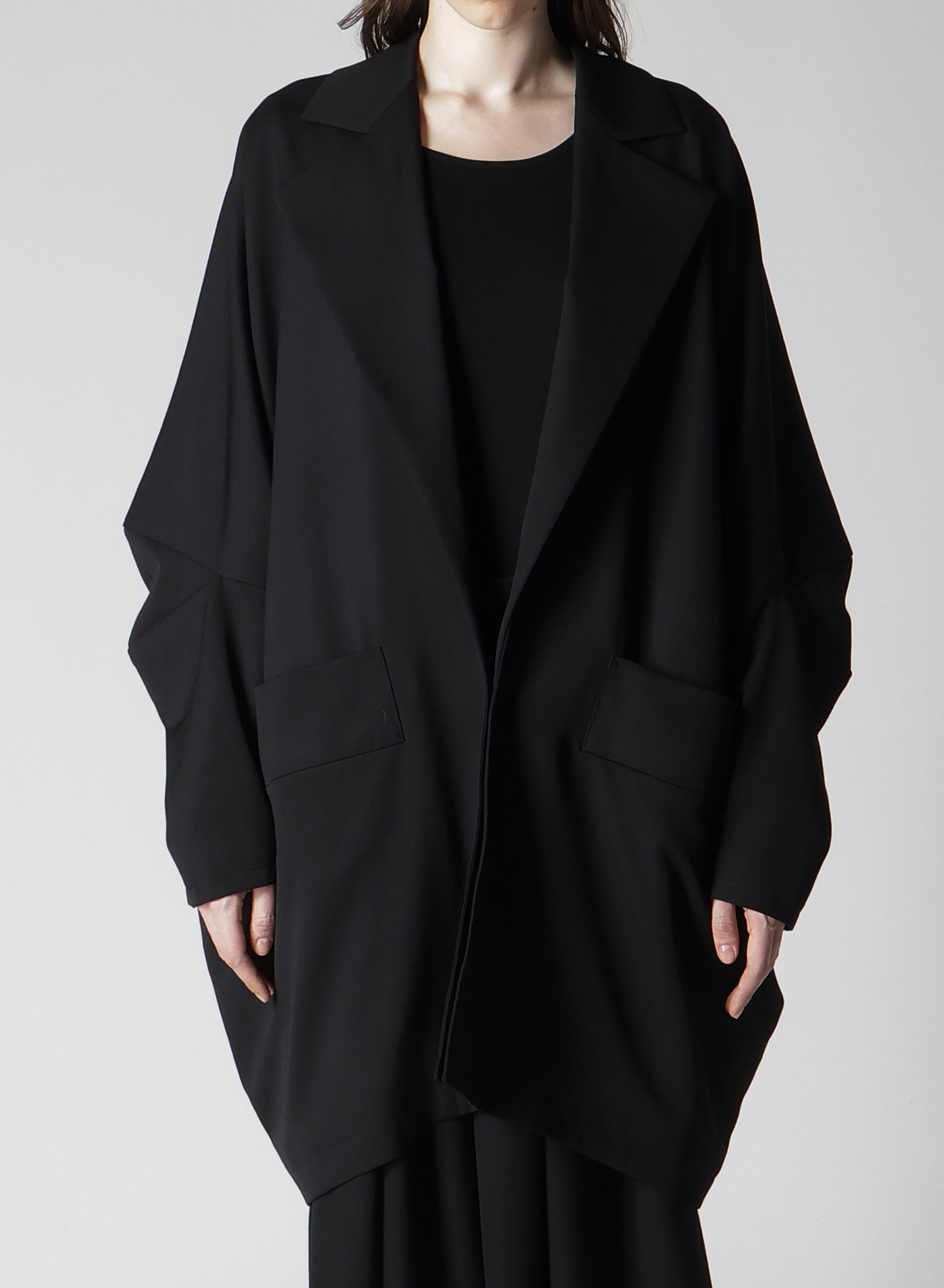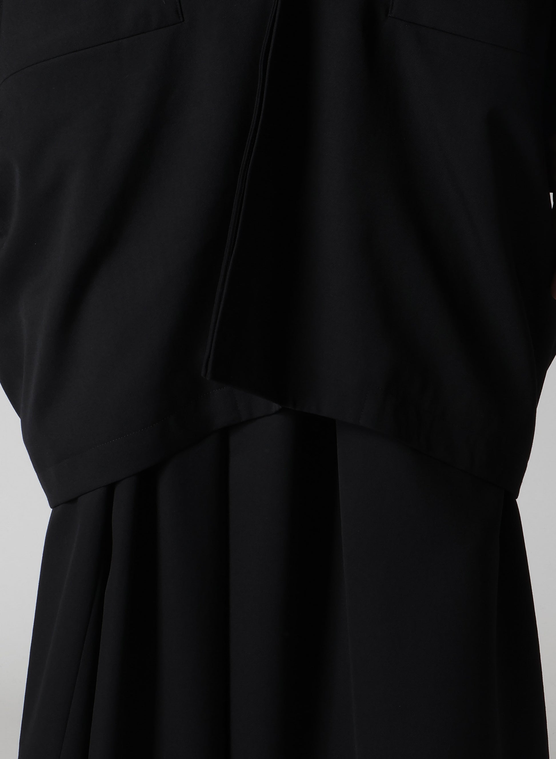 This wool gabardine fabric is characterized by its smooth drapery and soft texture, giving a refined look with its clean surface. The jacket features long sleeves and a relaxed silhouette, with a subtly flared hem that adds a casual touch.